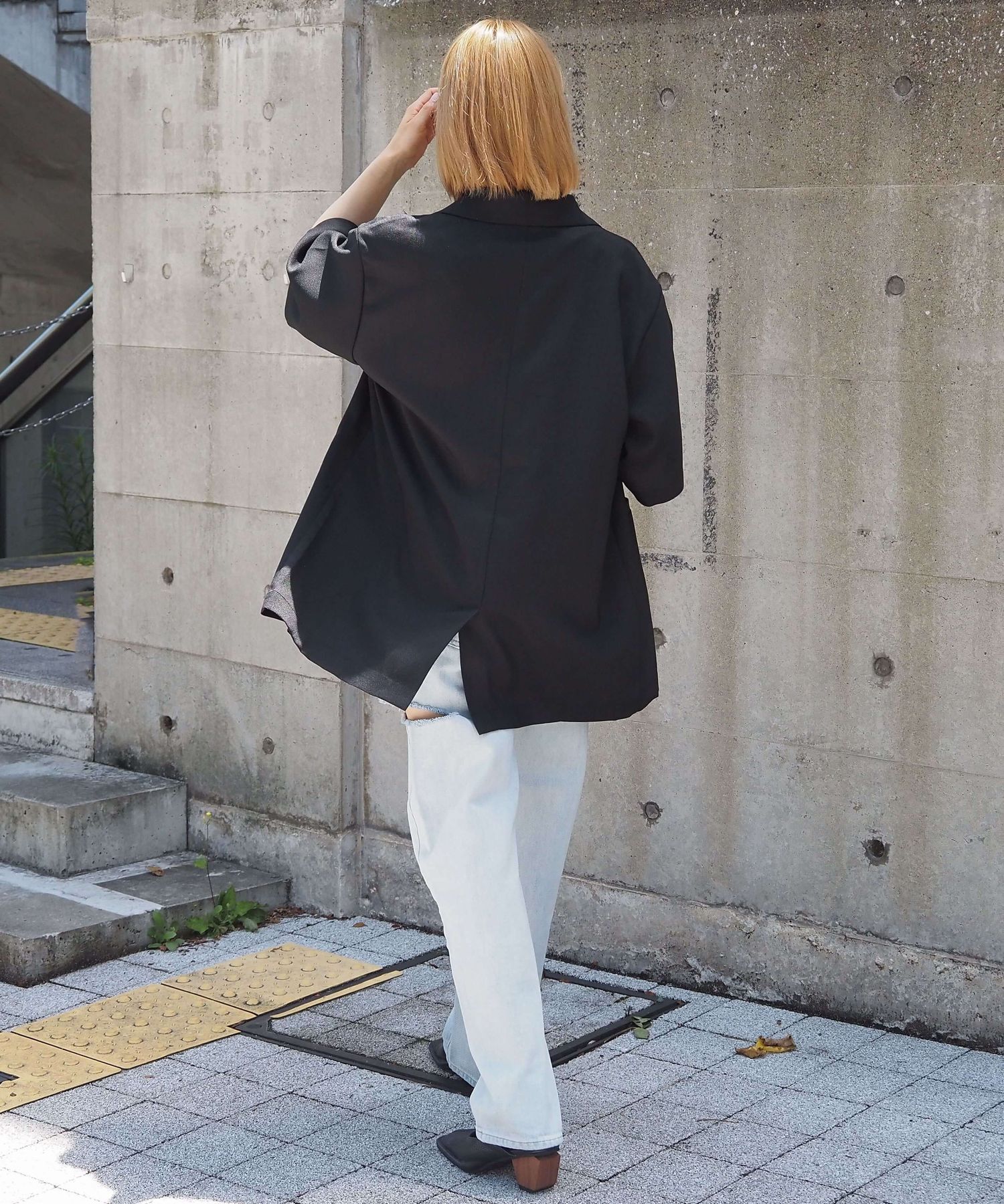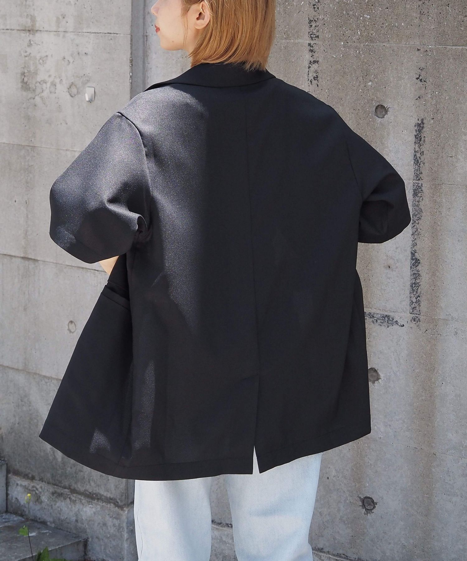 ・爽やかな麻調生地を使ったオーバーサイズのテーラードジャケットです。