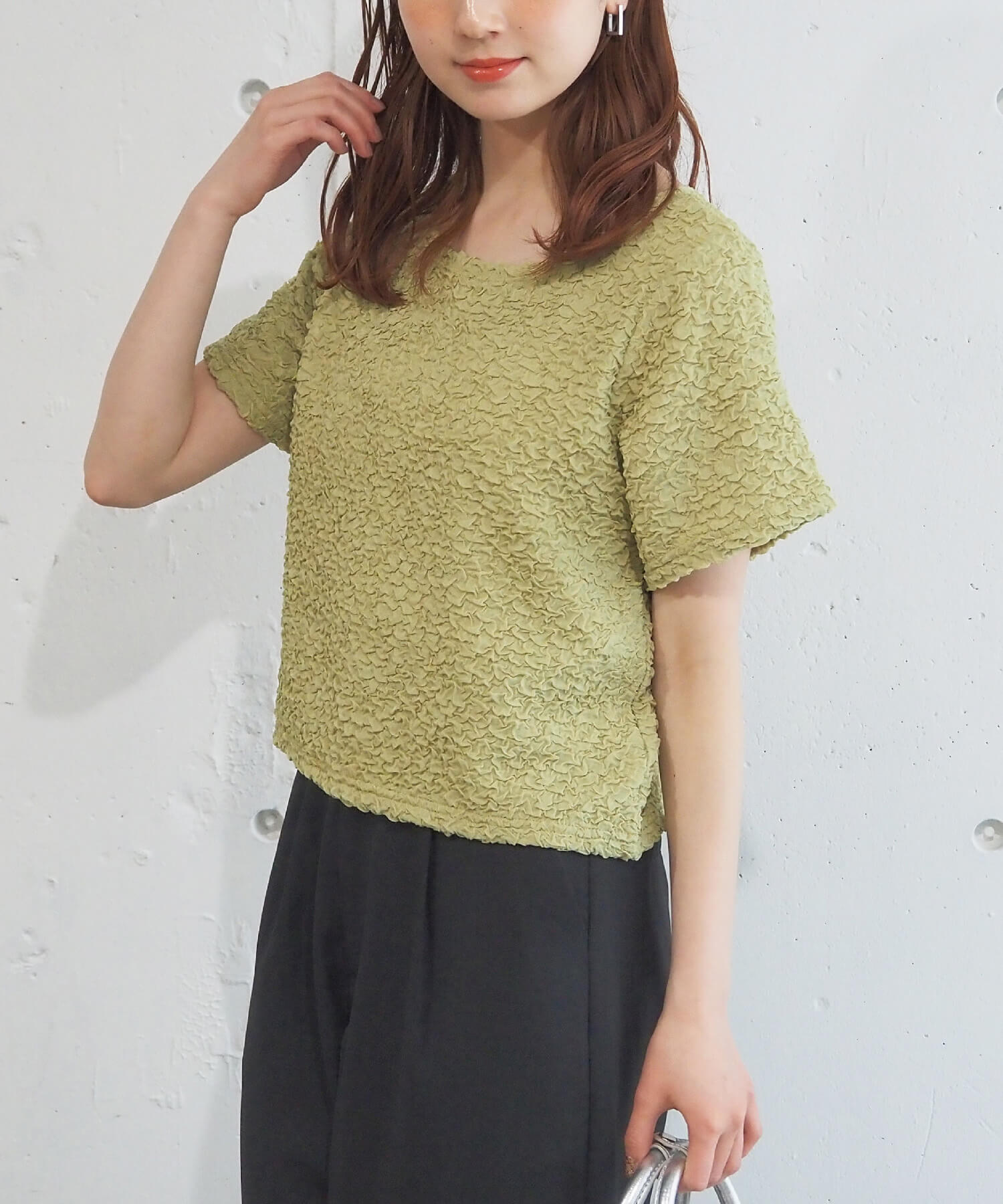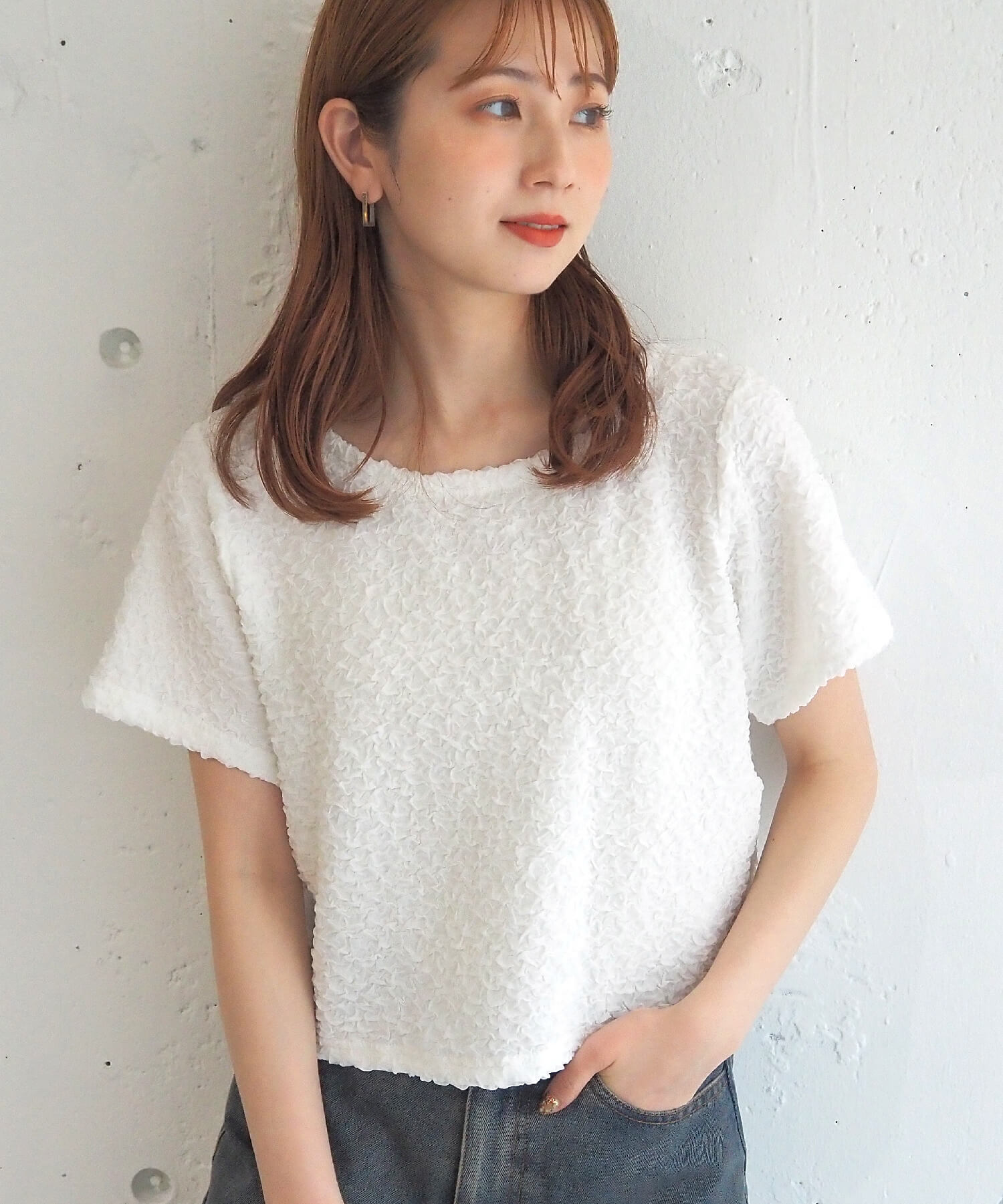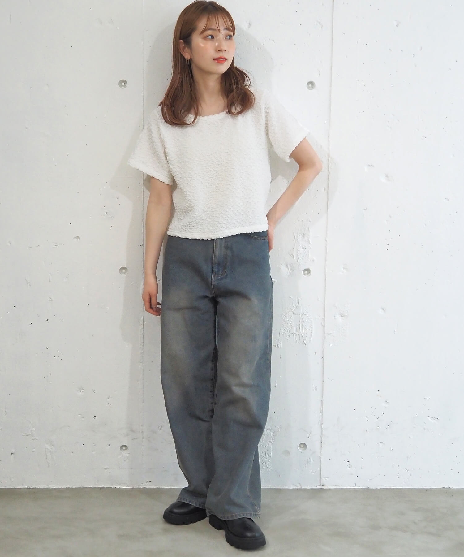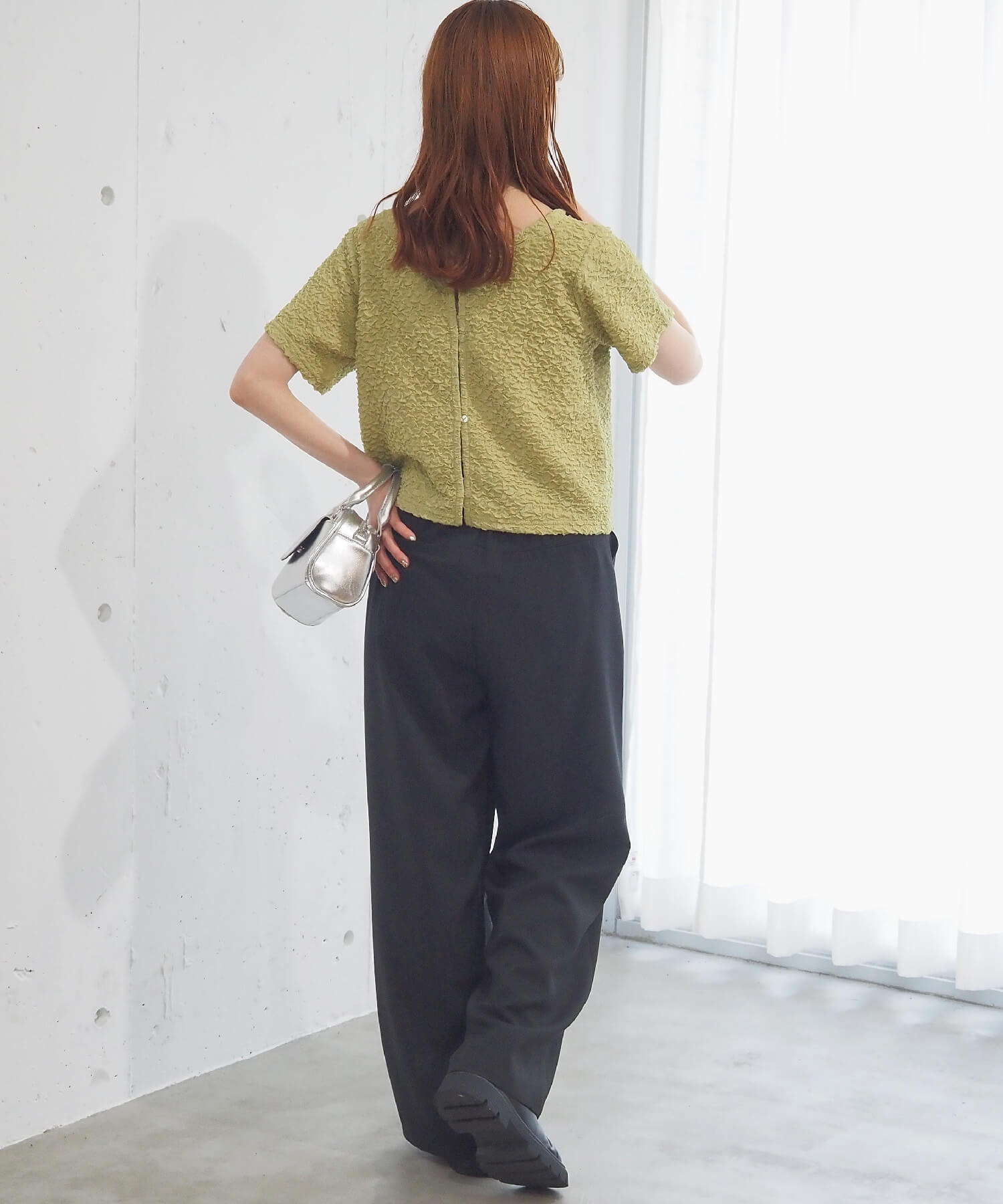 ・デニムやスラックスなどシンプルなボトムとのコーディネートなら、生地の表面感が際立ち程よく華やかに。好感度バツグンのな大人カジュアルが完成します。