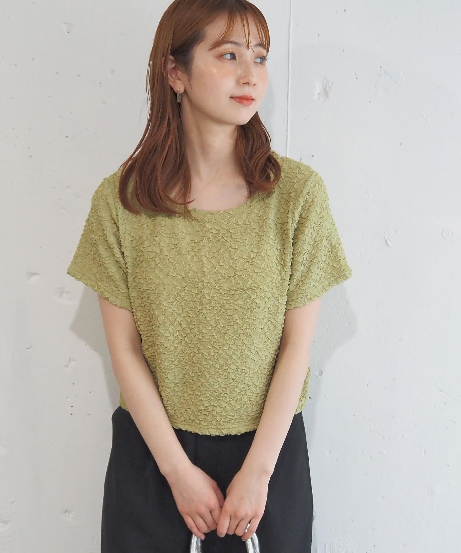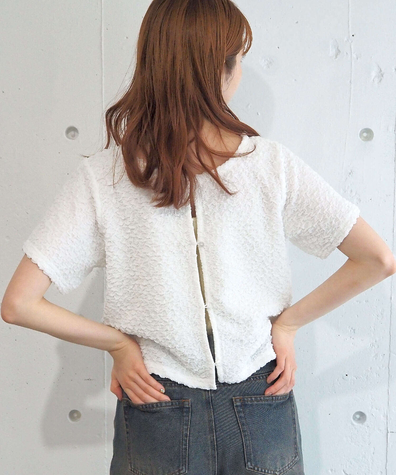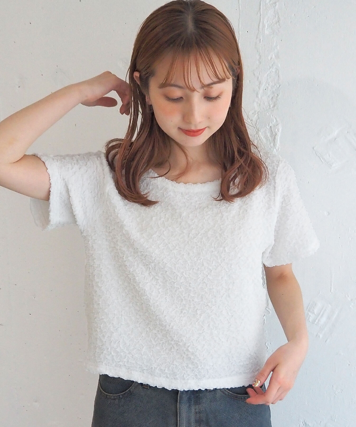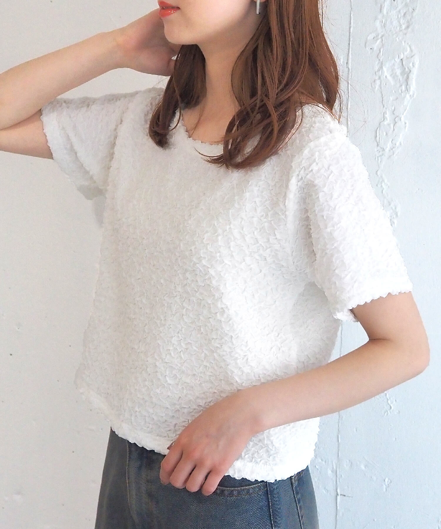 ・デニムやスラックスなどシンプルなボトムとのコーディネートなら、生地の表面感が際立ち程よく華やかに。好感度バツグンのな大人カジュアルが完成します。