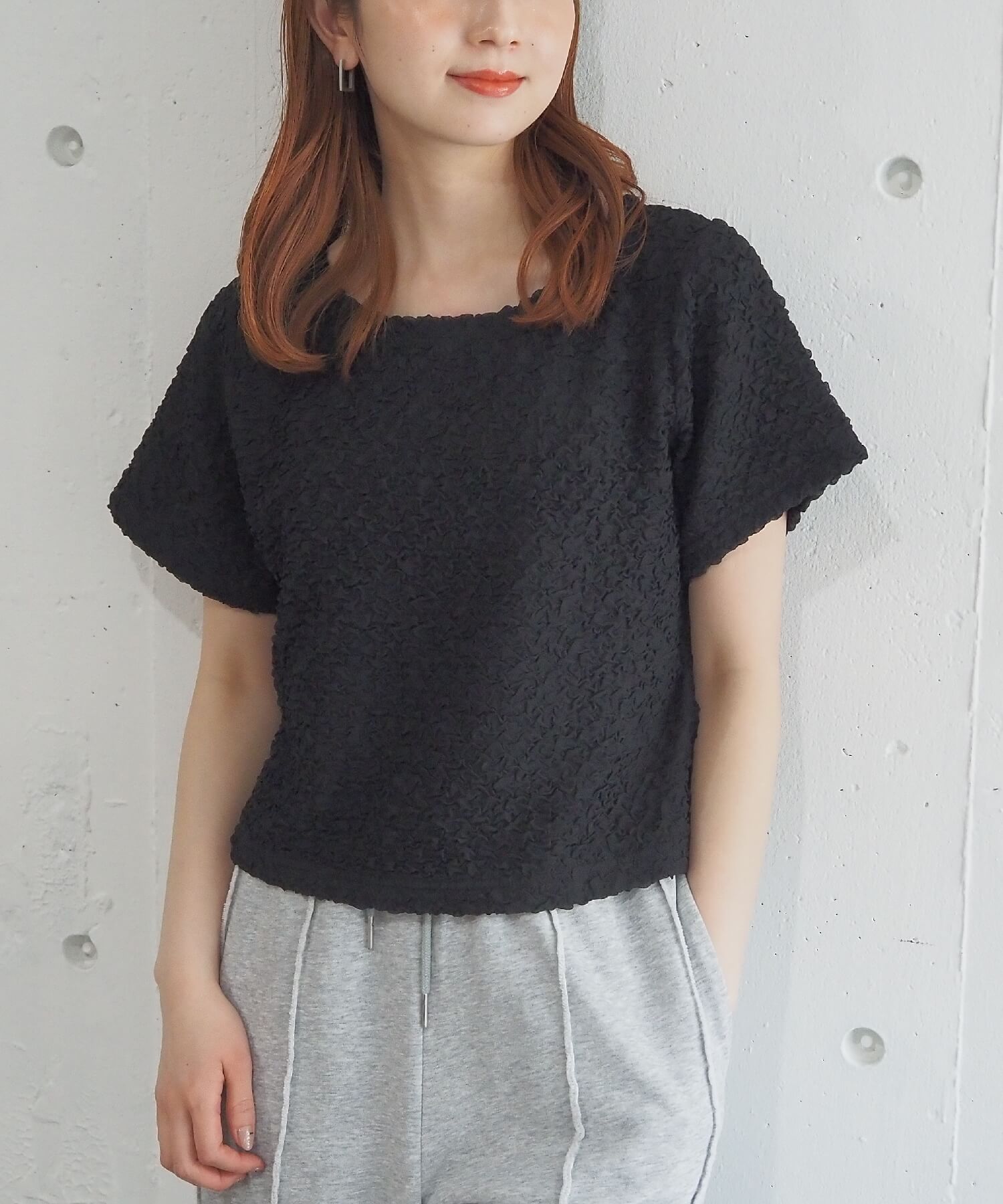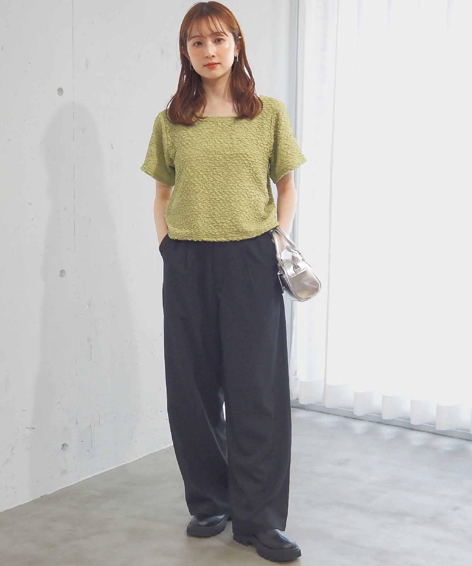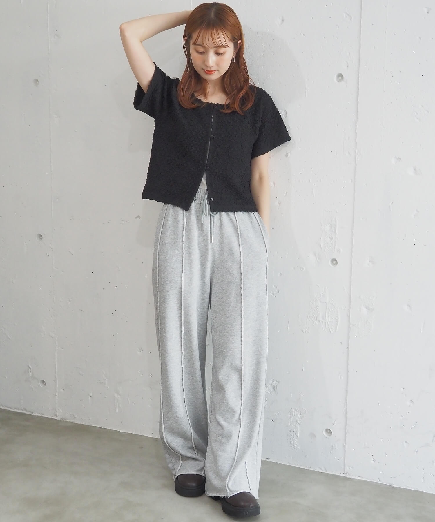 ・見映えするフクレ生地と絶妙なサイズ感で人気のスウェットパンツも上品に着こなせます。足もとはサンダルやヒールなど華奢なシューズがおすすめです。