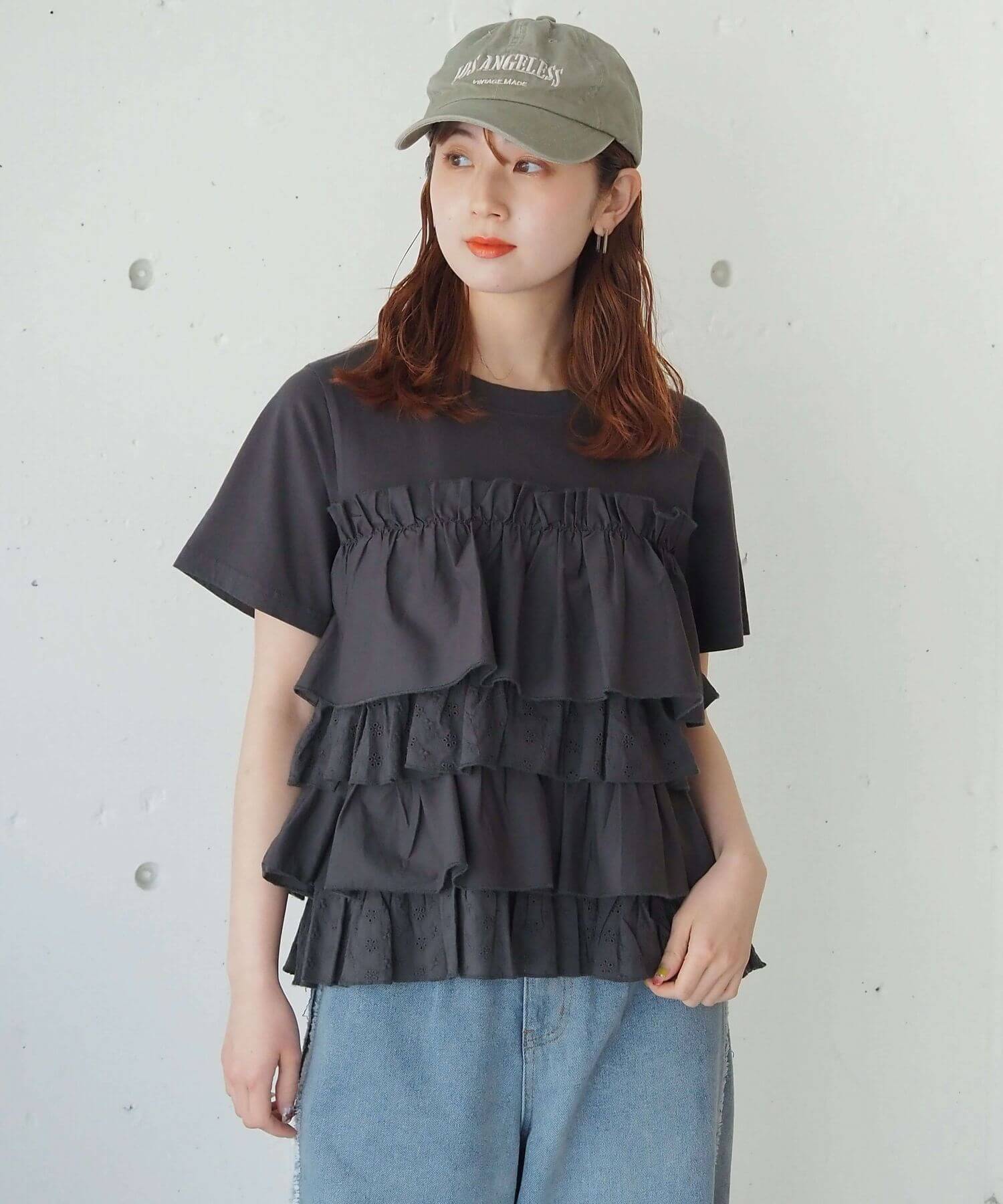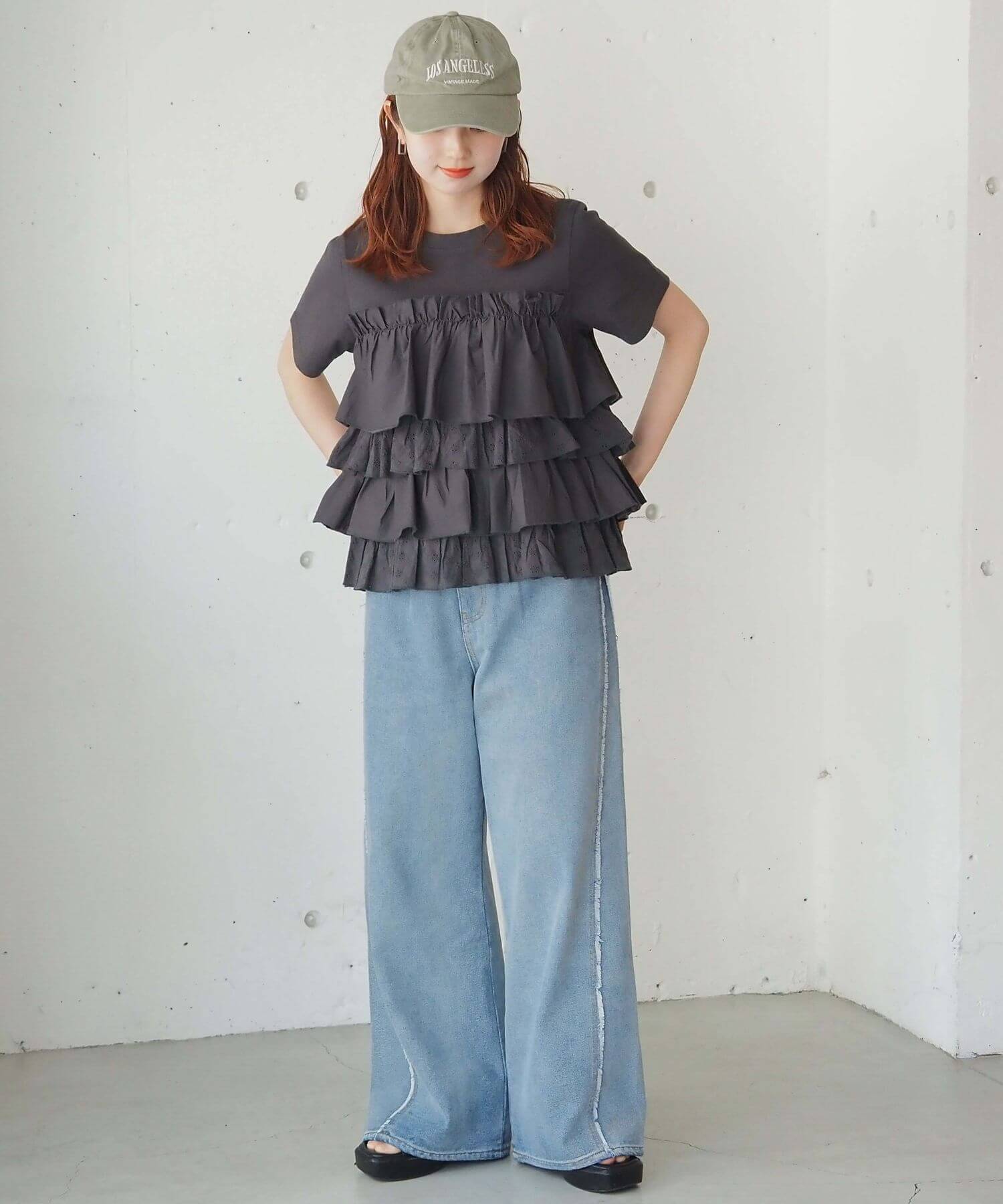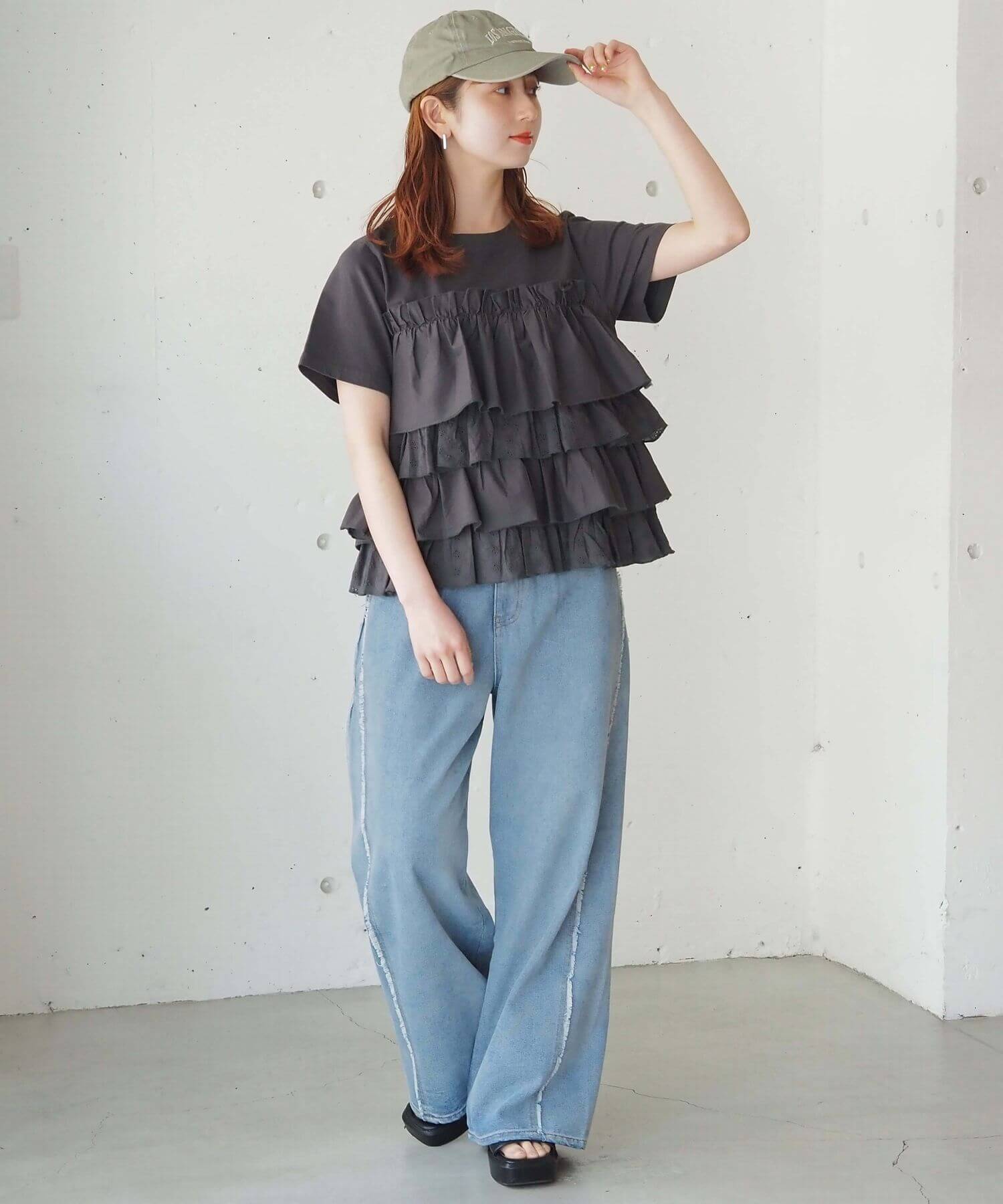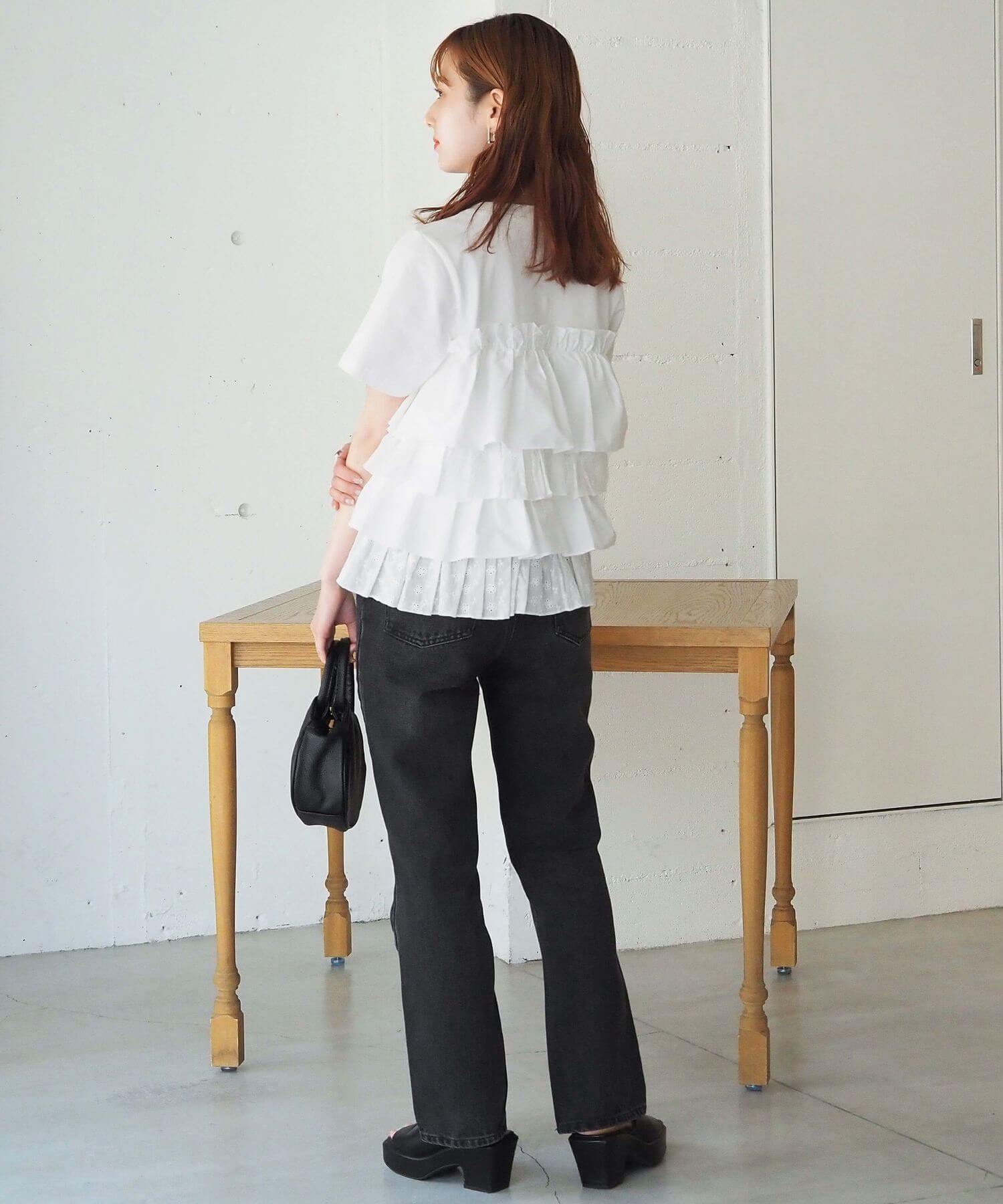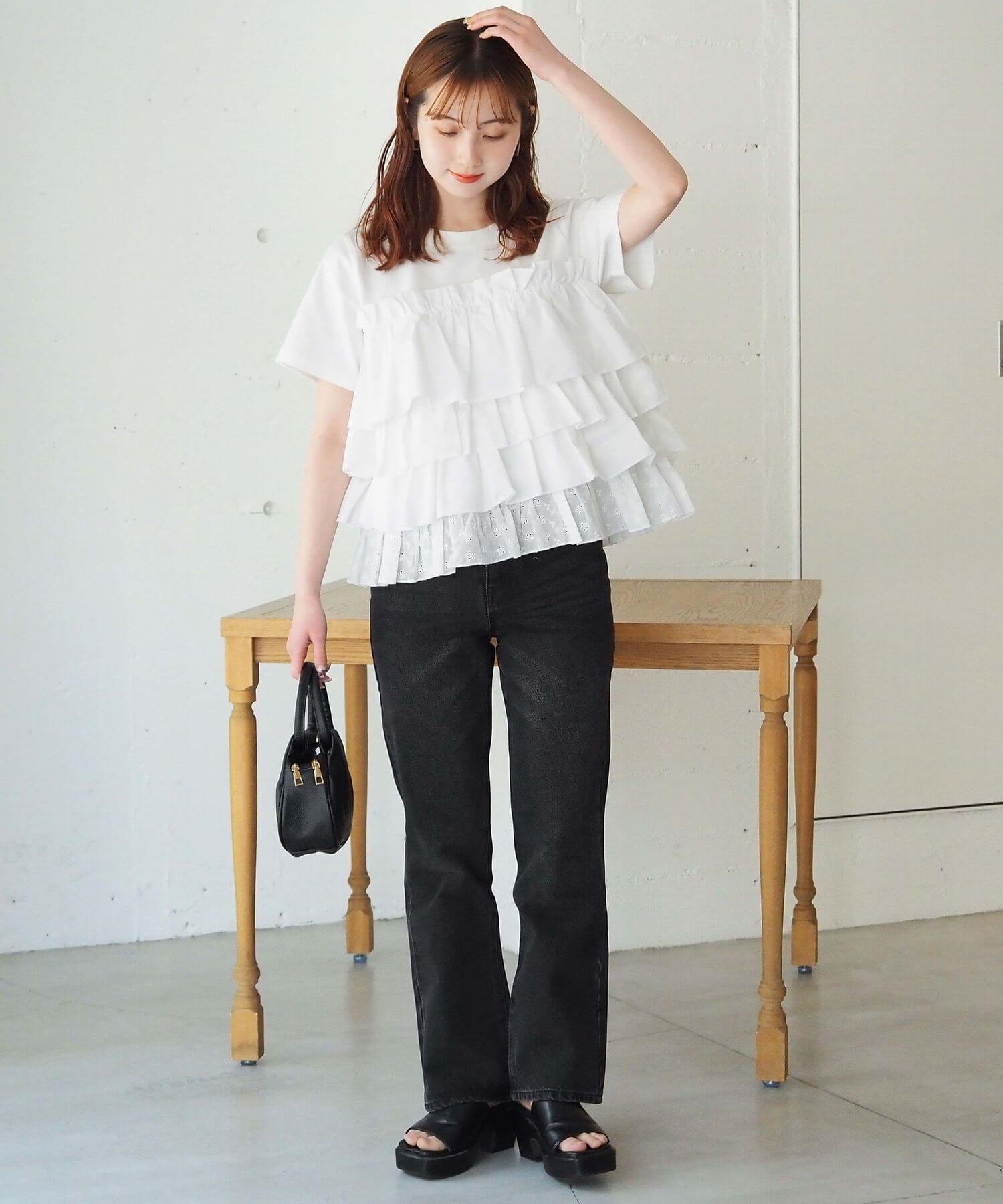 ・デニムでフリルをカジュアルダウン。夏らしい爽やかなスタイリングです。
