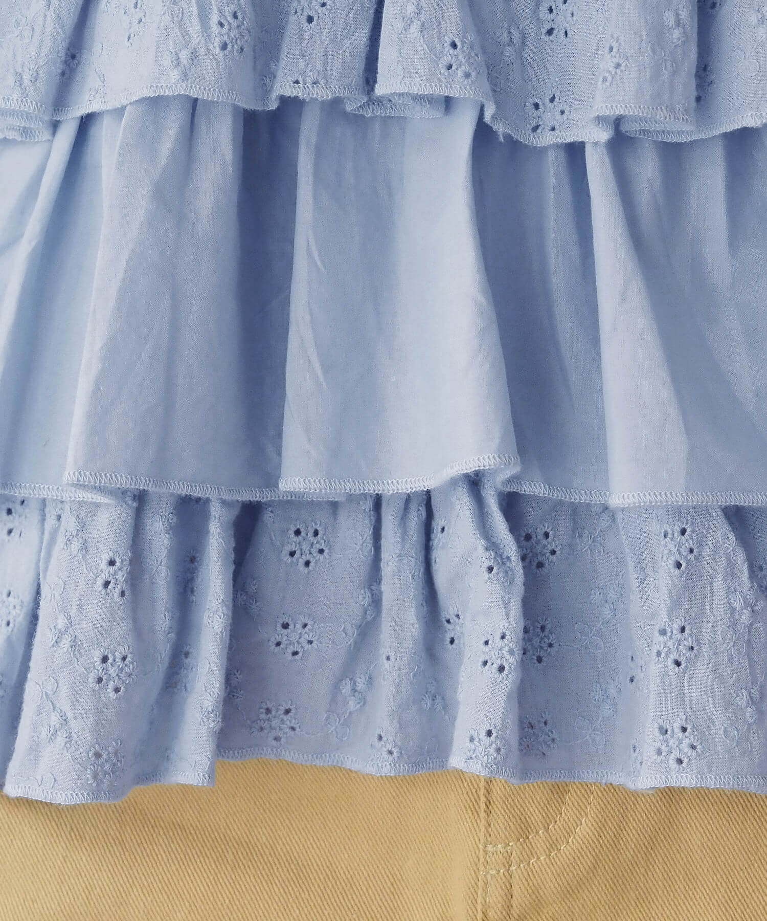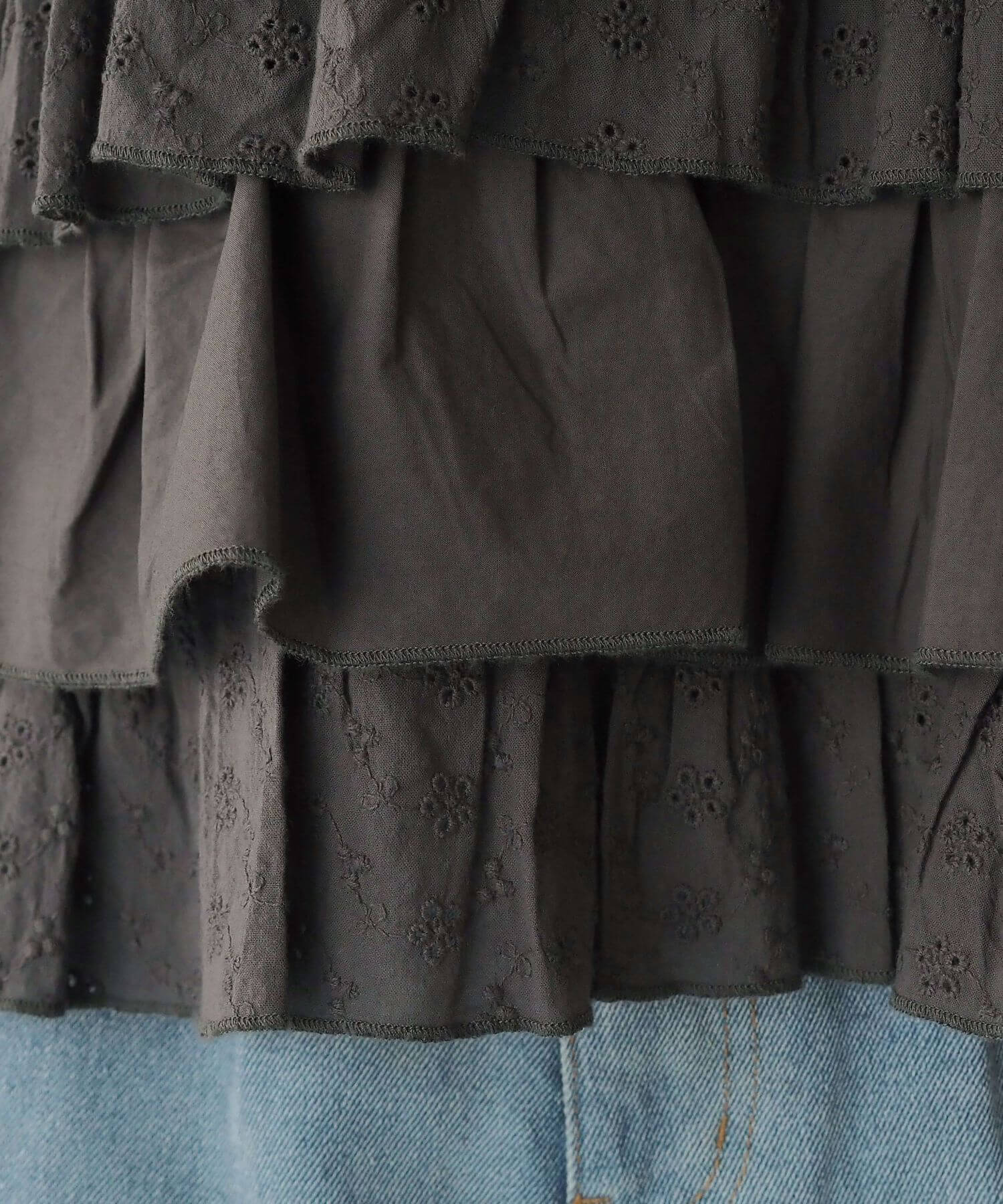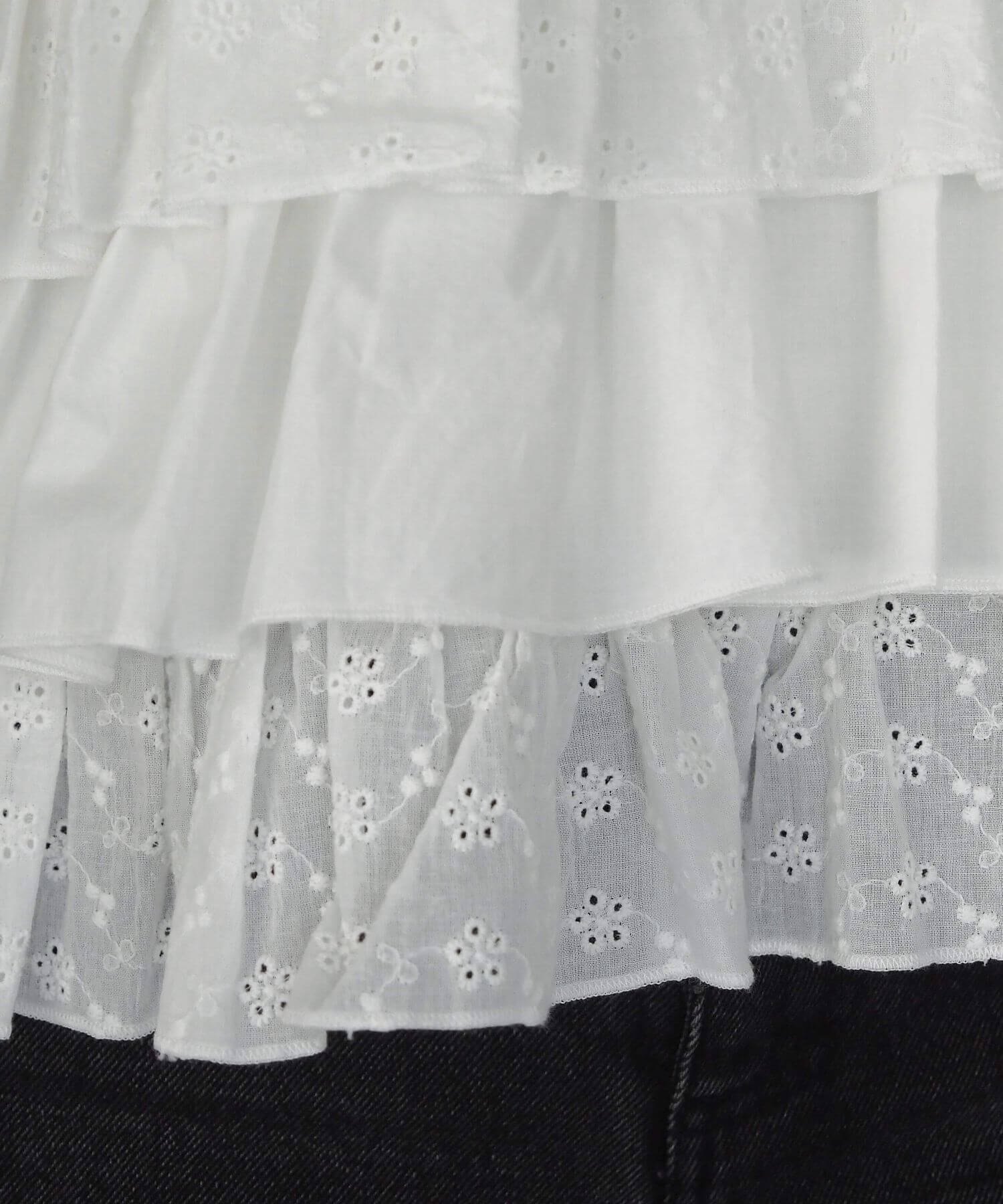 ・軽やかな布帛と刺繍レースの異なる素材をティアード状に重ね、ビスチェ風にドッキングしたデザイントップス。