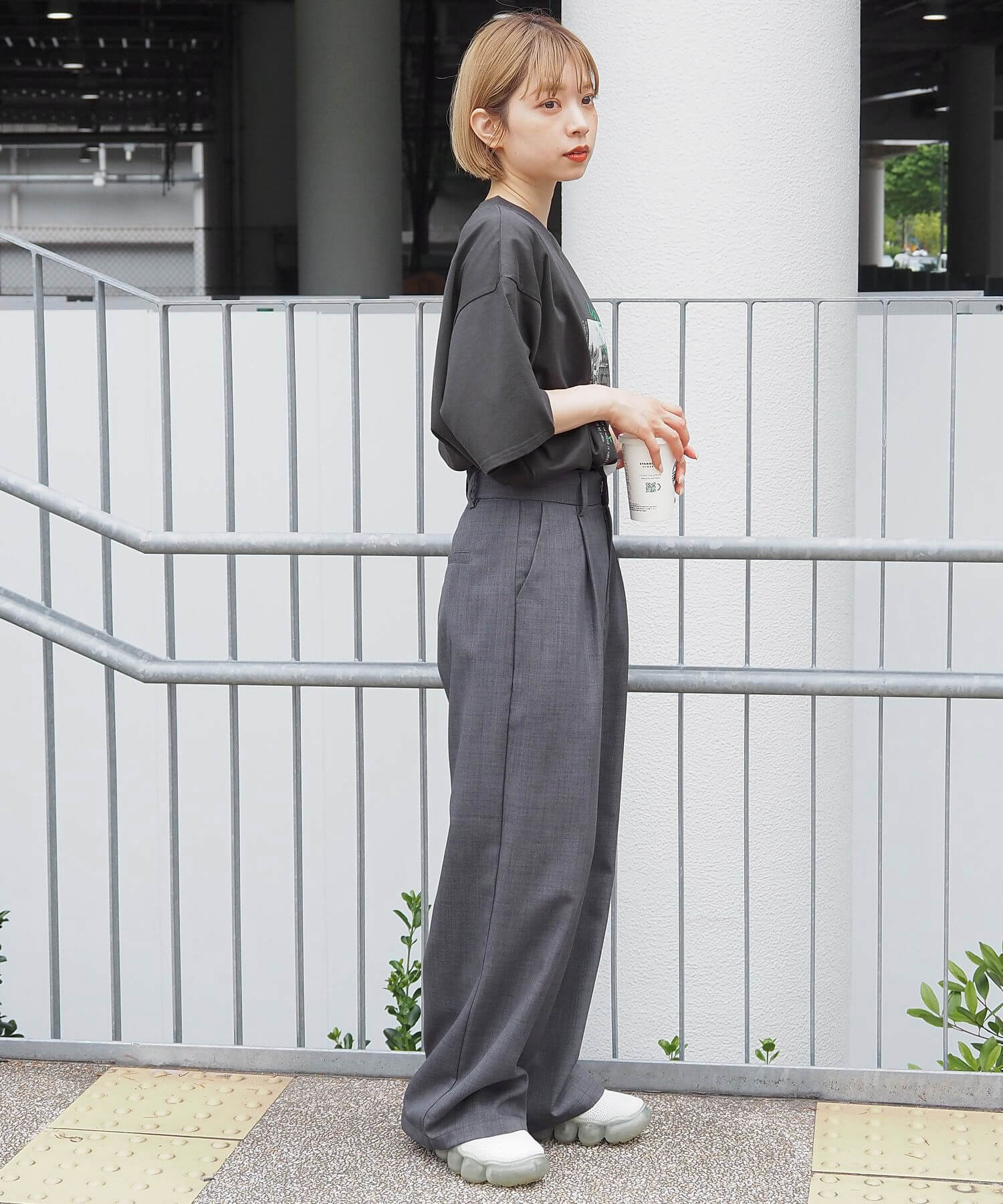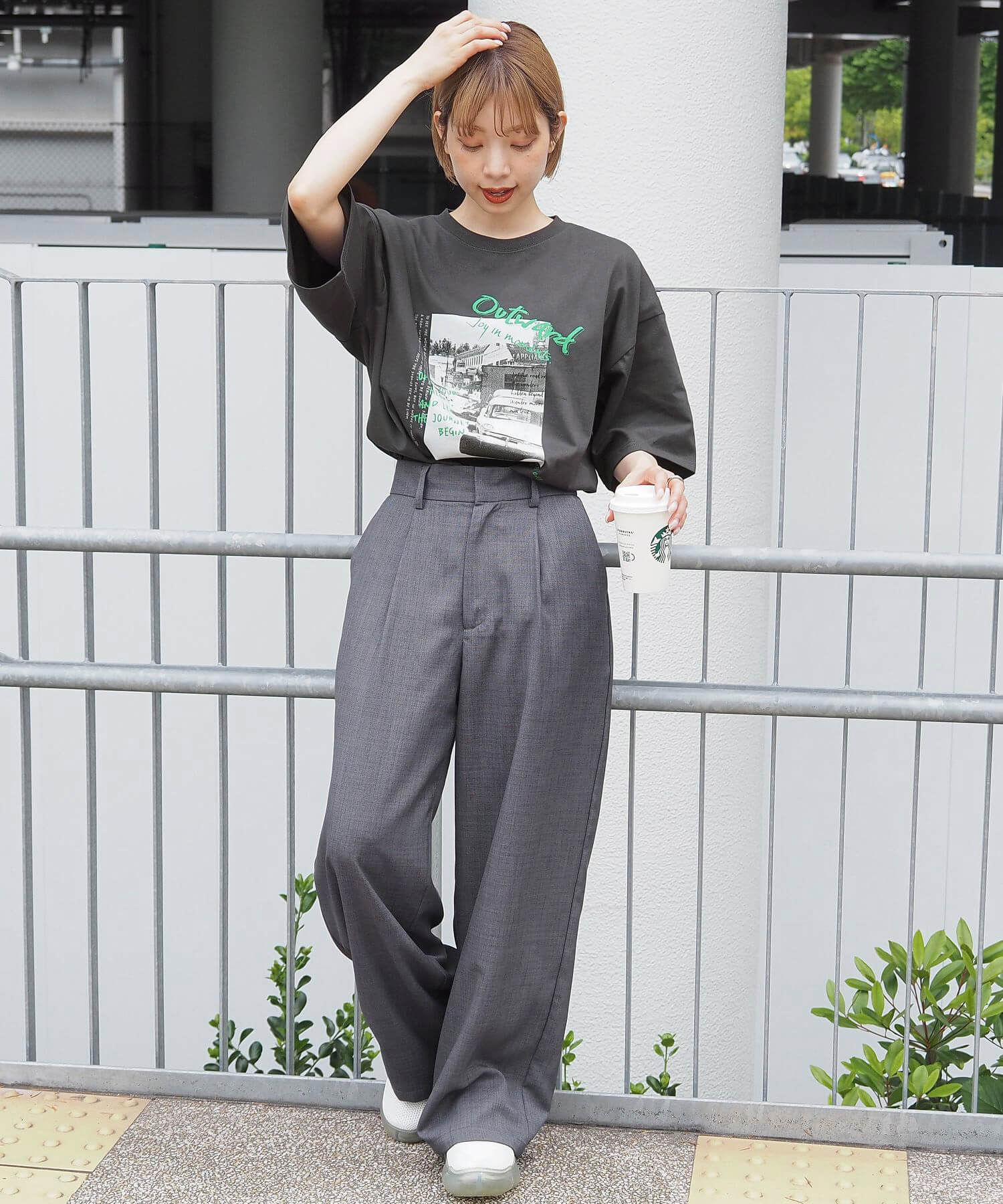 ・キレイ見えするスラックスパンツで大人カジュアルに。ルーズなBIGTシャツとの好バランスコーデです。足もとは人気のスニーカーや、ヒールでキレイめなスタイリングもおすすめです。