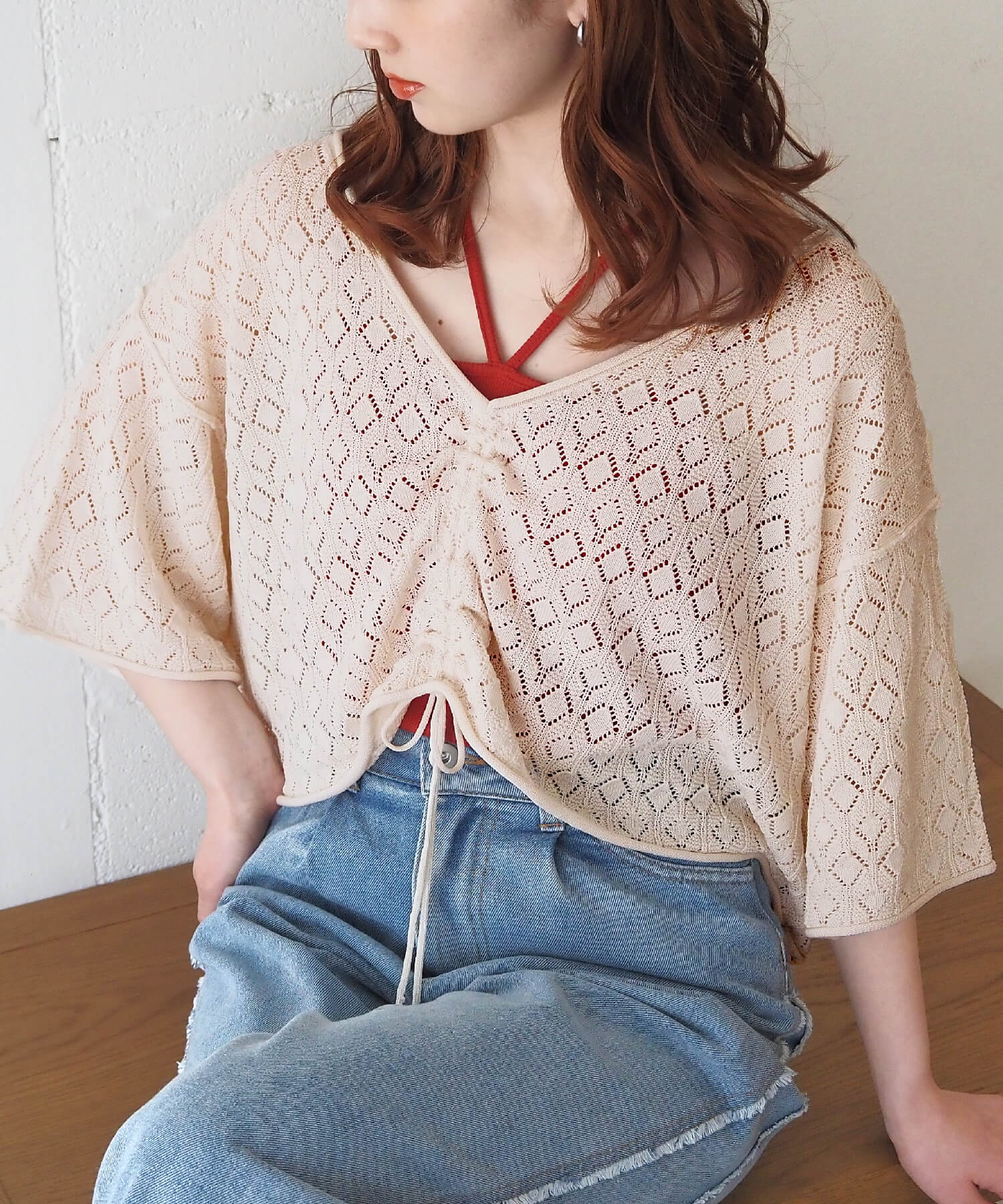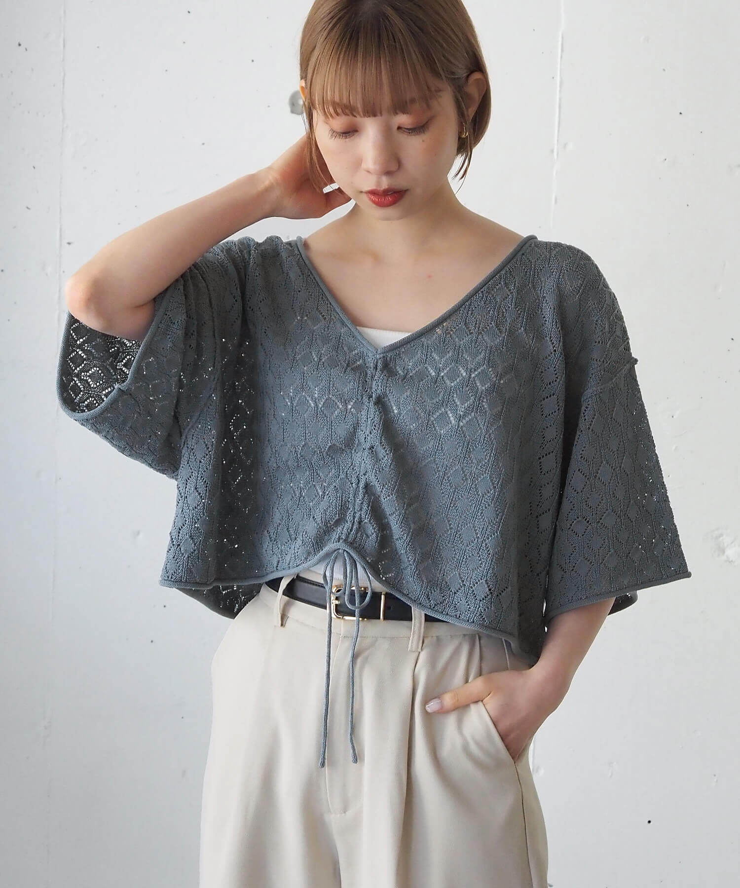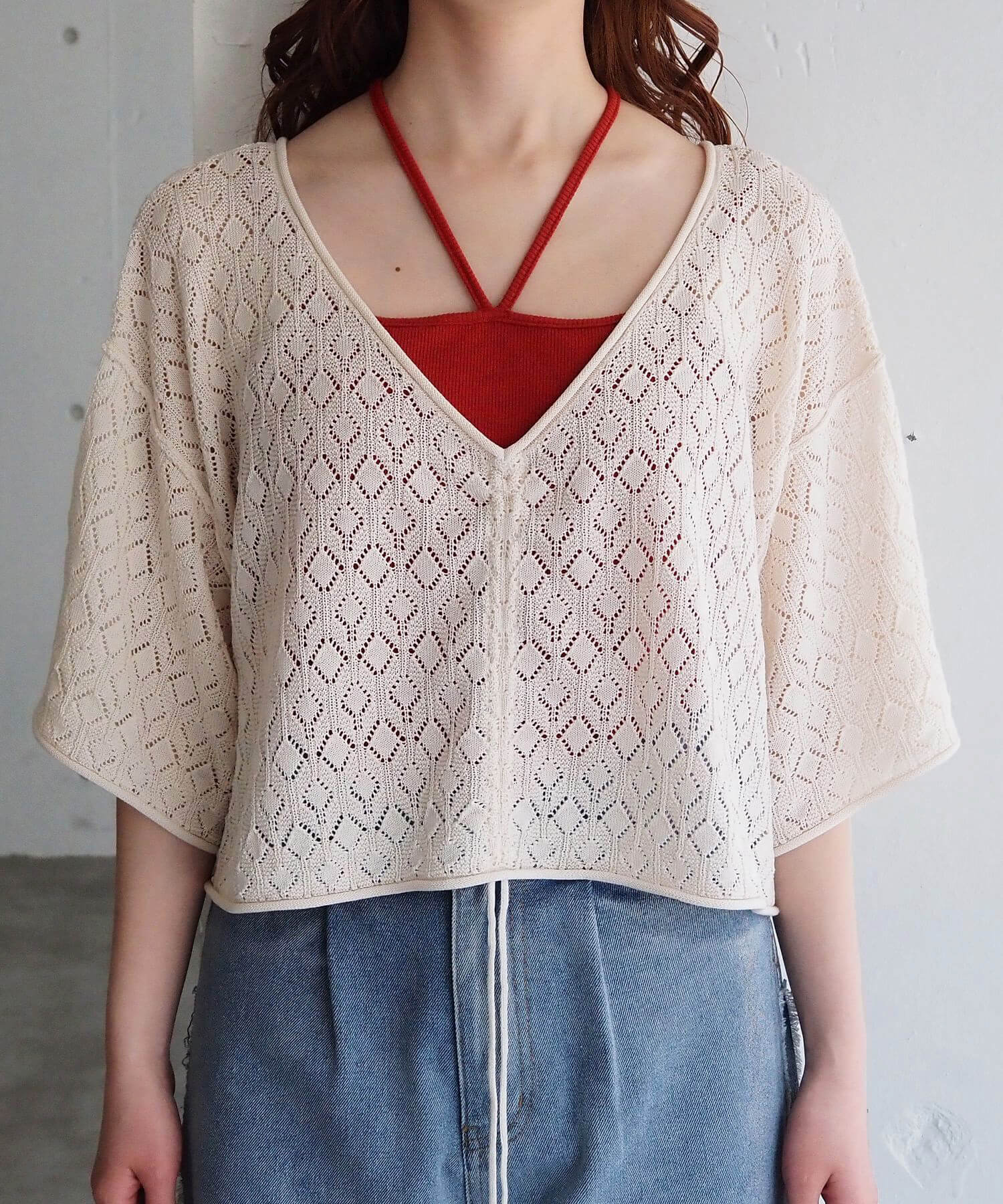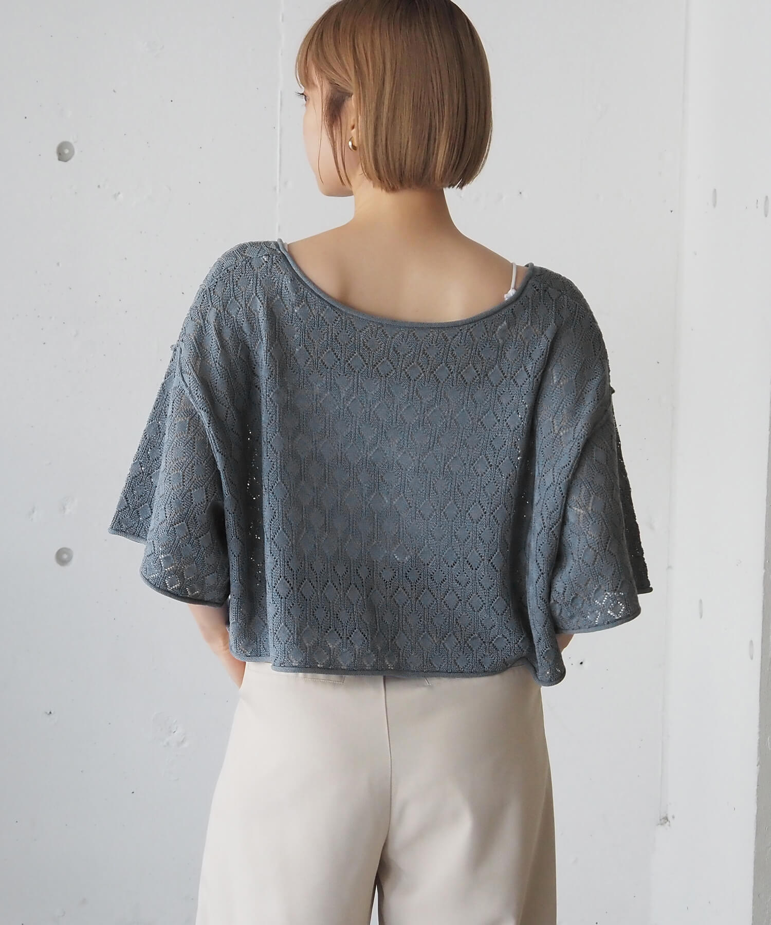 ・旬のドロストデザインとシンプルなクルーネックの前後2wayで着用できるシアーニットです。