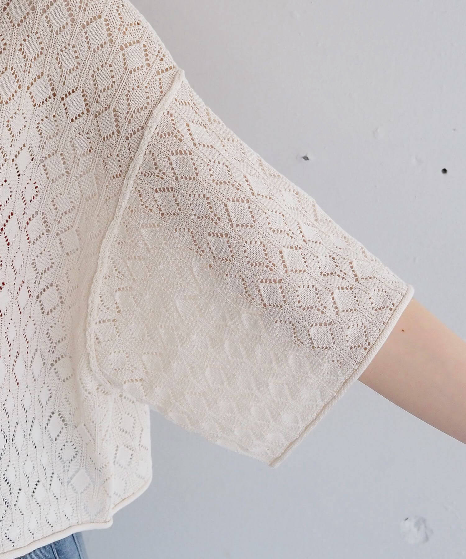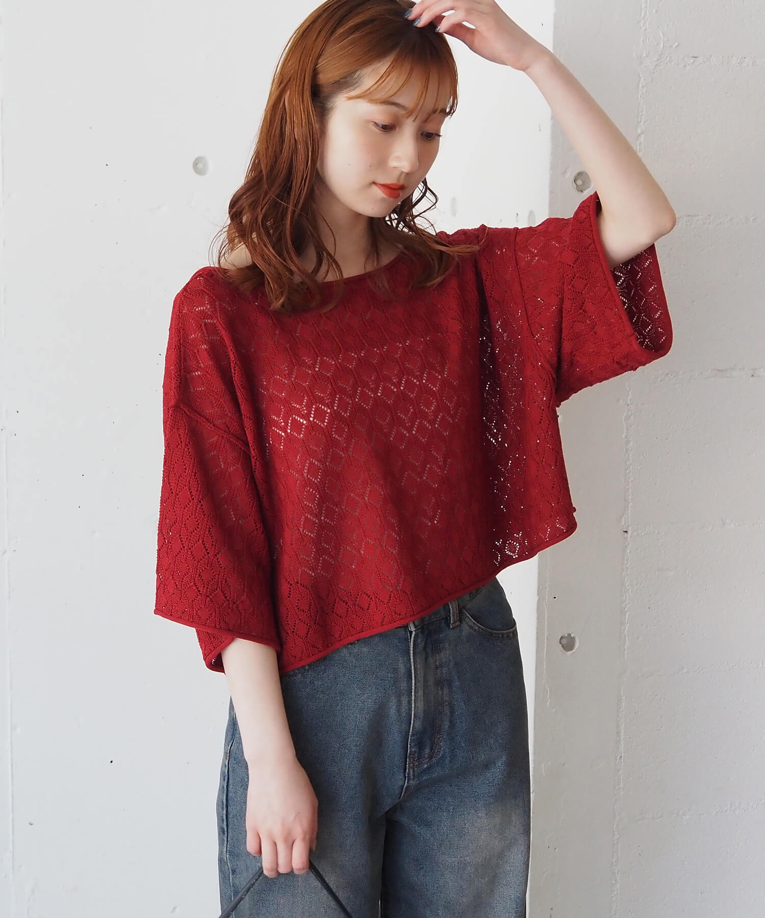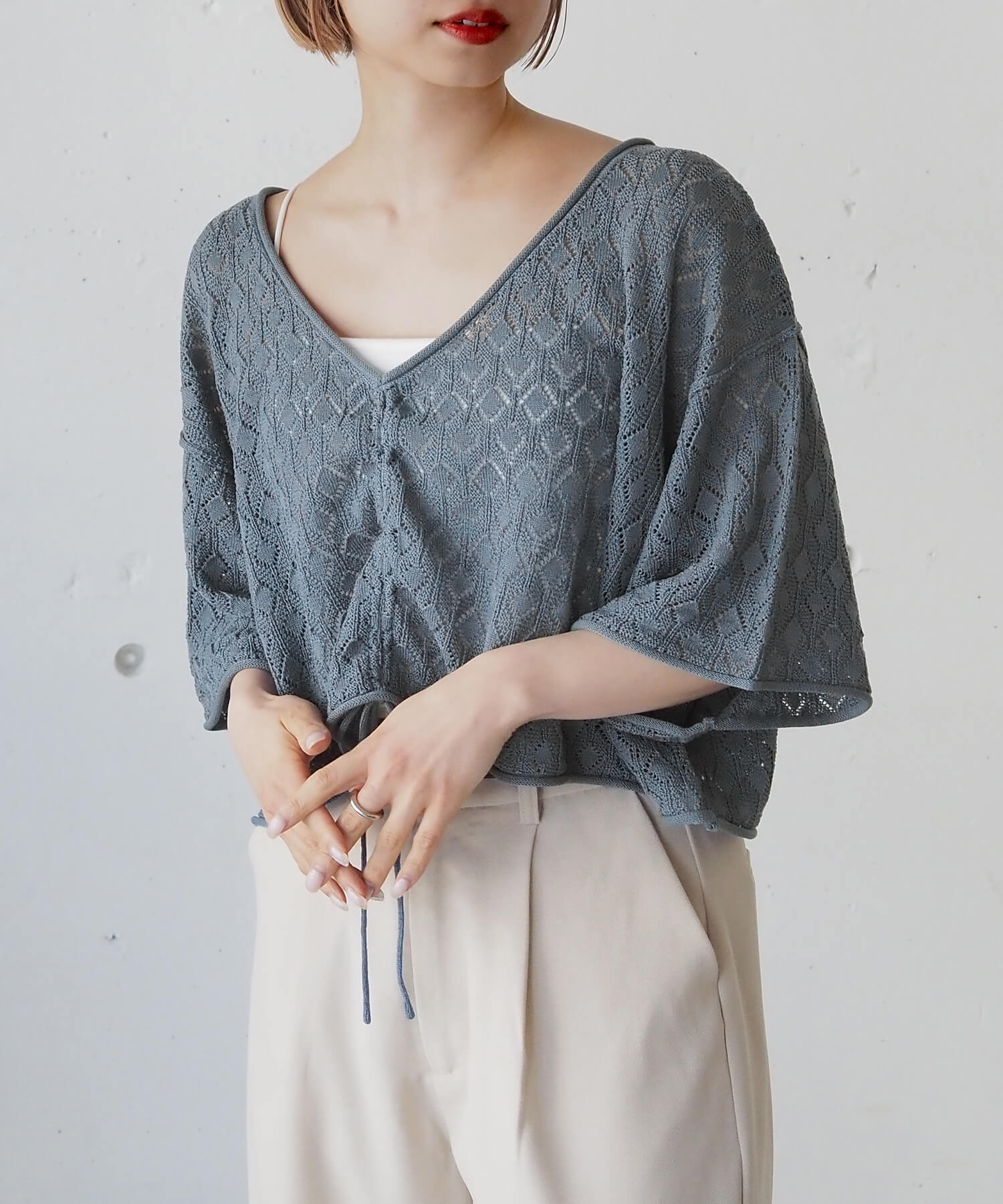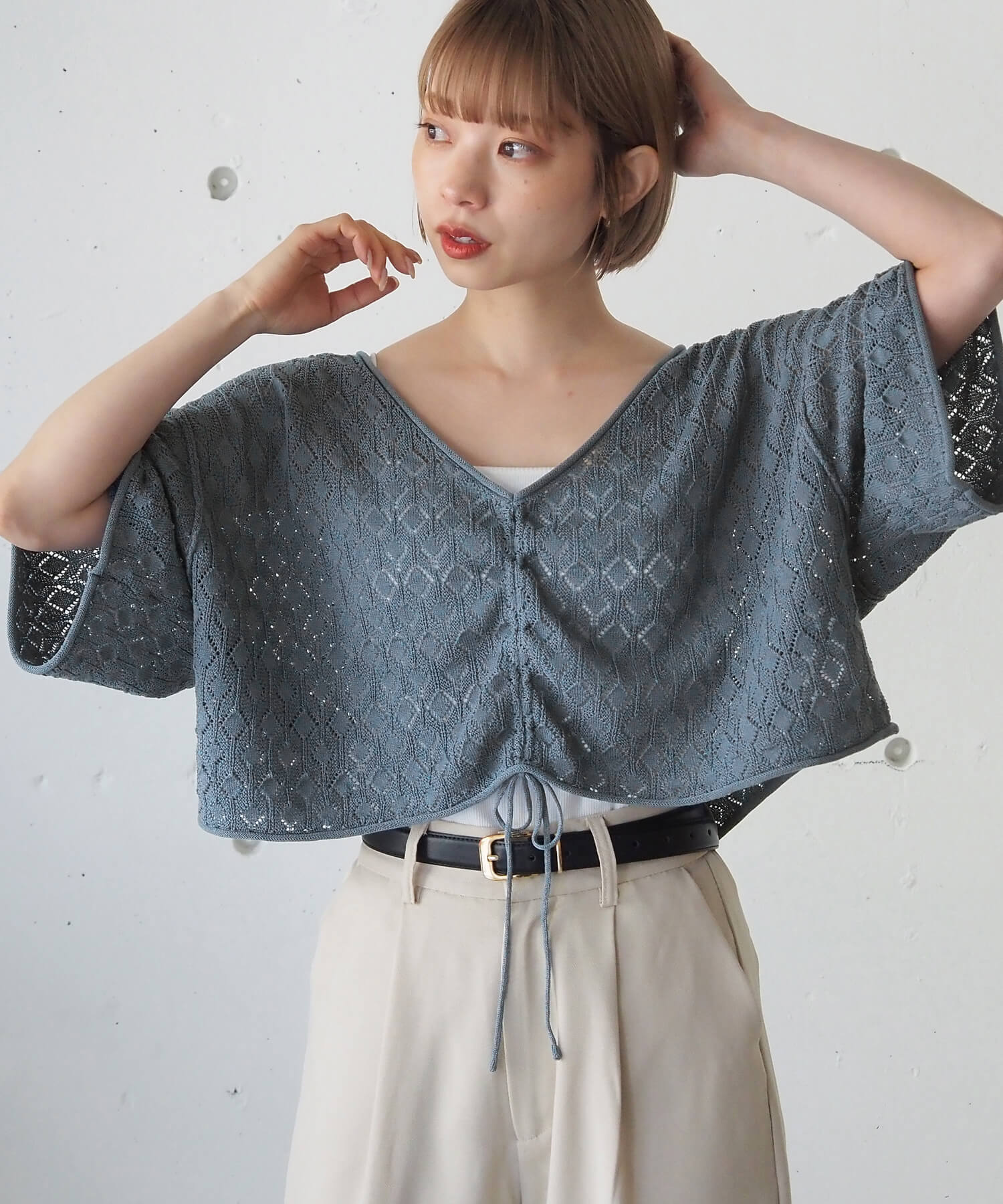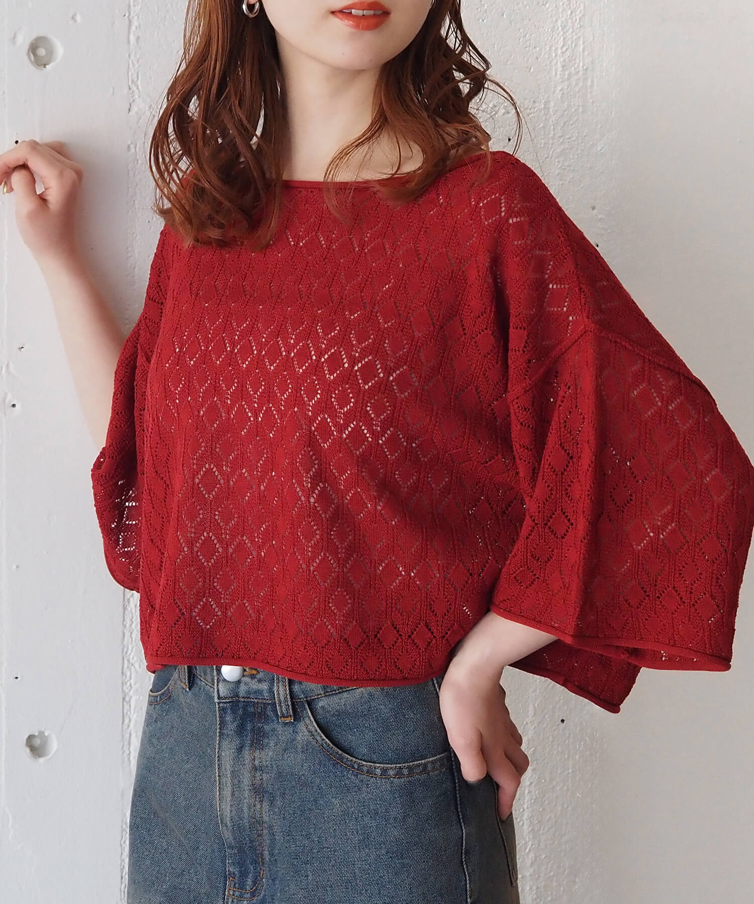 ・旬のドロストデザインとシンプルなクルーネックの前後2wayで着用できるシアーニットです。