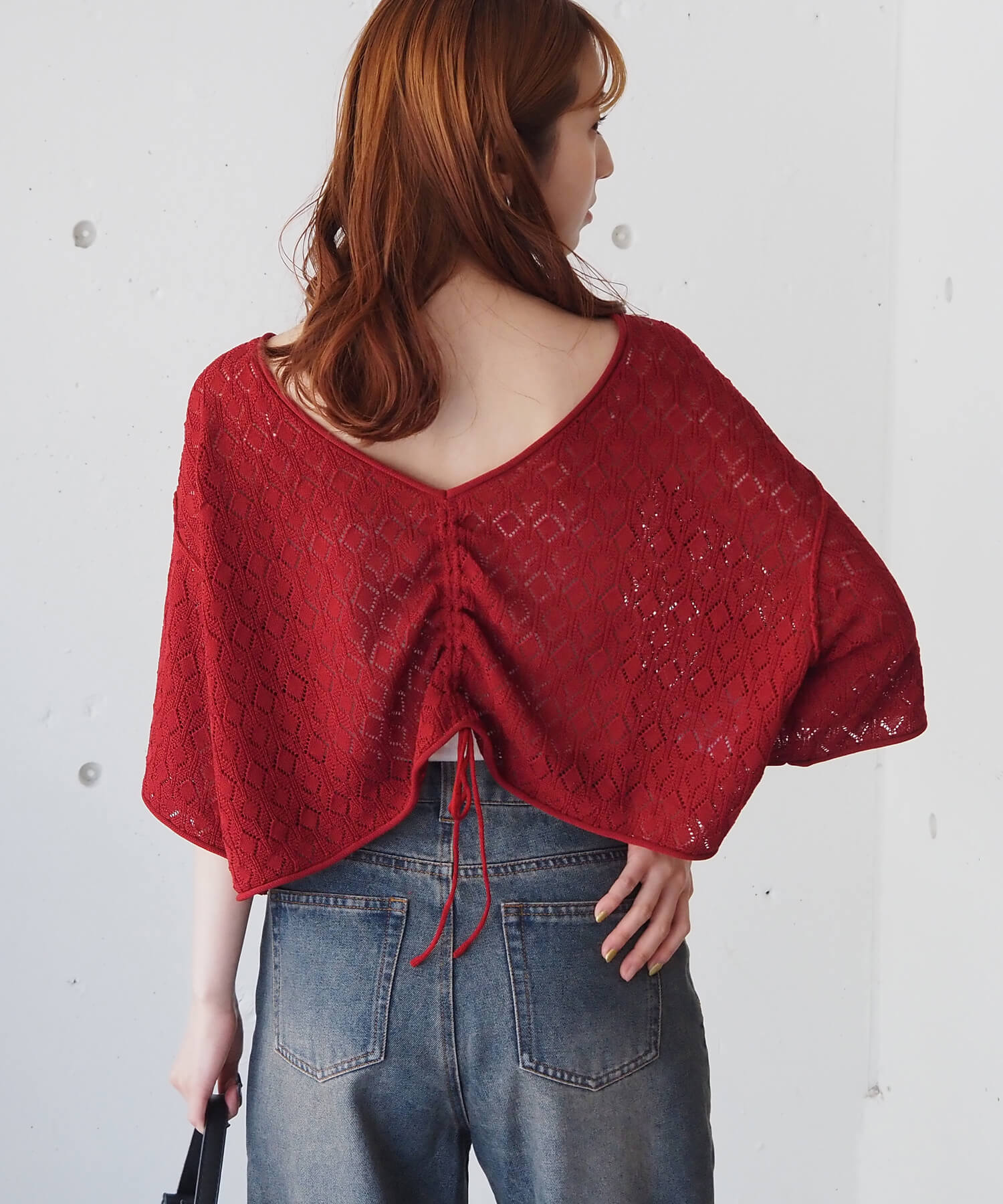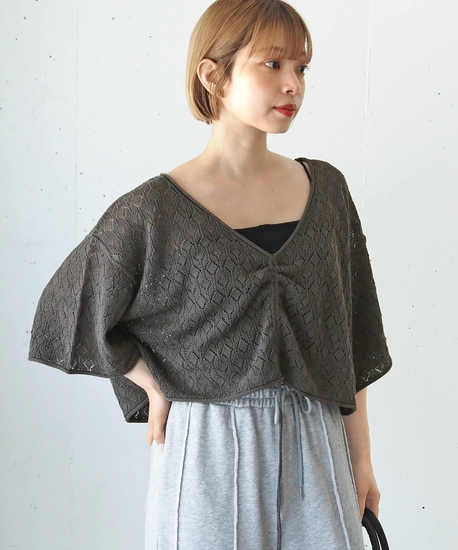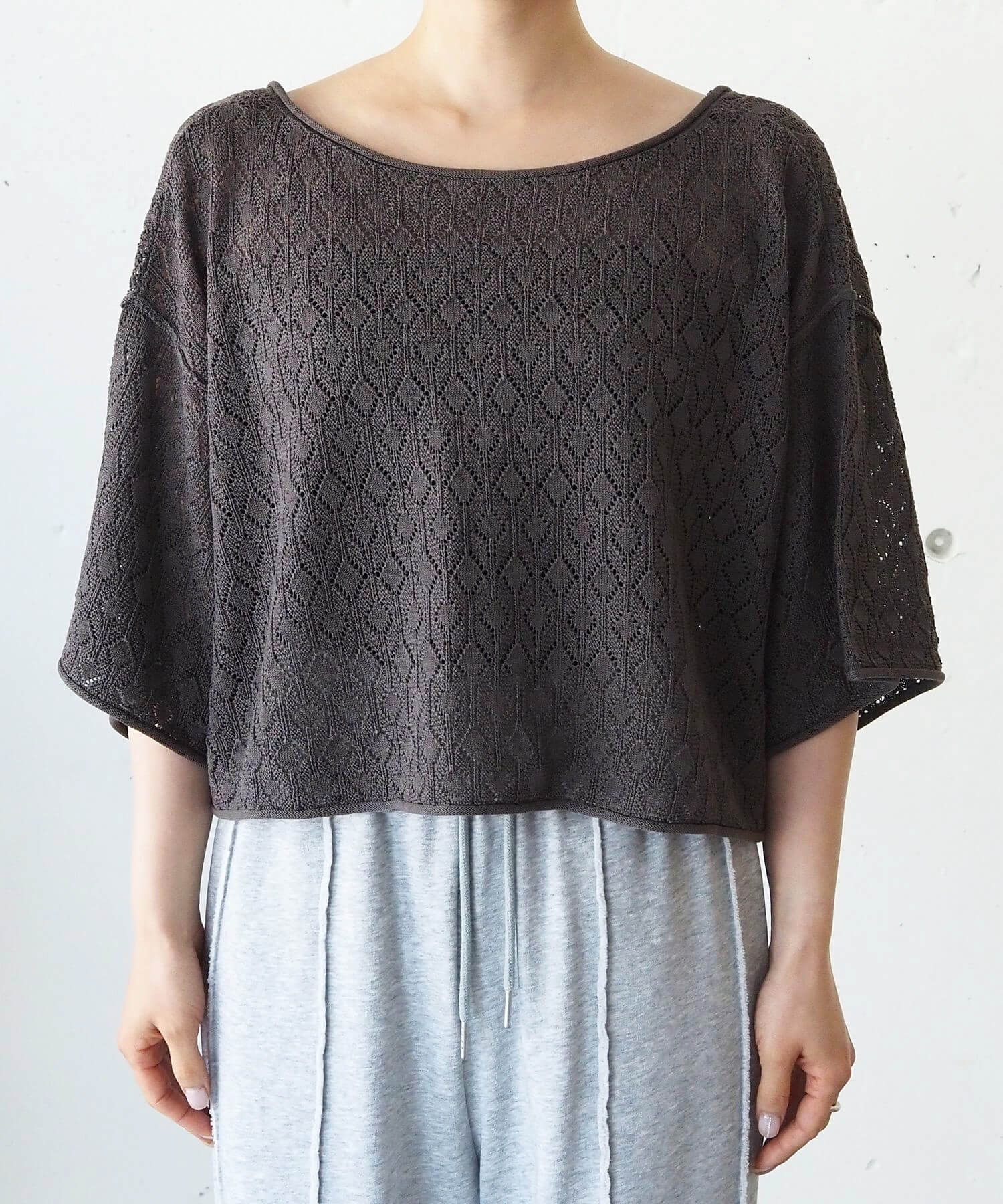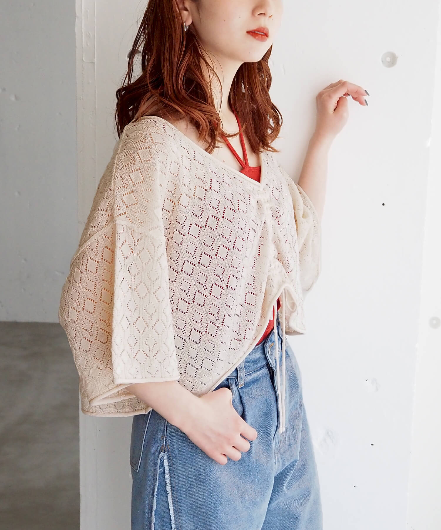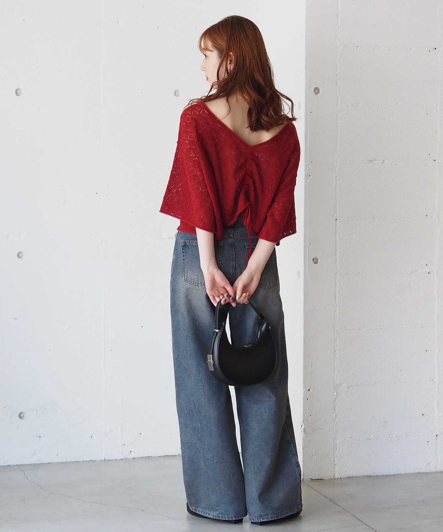 ・旬のドロストデザインとシンプルなクルーネックの前後2wayで着用できるシアーニットです。