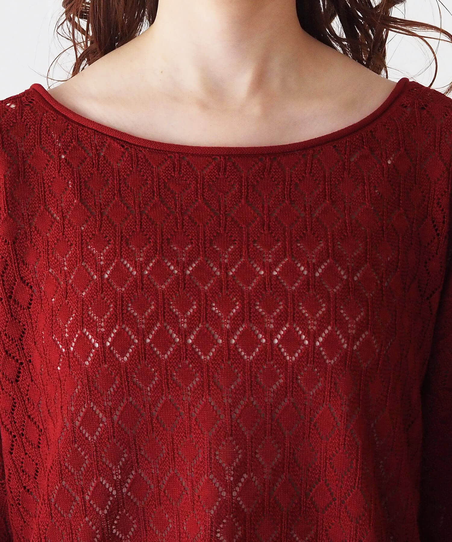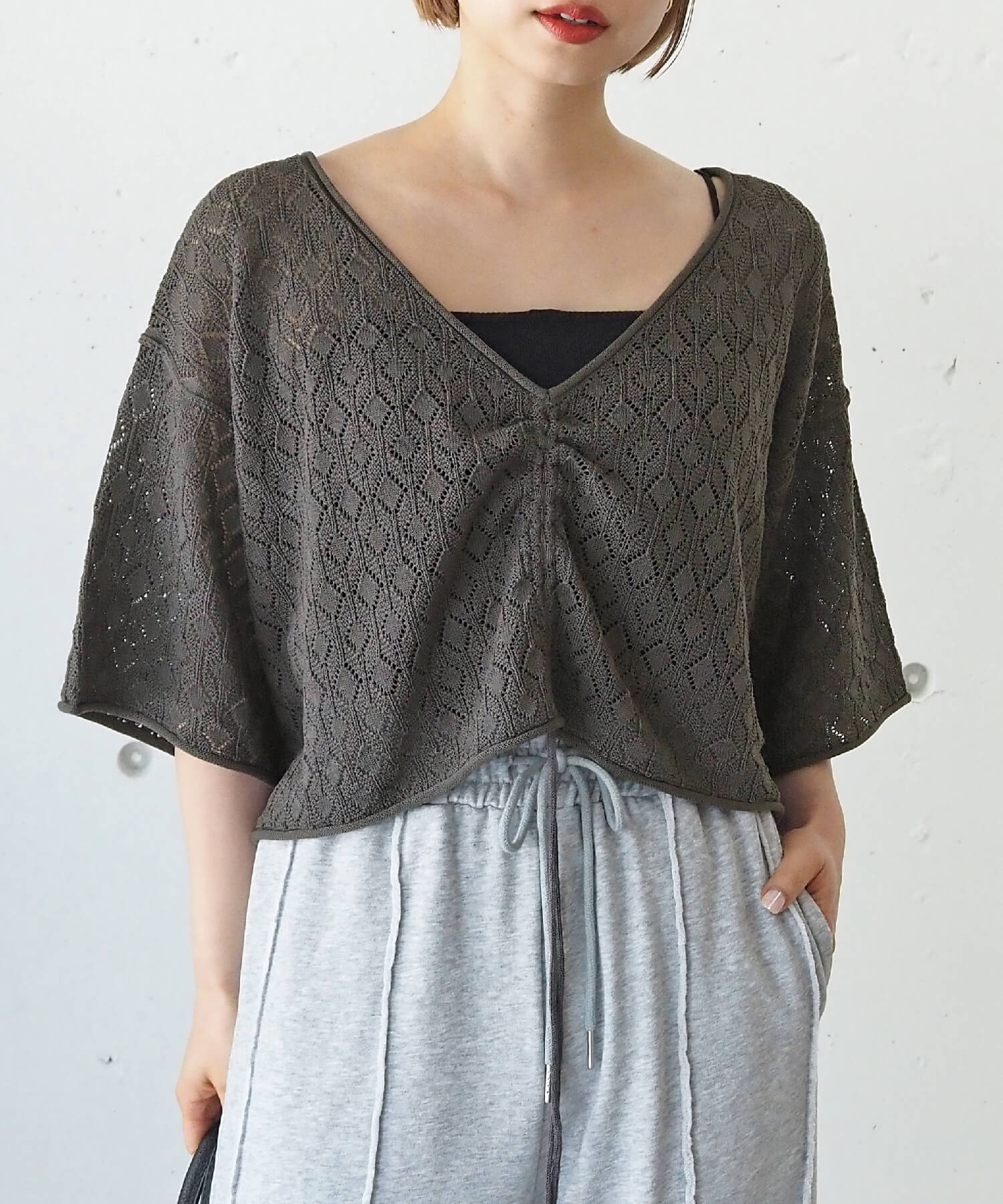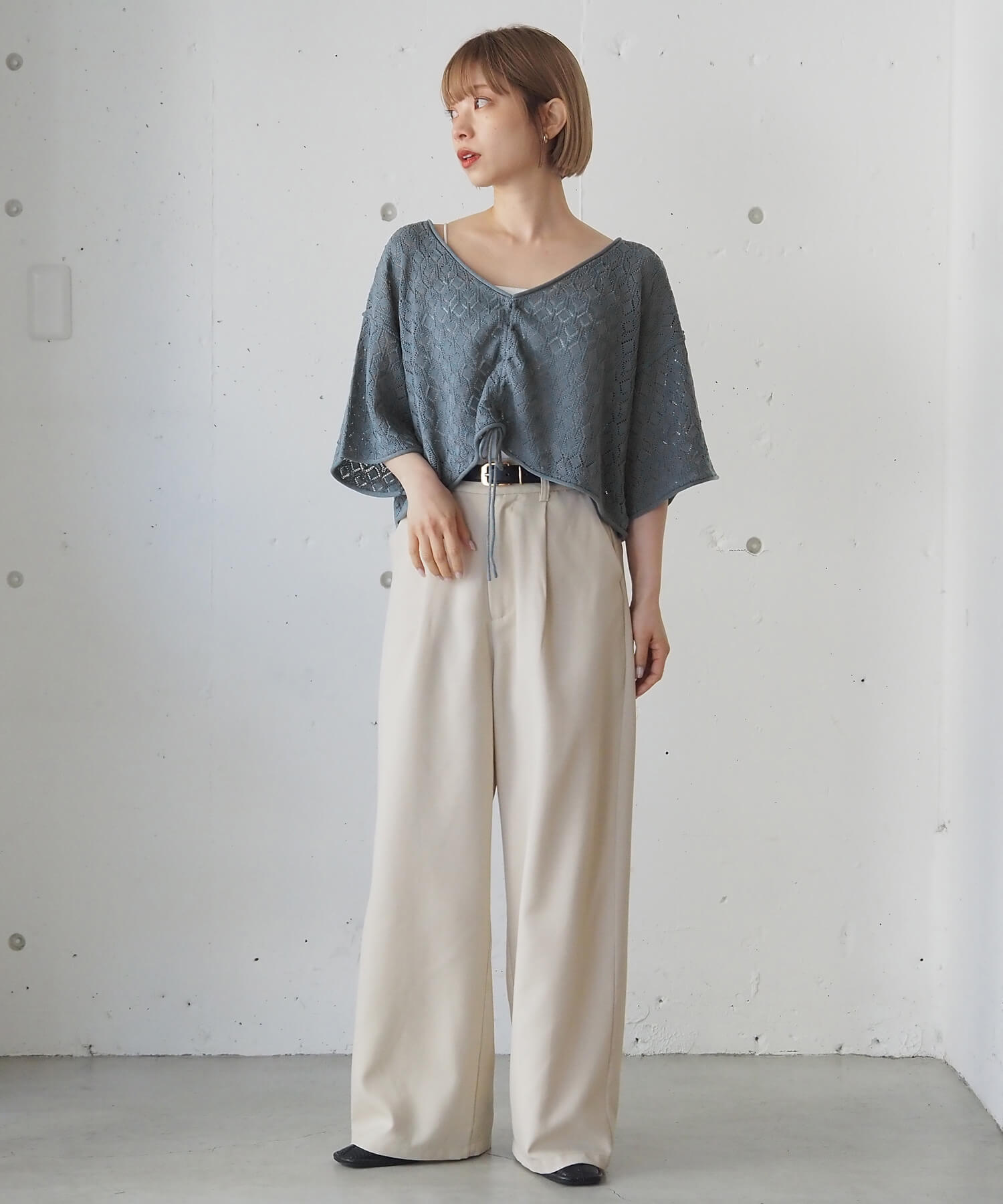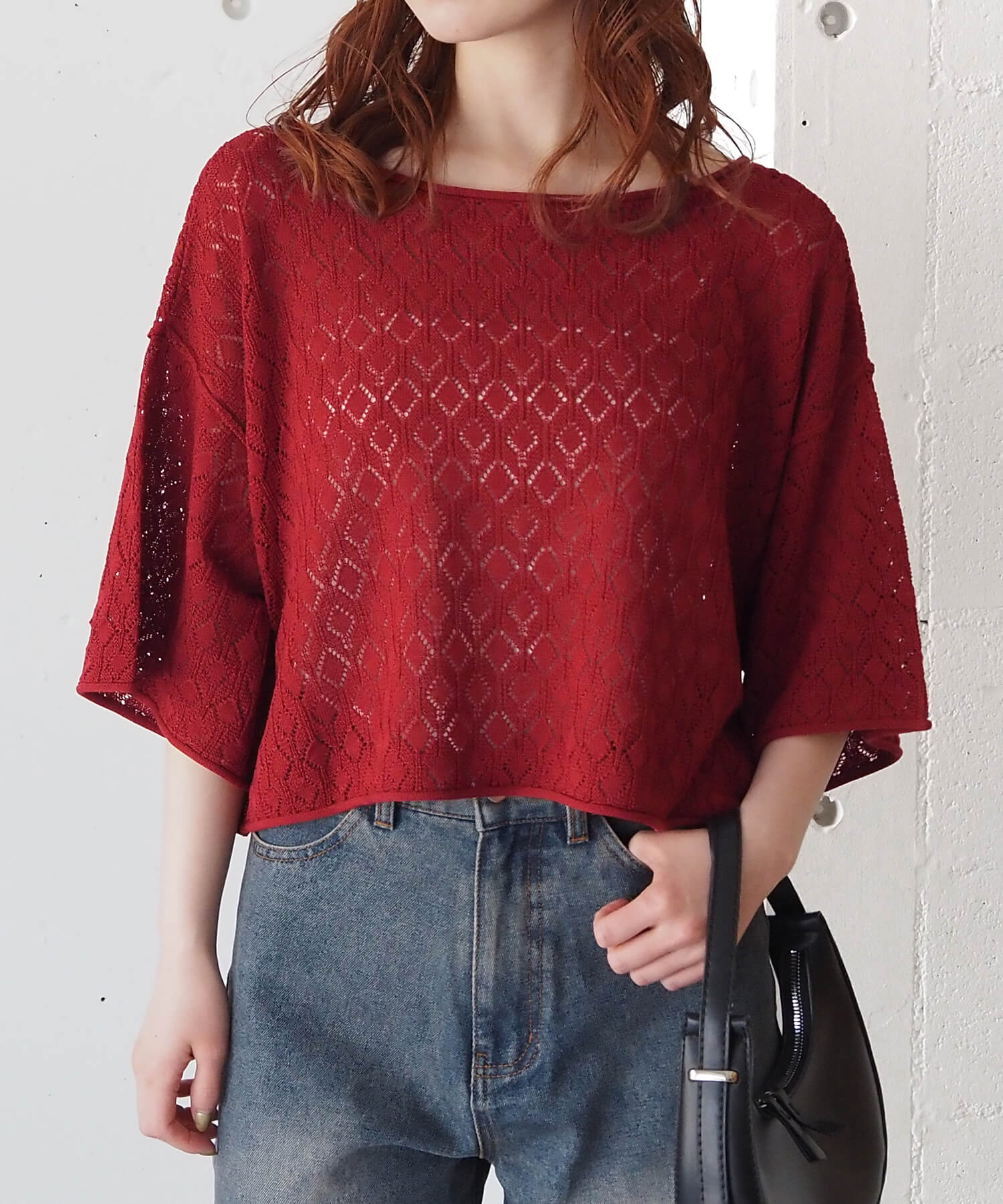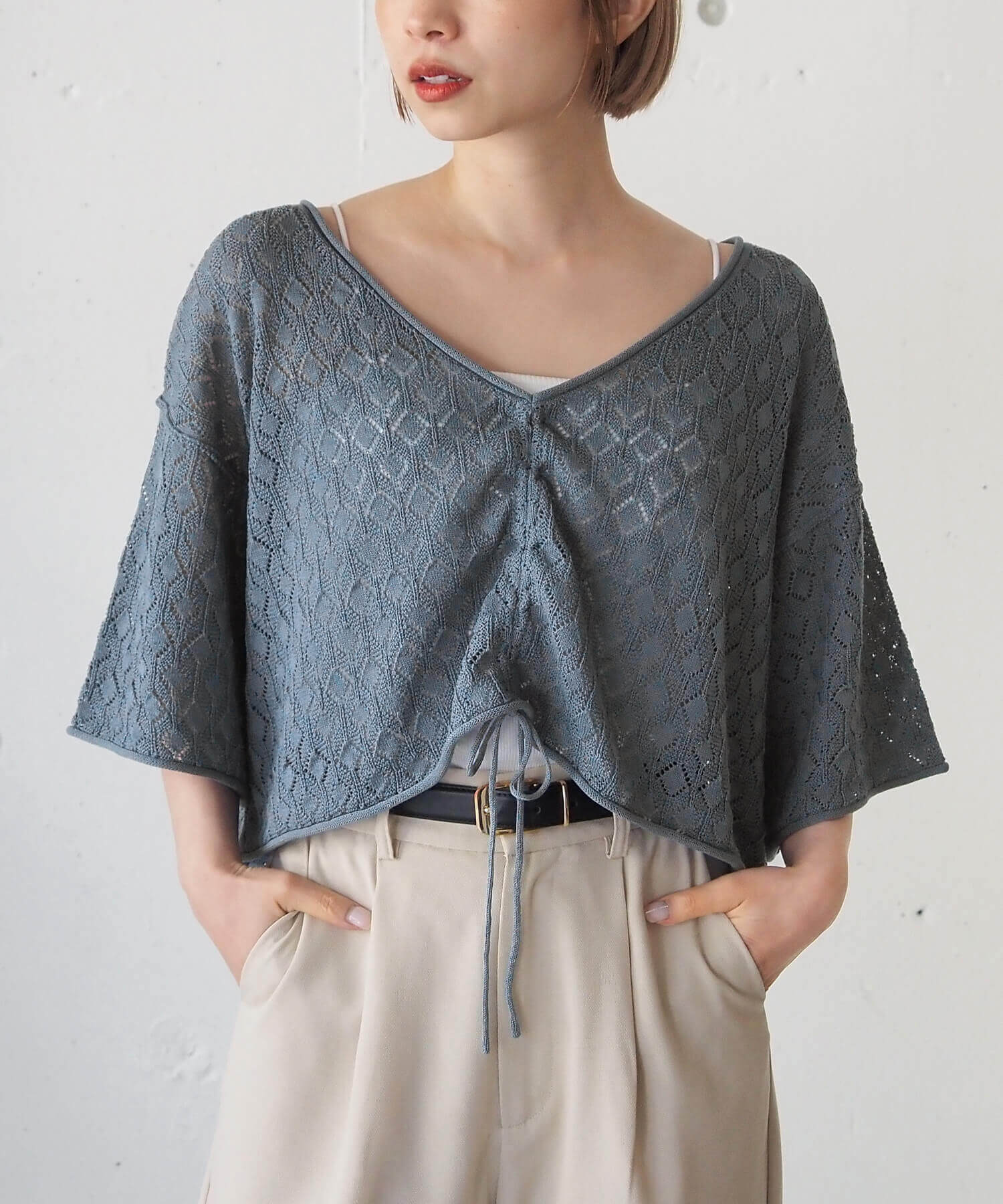・旬のドロストデザインとシンプルなクルーネックの前後2wayで着用できるシアーニットです。