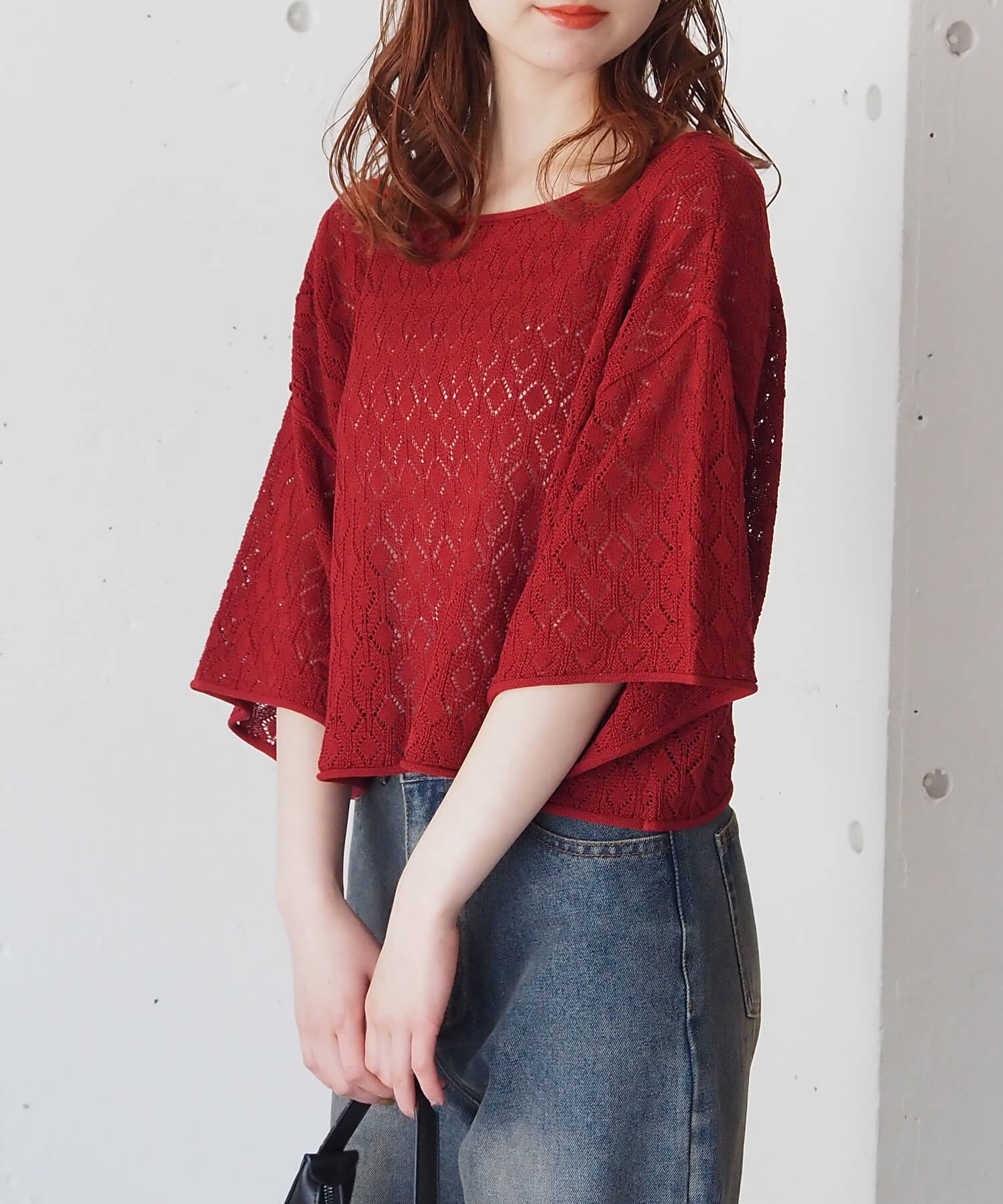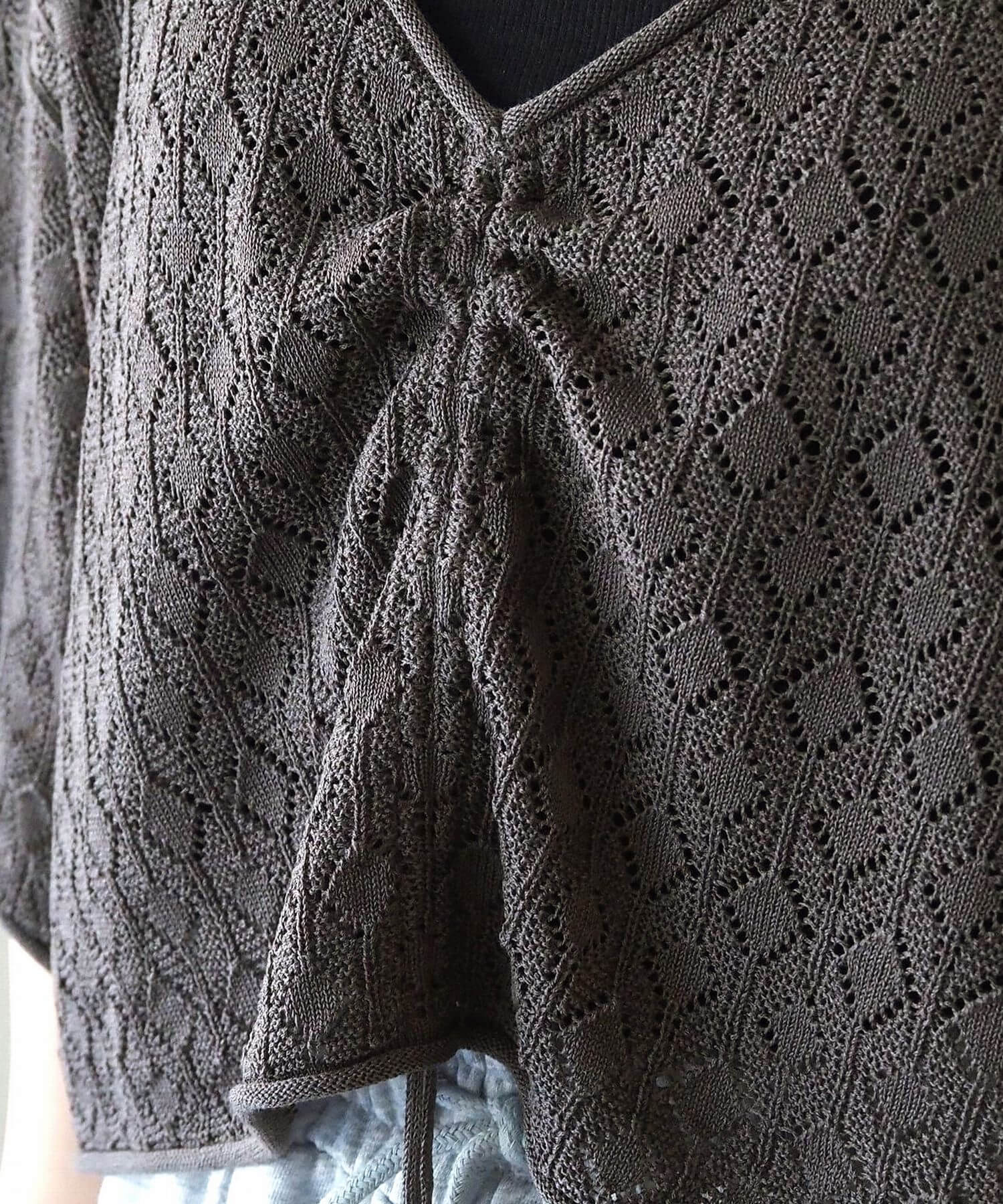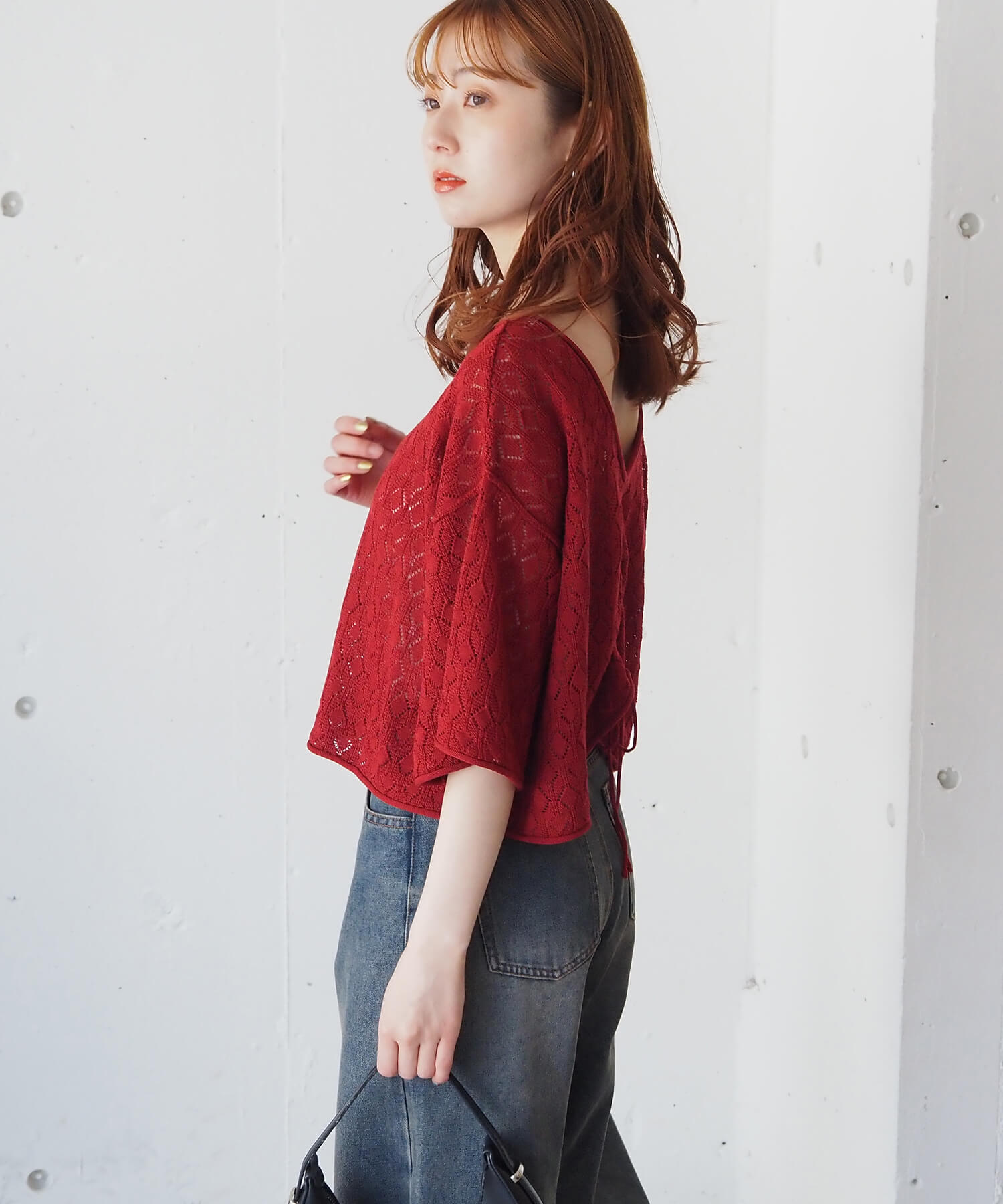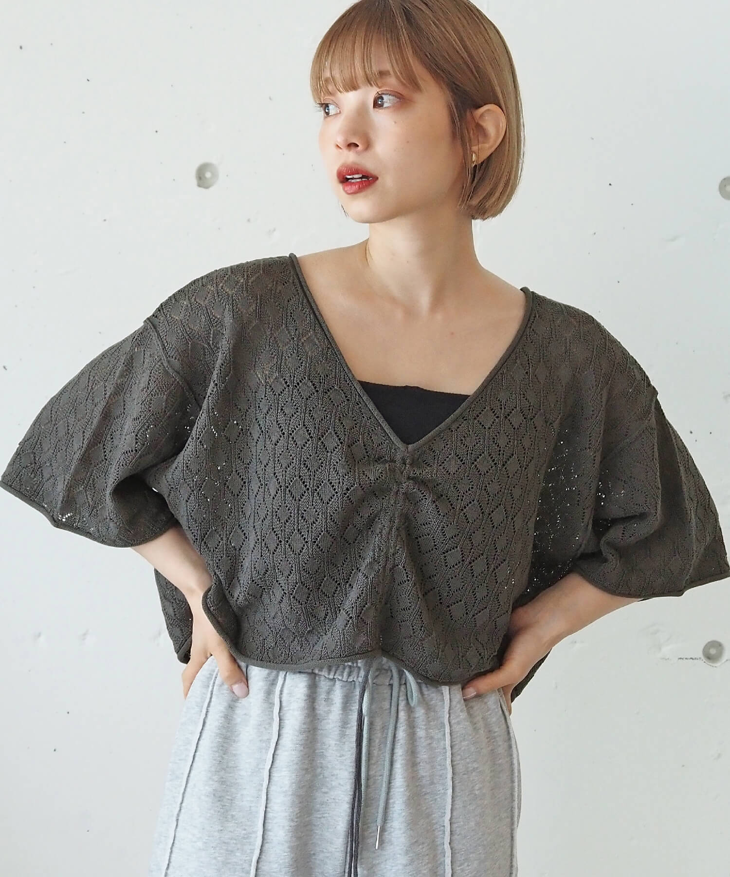 ・旬のドロストデザインとシンプルなクルーネックの前後2wayで着用できるシアーニットです。