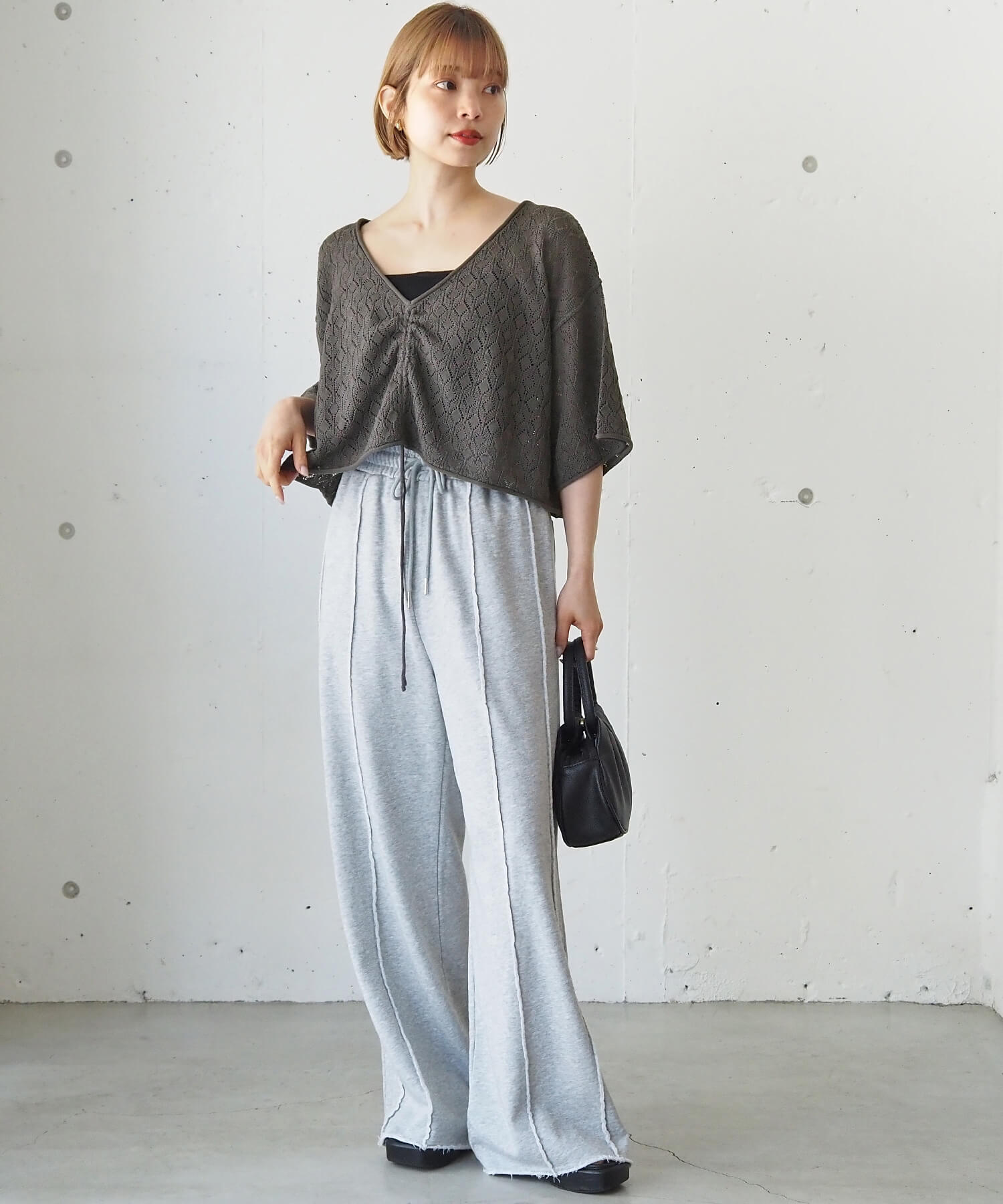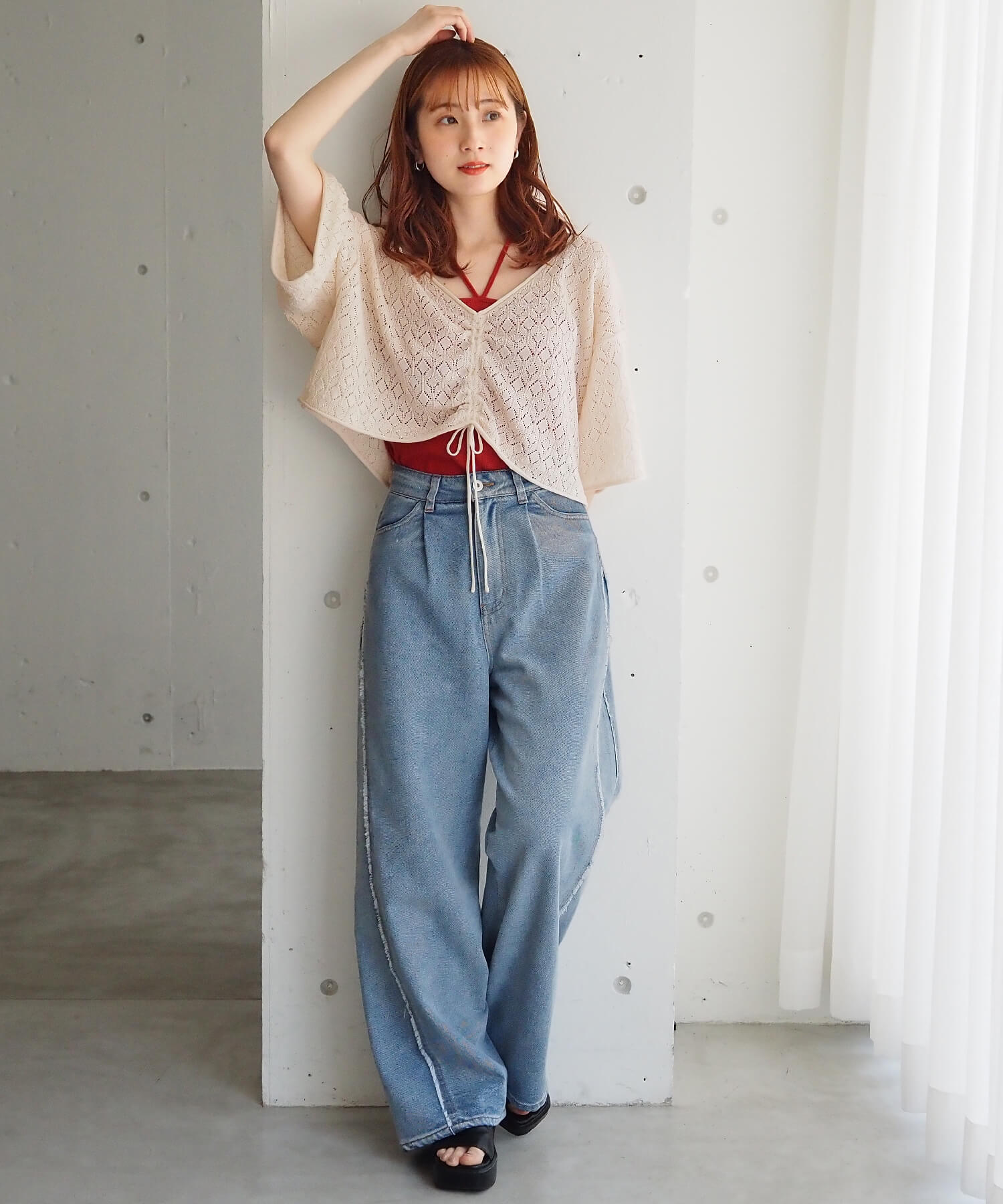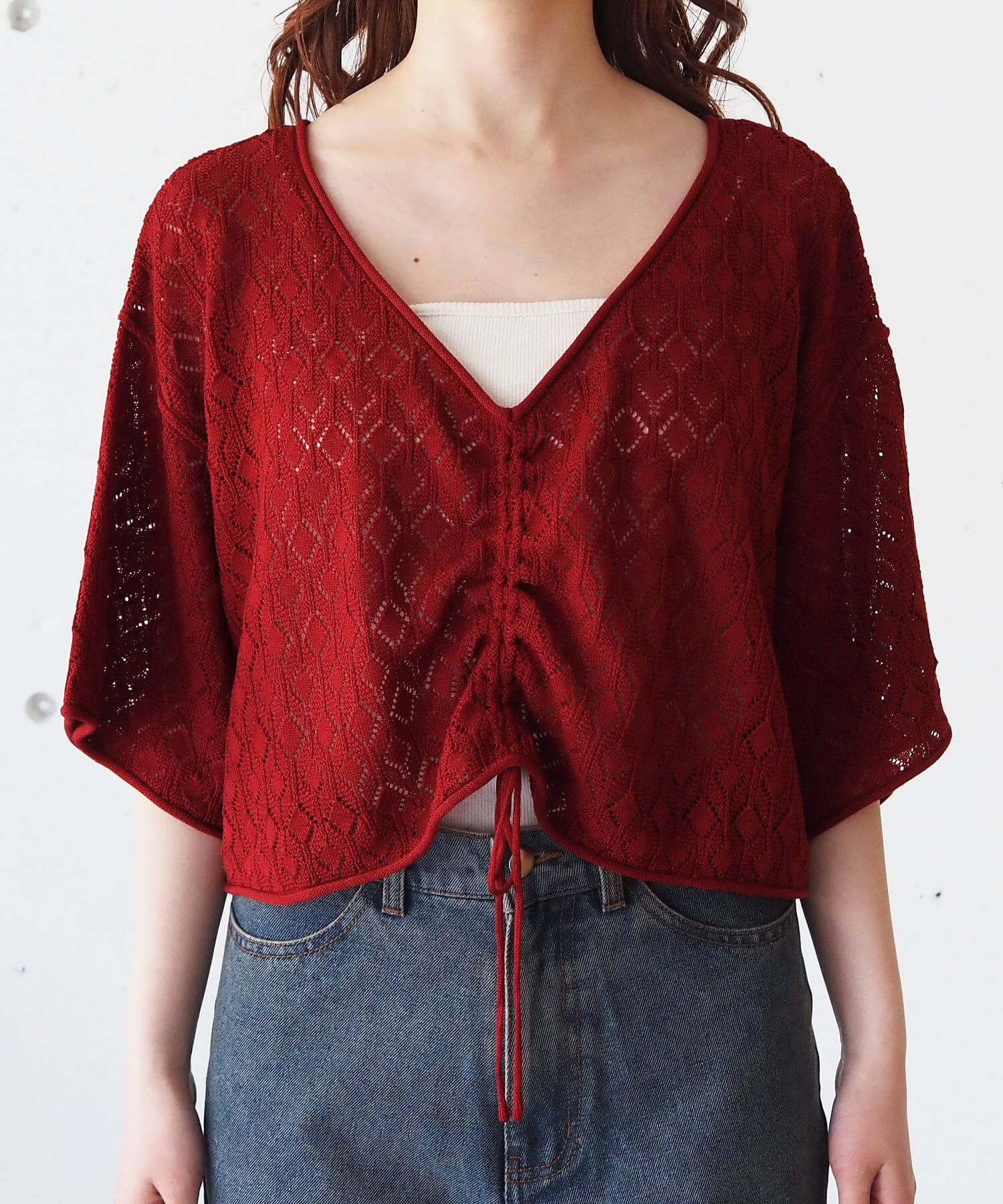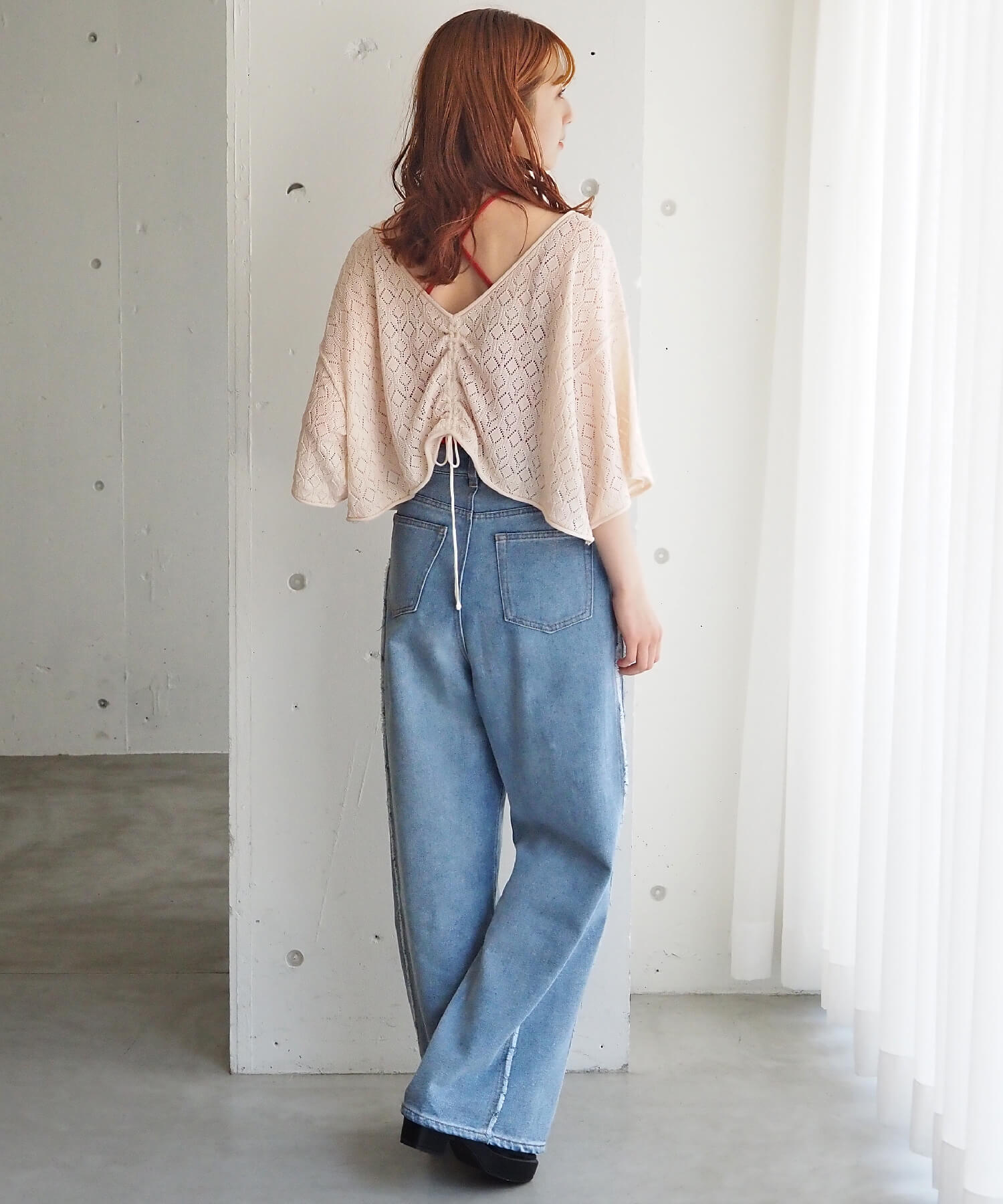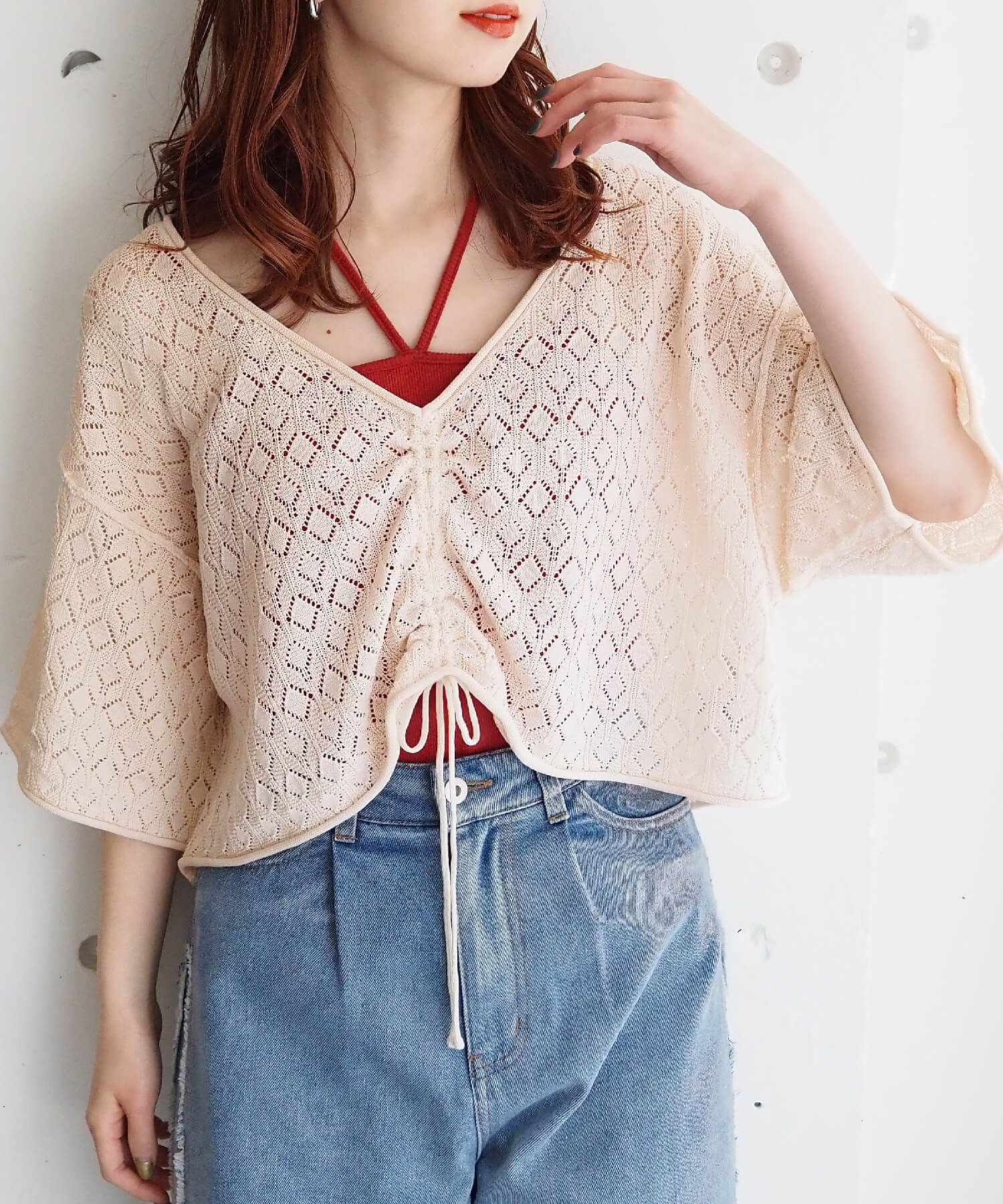 ・旬のドロストデザインとシンプルなクルーネックの前後2wayで着用できるシアーニットです。
