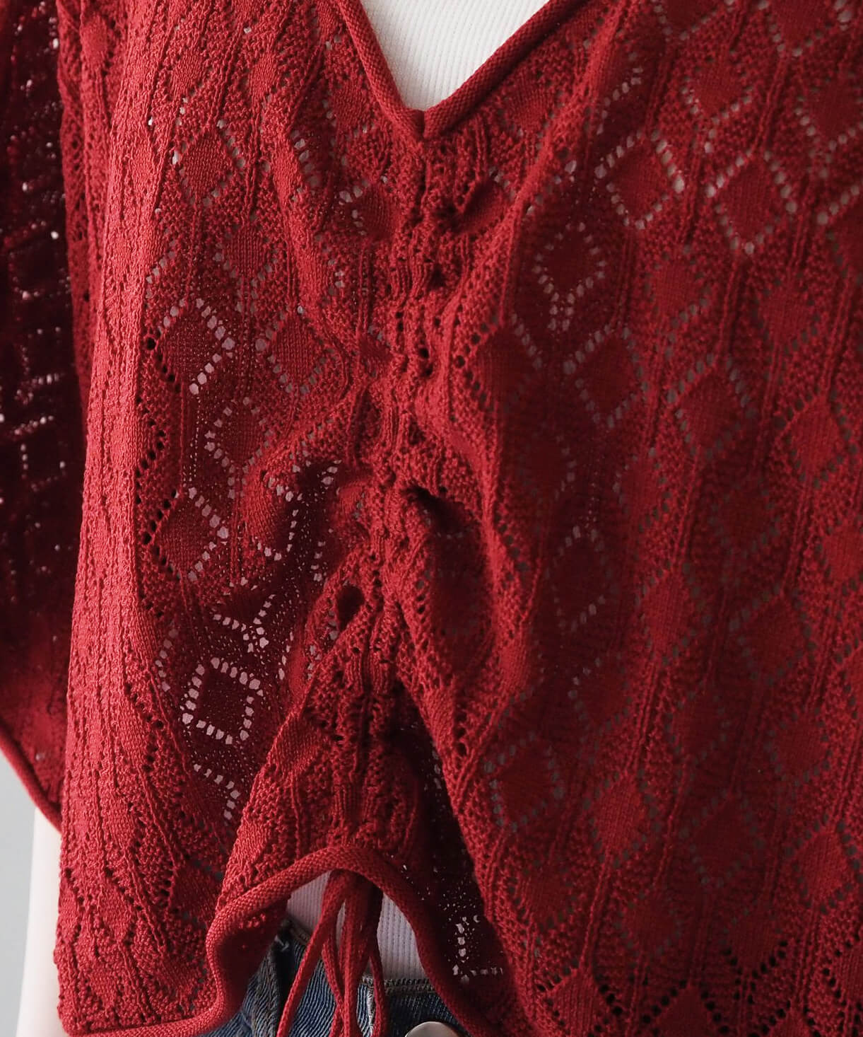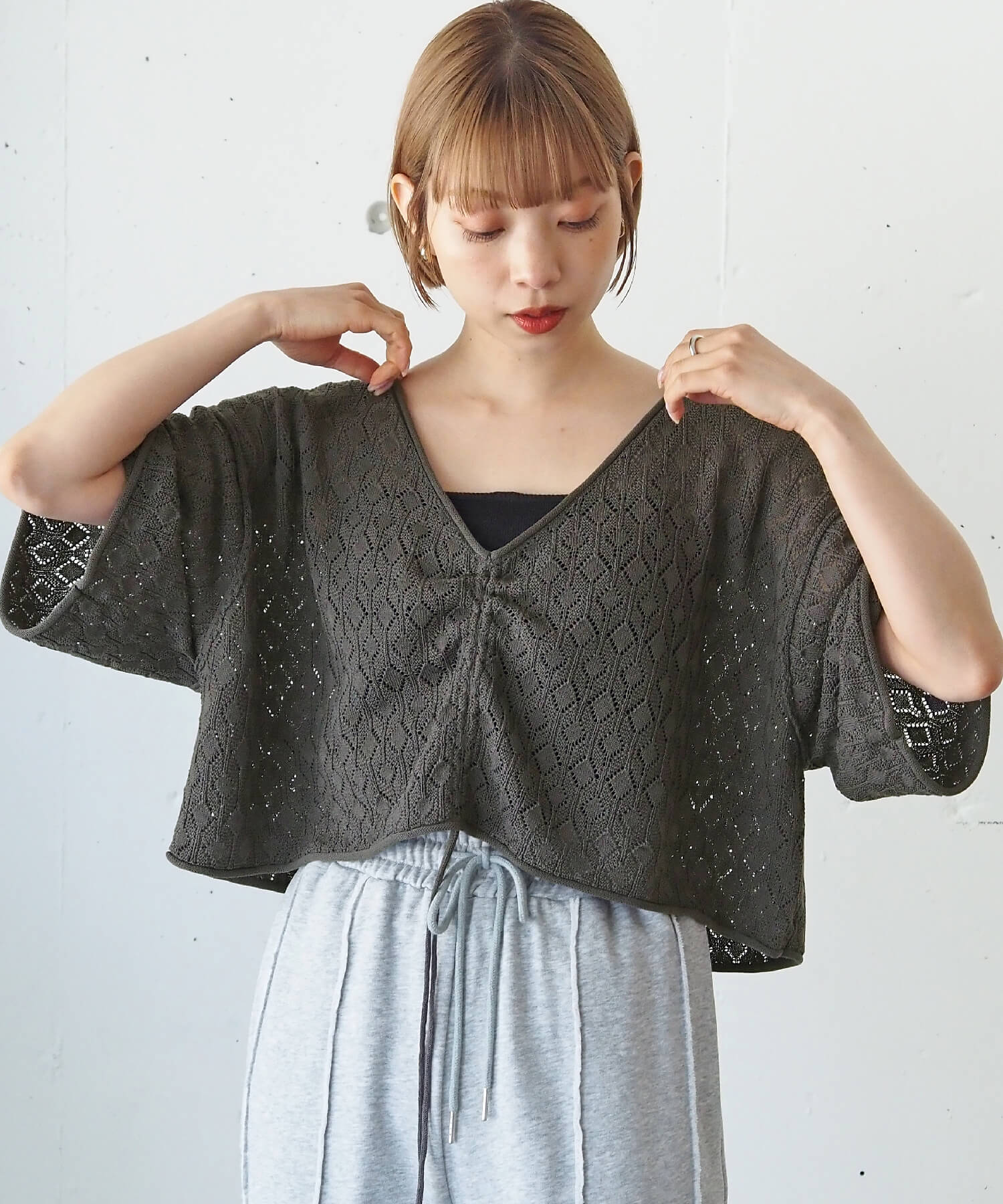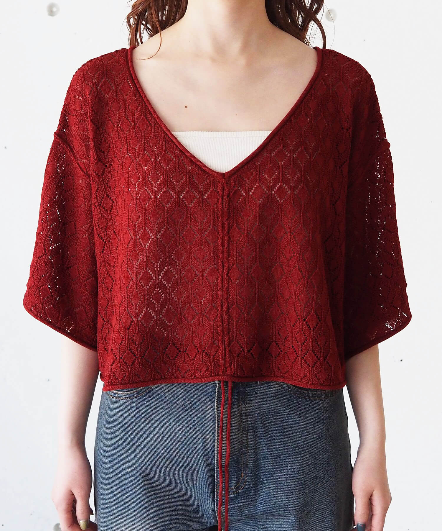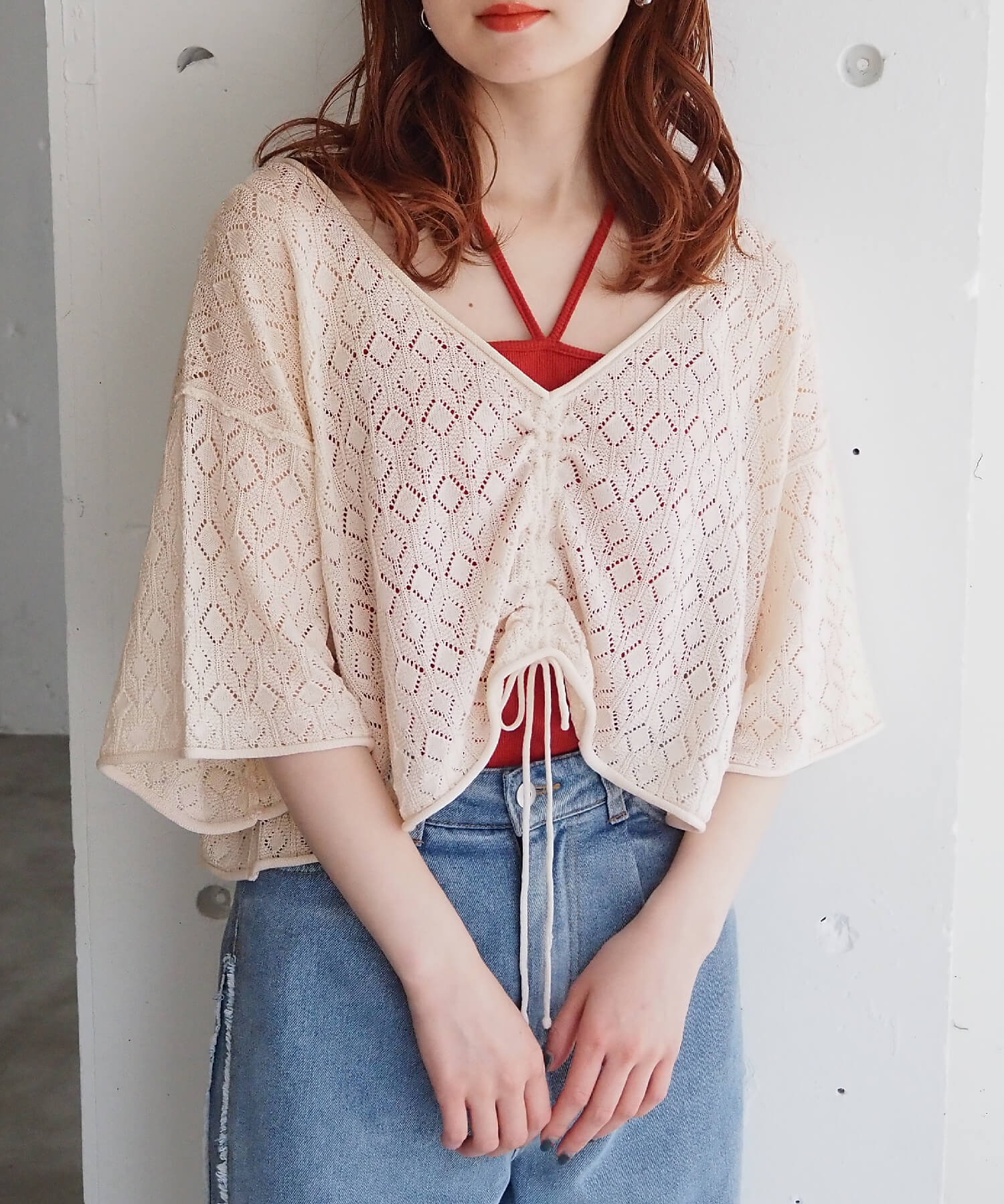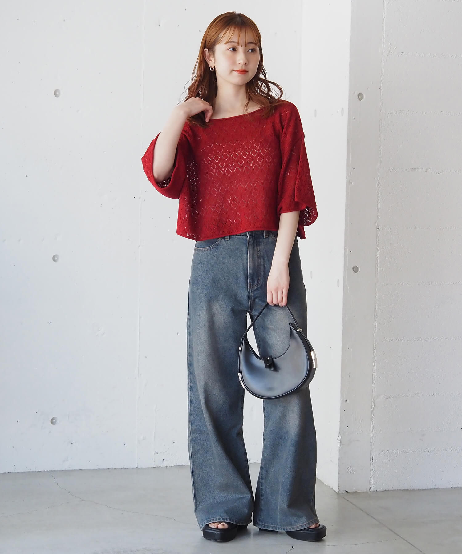 ・旬のドロストデザインとシンプルなクルーネックの前後2wayで着用できるシアーニットです。