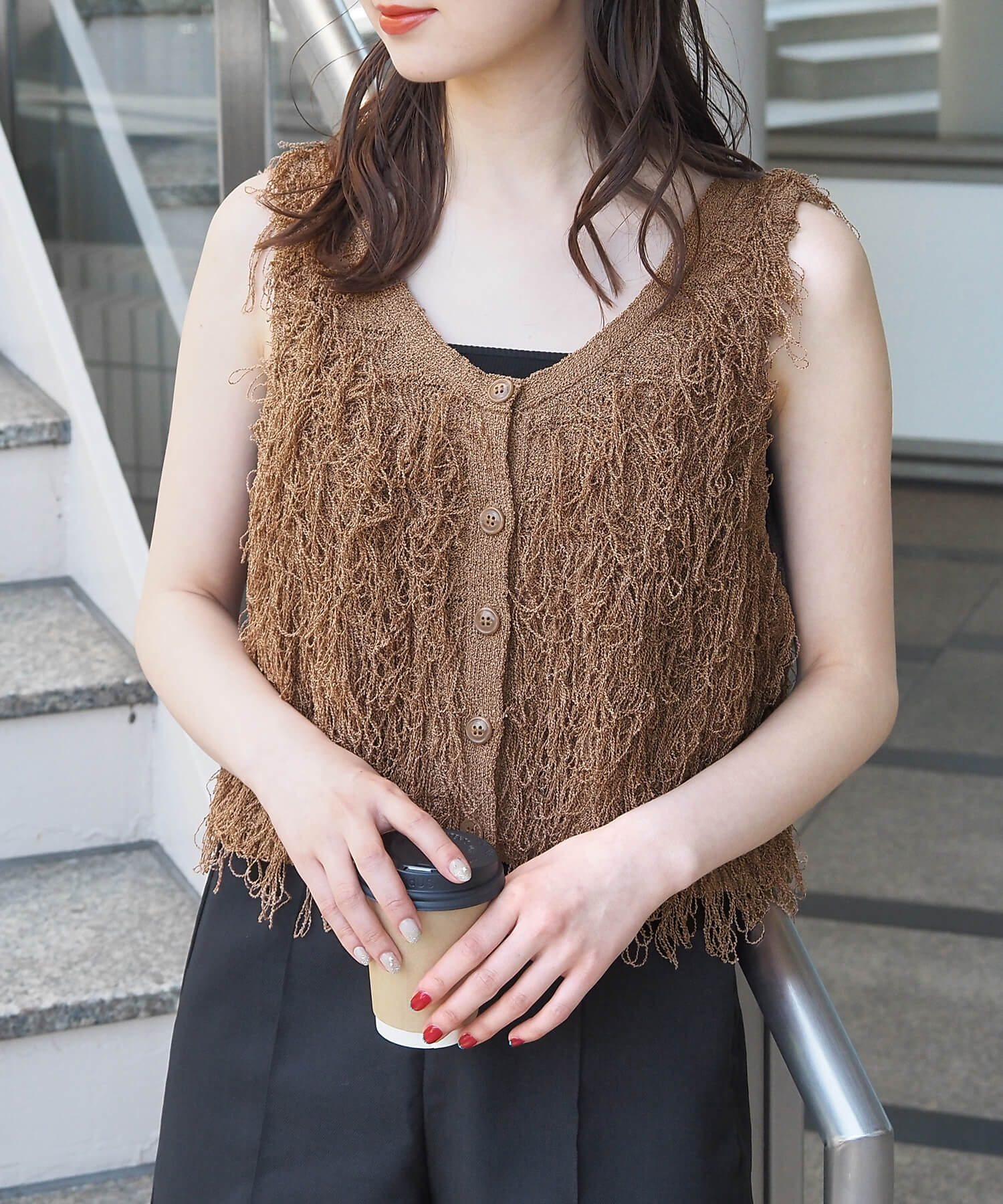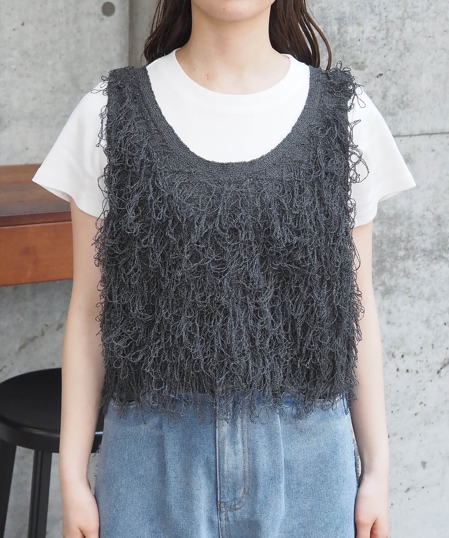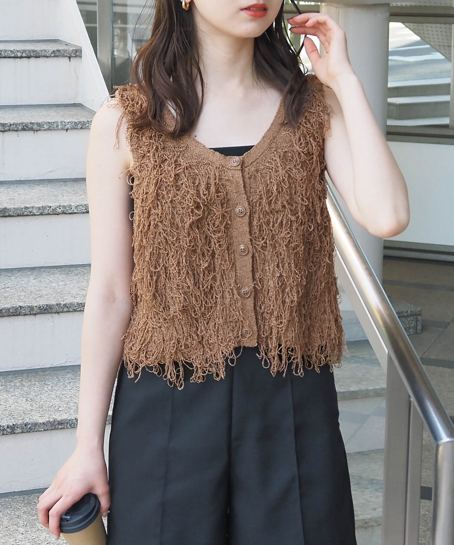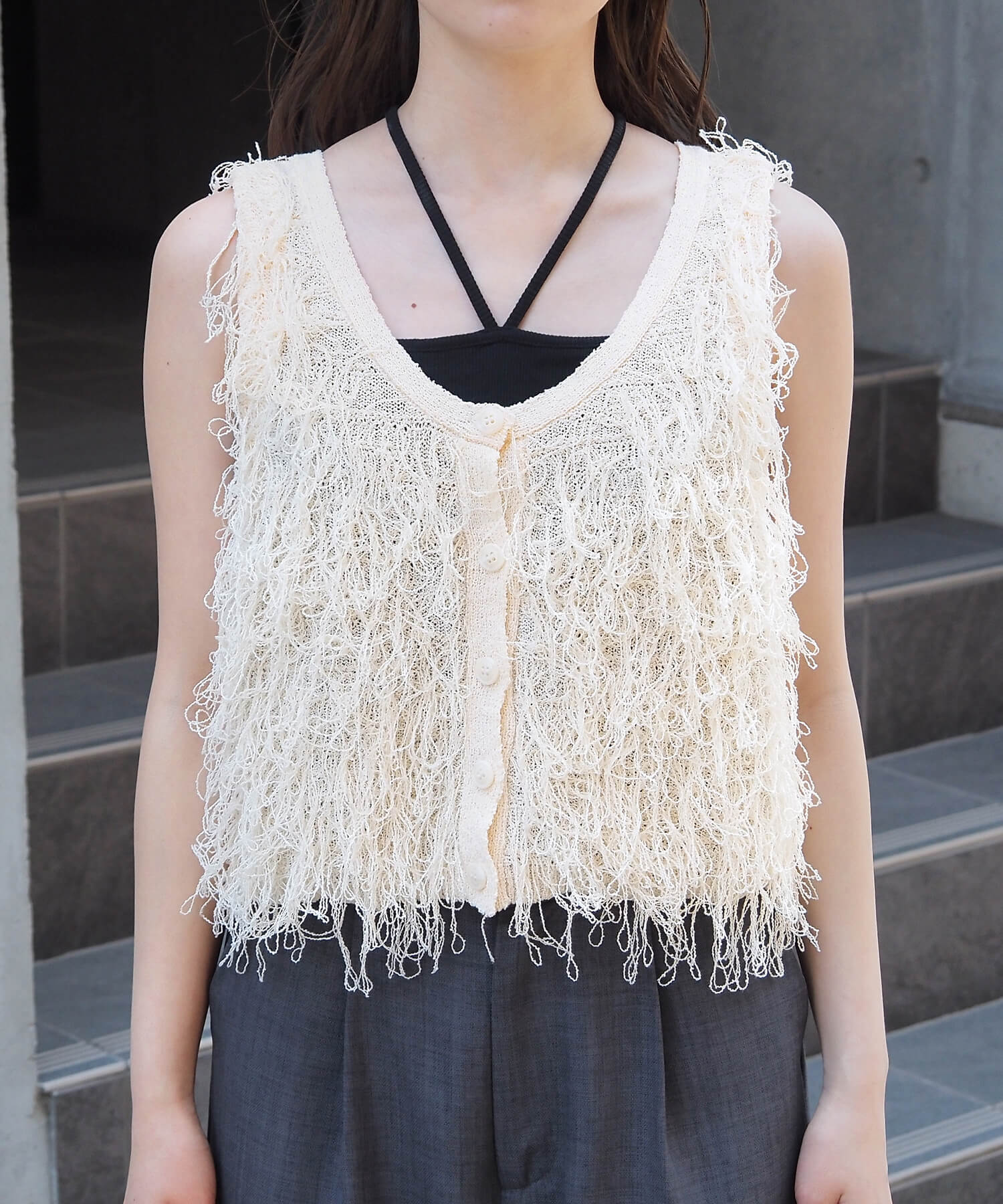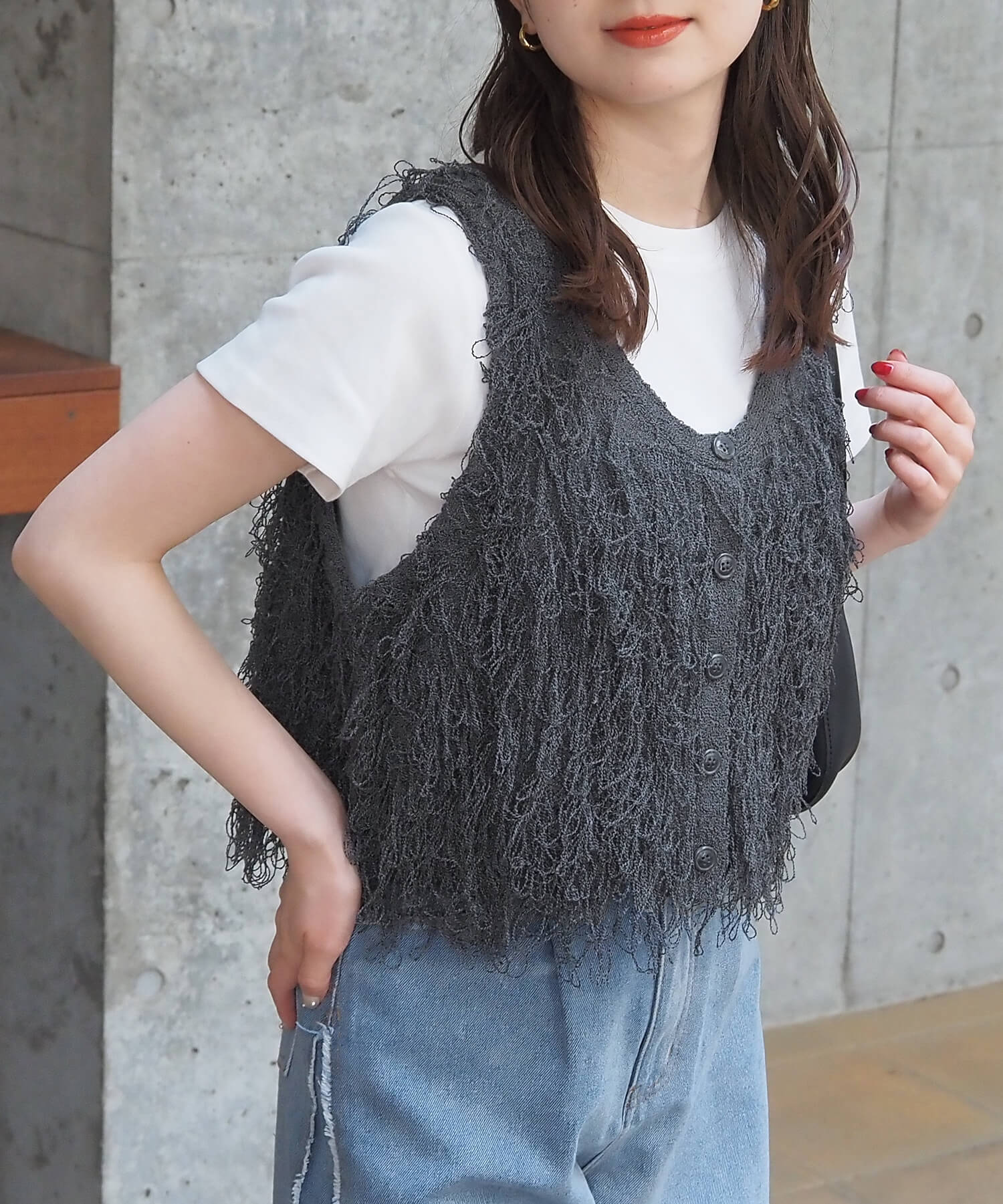 ・表情のあるフリンジ生地が魅力のショート丈ベストです。