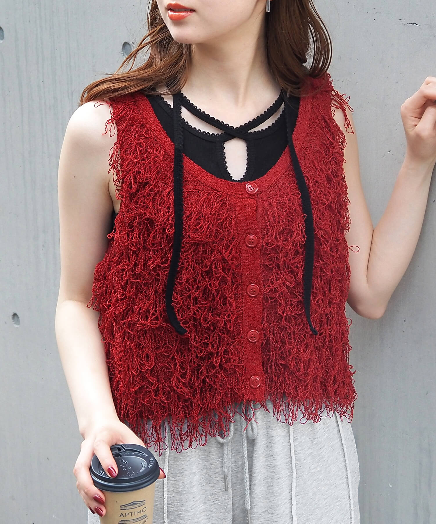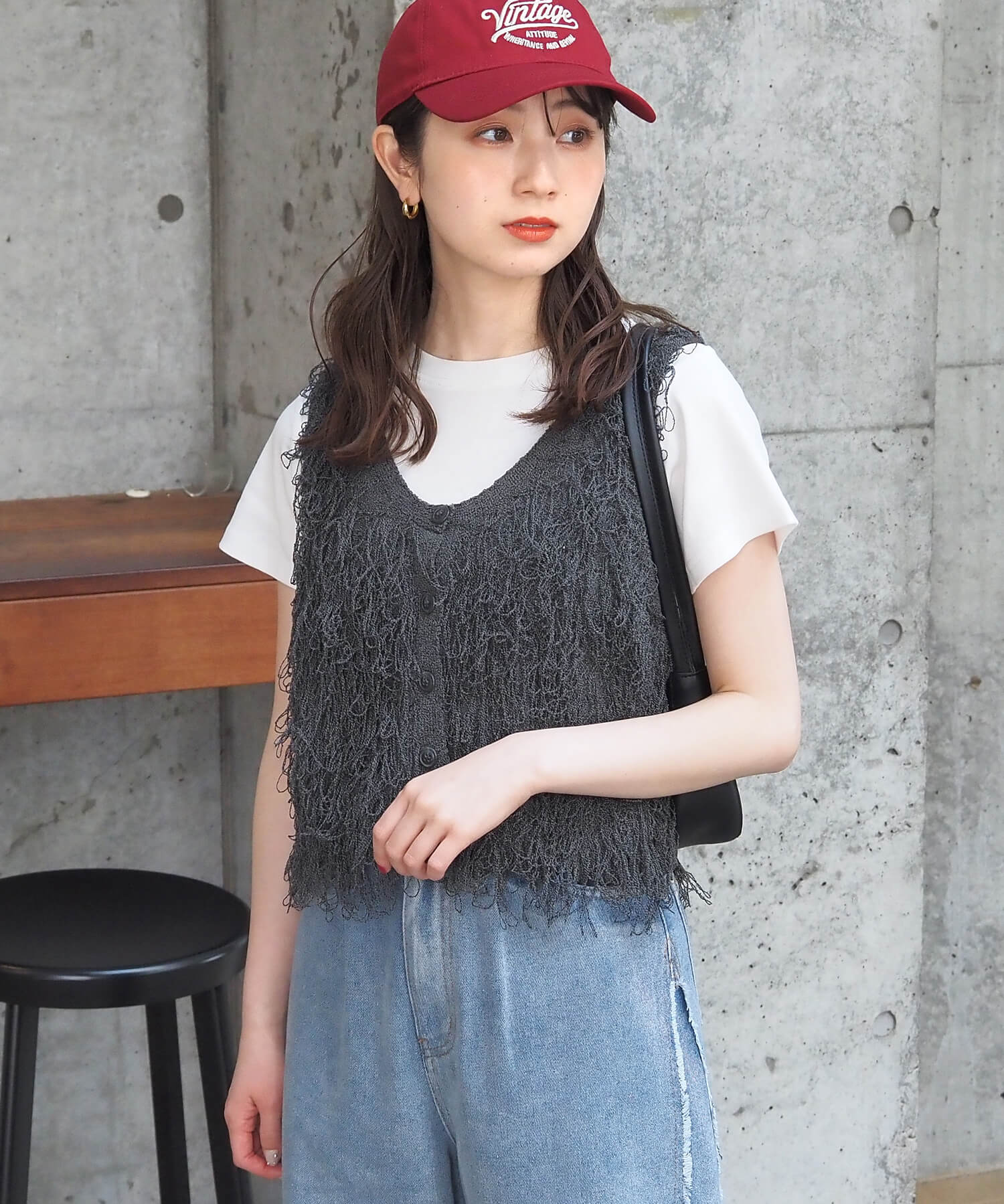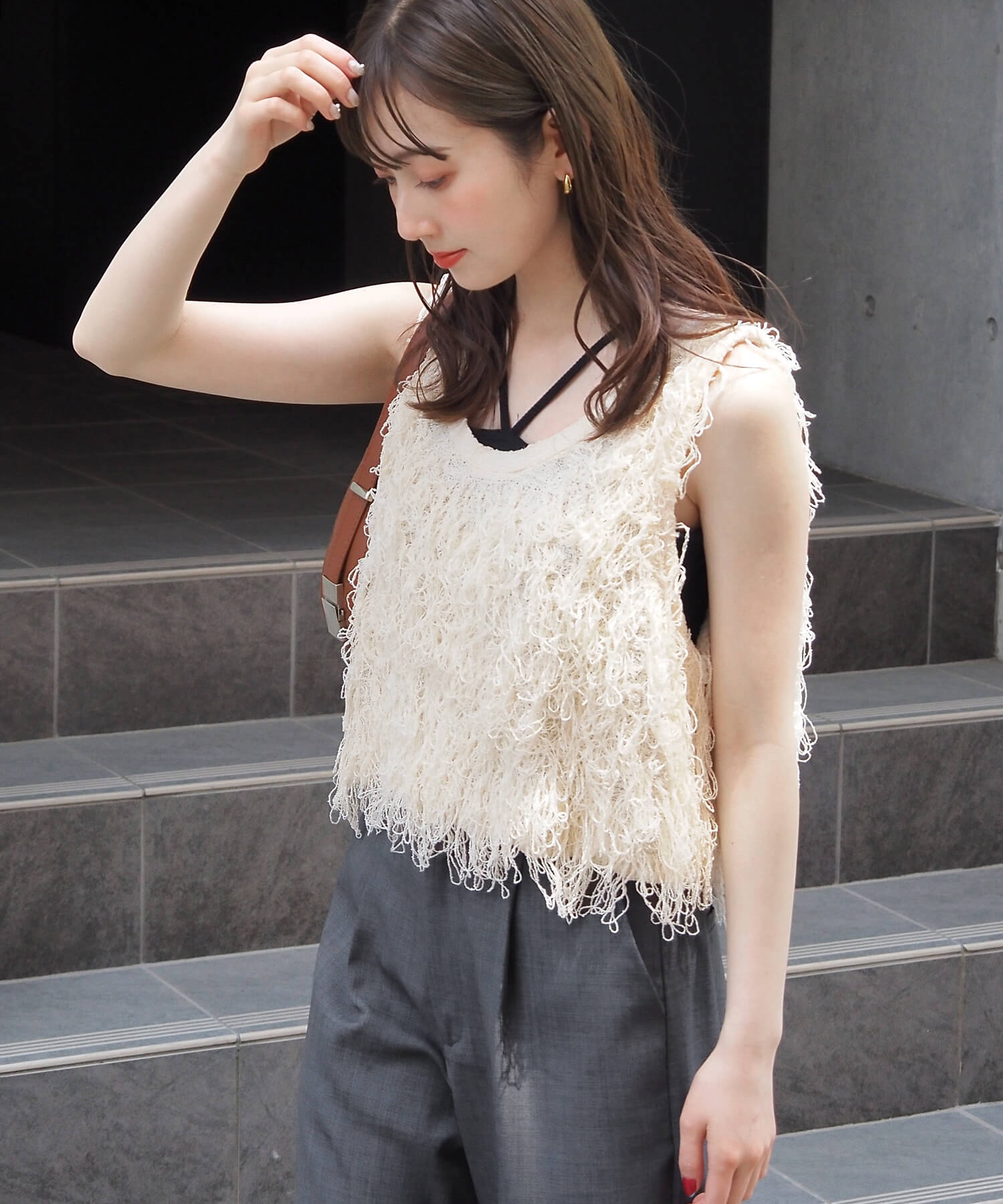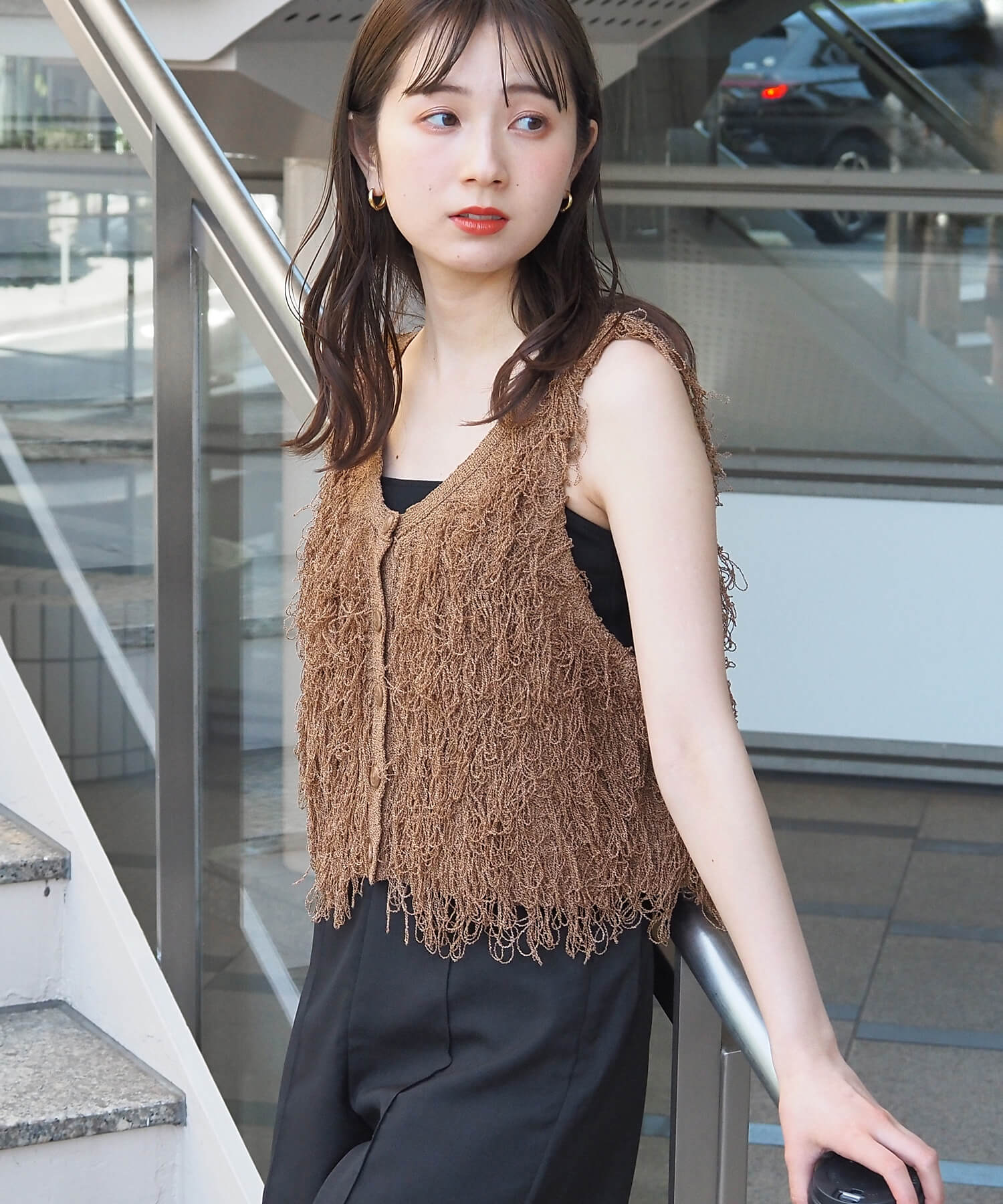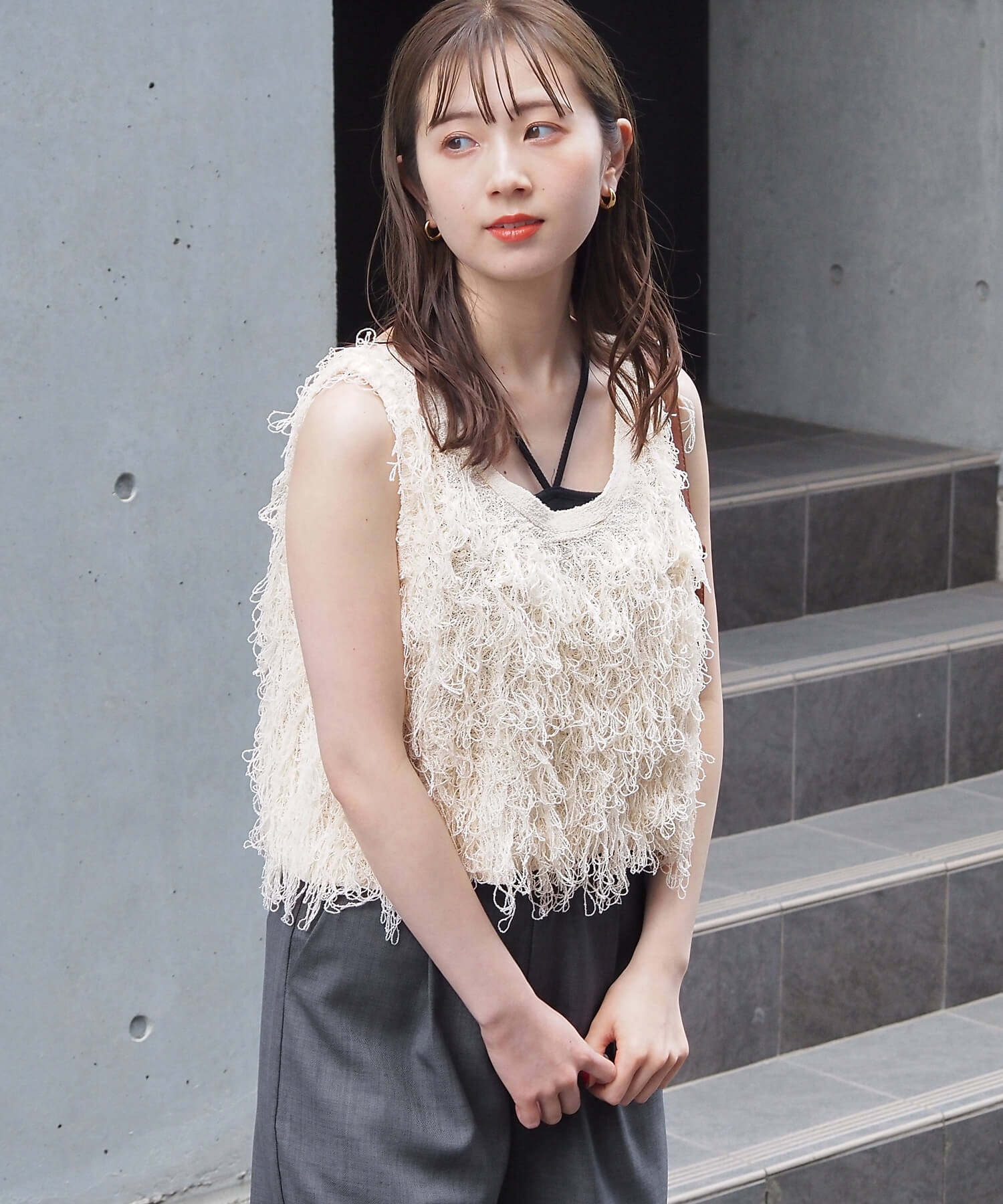 ・表情のあるフリンジ生地が魅力のショート丈ベストです。