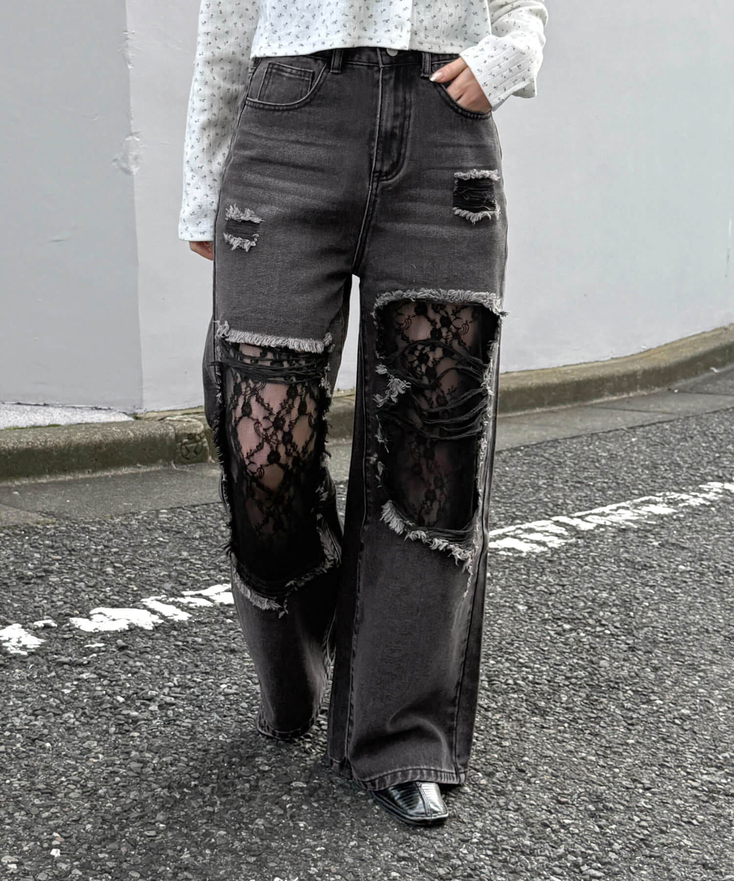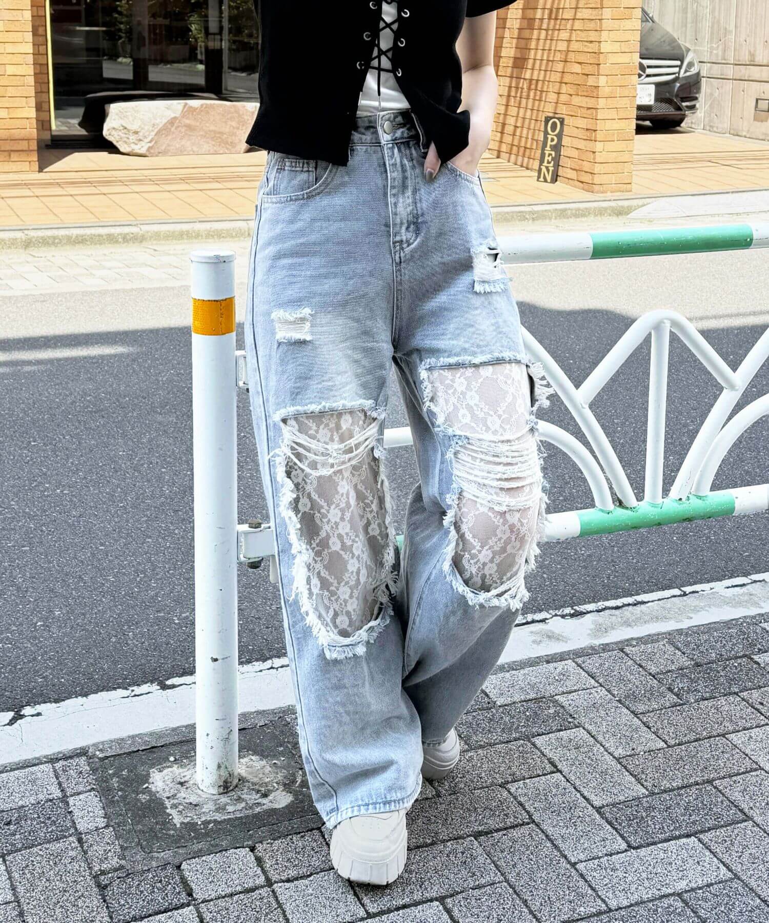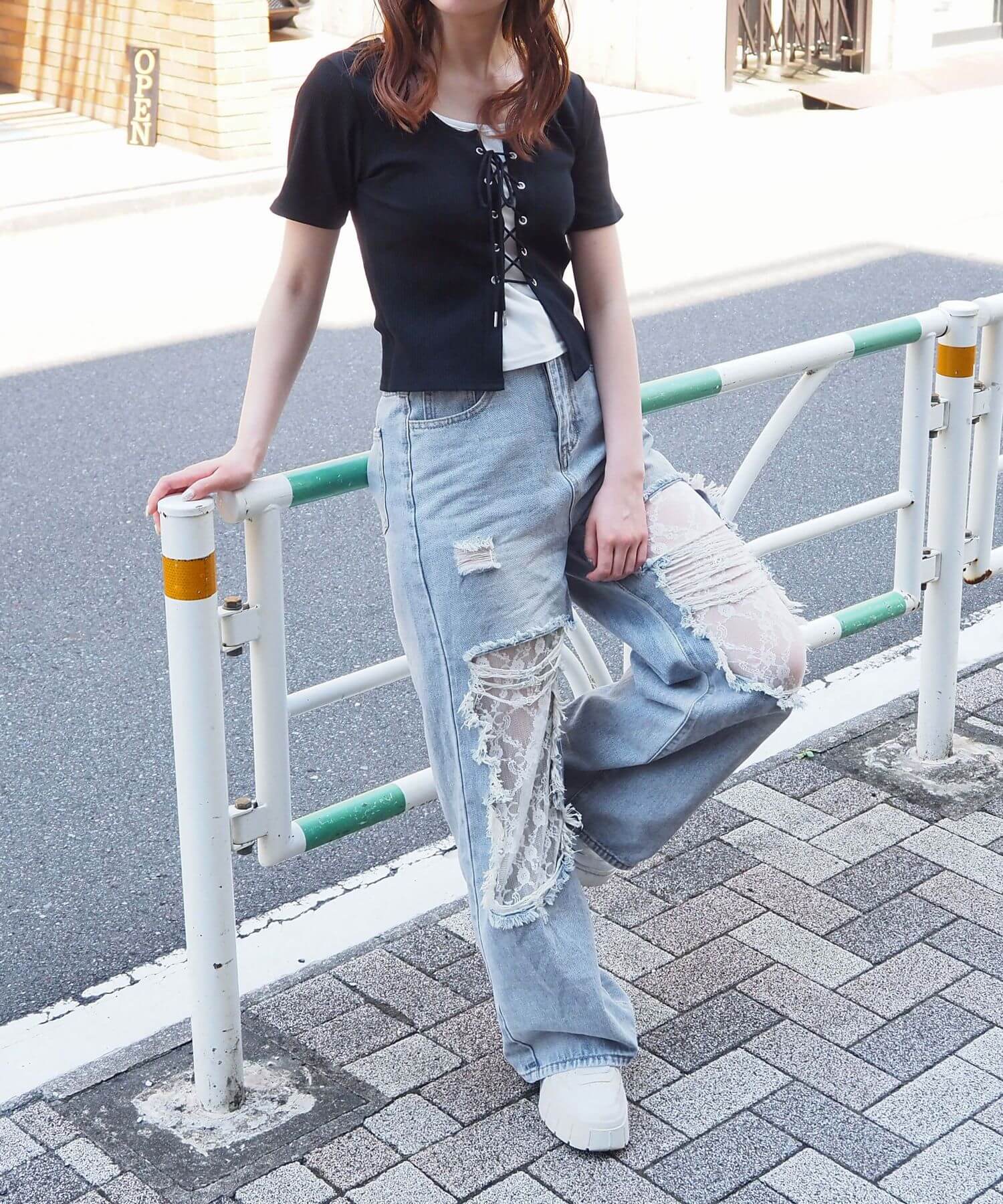 ・大胆なダメージ加工に、ガーリーなレースでハードになりすぎないのがポイント。