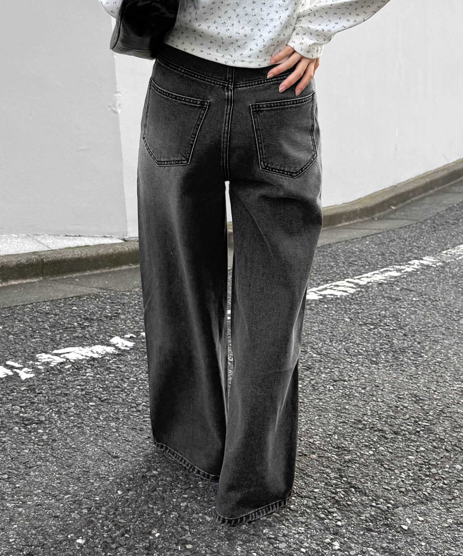 ・レース使いが目を惹くワイドシルエットのデニムパンツです。