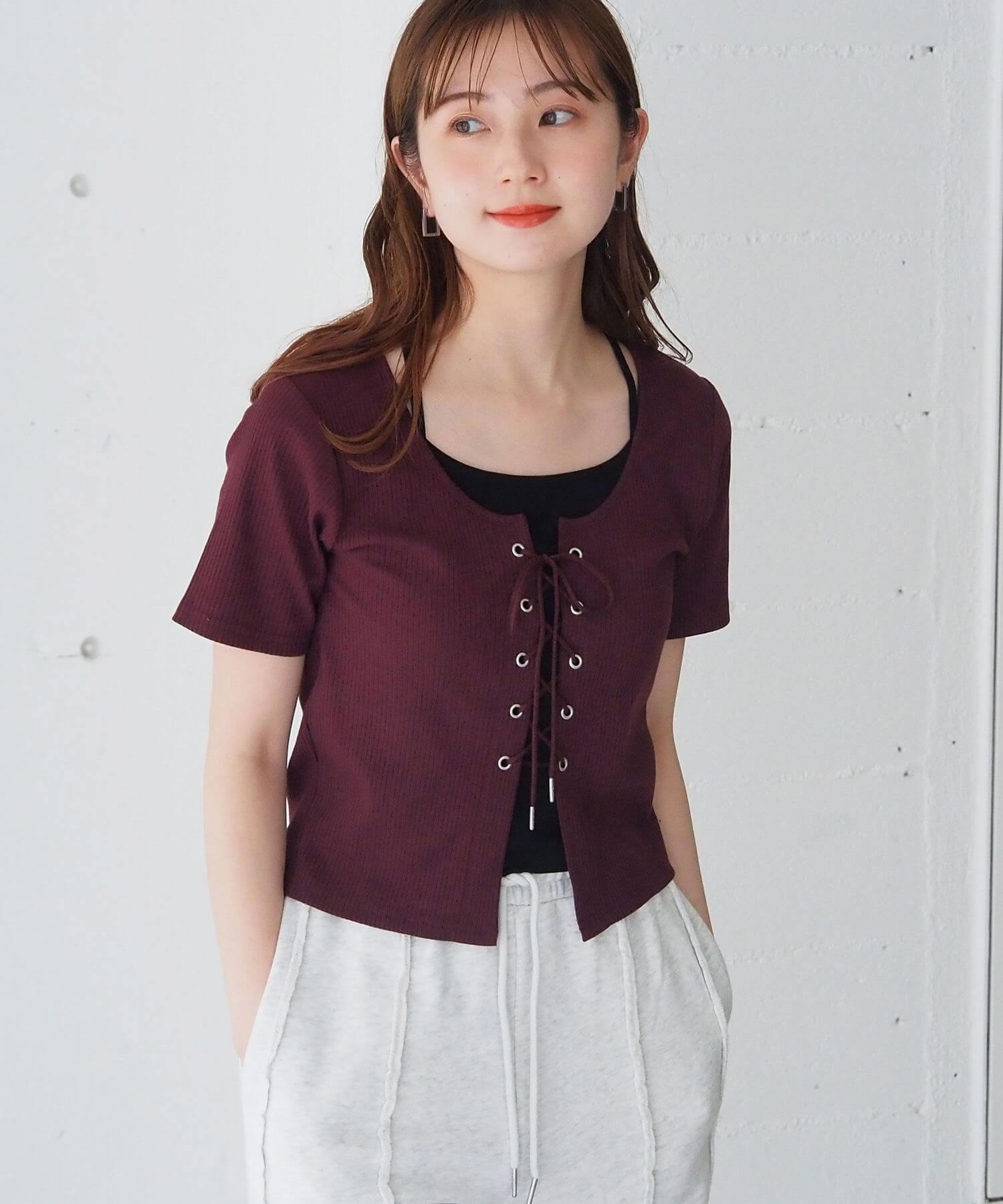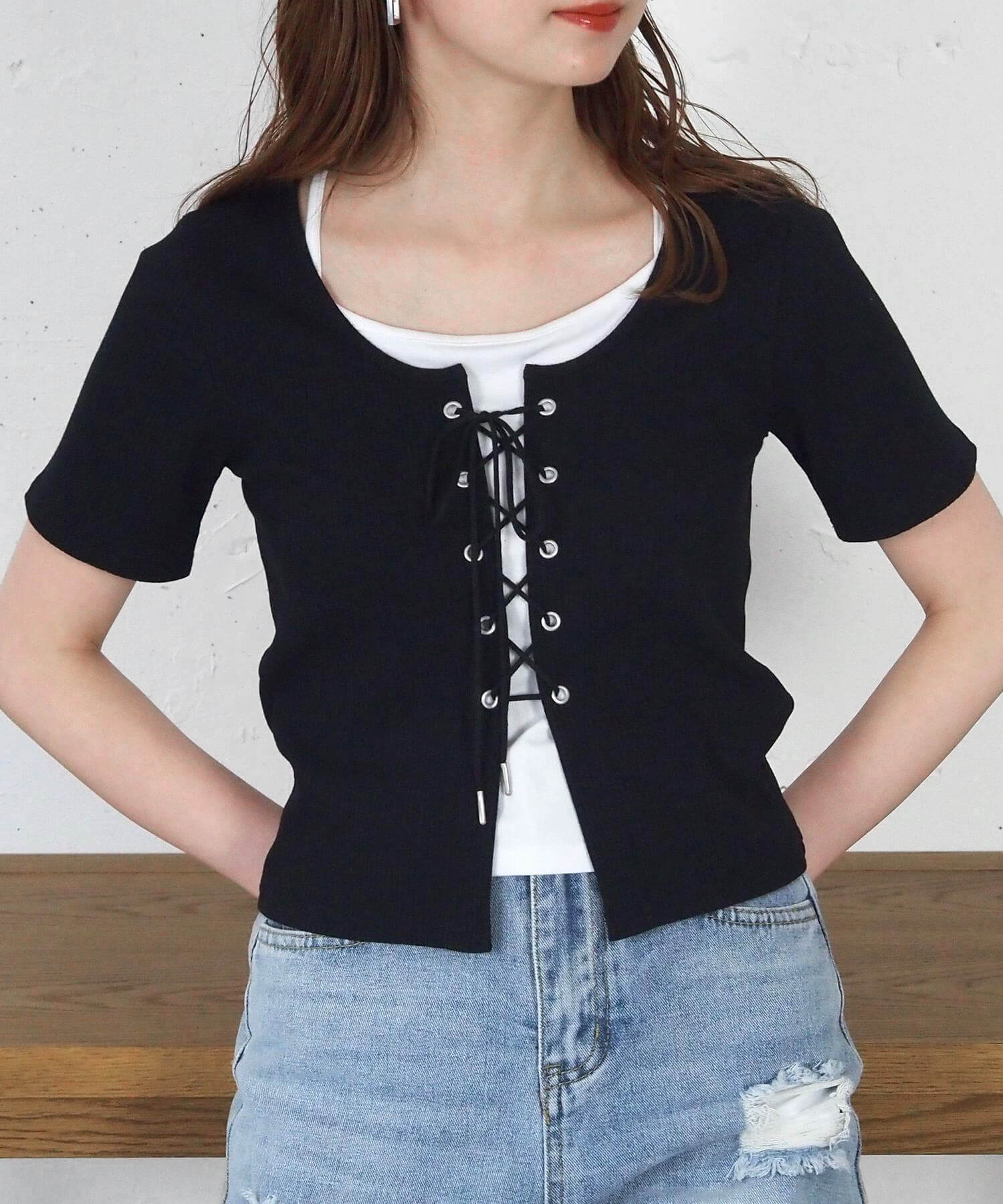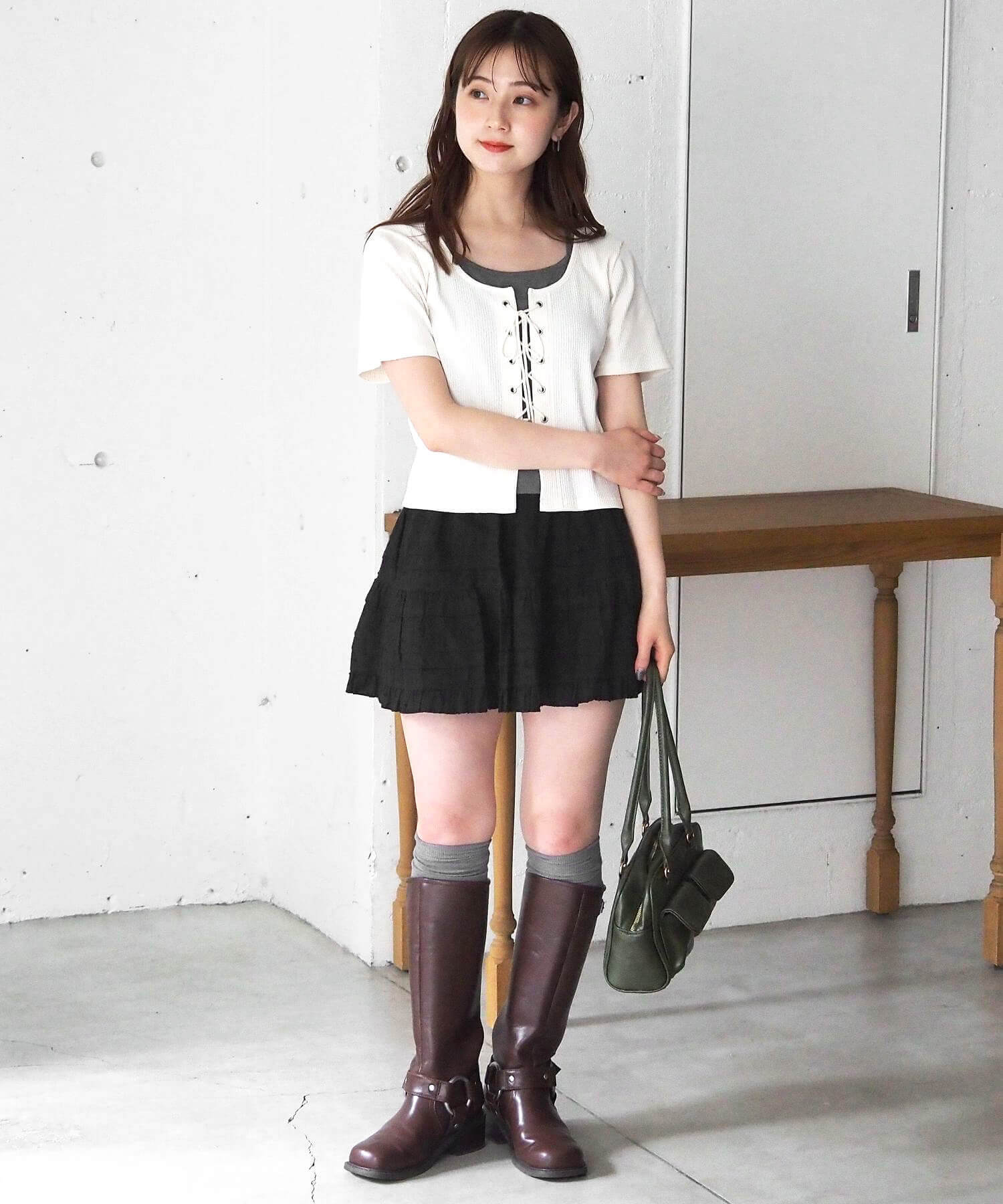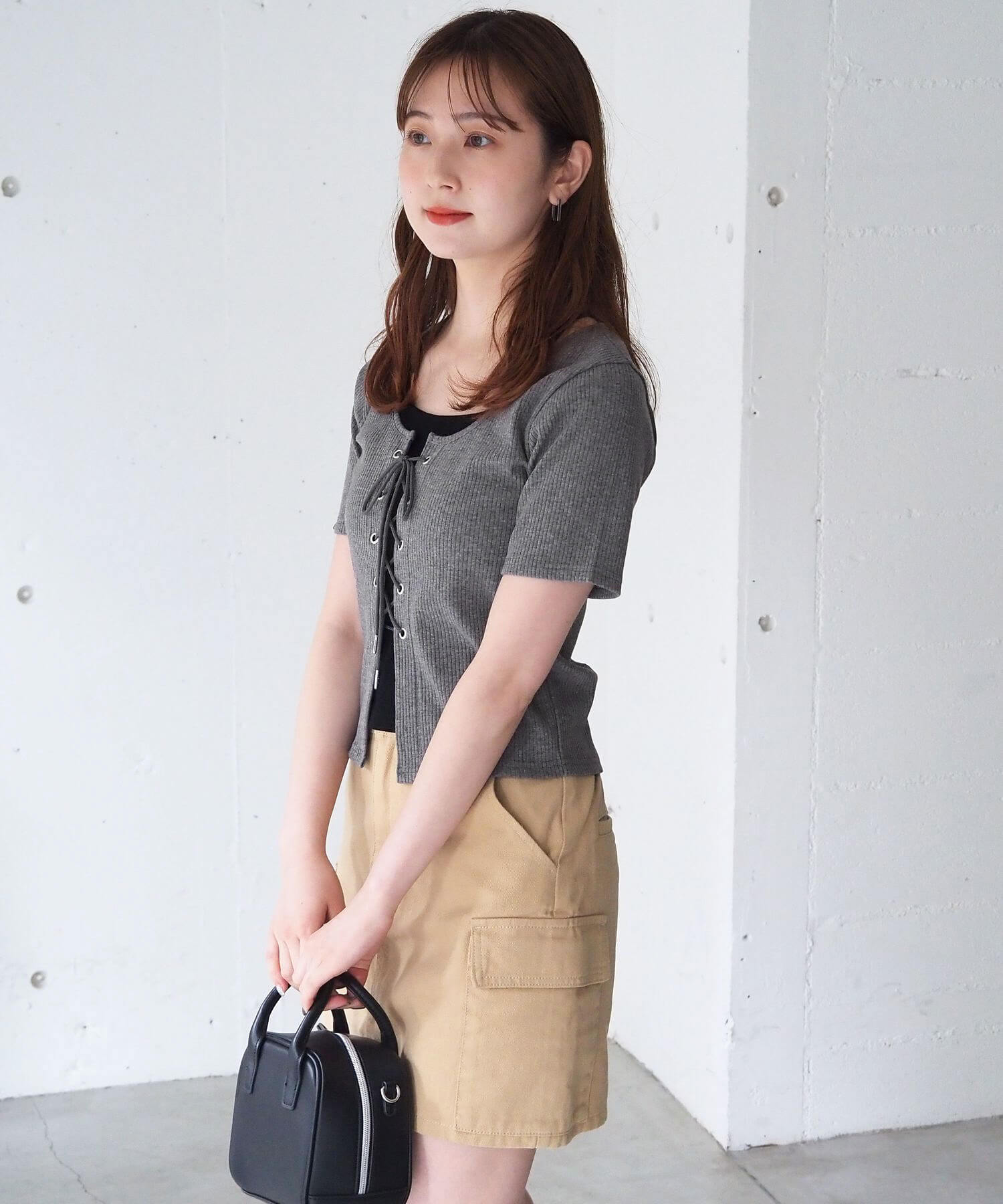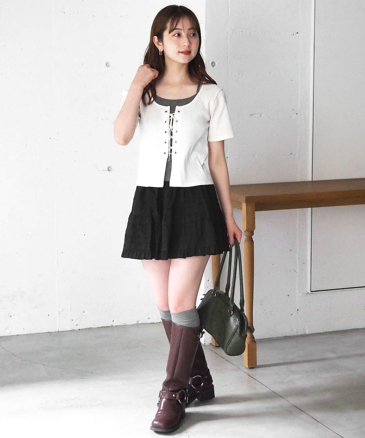 ・フロントのレースアップがコーディネートをひきしめ、1枚で着映えするのも嬉しいポイントです。