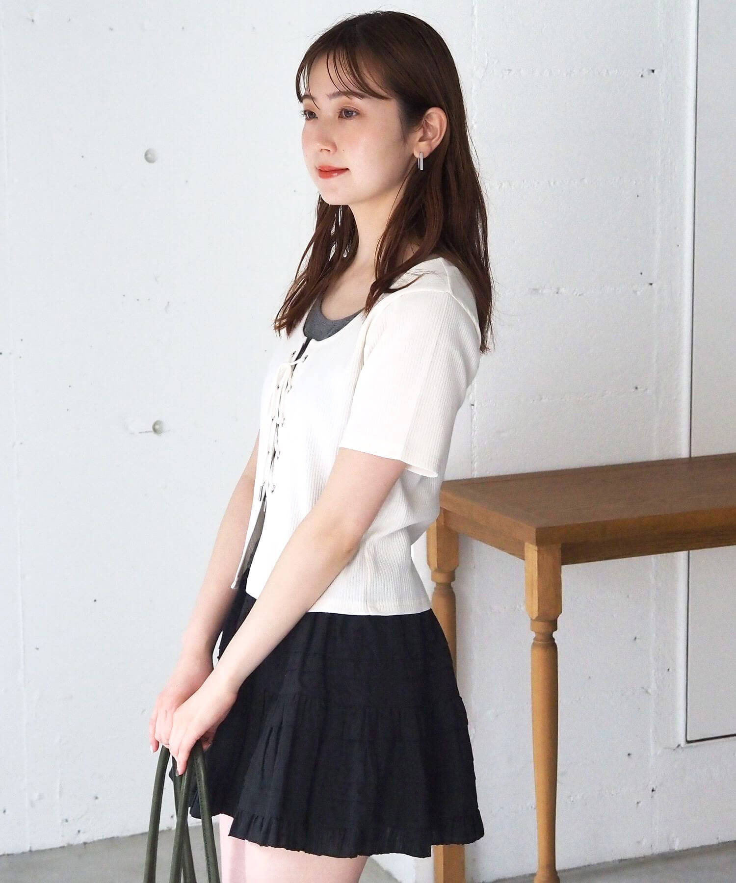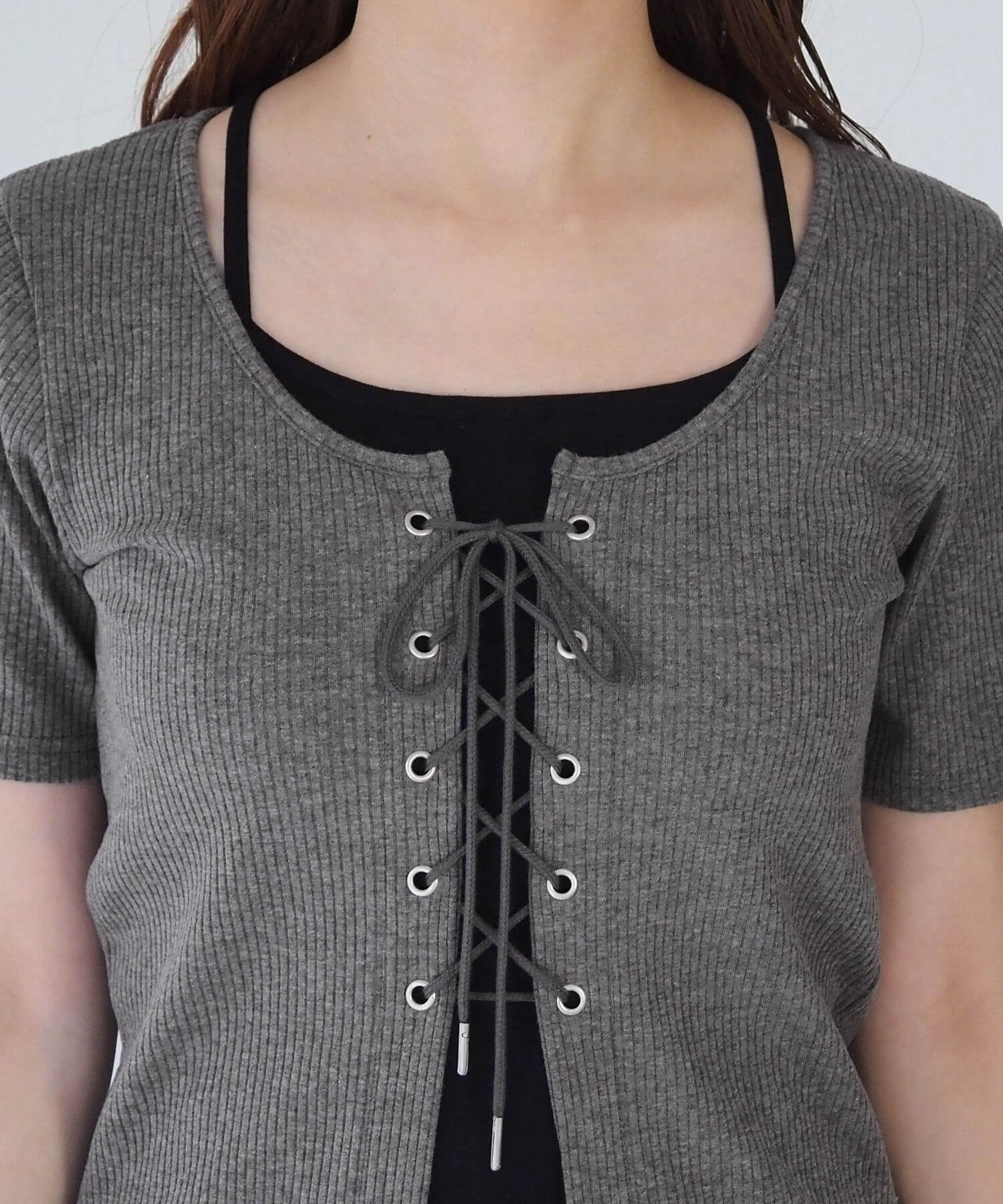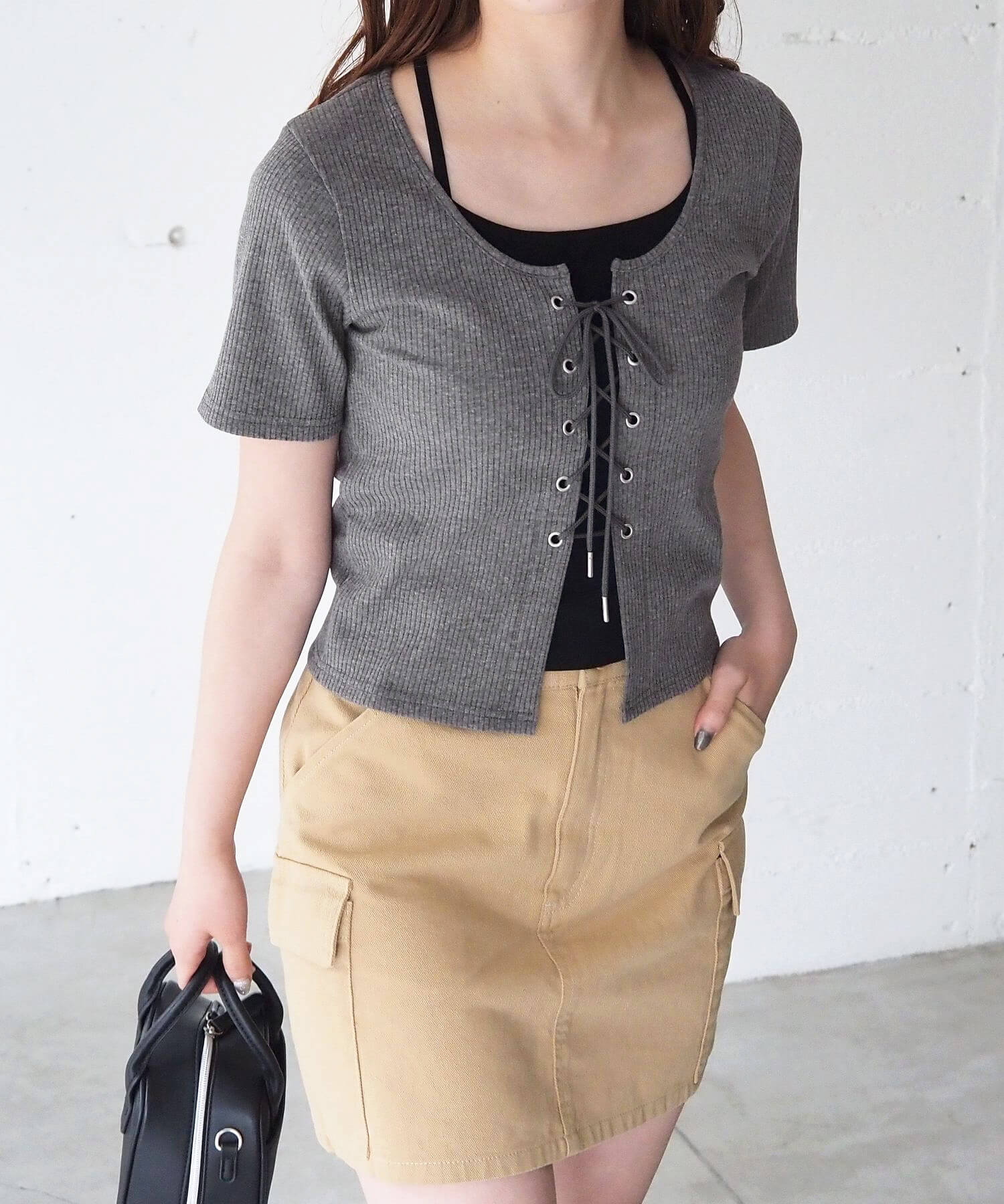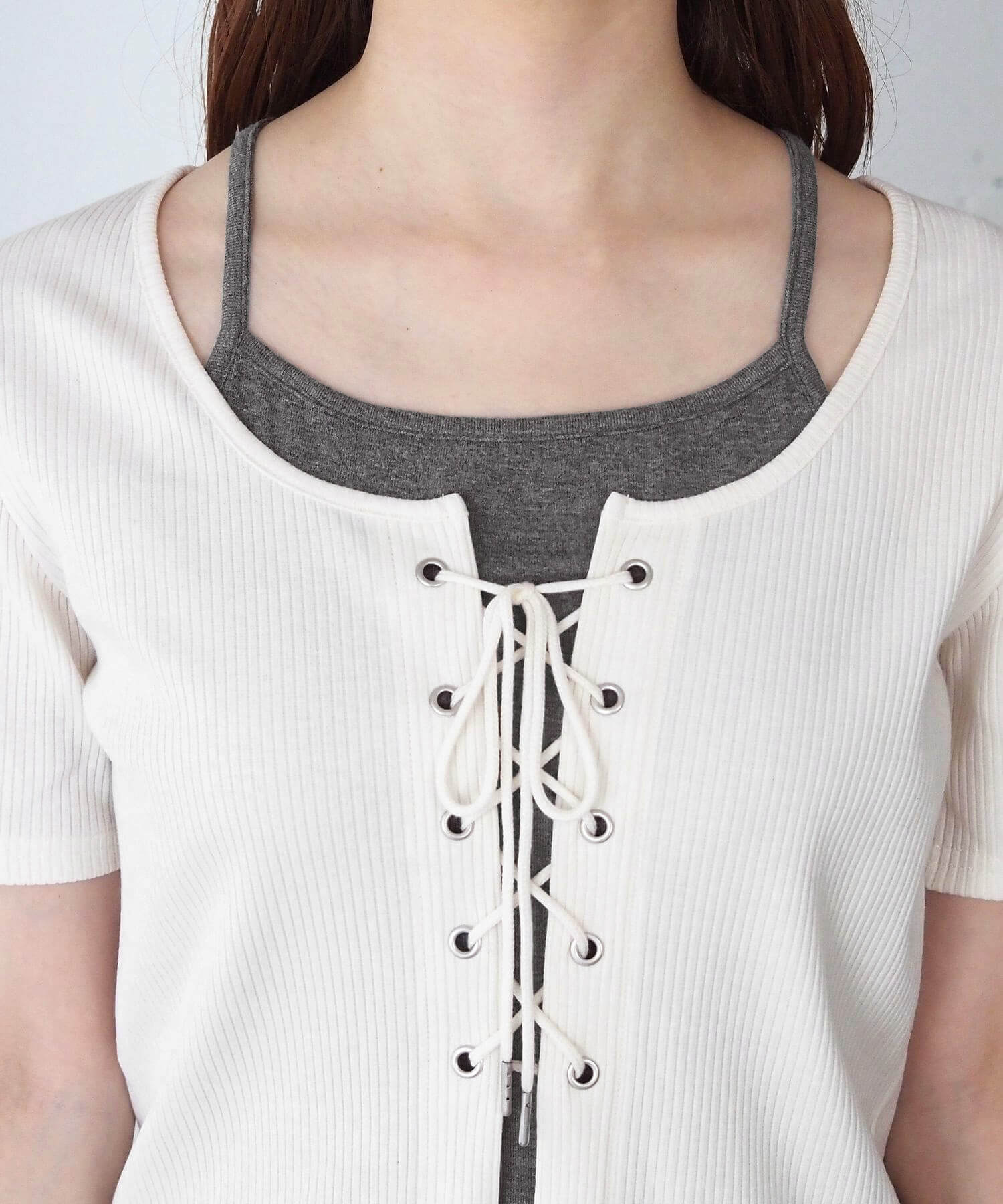 ・フロントのレースアップがコーディネートをひきしめ、1枚で着映えするのも嬉しいポイントです。
