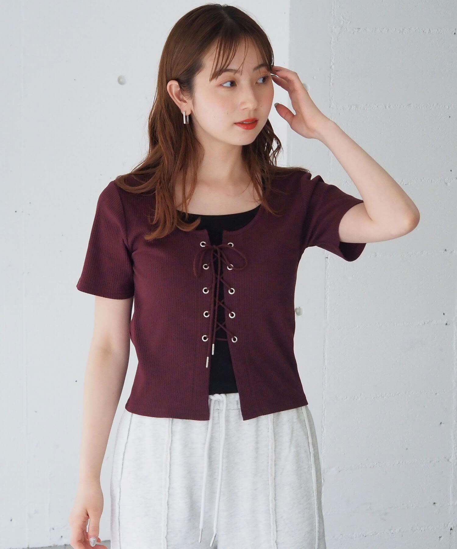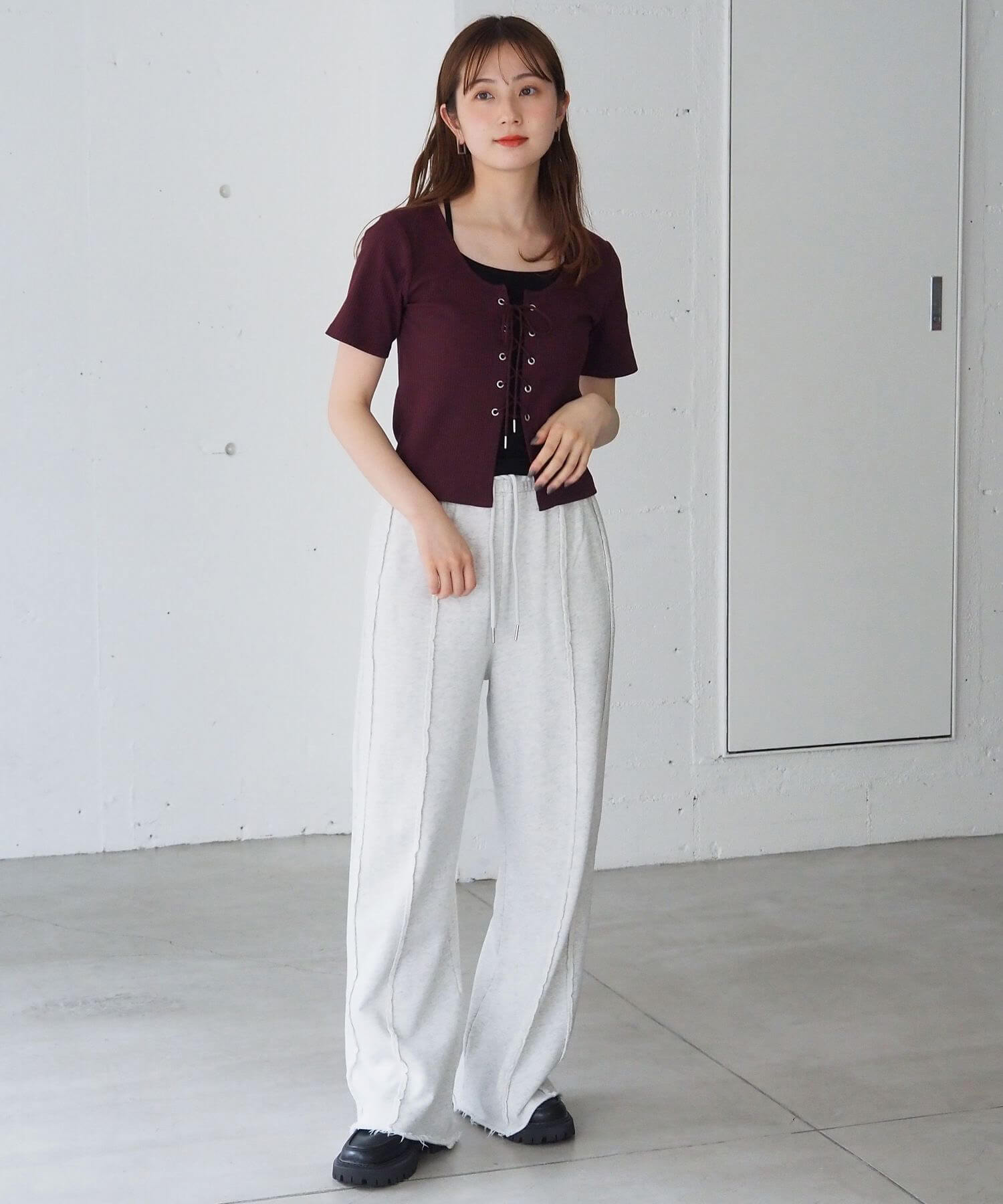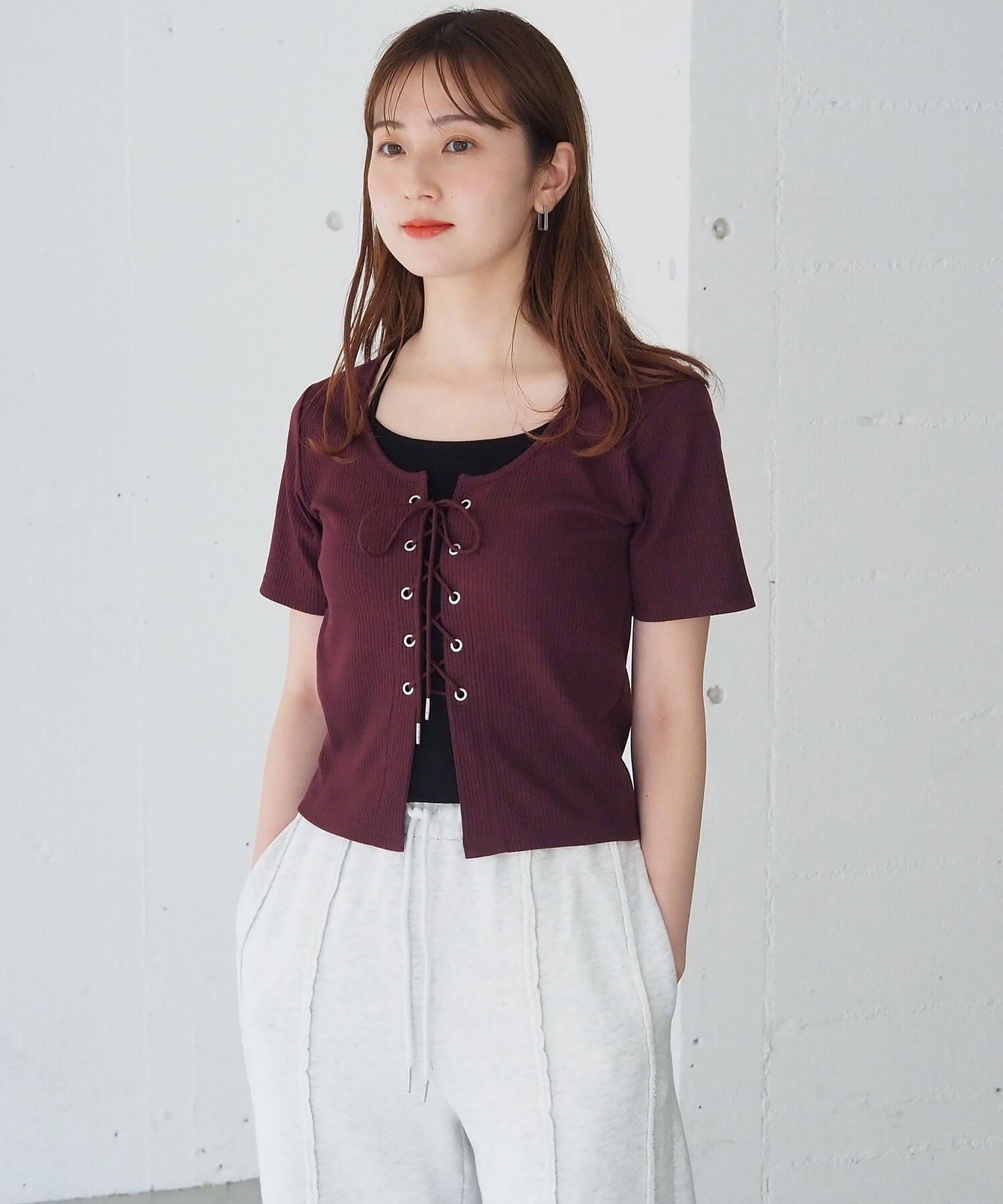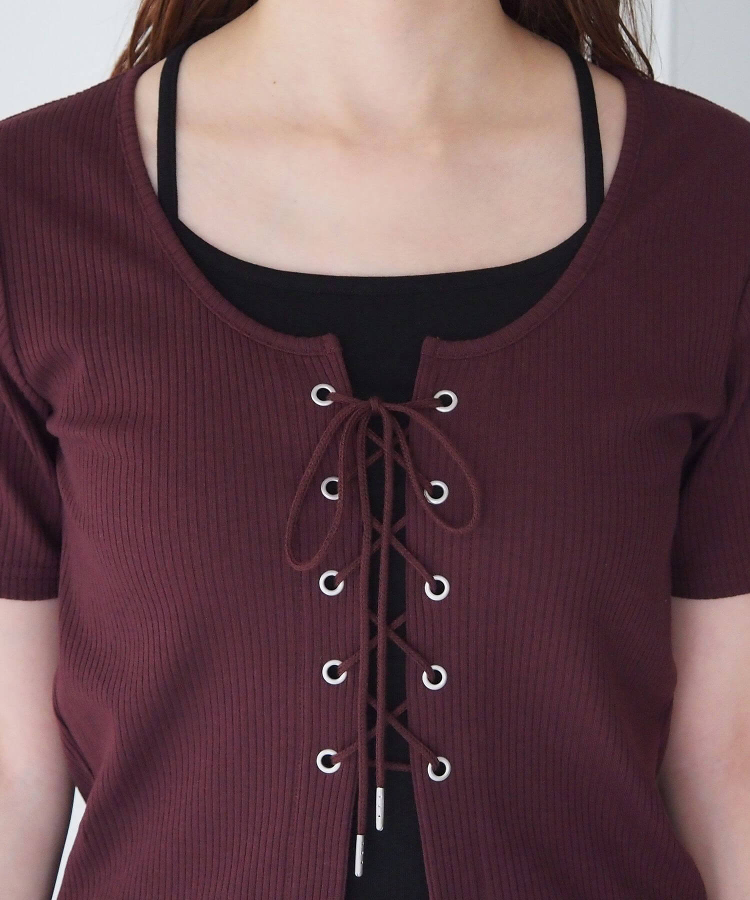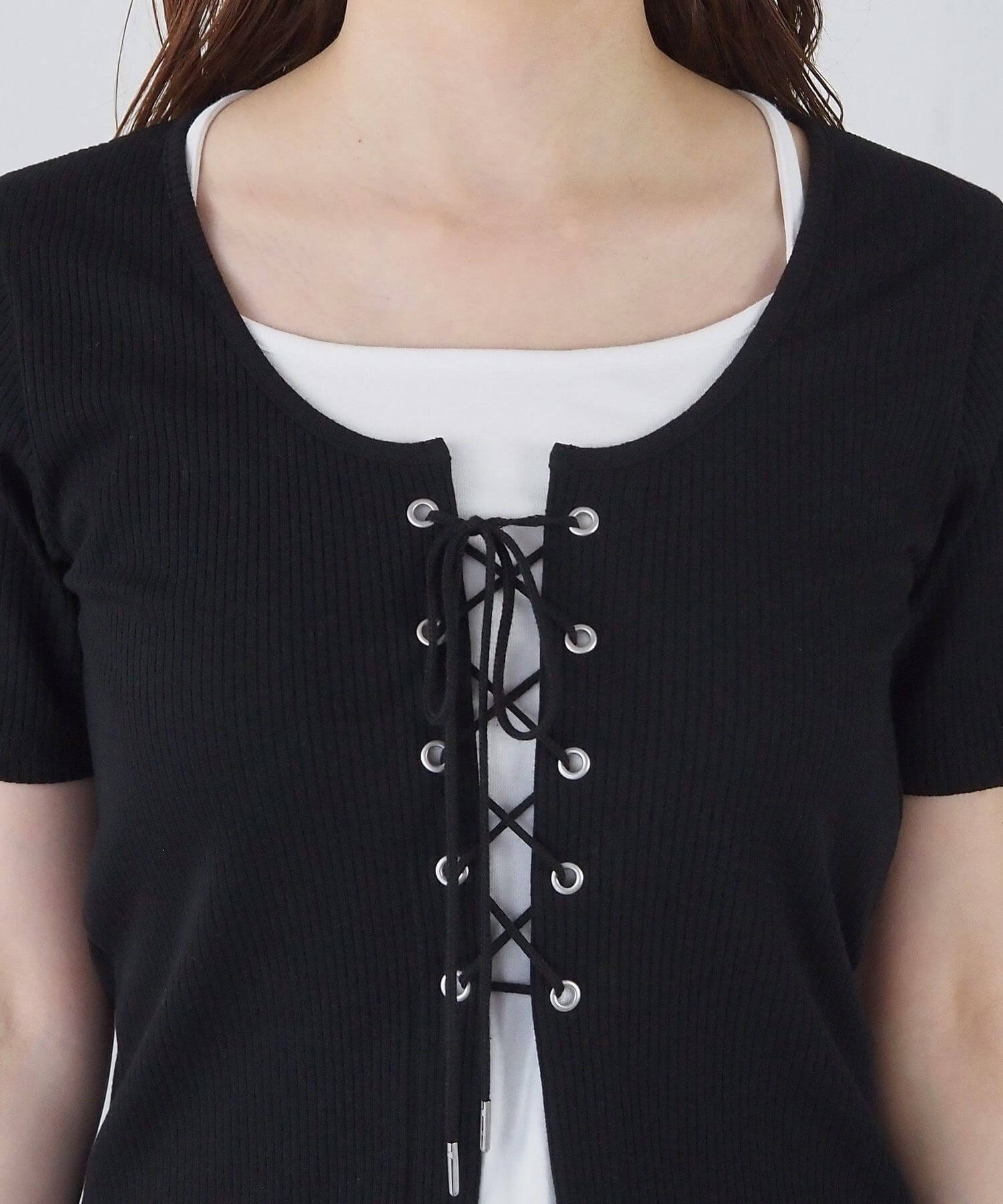 ・フロントのレースアップがコーディネートをひきしめ、1枚で着映えするのも嬉しいポイントです。