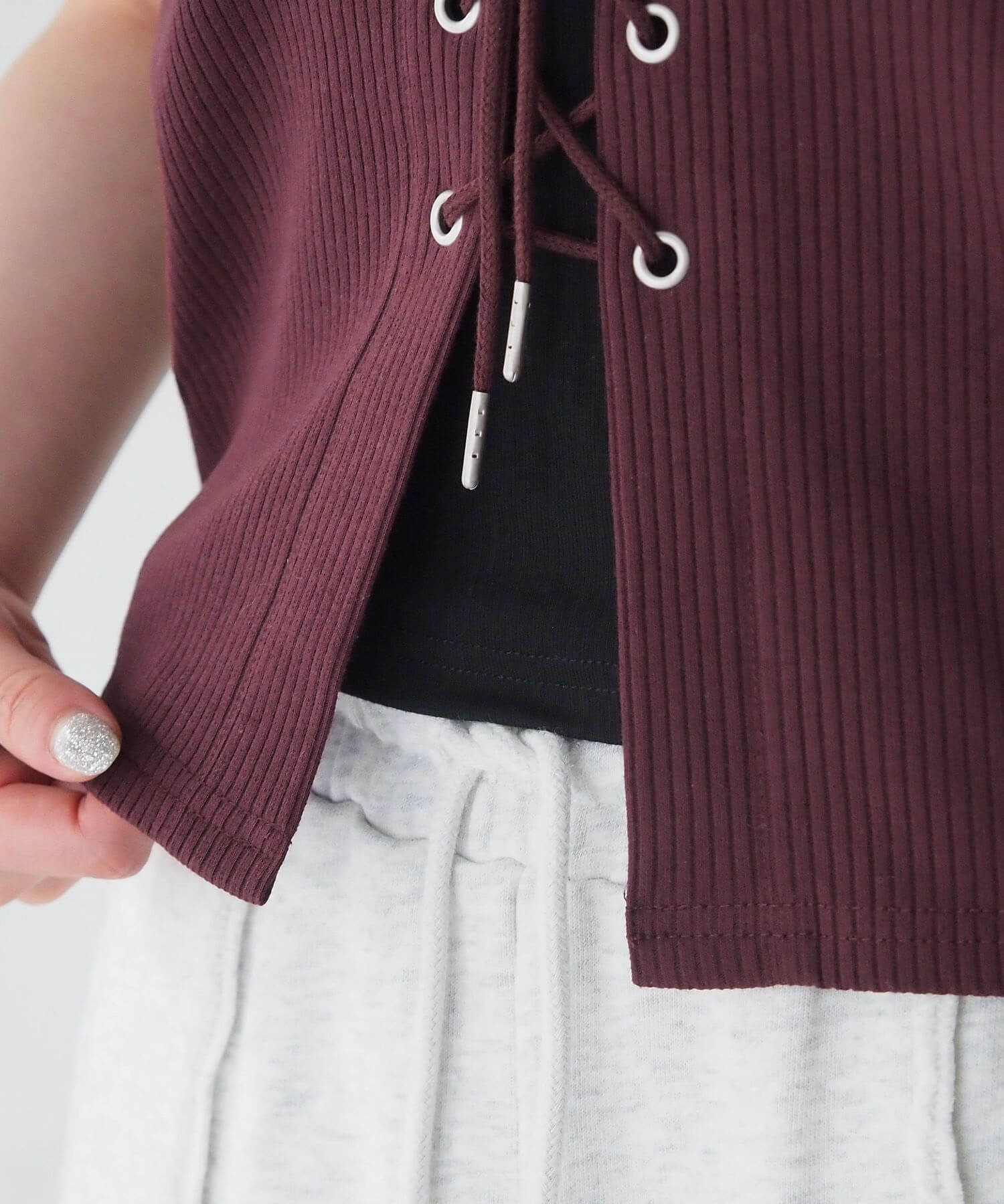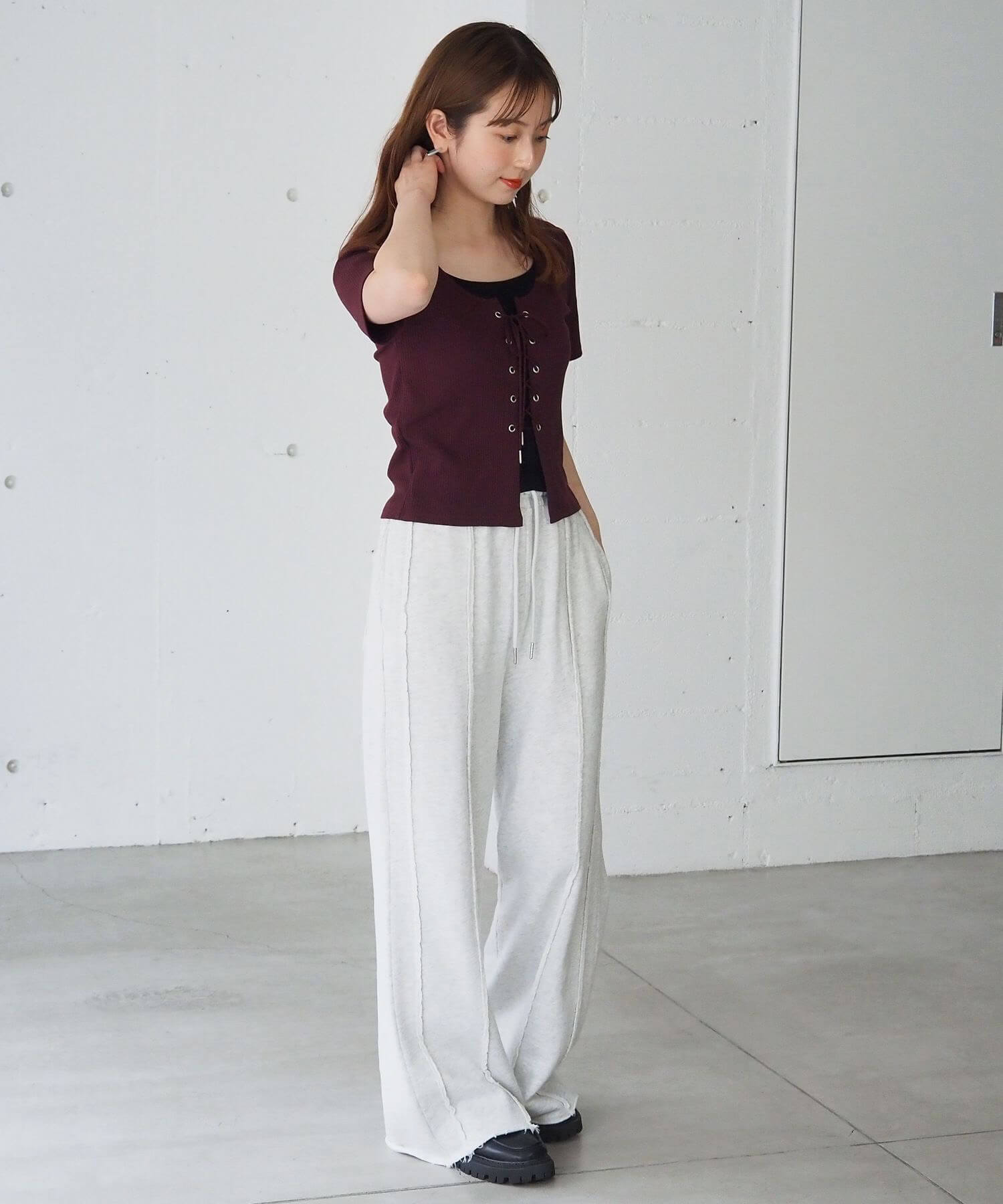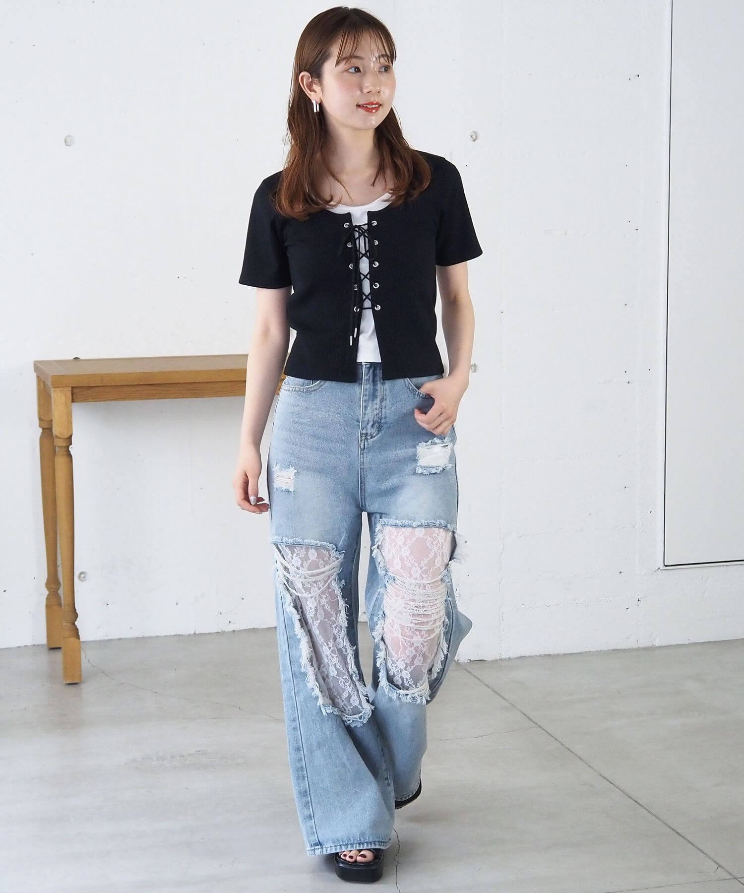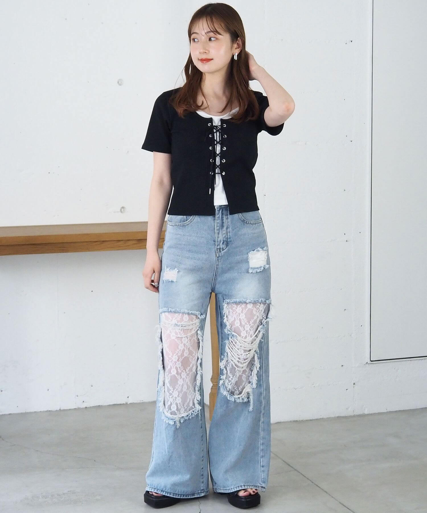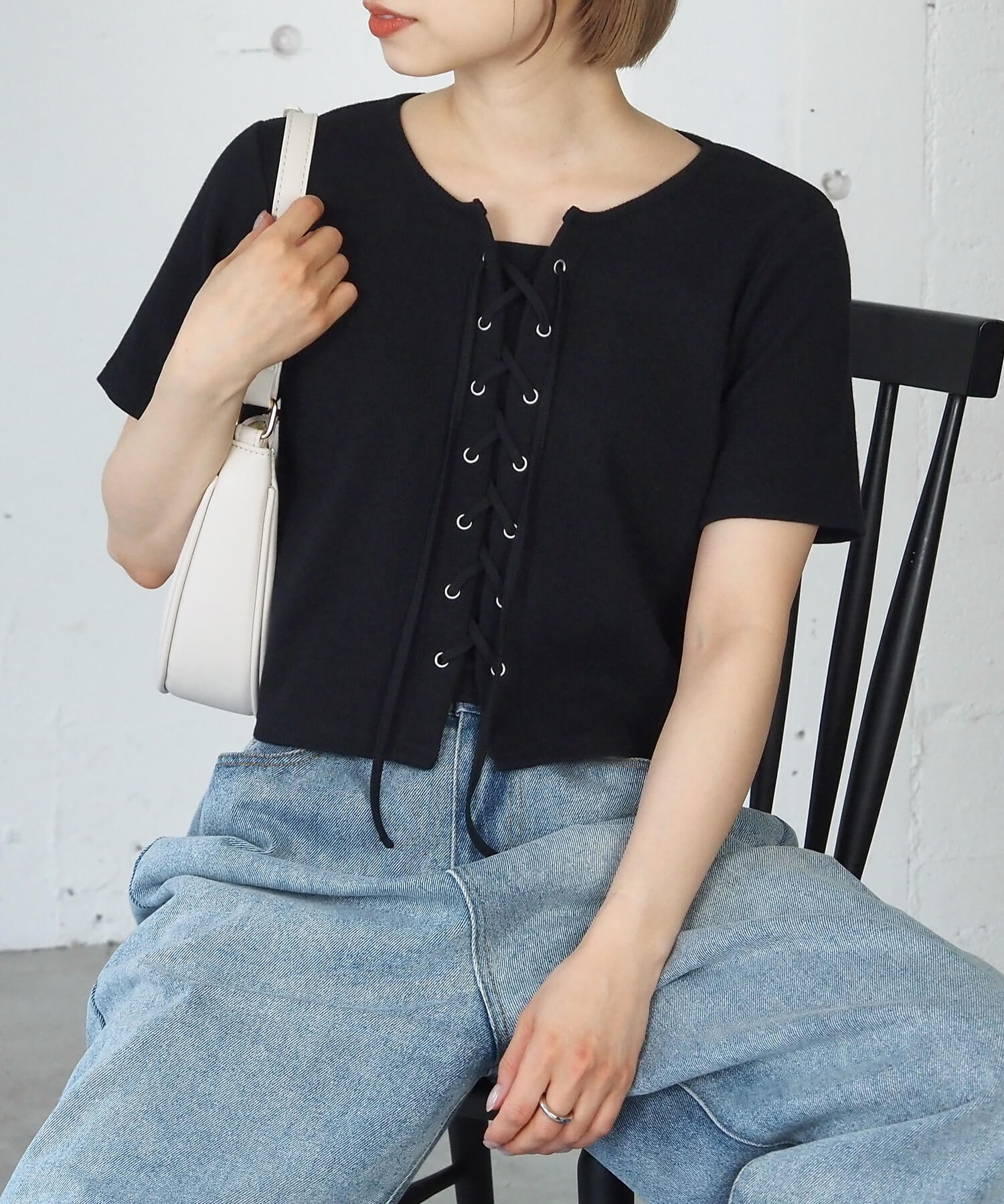 ・フロントのレースアップがコーディネートをひきしめ、1枚で着映えするのも嬉しいポイントです。