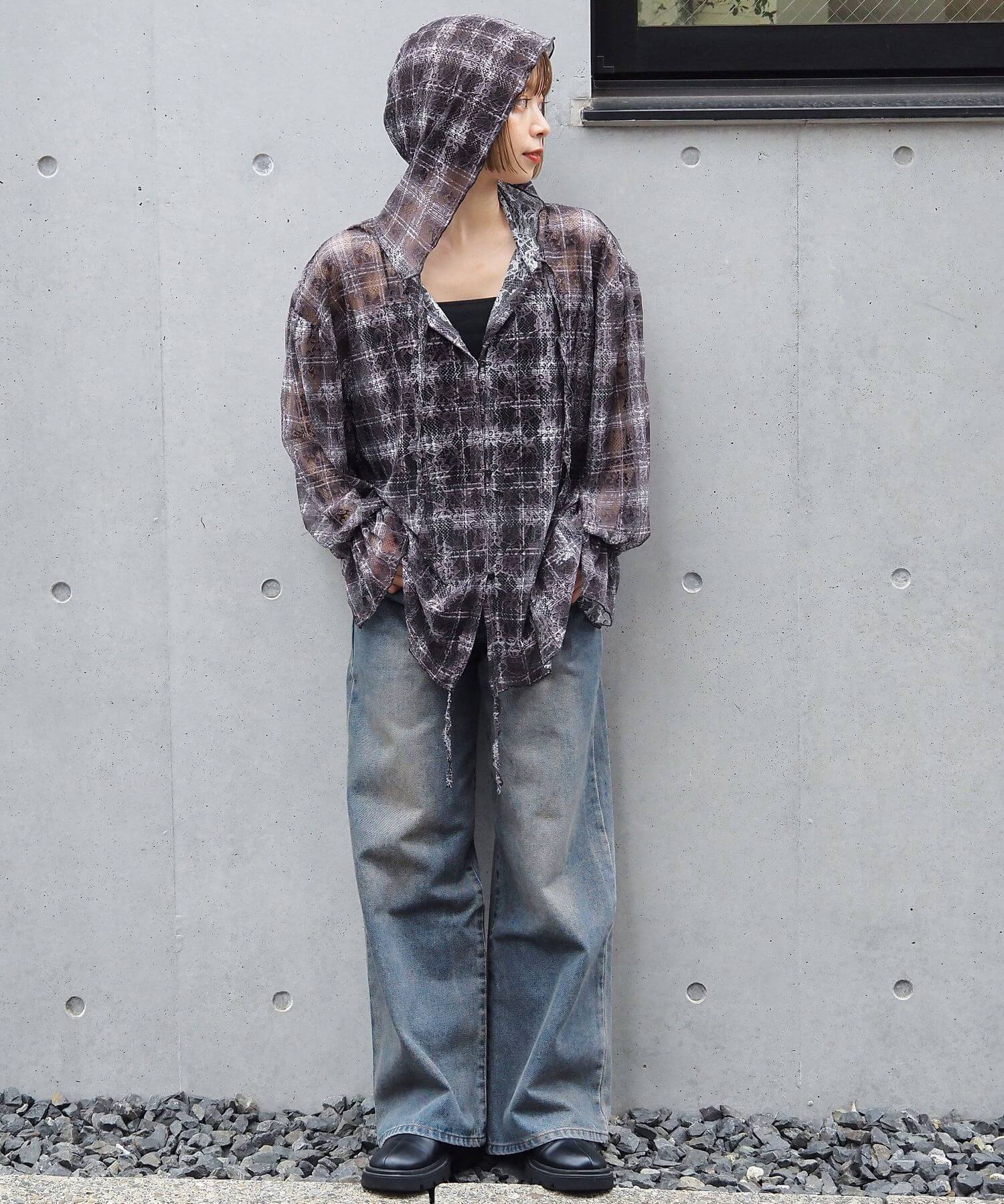 ・裾の紐を絞ってドロストトップスとして。コーディネートの重心を上げたい時にもおすすめの着こなしです。