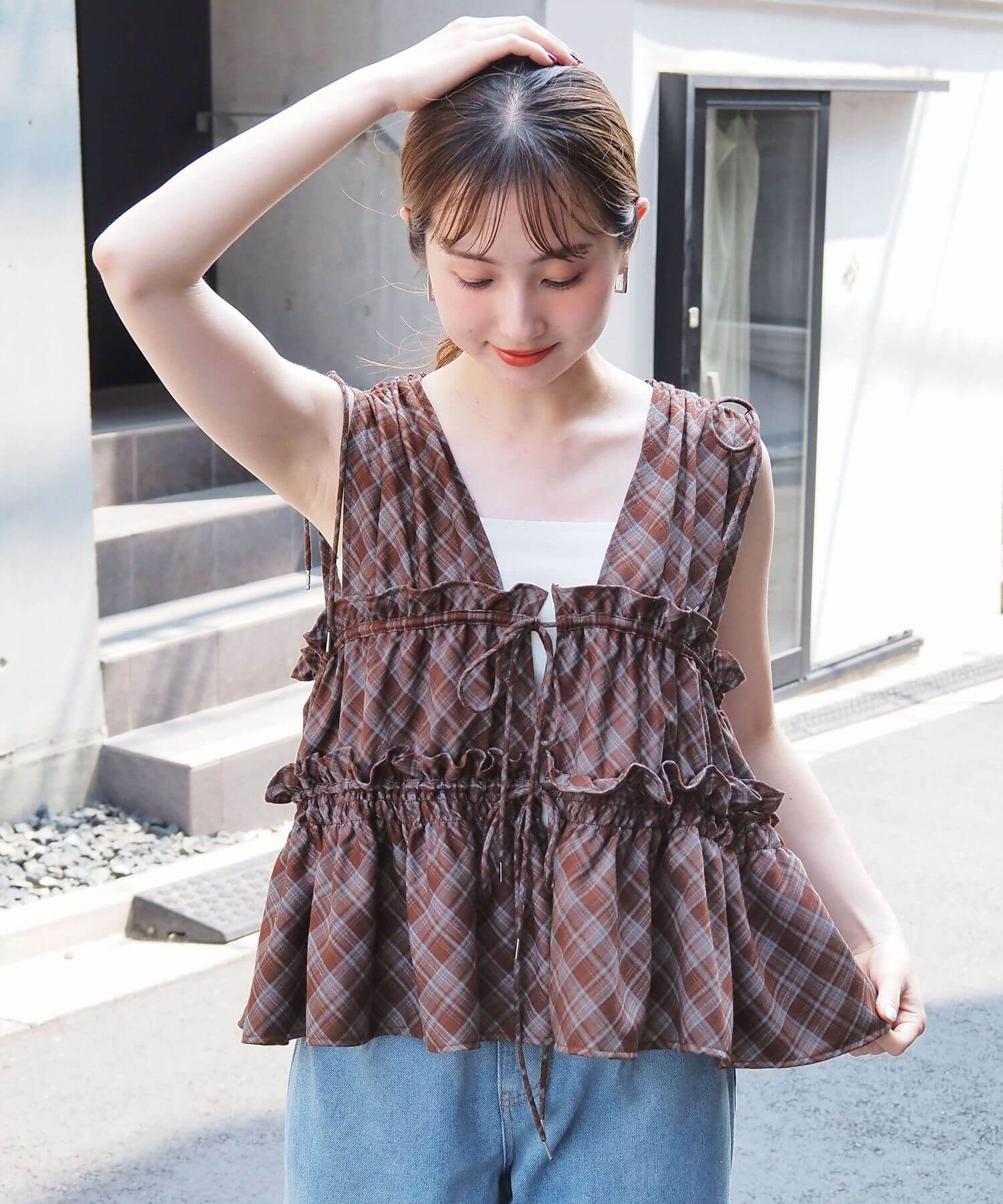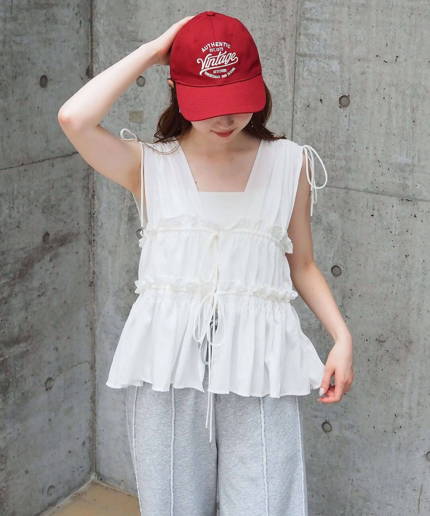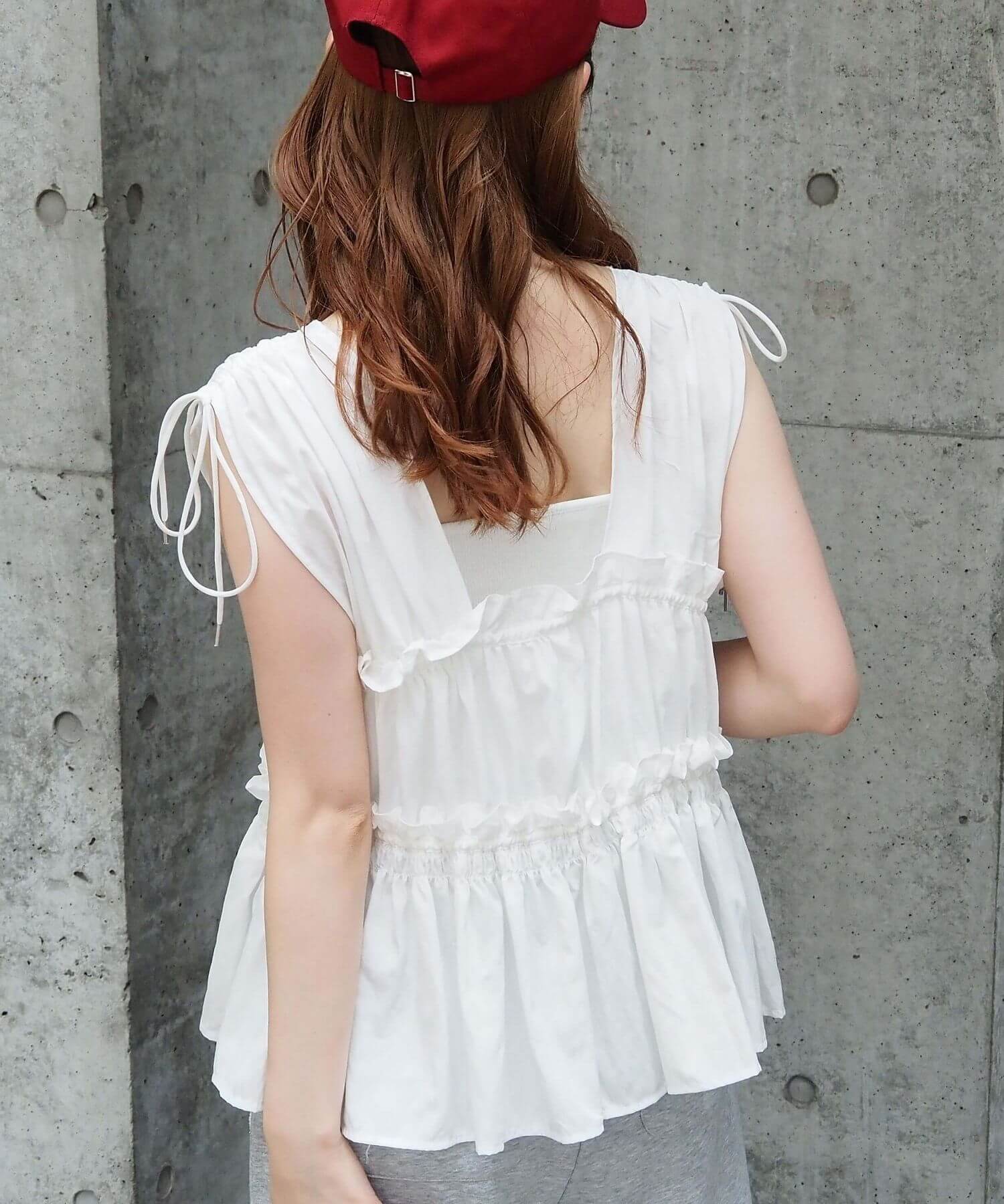 ・ノースリーブインナーで涼しくコーディネート。気になる肩回りをカバーする袖口なので、華奢なノースリーブが苦手な方にもおすすめです。