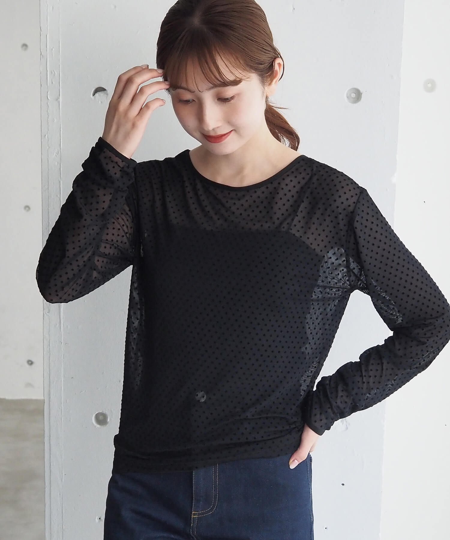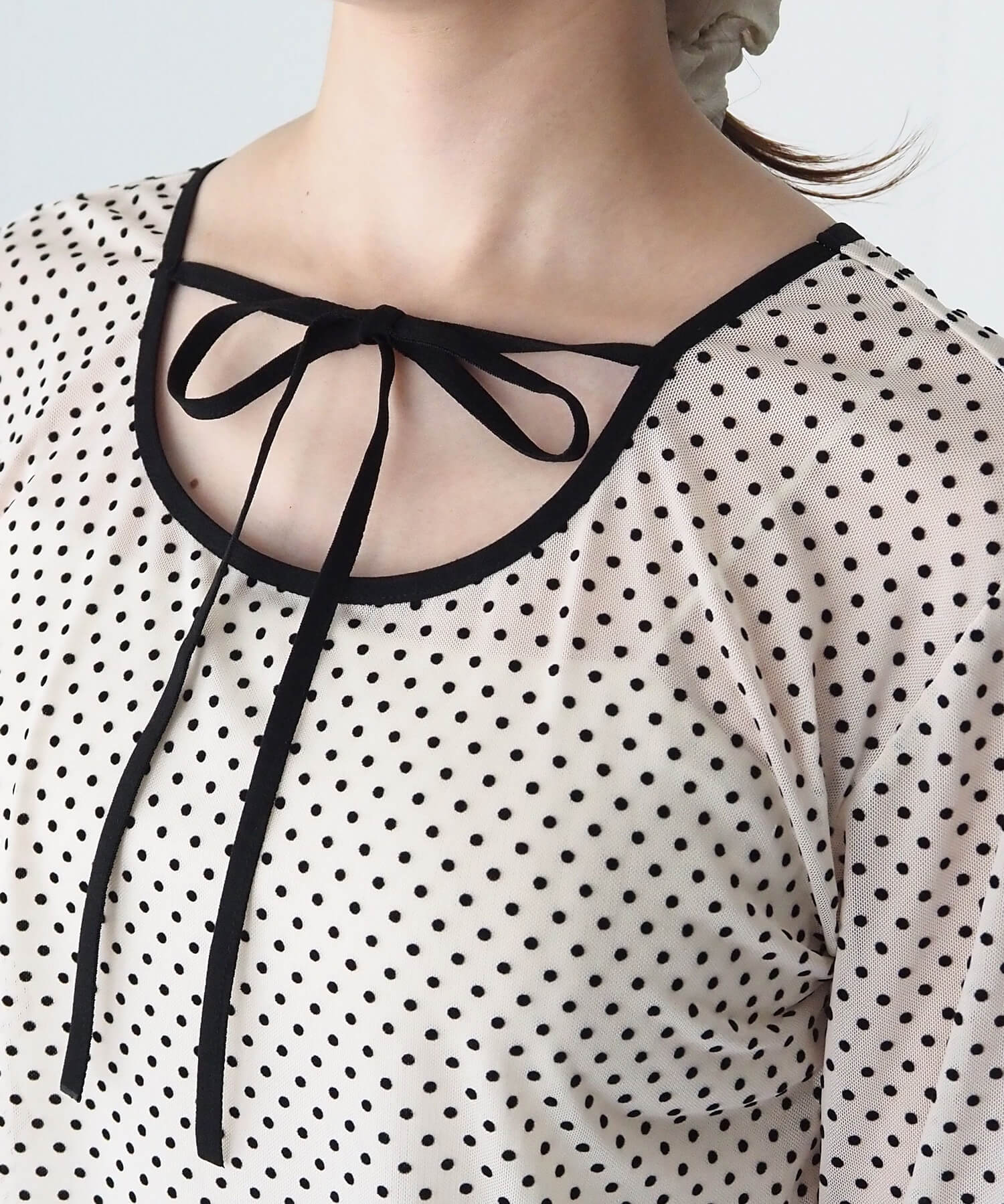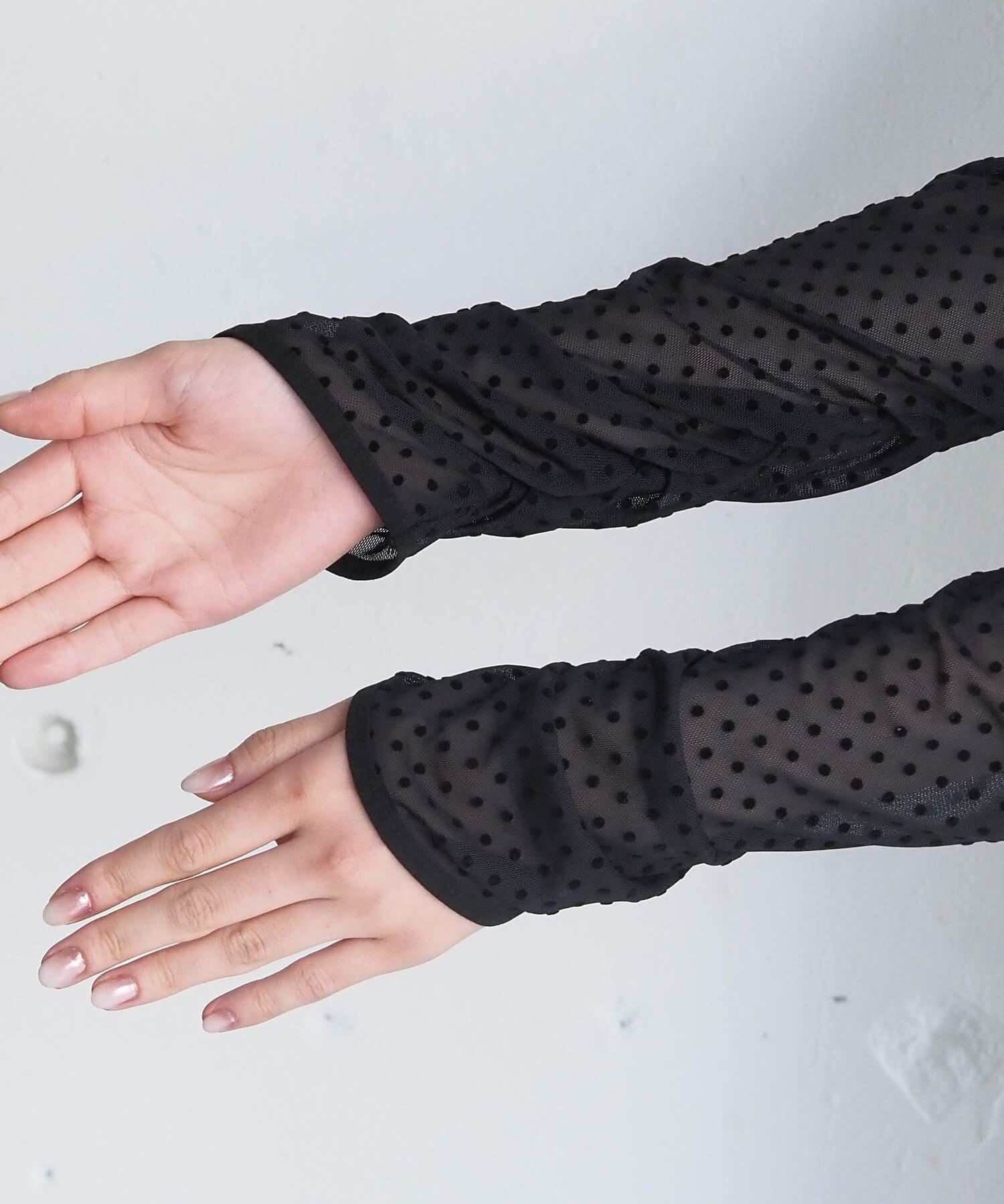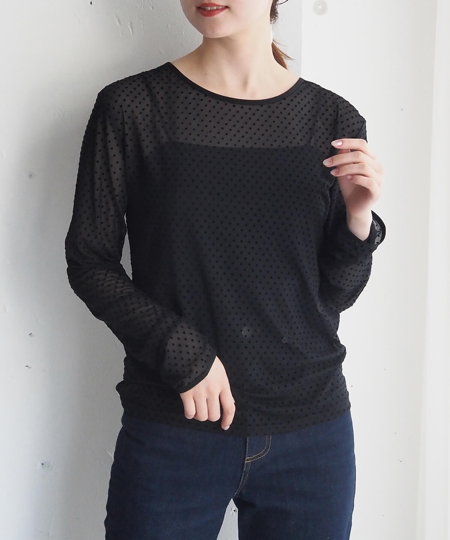 ・大人可愛いドット柄チュール生地と、上品なベロア調無地の2タイプ。どちらも程よいシアー感で軽さのあるアイテムです。