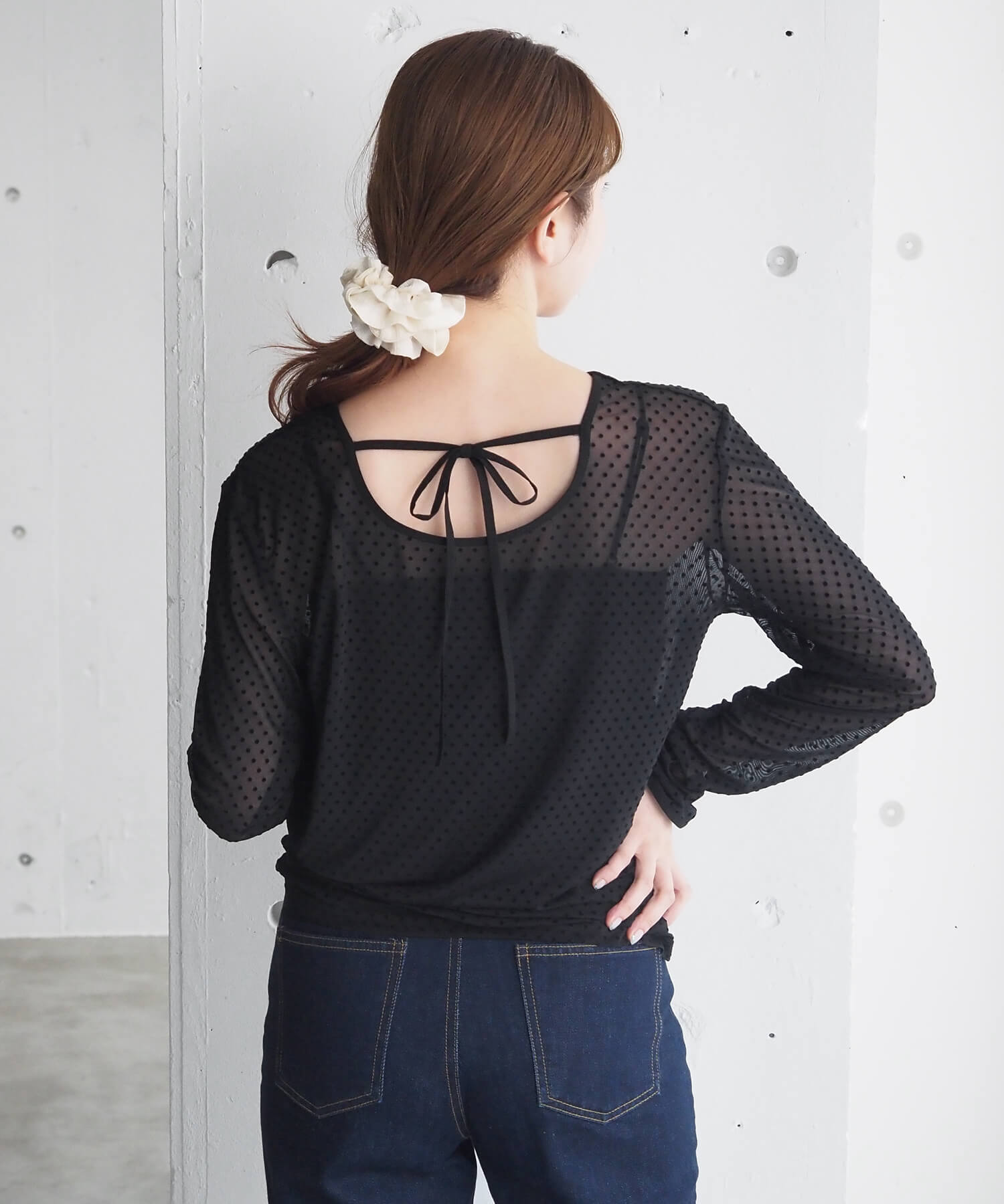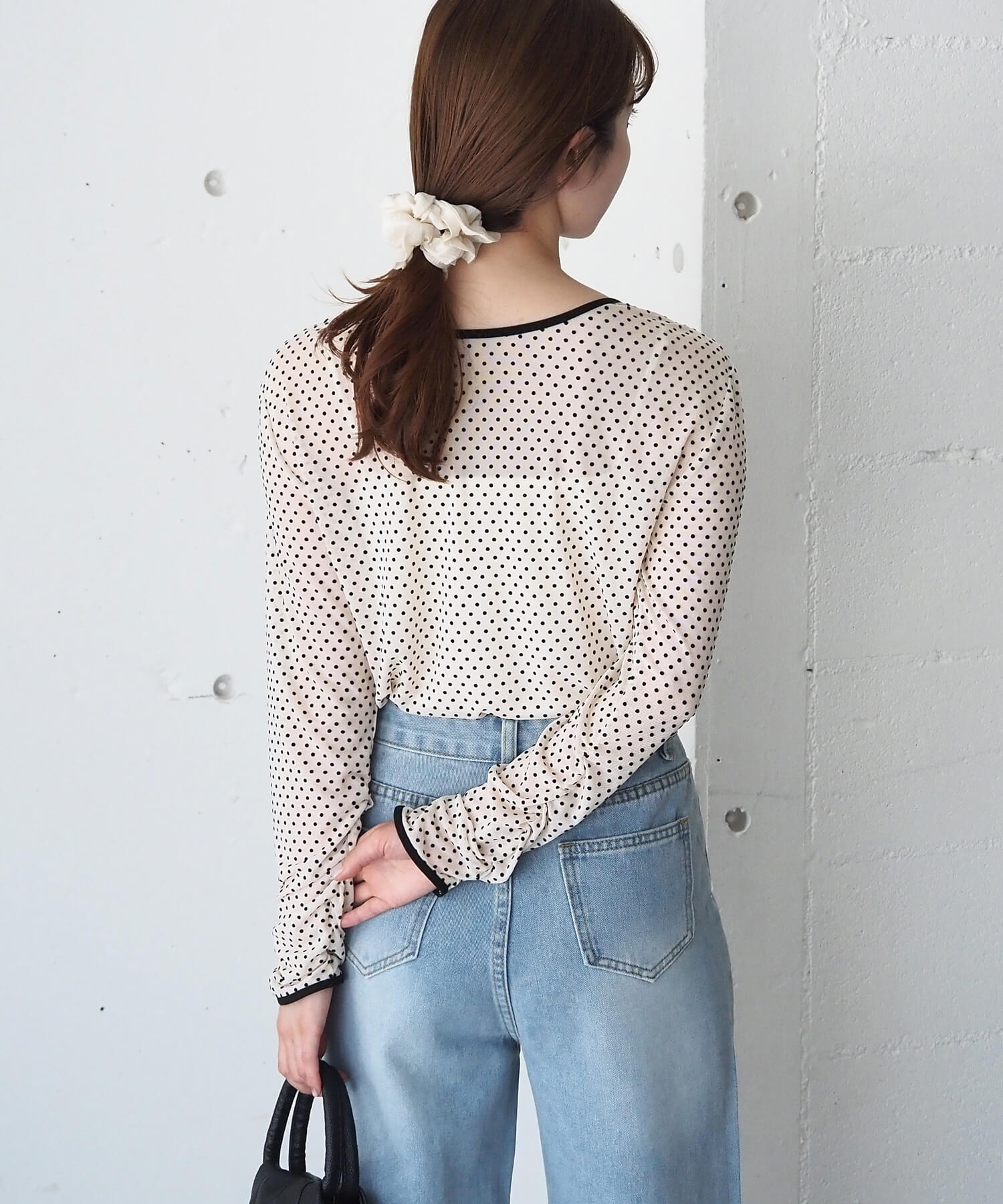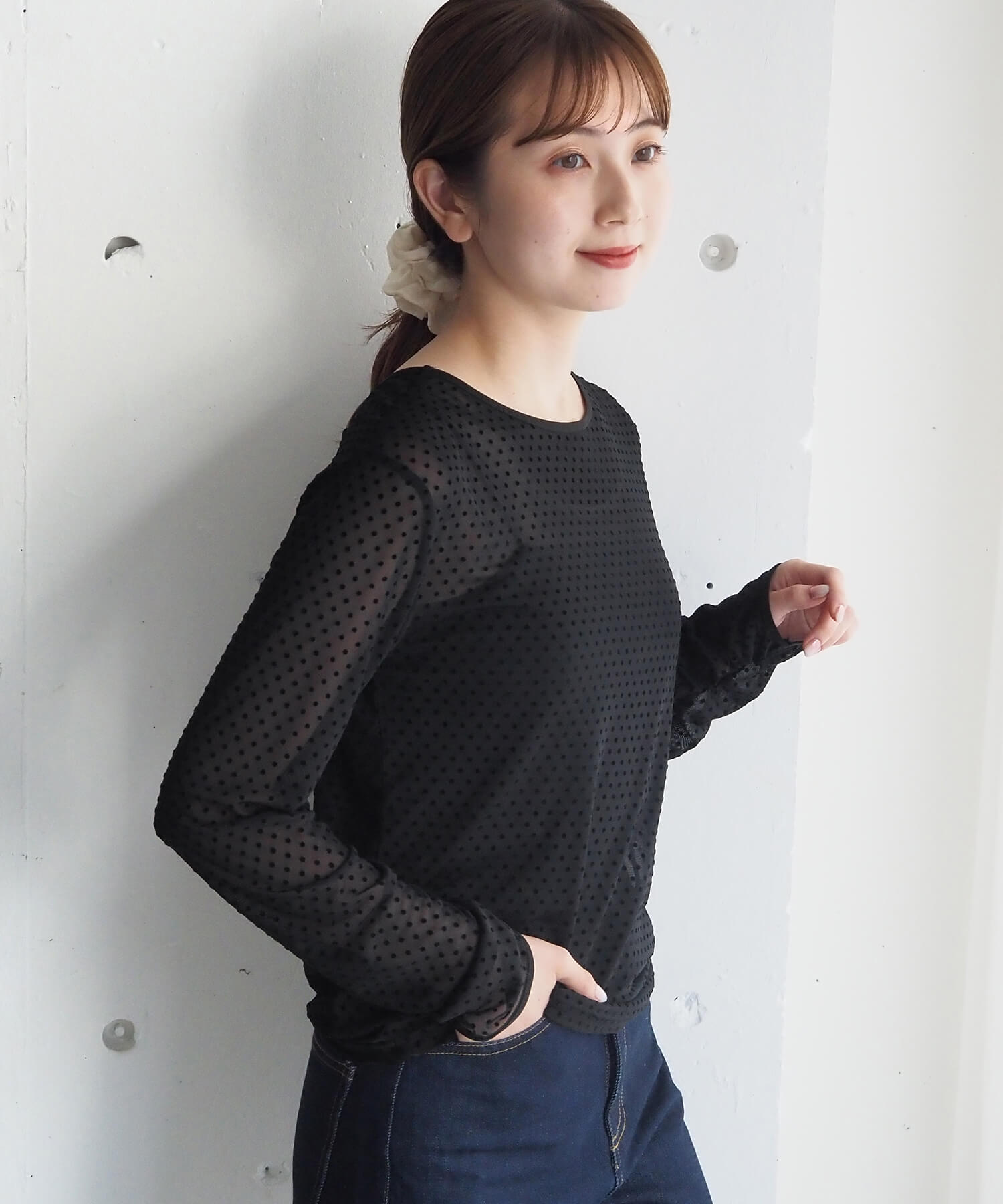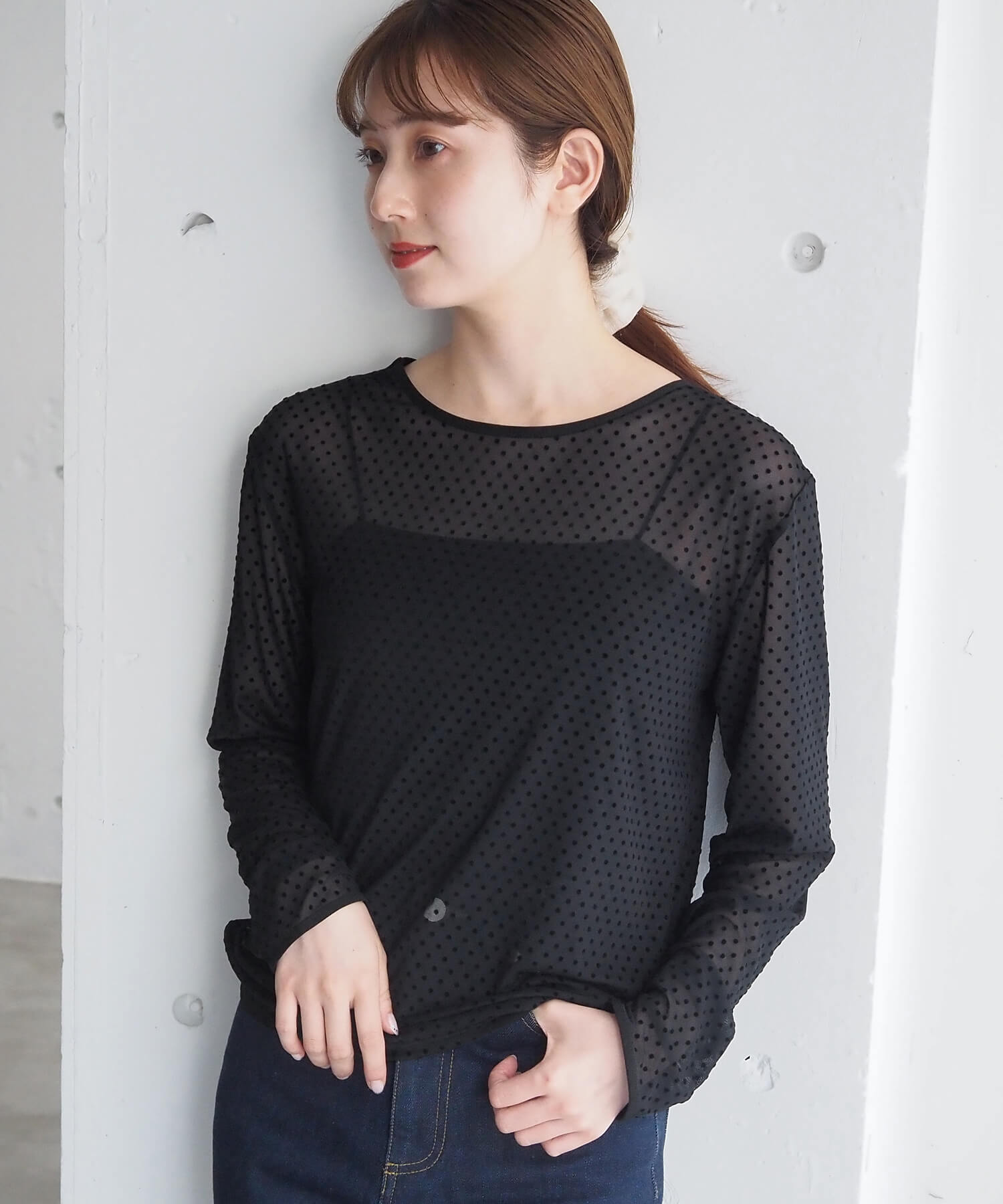 ・大人可愛いドット柄チュール生地と、上品なベロア調無地の2タイプ。どちらも程よいシアー感で軽さのあるアイテムです。