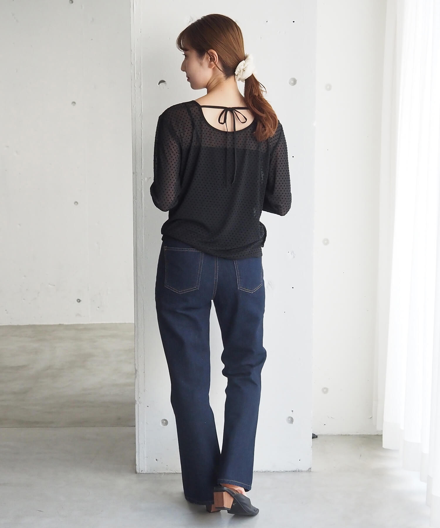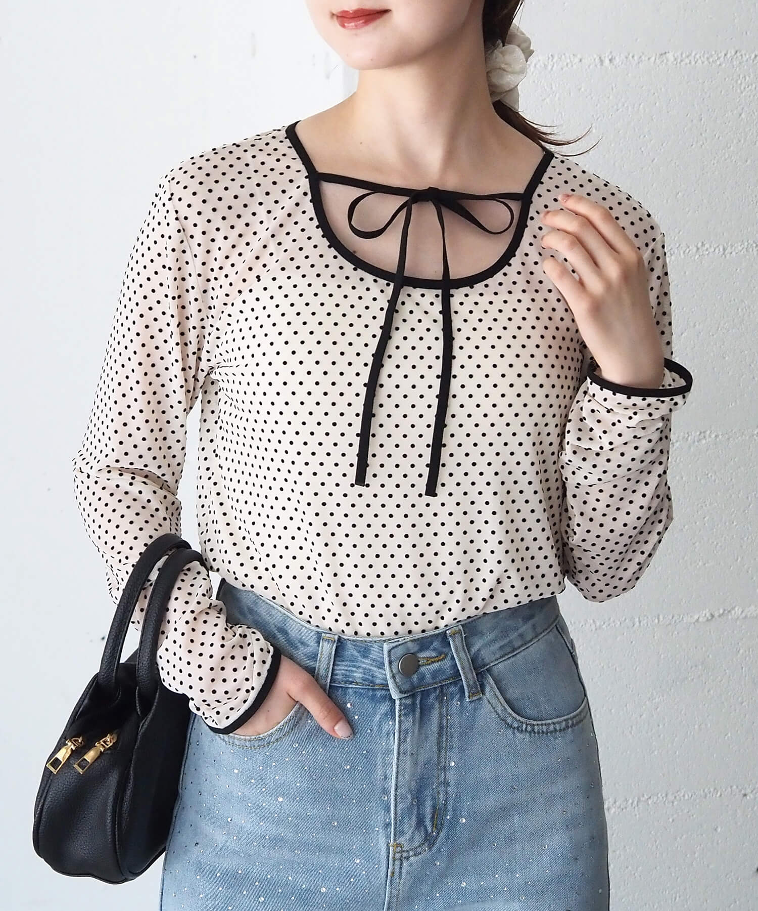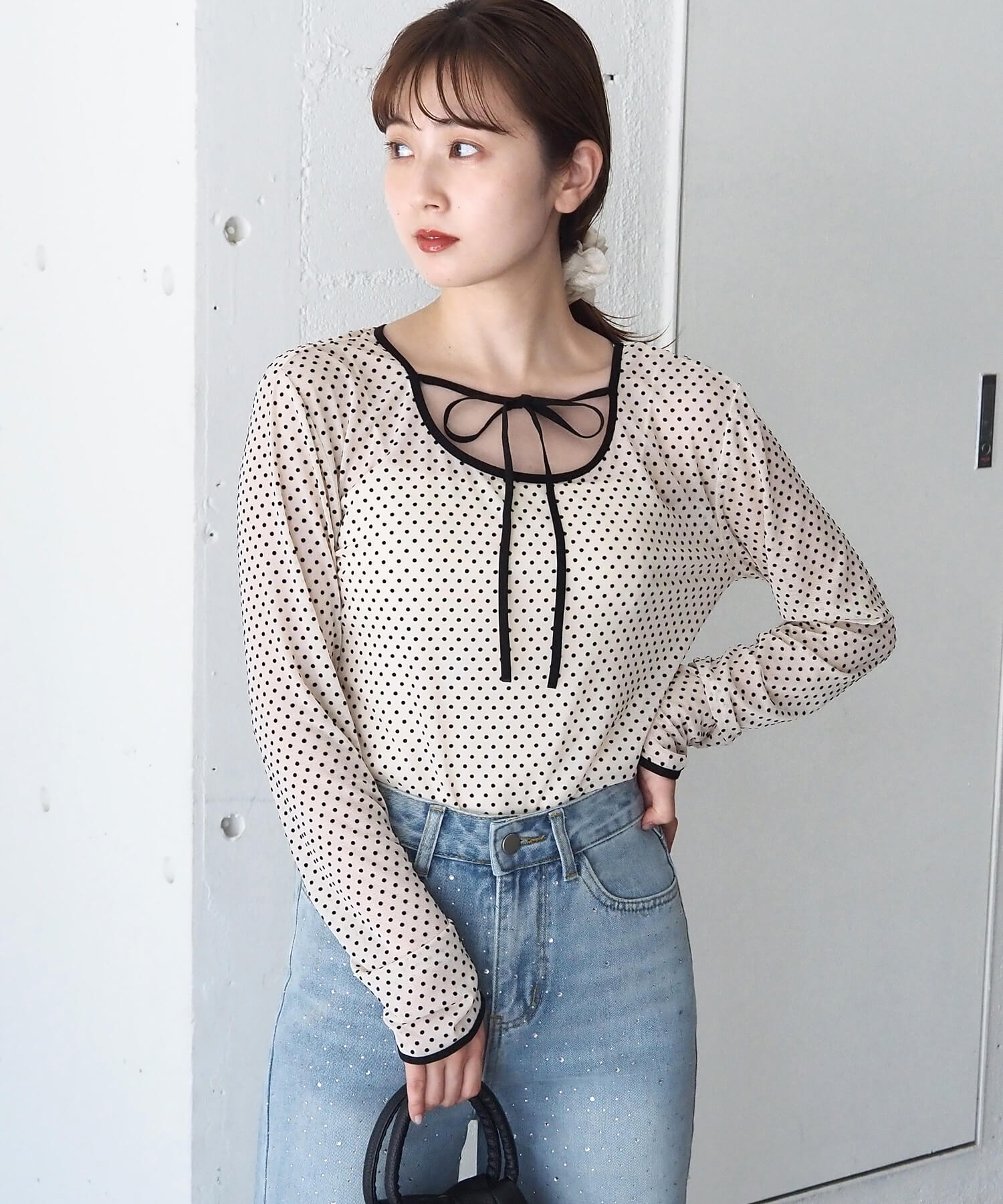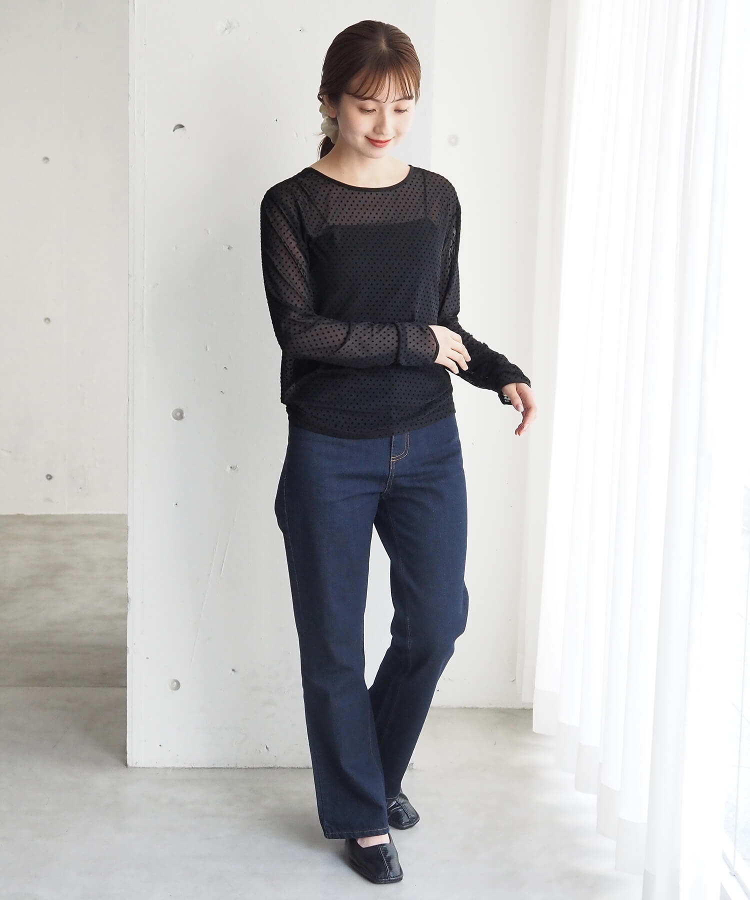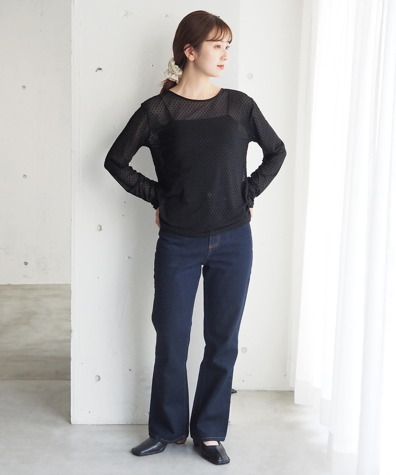 ・大人可愛いドット柄チュール生地と、上品なベロア調無地の2タイプ。どちらも程よいシアー感で軽さのあるアイテムです。