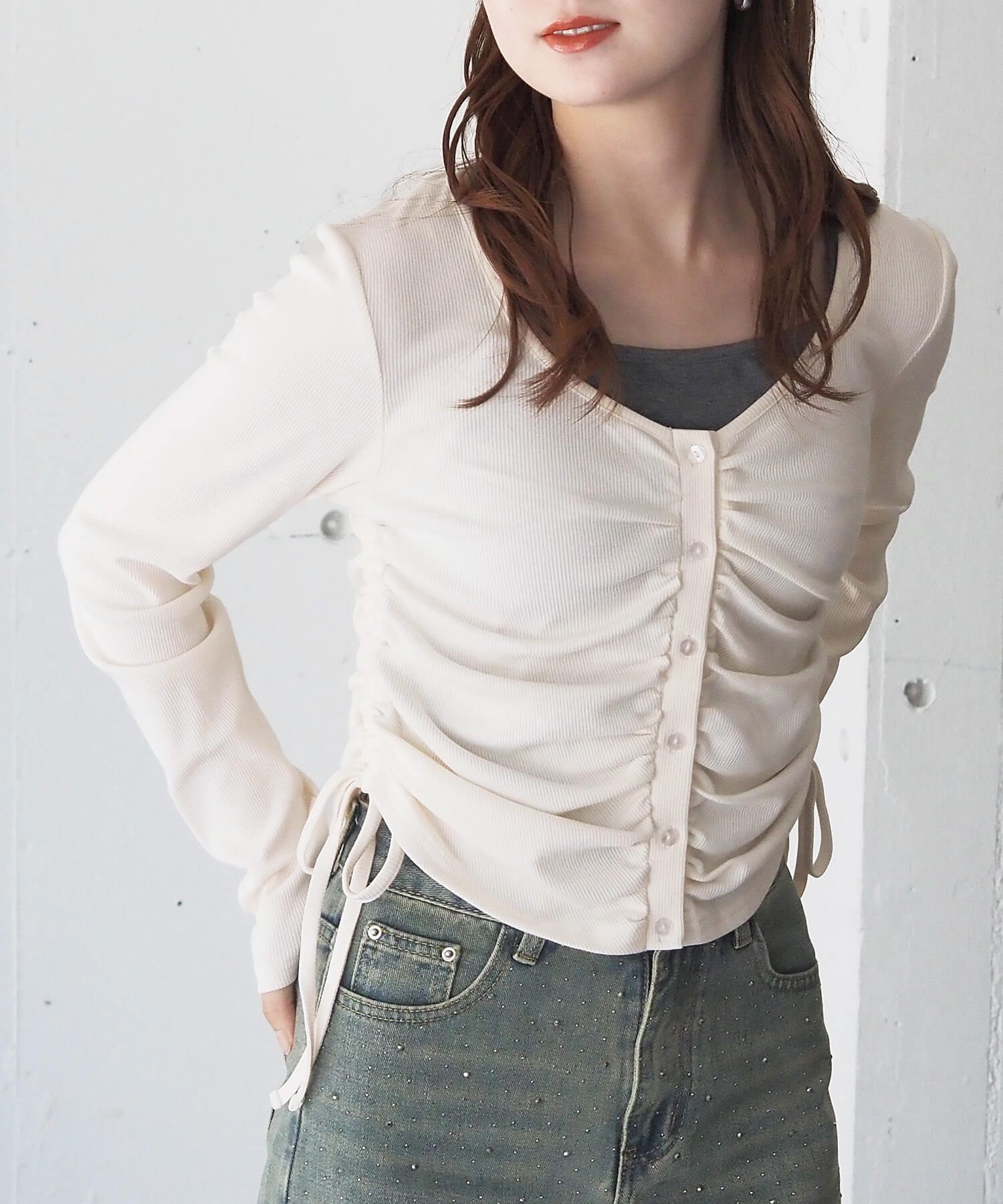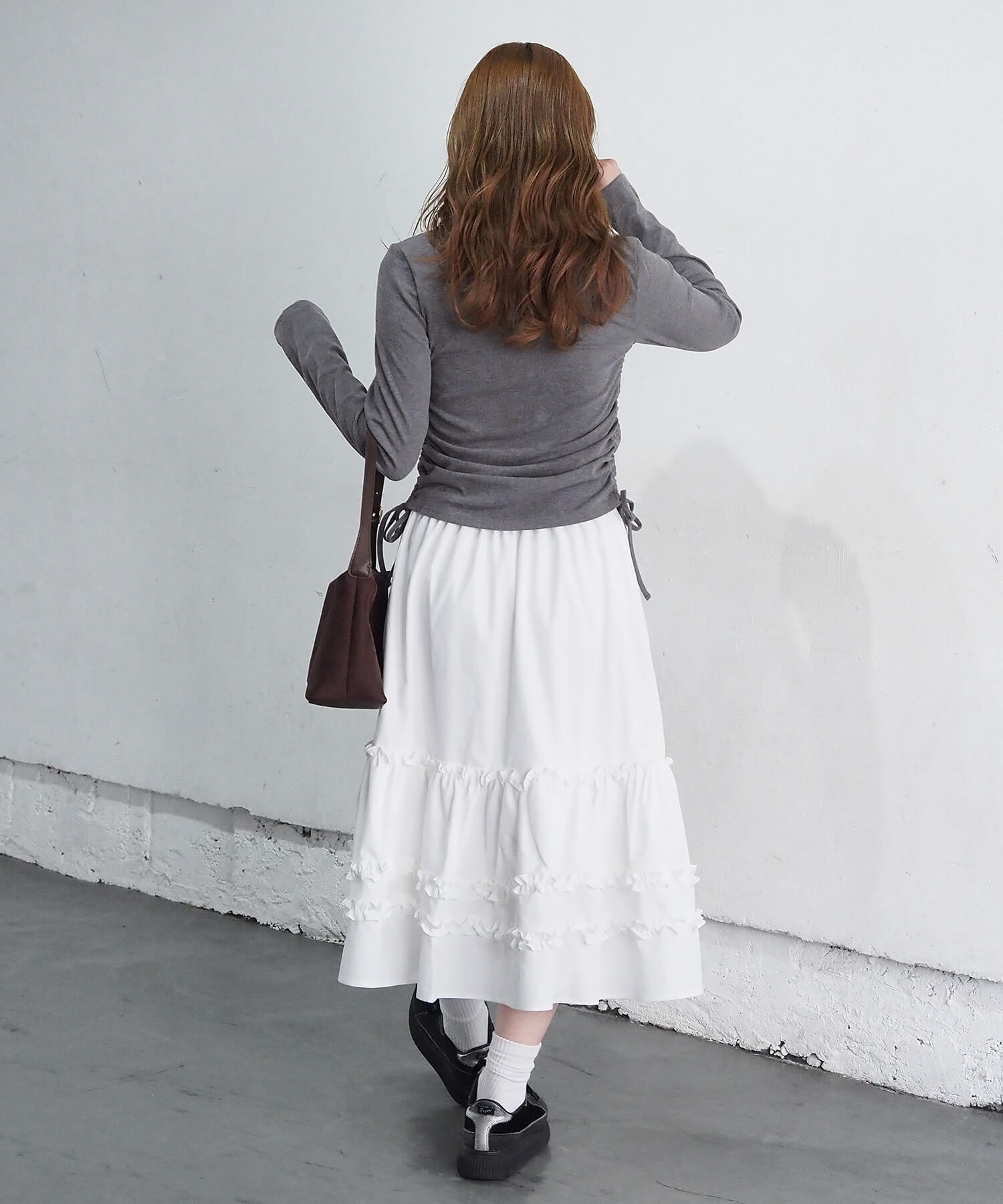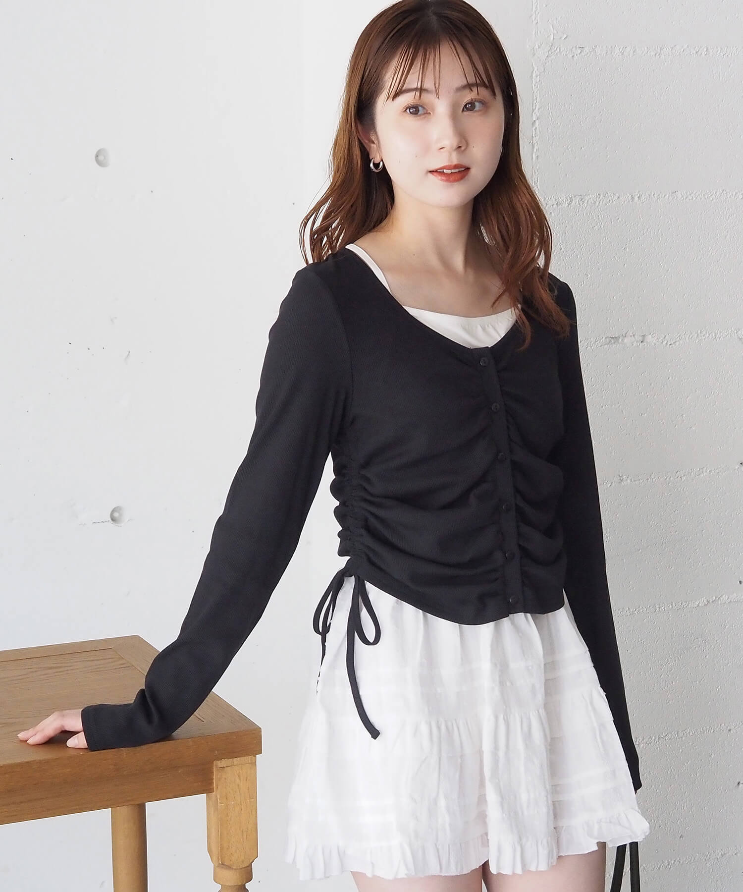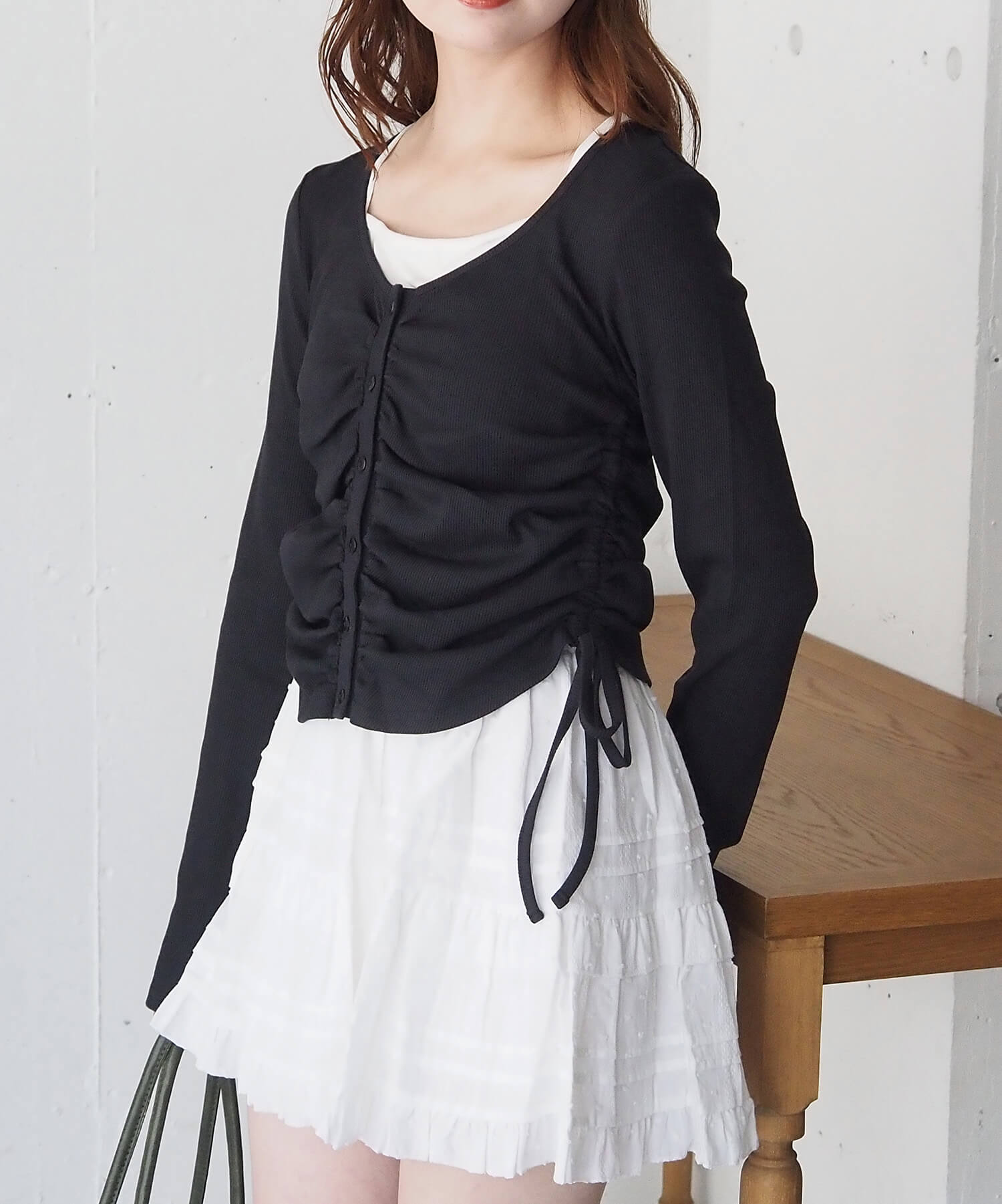 ・サイドのドロストとフロントのギャザーでトレンド感と着痩せ効果も抜かりなく◎