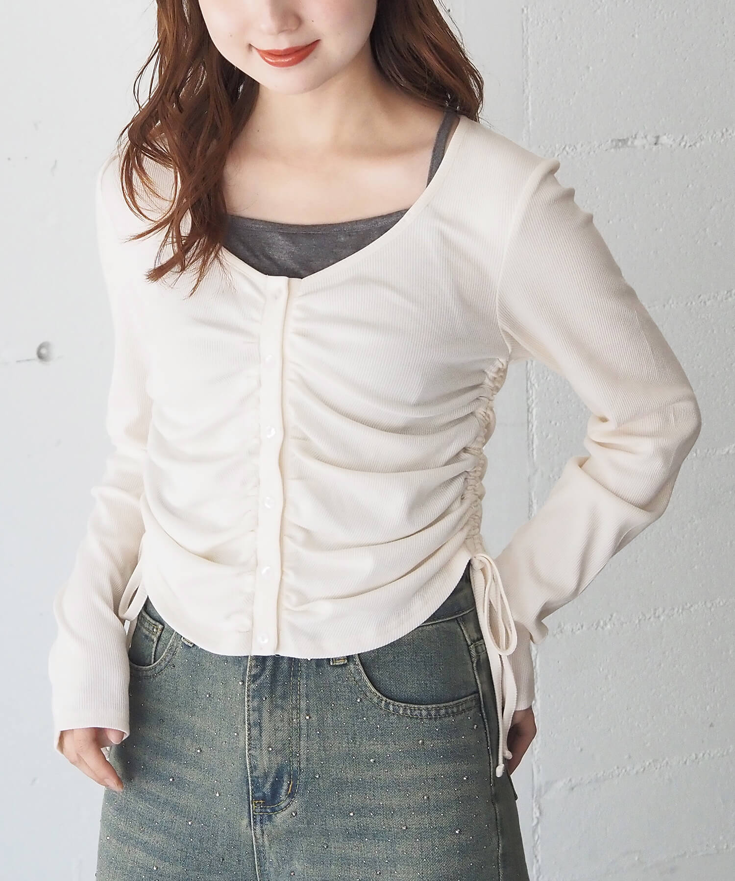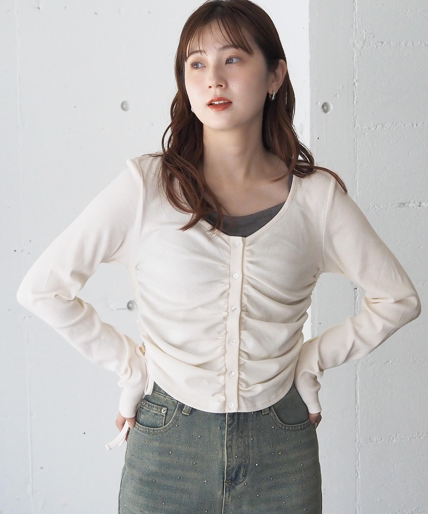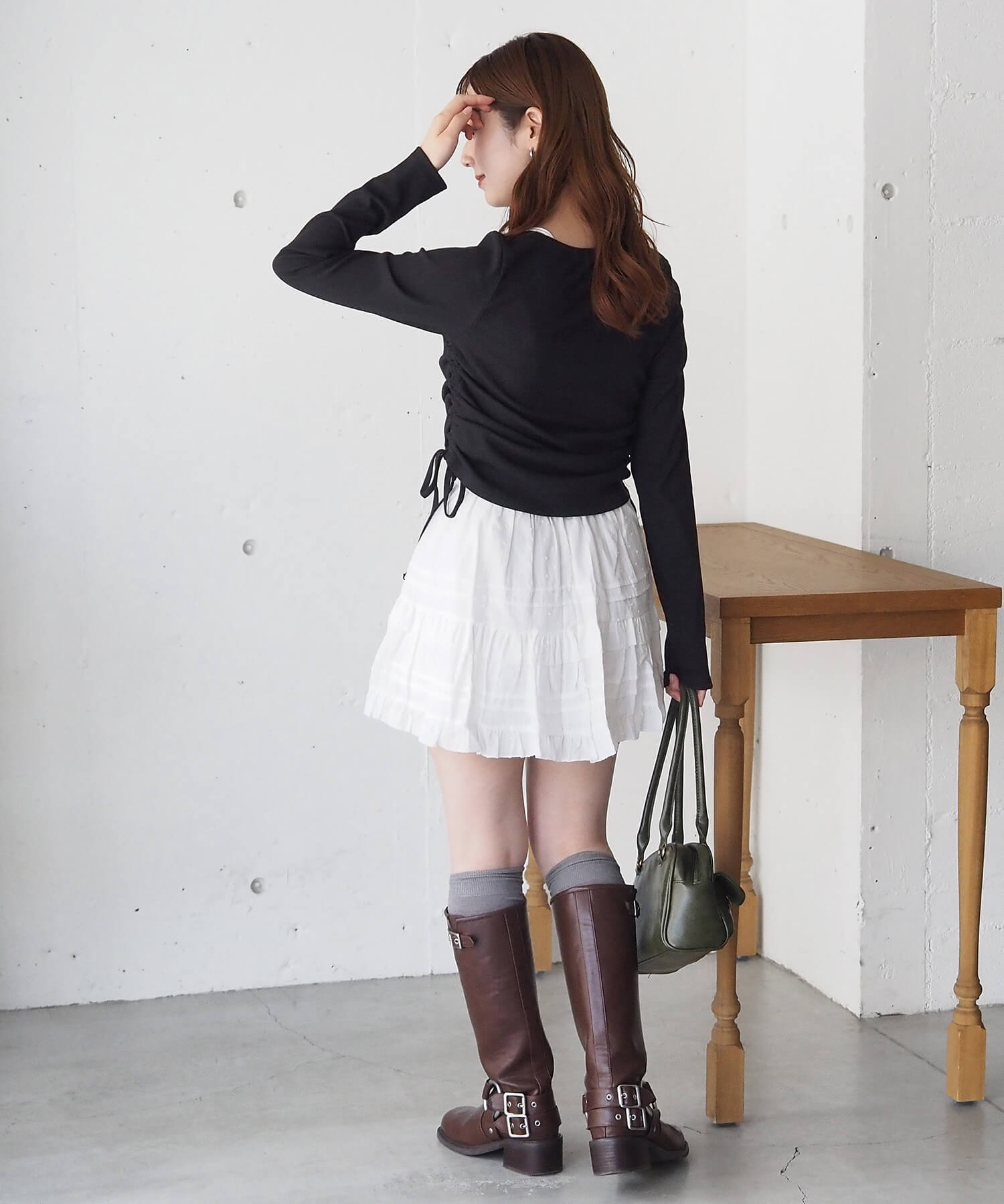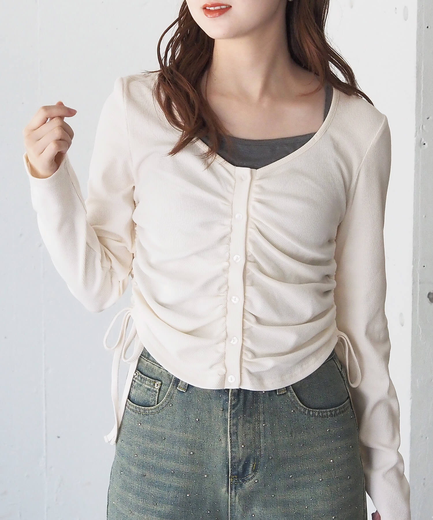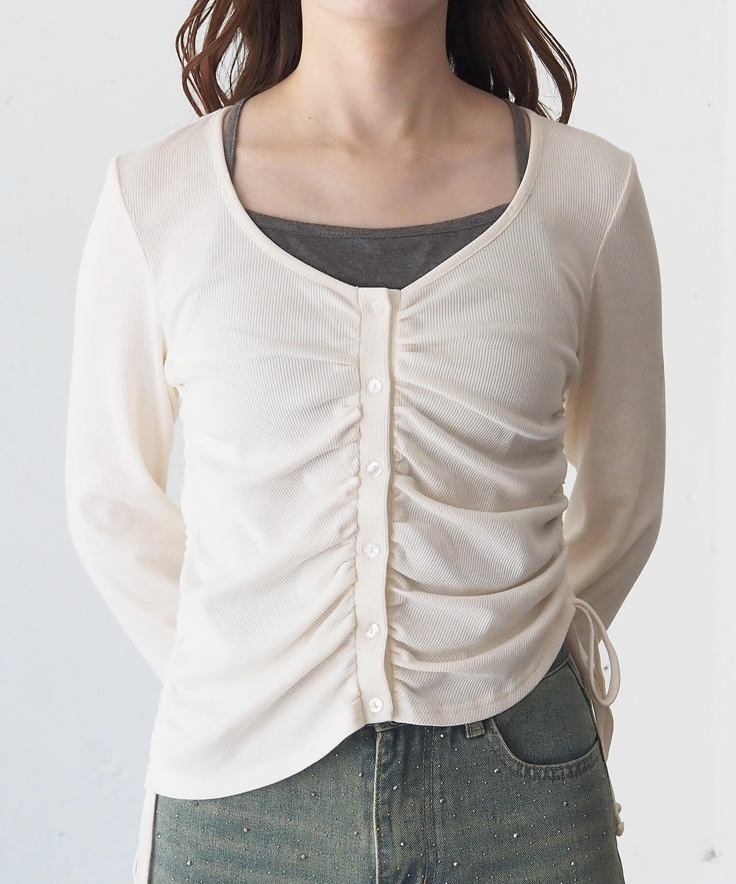・サイドのドロストとフロントのギャザーでトレンド感と着痩せ効果も抜かりなく◎
