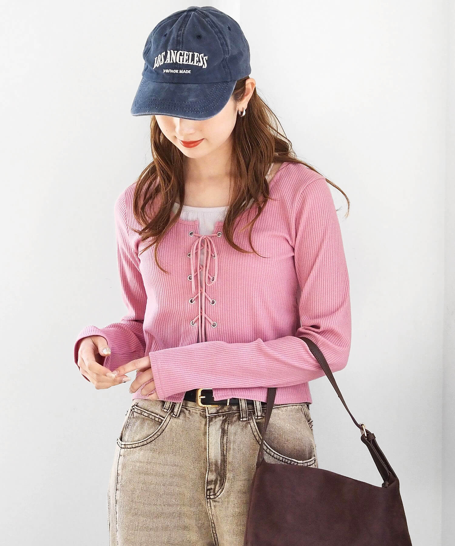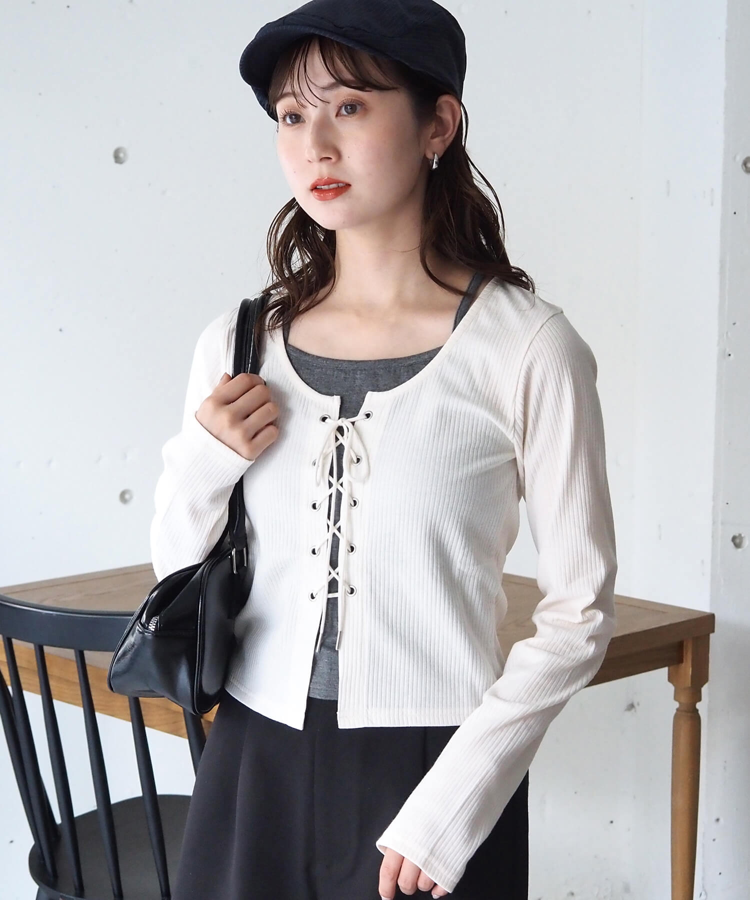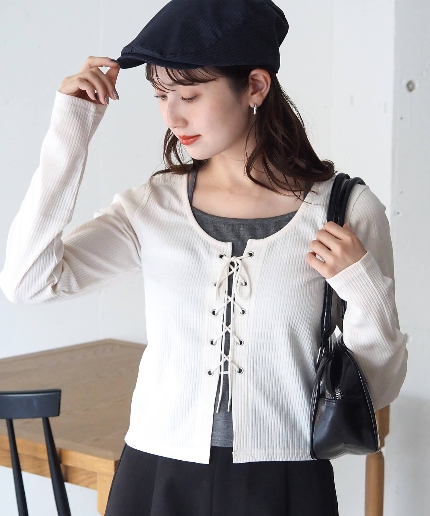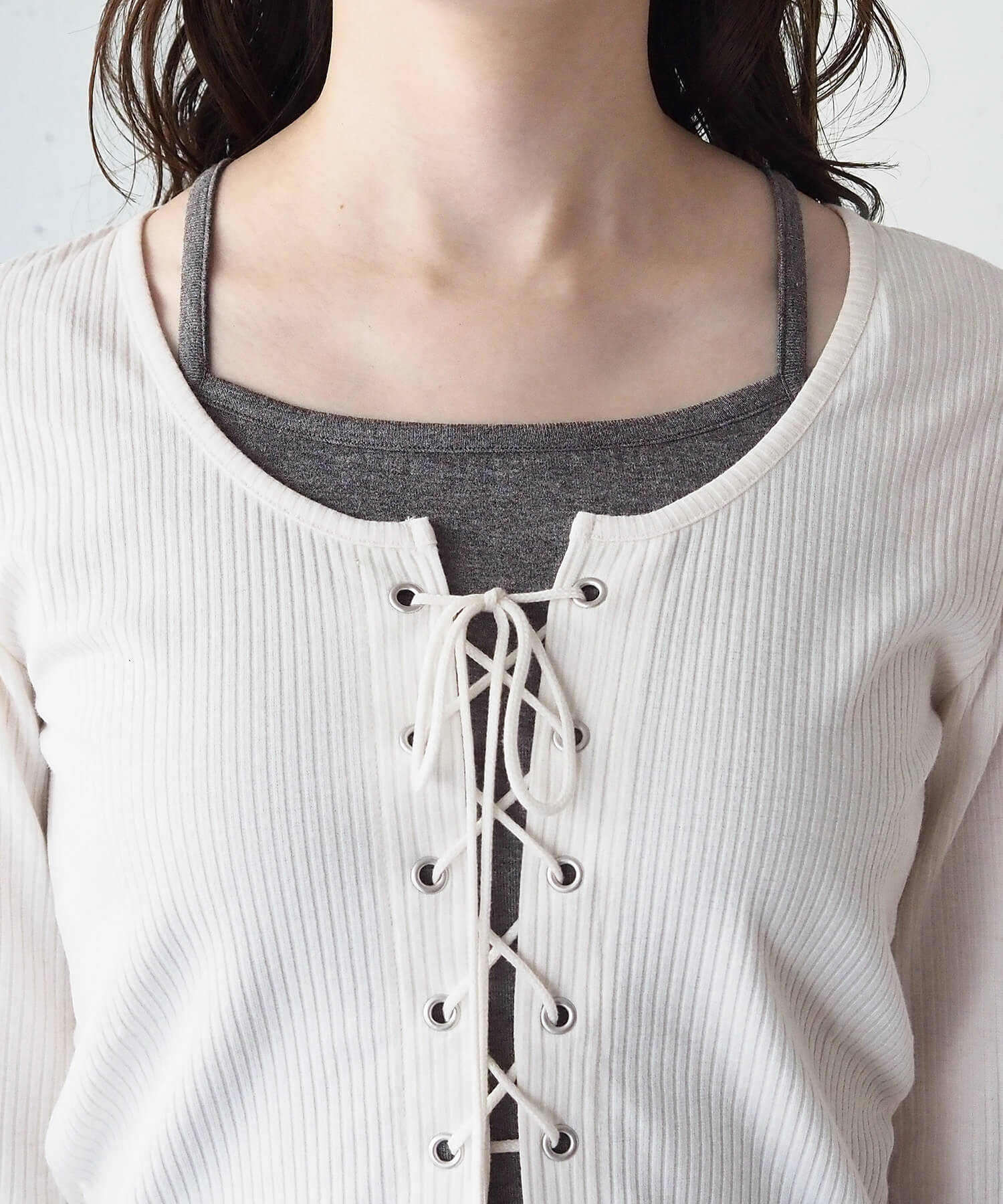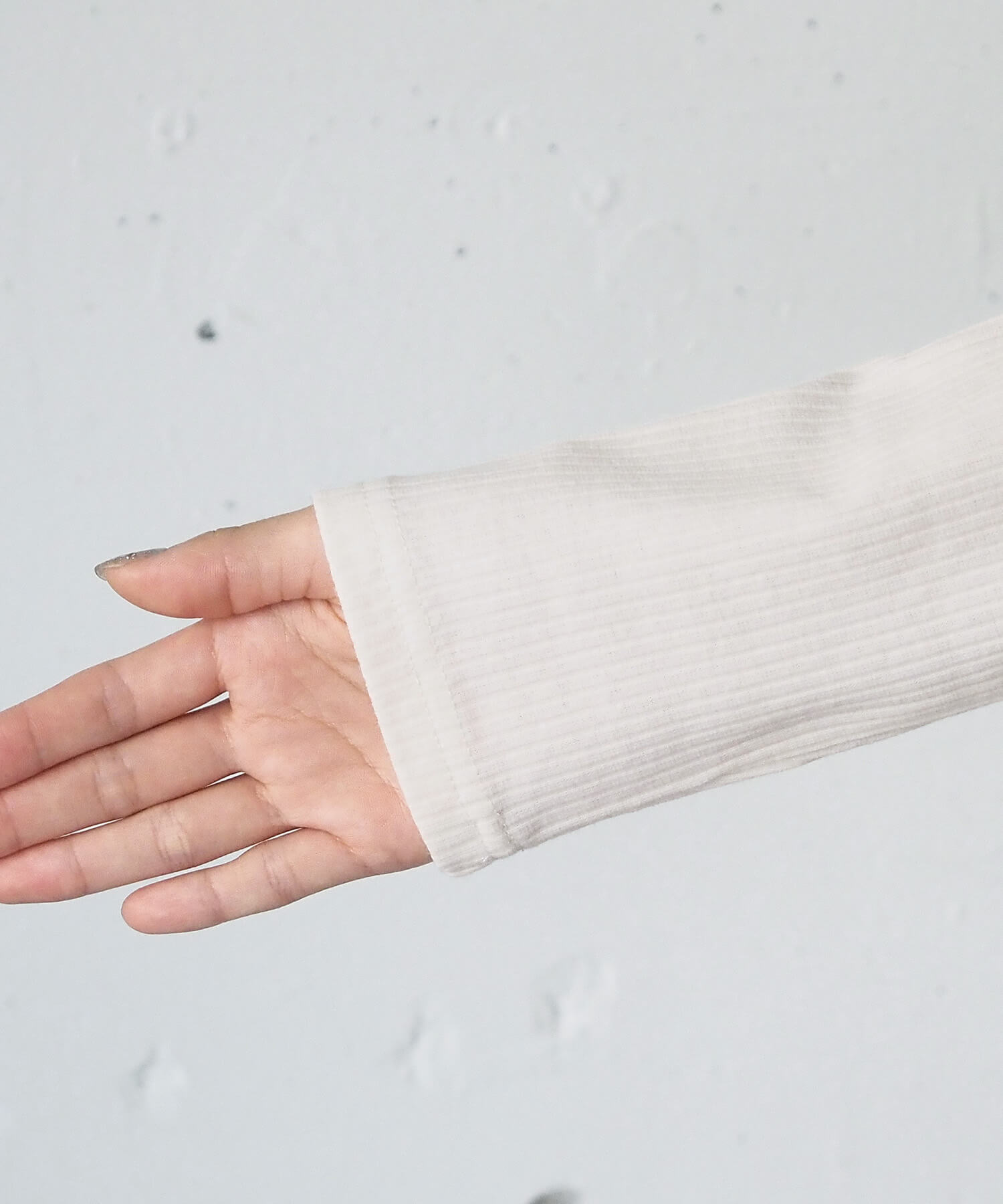 ・キャミソール部分は無地生地、長袖部分はテレコ生地を使用。異なる風合いの生地がこなれ感を演出します。