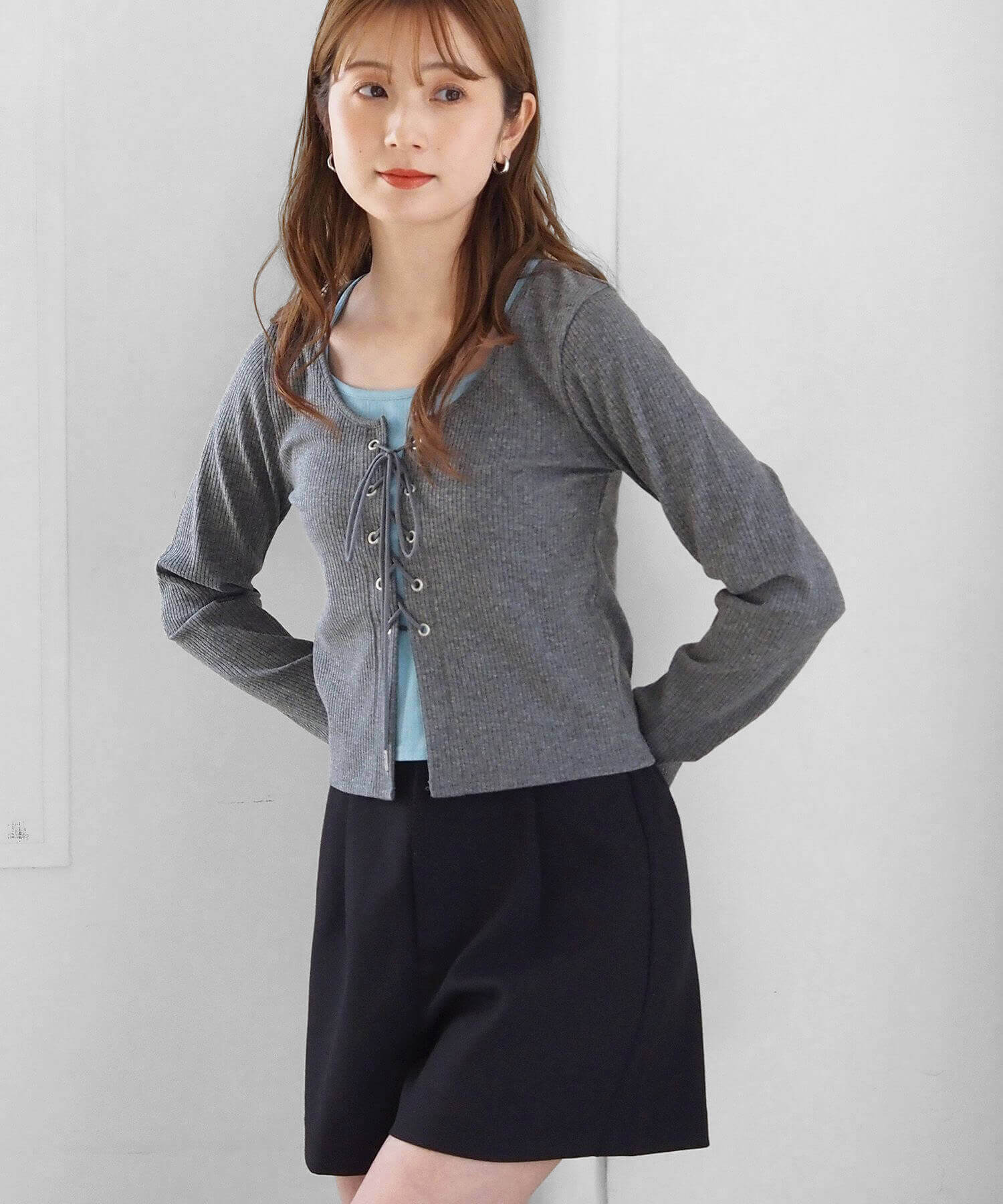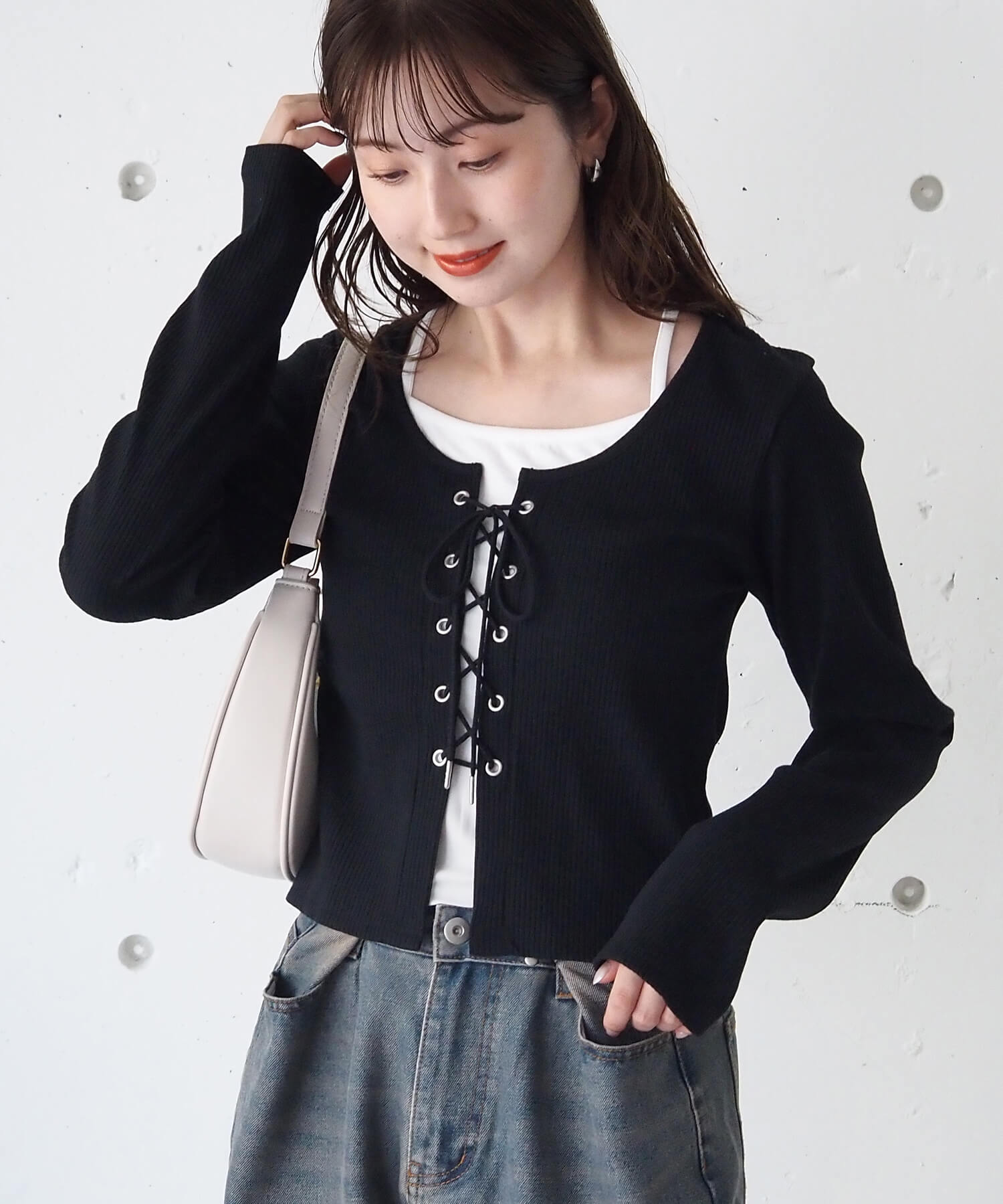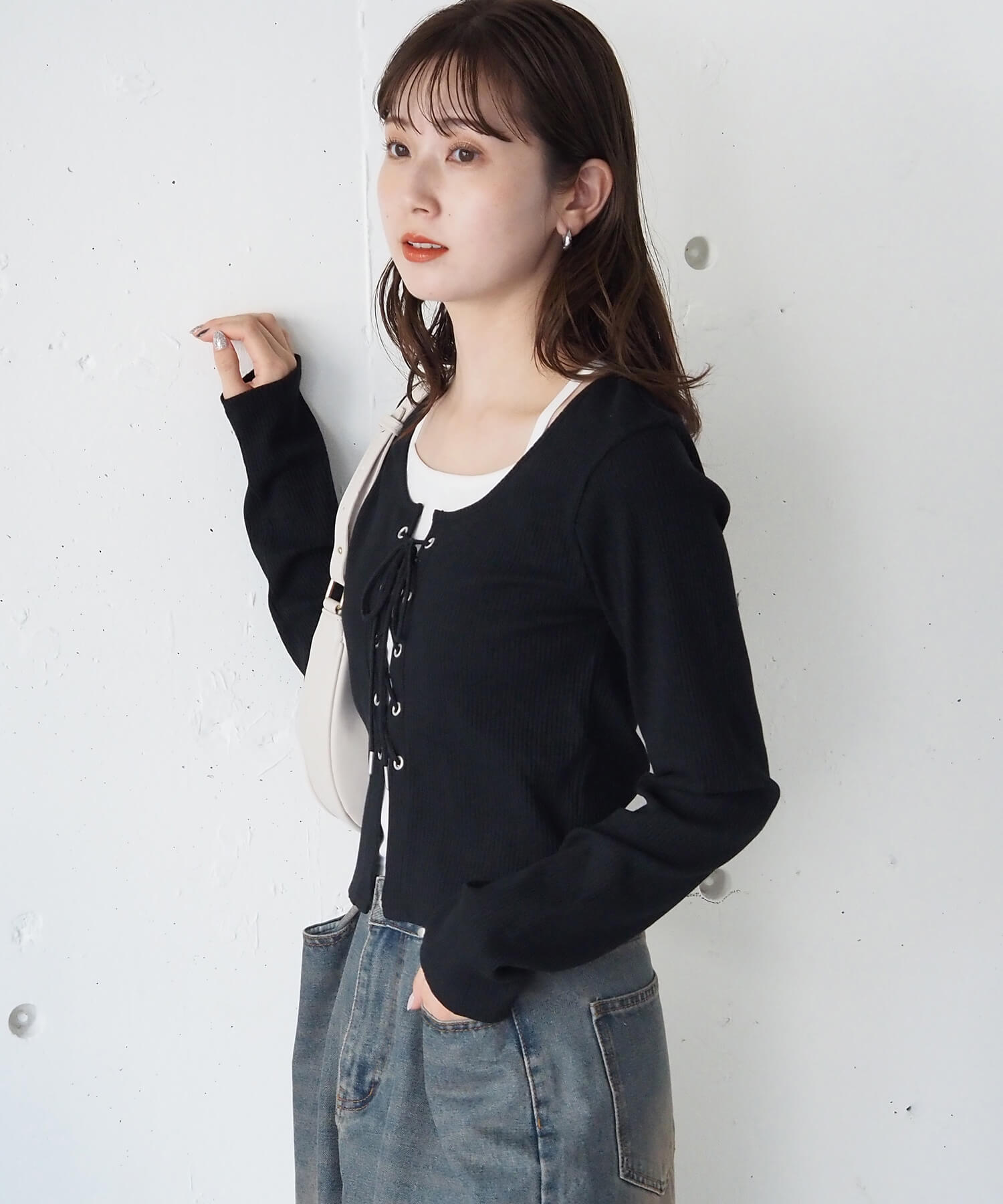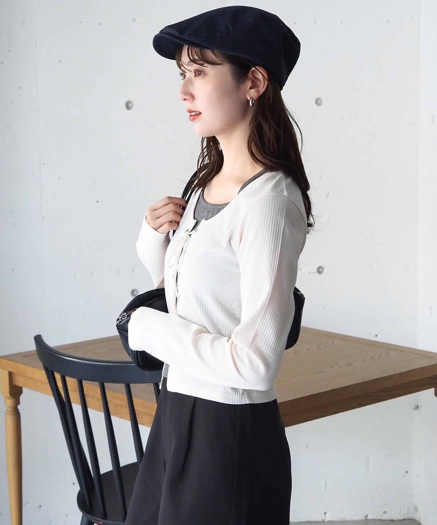 ・前身ごろはキャミソールにカーディガンを羽織ったようなデザイン。2枚重ねているので、よりリアルな着こなしが楽しめます。