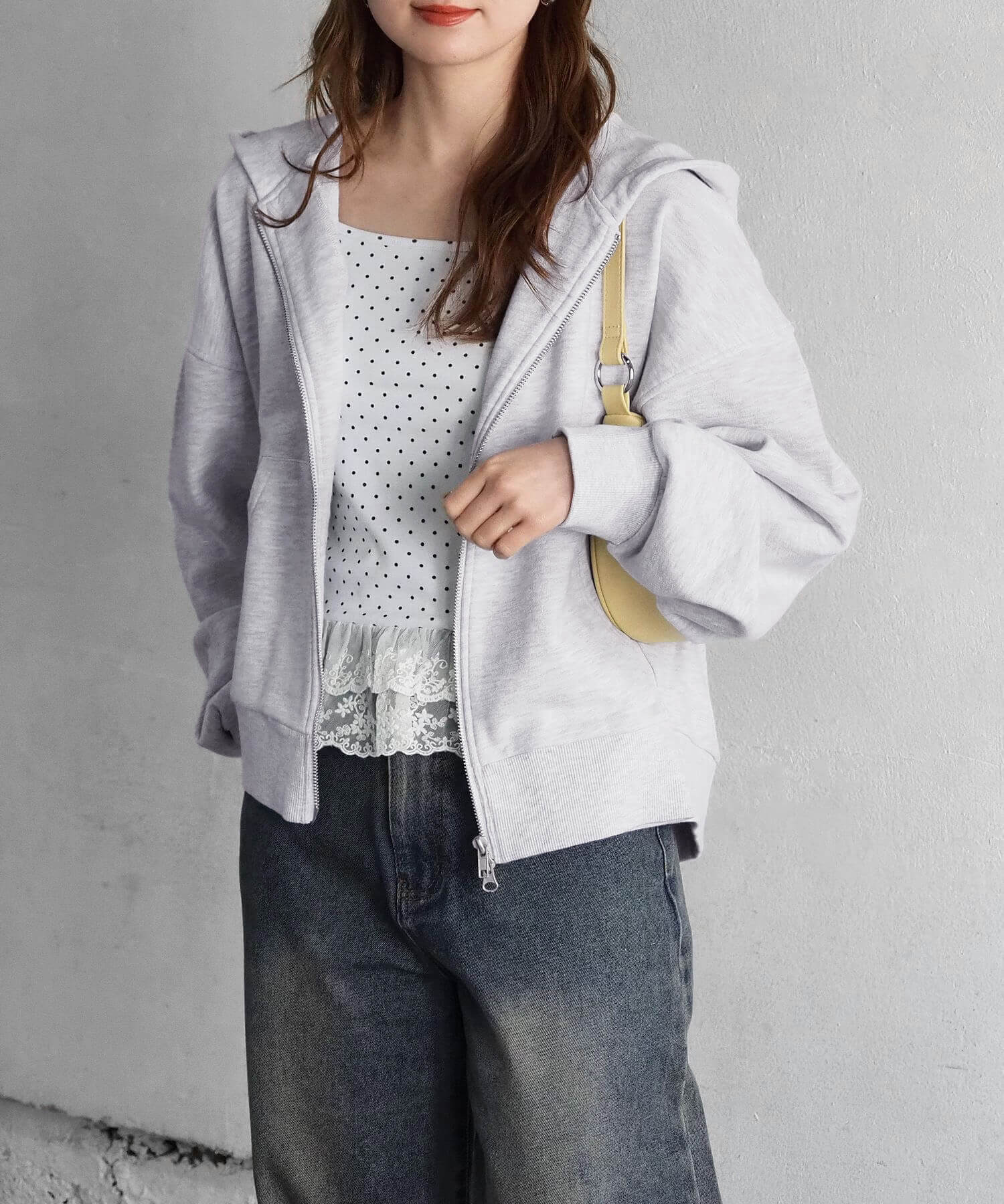 ・メンズライクなルーズデニムにジップからレースのインナーを覗かせて、女性らしいストリートカジュアルが完成します。