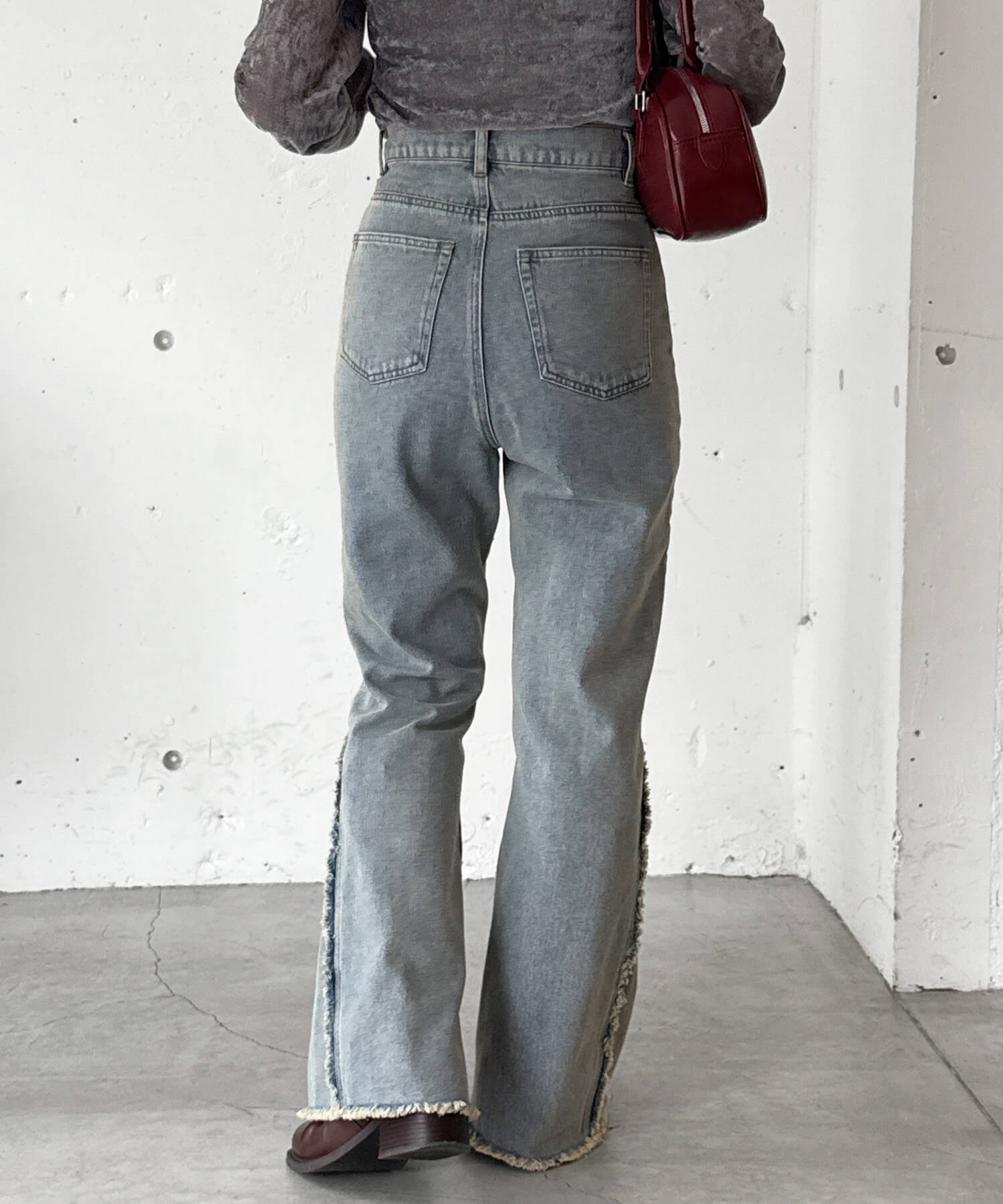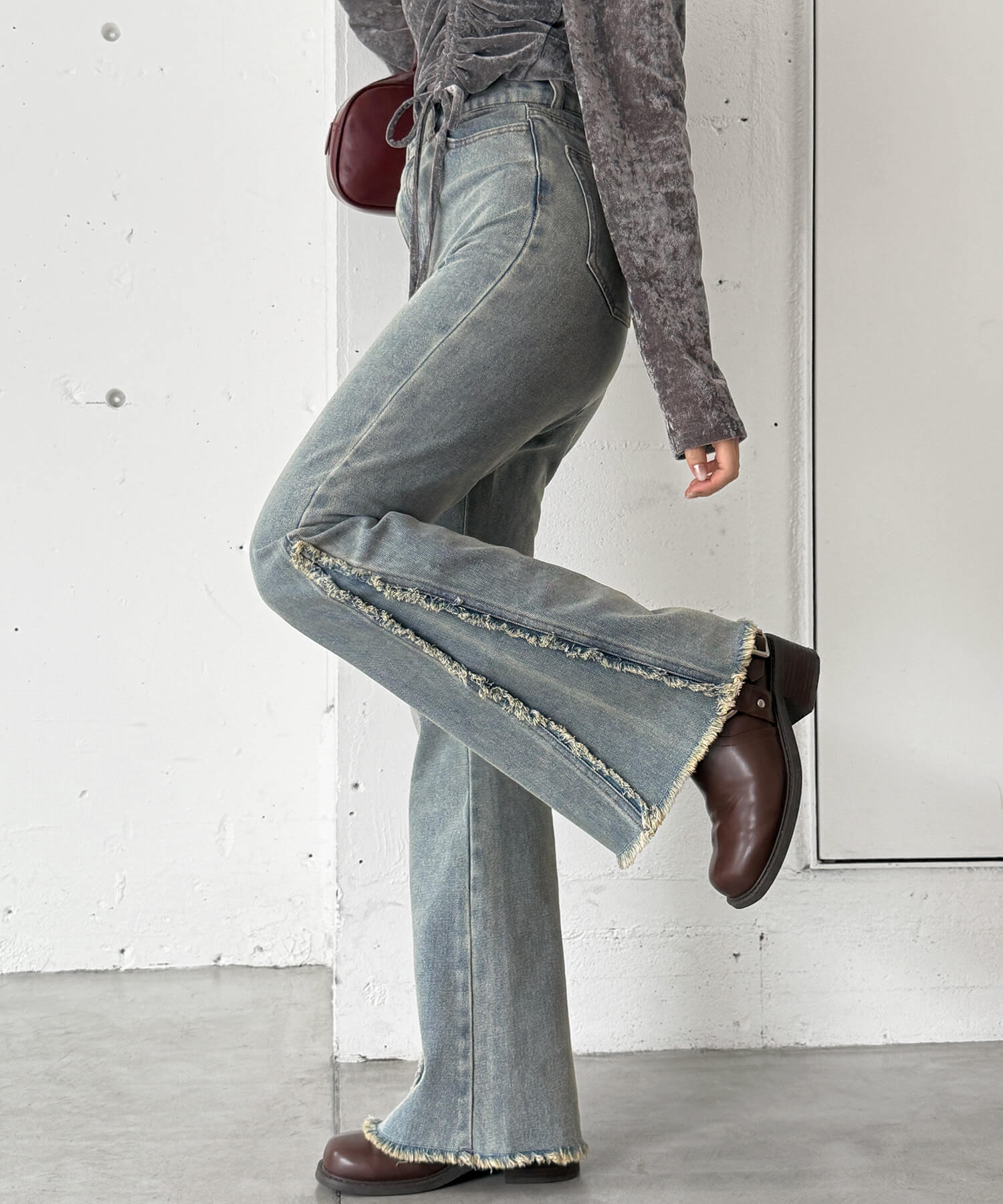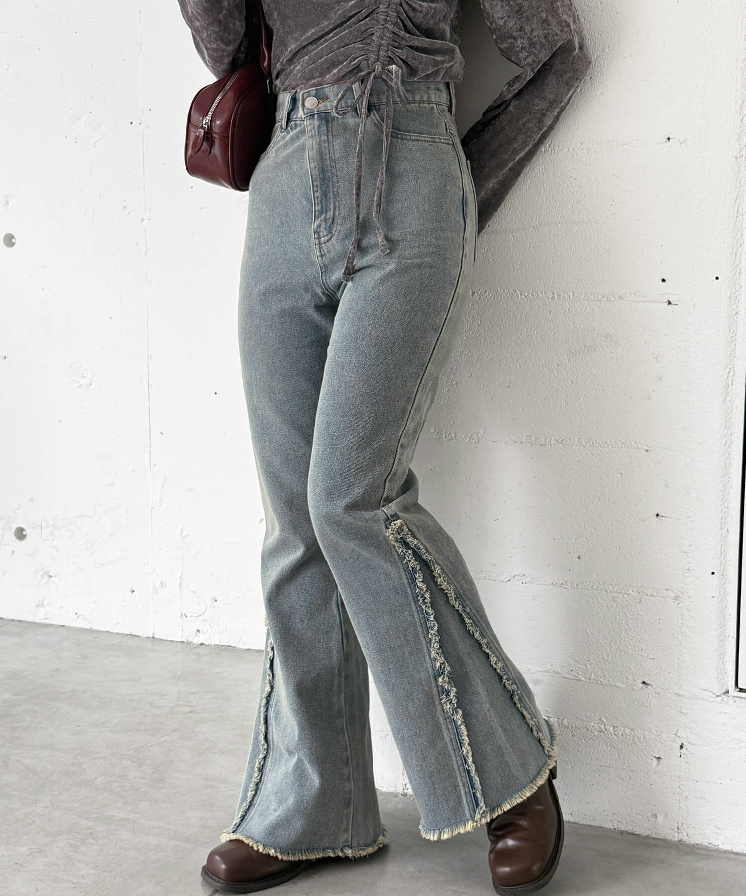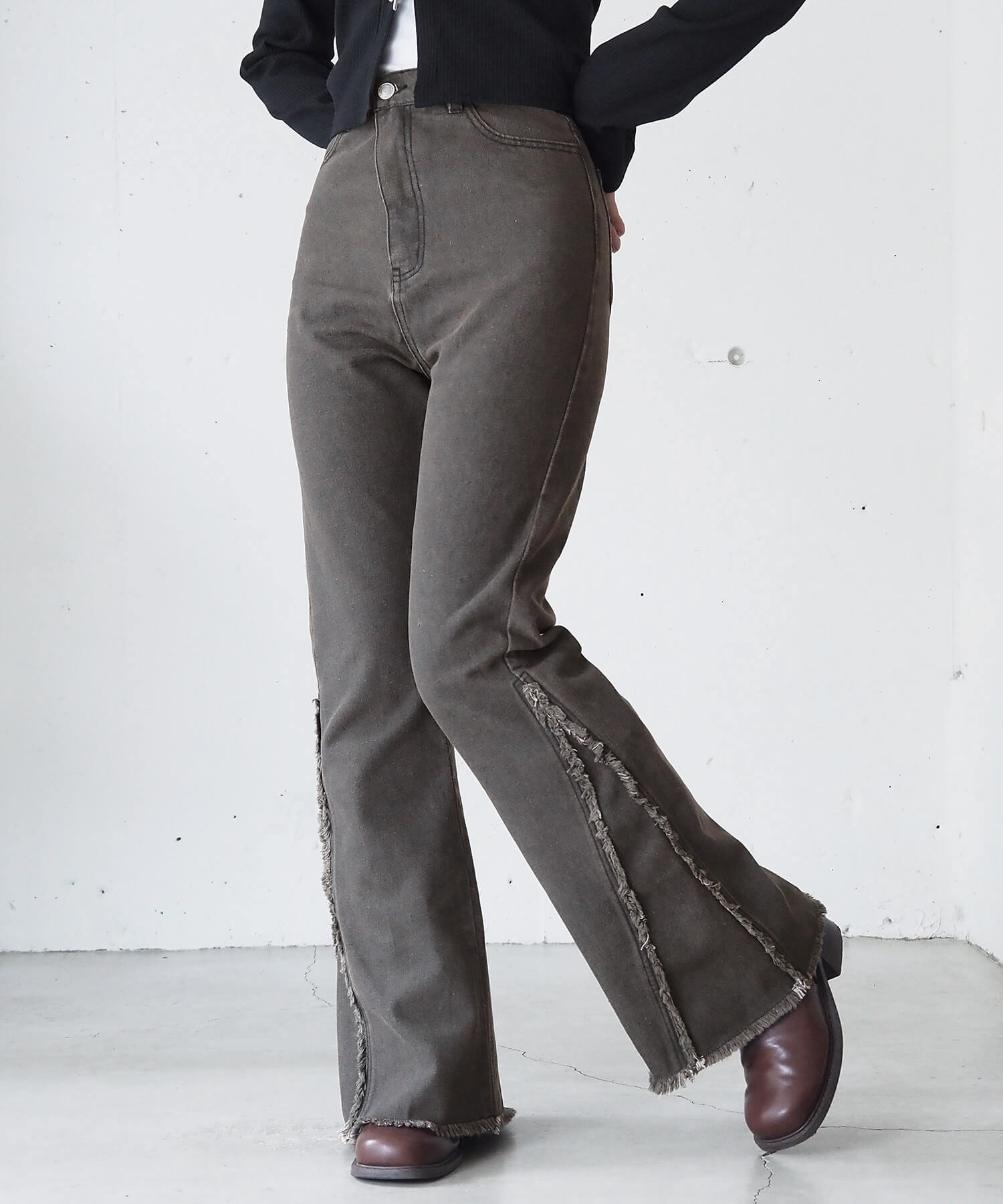・美脚効果抜群のフリンジ切り替えがポイントのフレアデニムです。