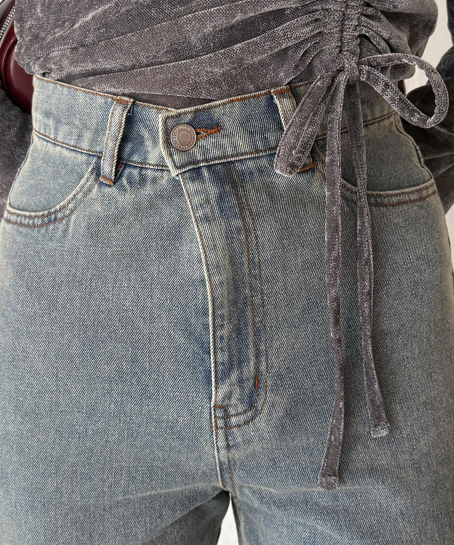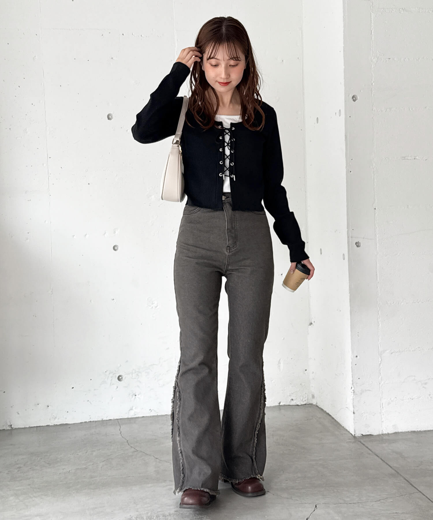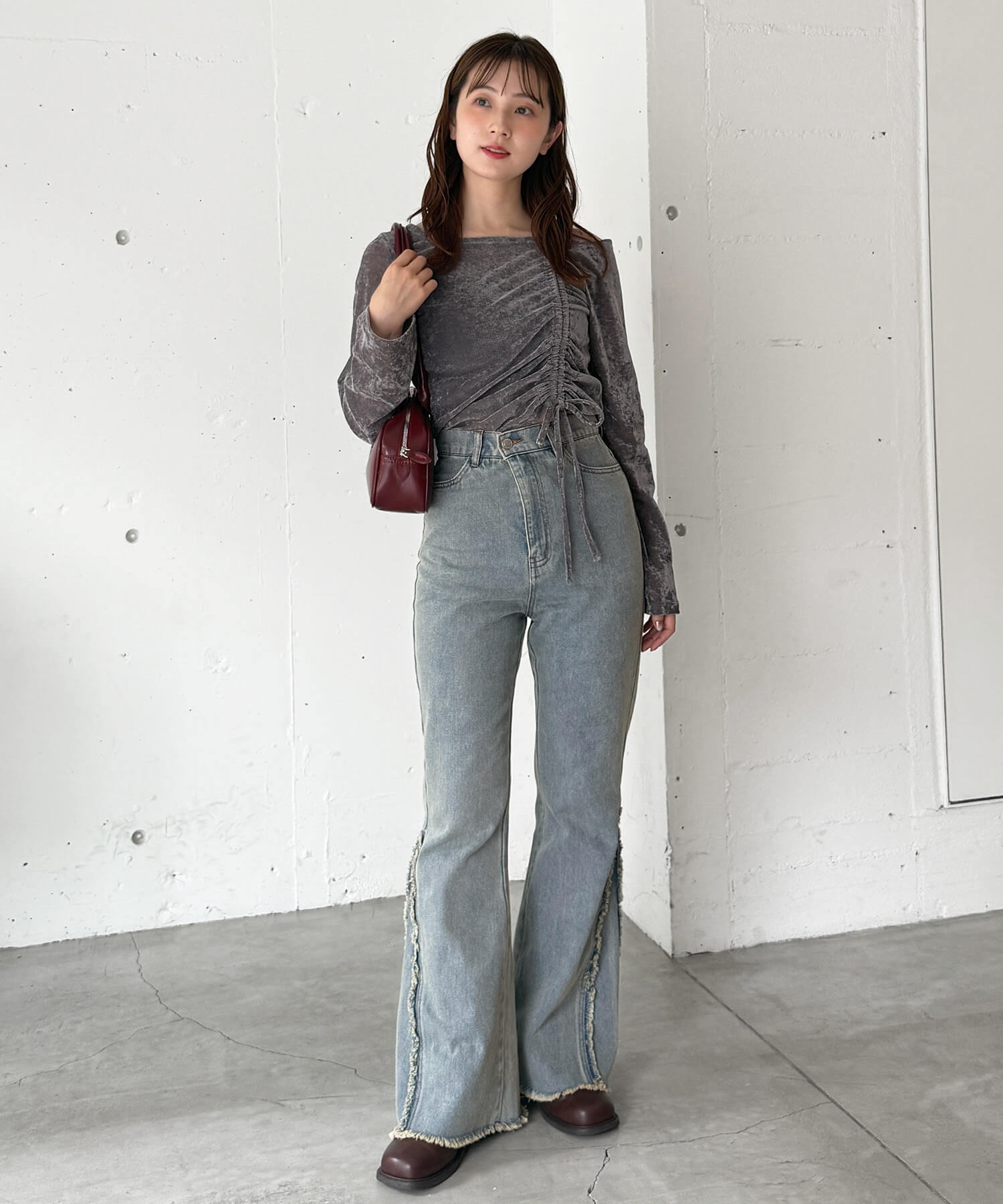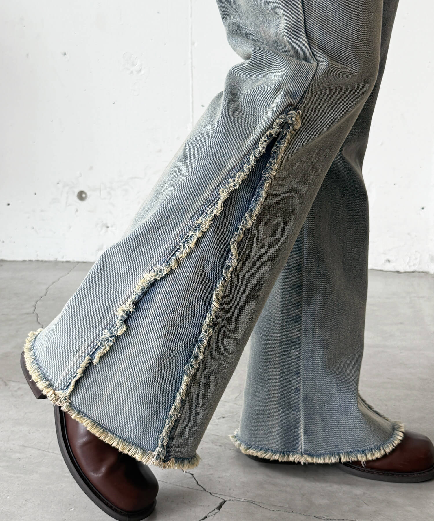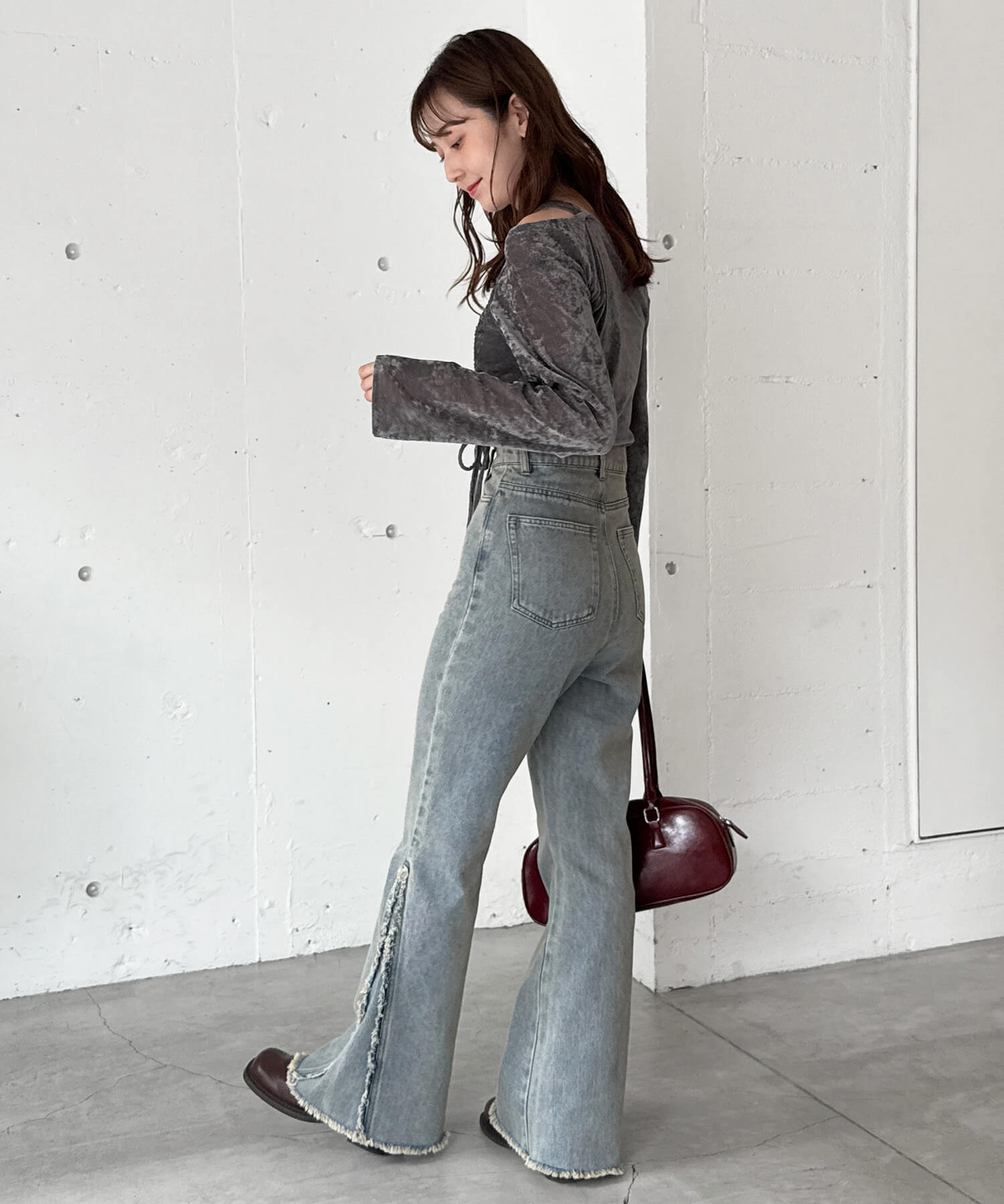 ・美脚効果抜群のフリンジ切り替えがポイントのフレアデニムです。