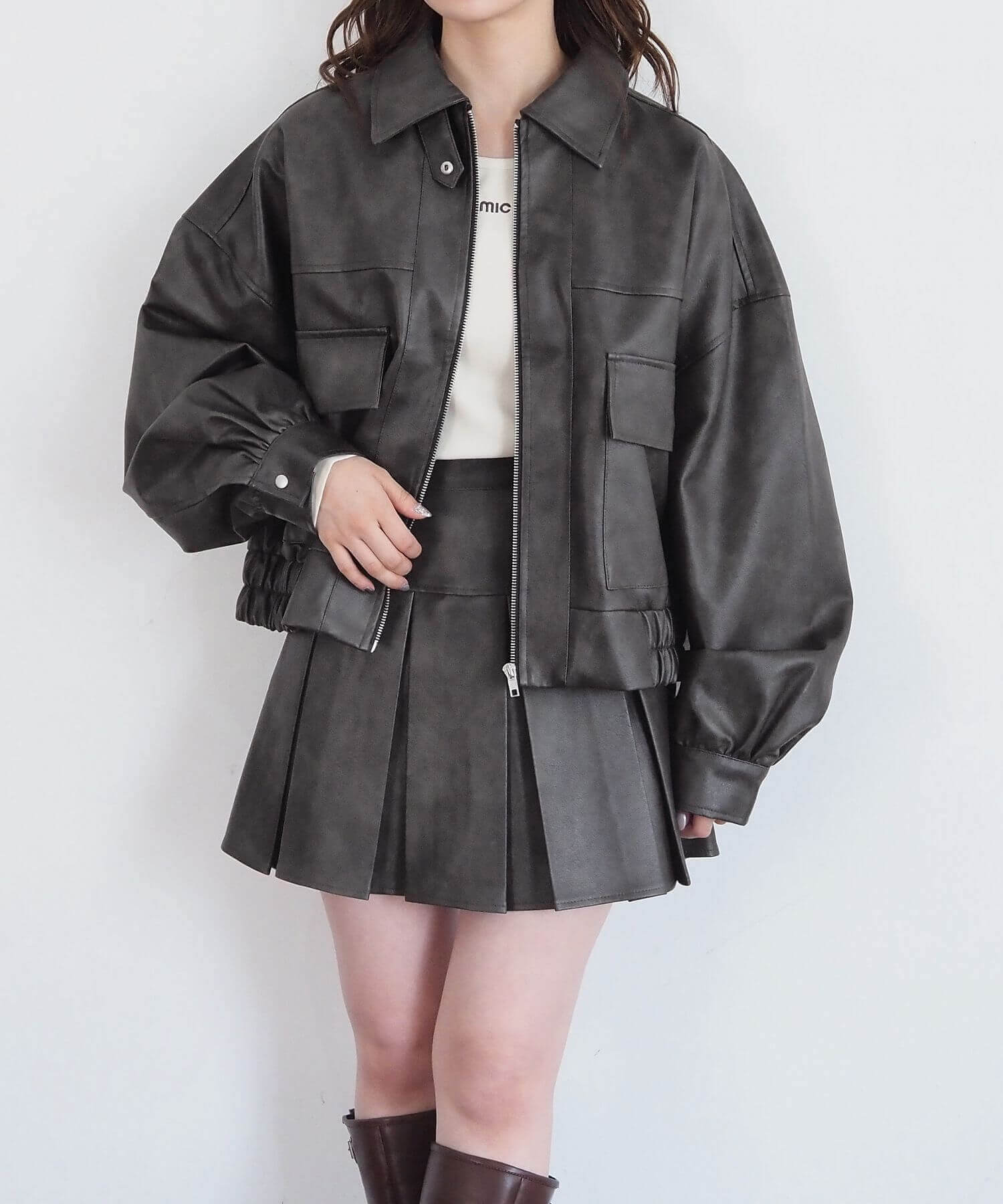 ・セットアップ対応のビッグショート合皮ブルゾン(品番:1760246493)と、さらにトレンドライクなコーディスコートも可能です。