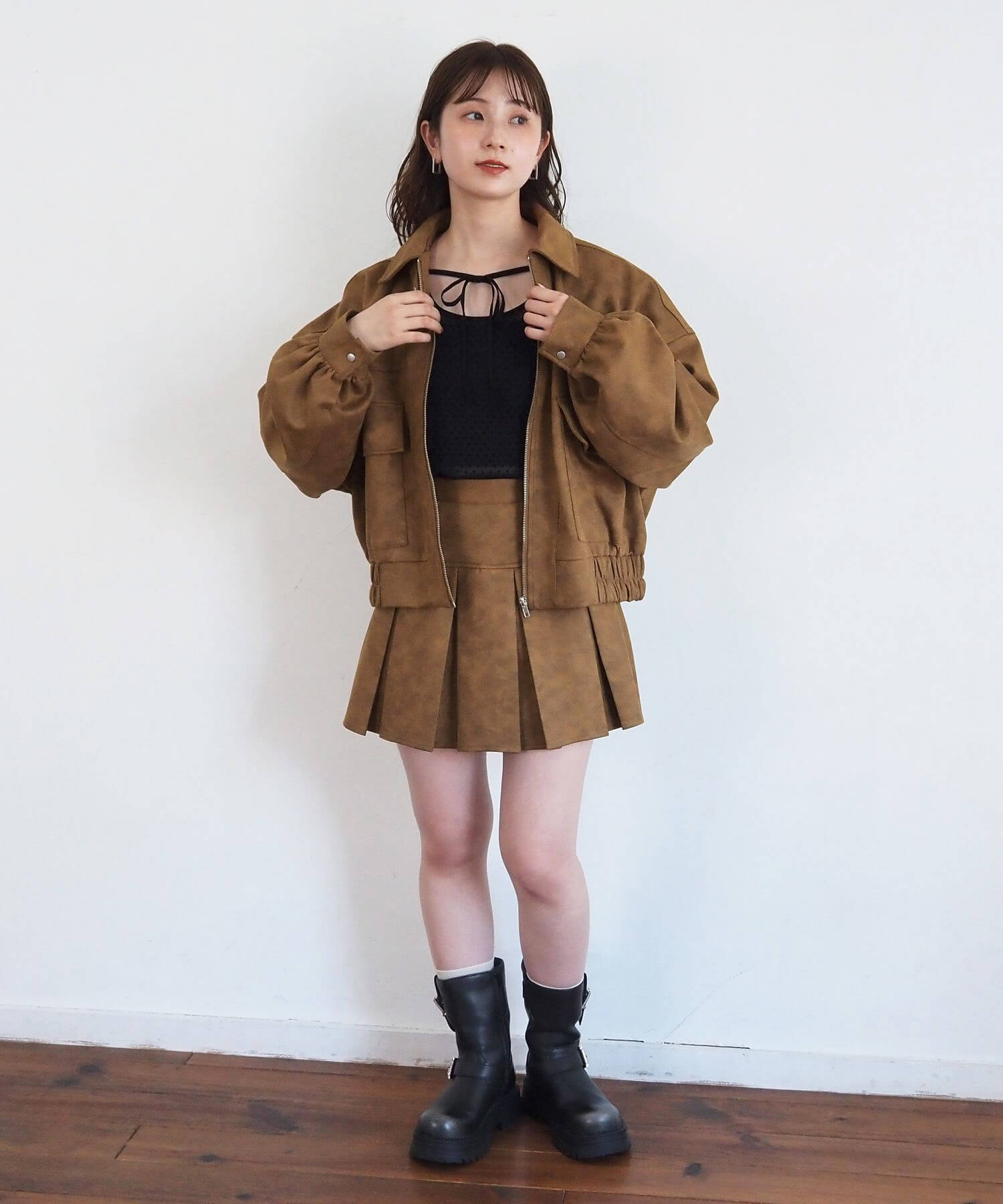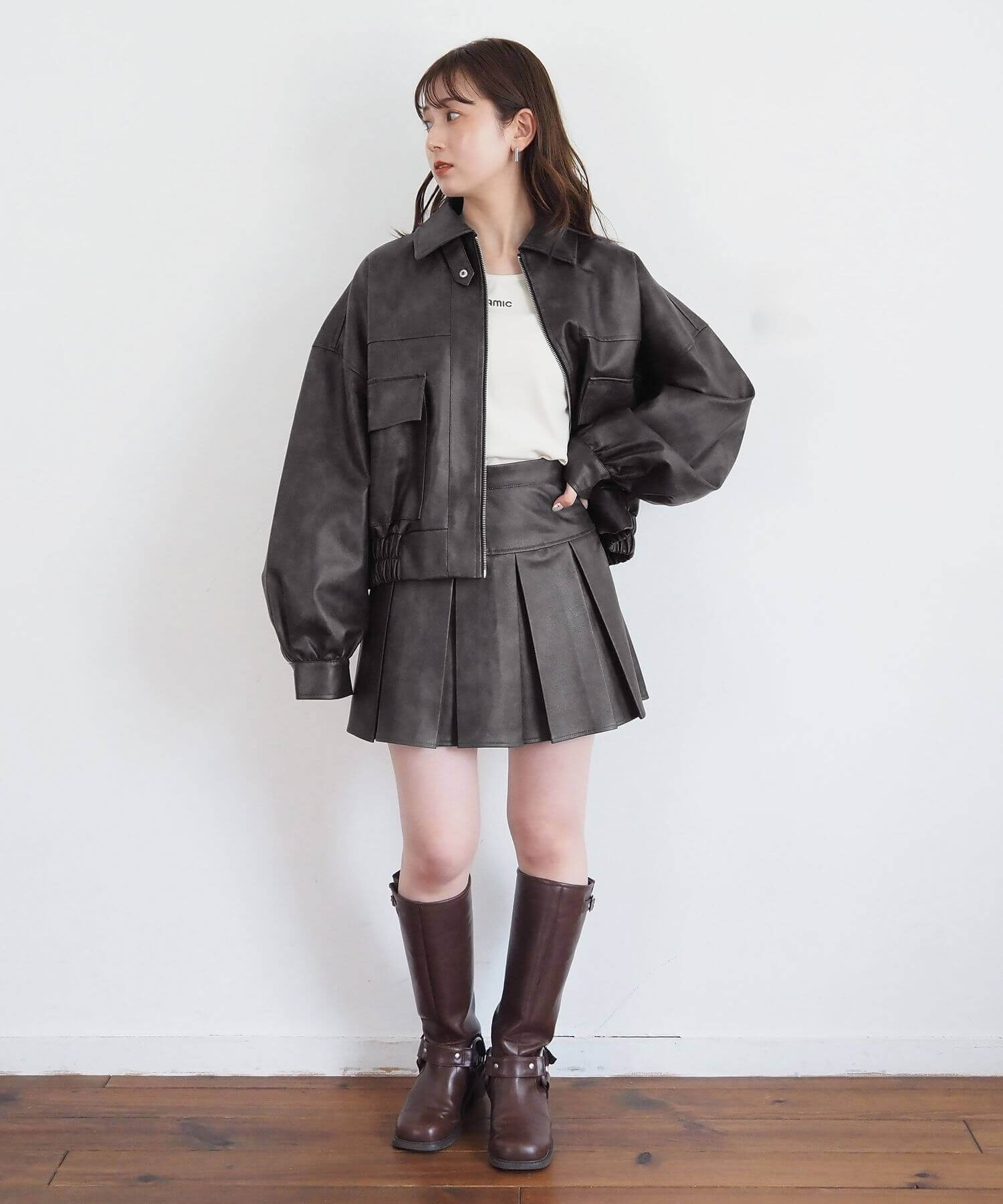 ・同生地のビッグショート合皮ブルゾン(品番:1760246493)と人気のセットアップコーデに。ブルゾンは丈違いで色違いを揃えるのもおすすめです。