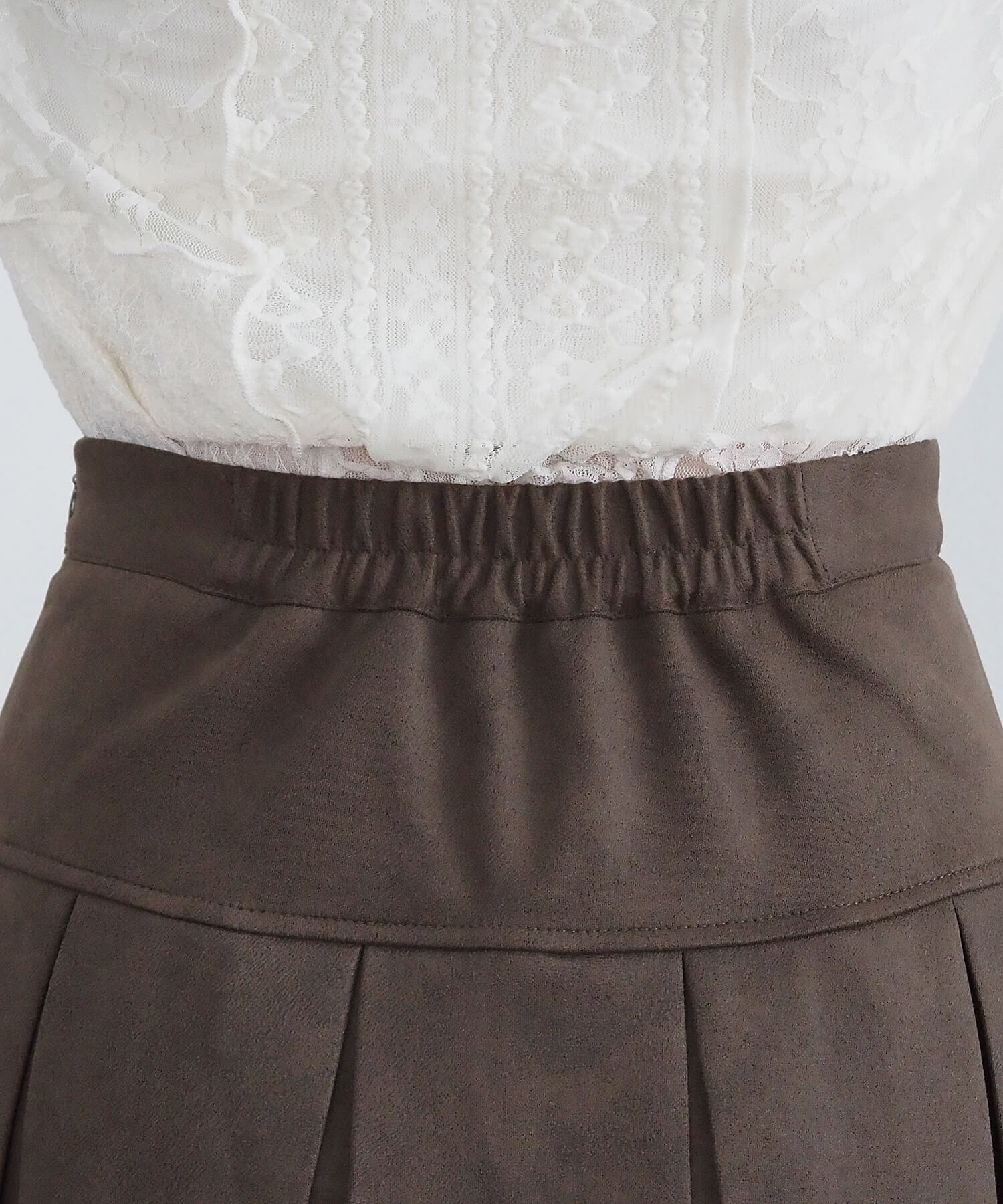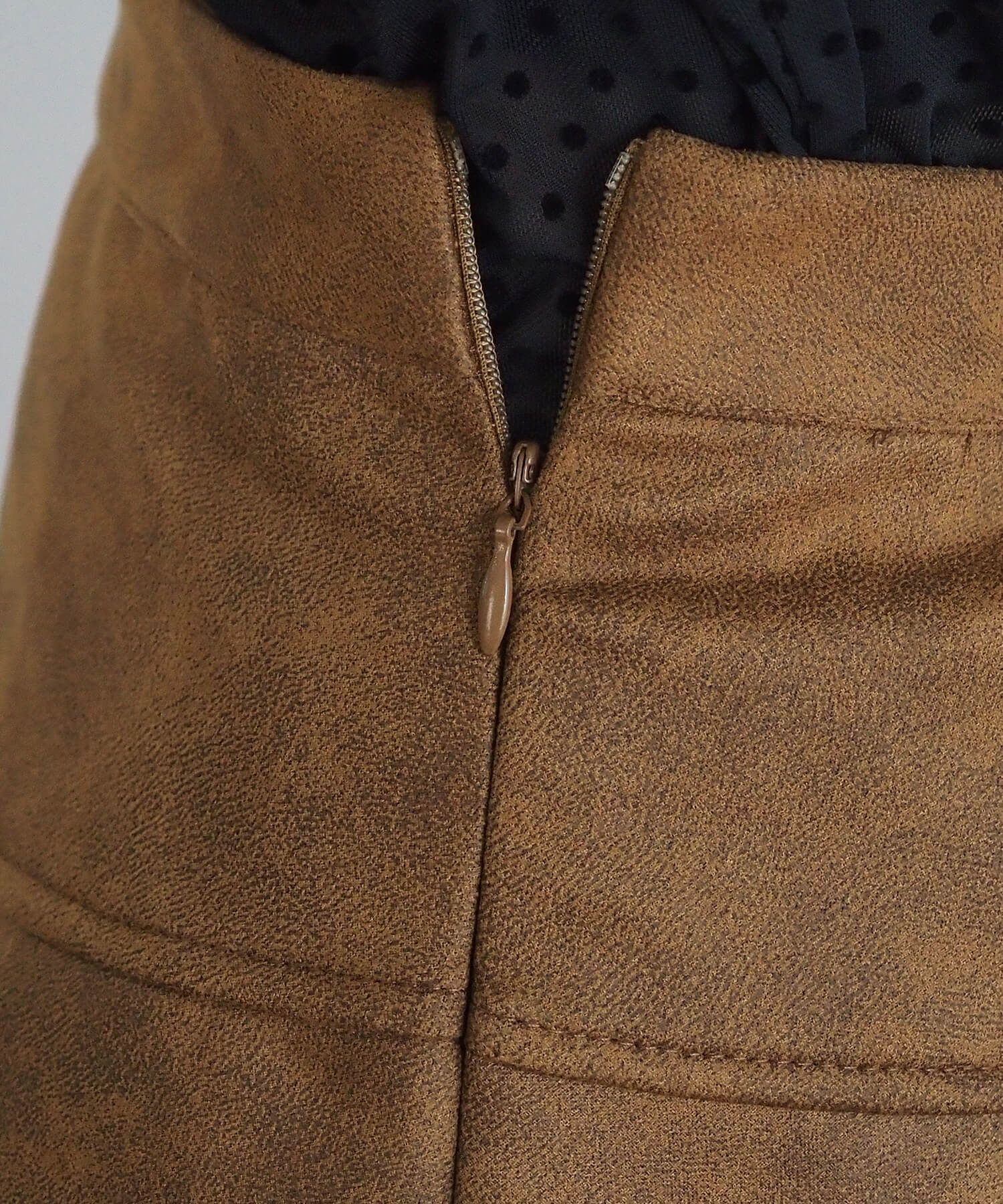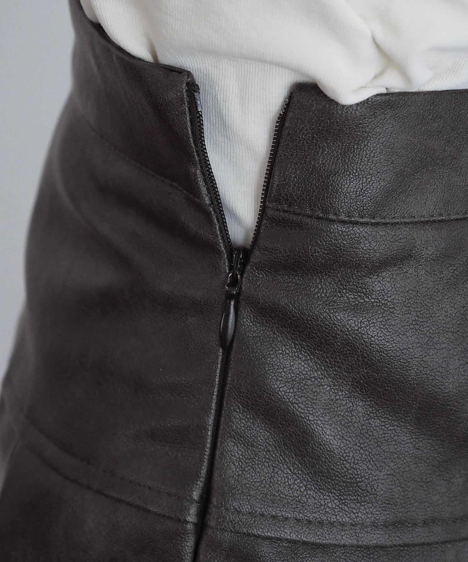 ・フィット感をアップさせるウェストゴム、デザインを邪魔しないコンシールファスナーでストレスフリーな履き心地です。