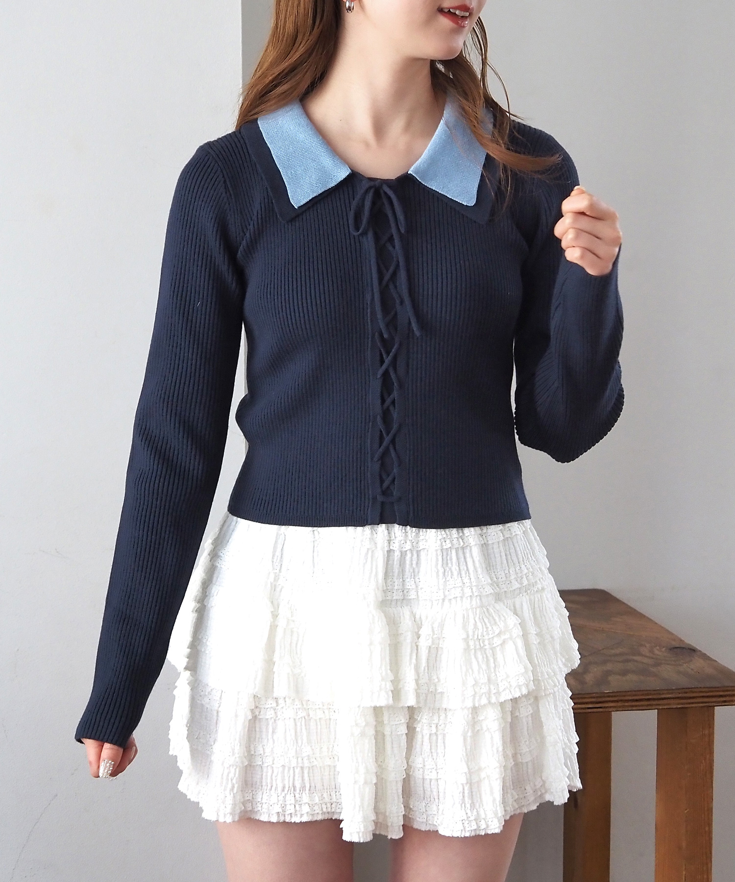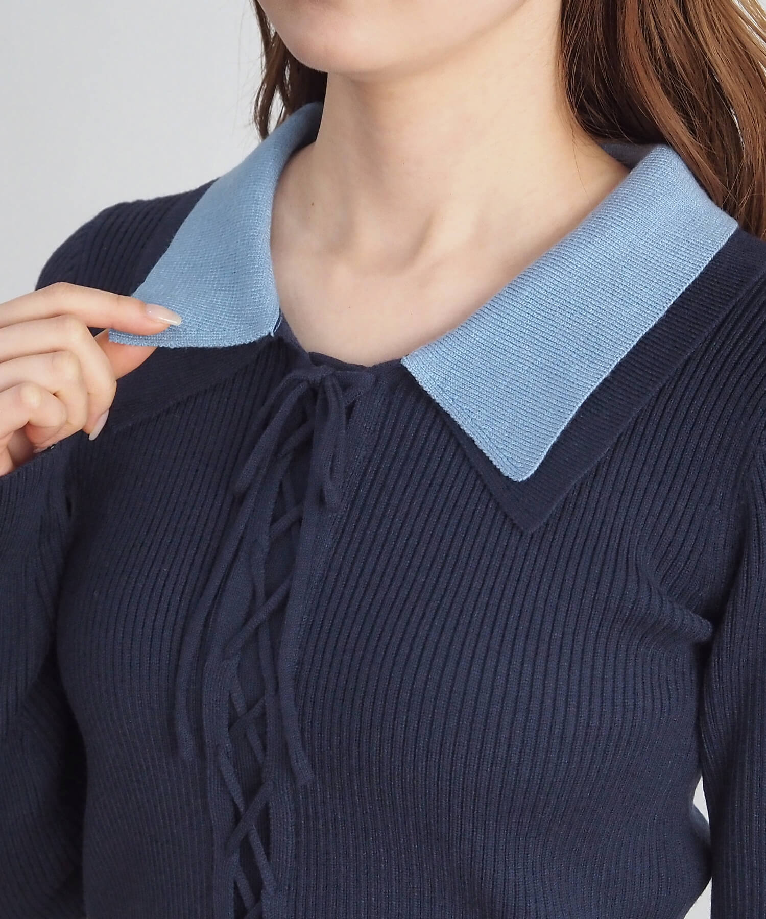[新色登場] 前レースアップ襟付きニットプルオーバー