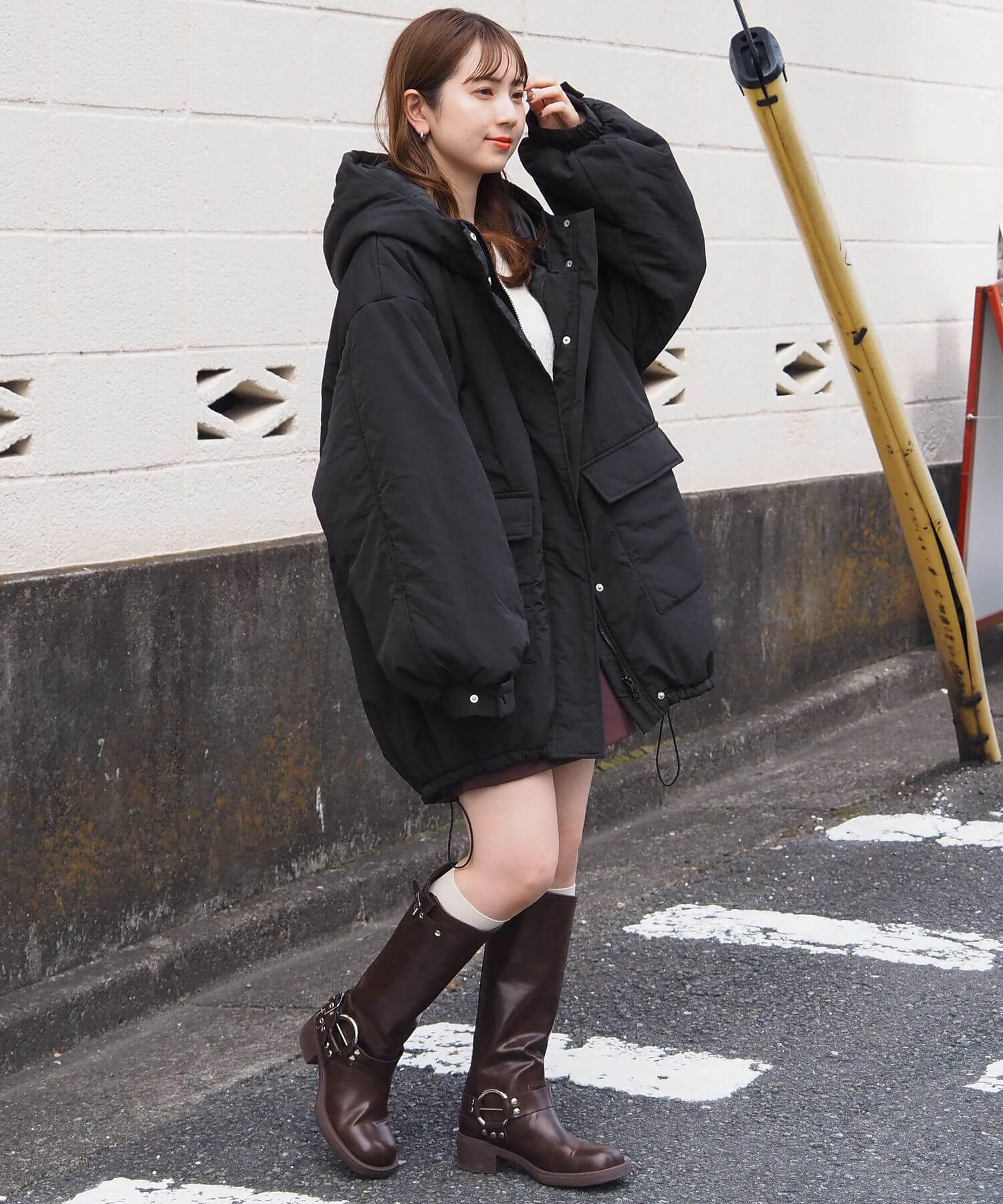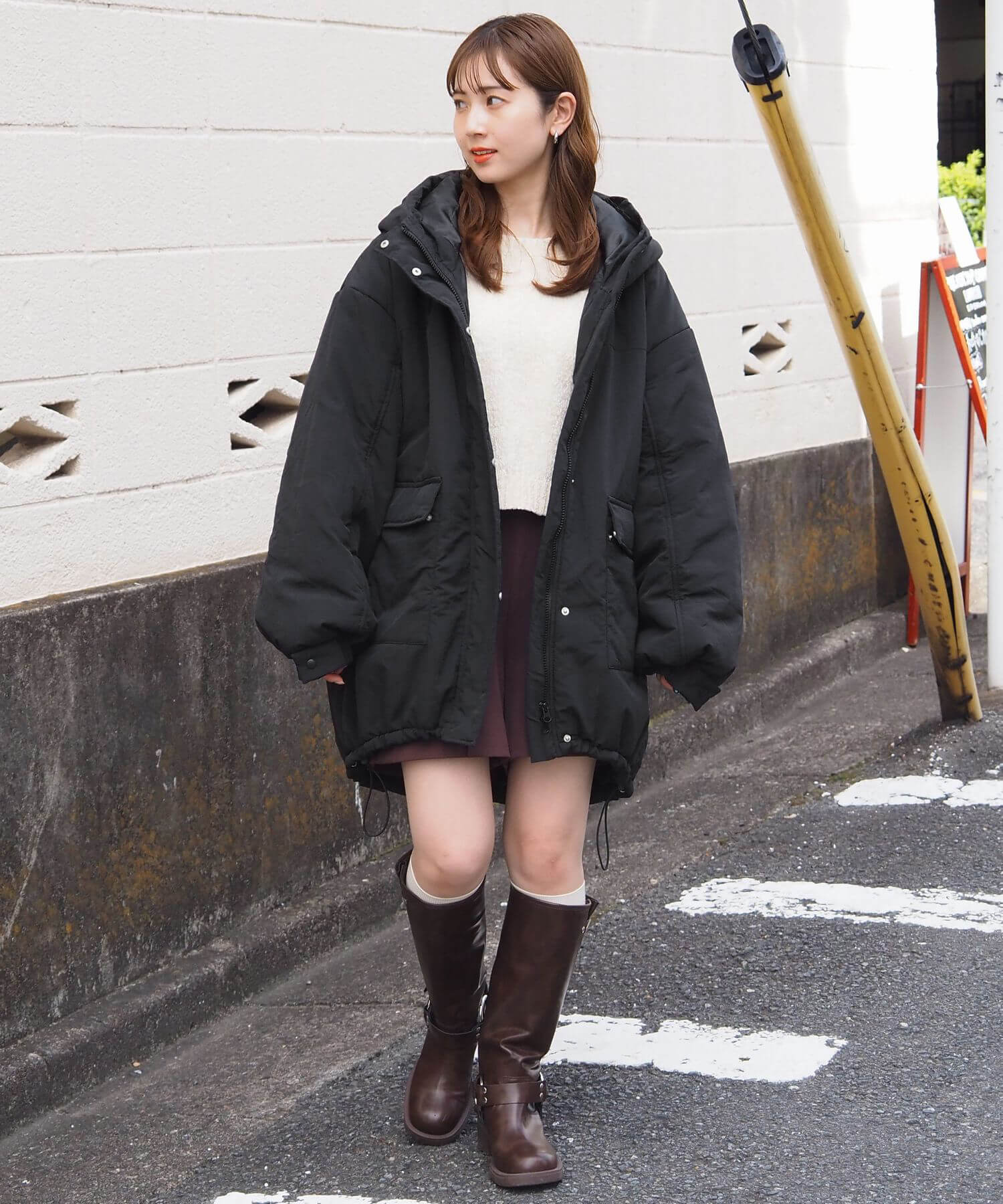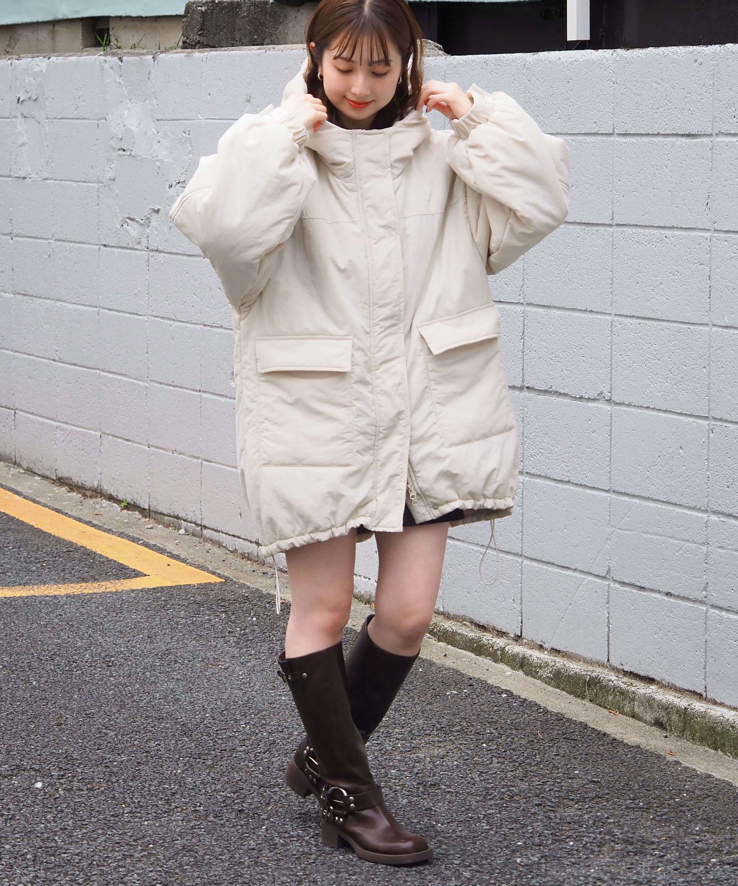 ・ミニボトム×ボリュームブーツでトレンドライクに。ブルゾンのたっぷりボリュームにコンパクトな着こなしが気映えする、おすすめのスタイリングです。足元はボリュームのあるシューズでバランスをとるのが◎