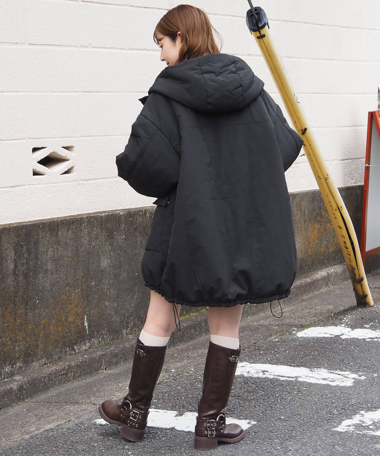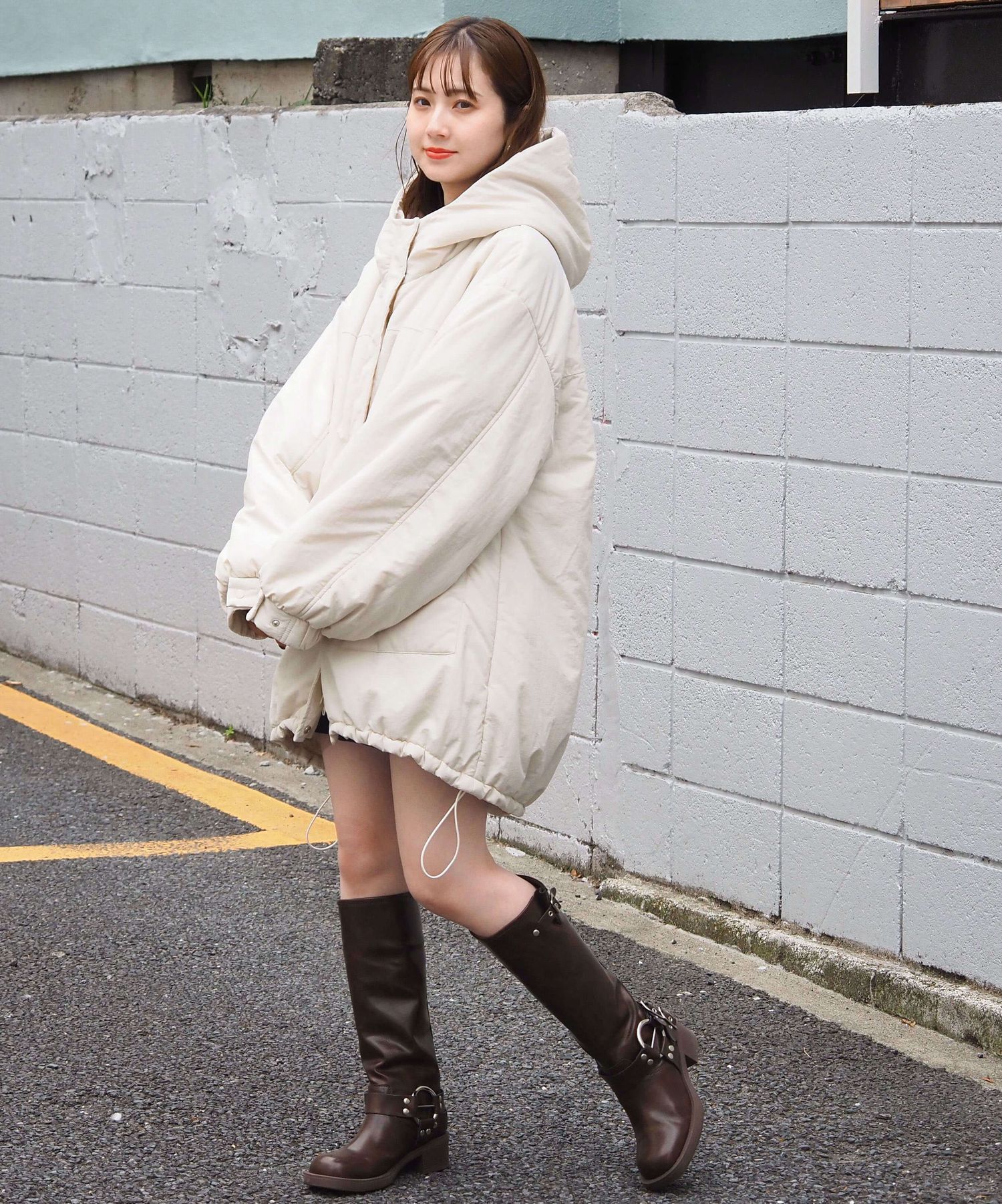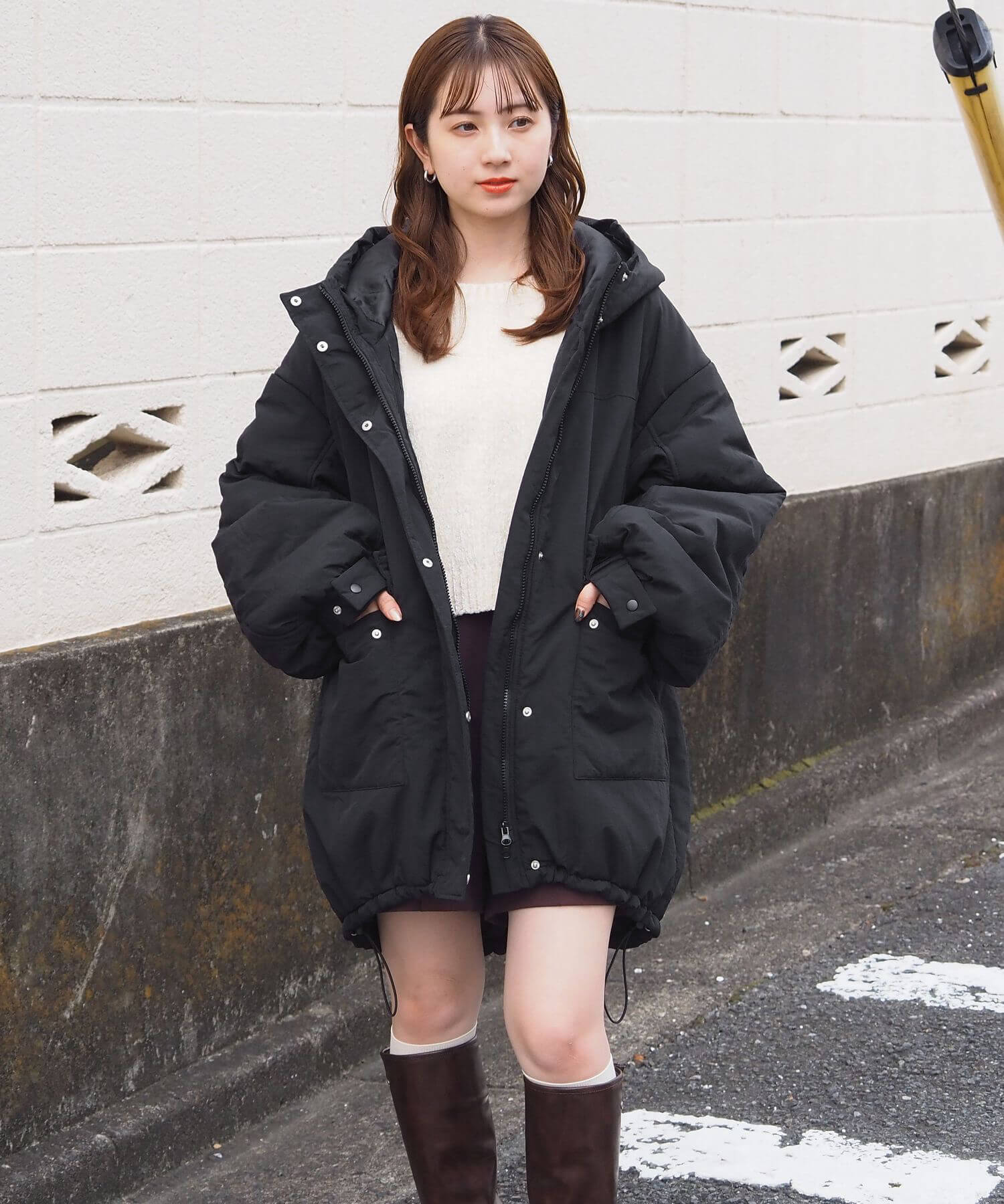 ・ミニボトム×ボリュームブーツでトレンドライクに。ブルゾンのたっぷりボリュームにコンパクトな着こなしが気映えする、おすすめのスタイリングです。足元はボリュームのあるシューズでバランスをとるのが◎