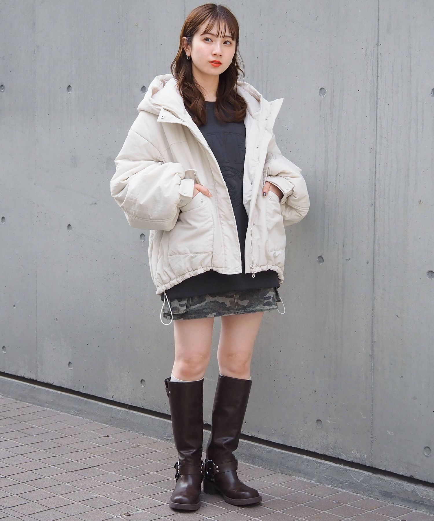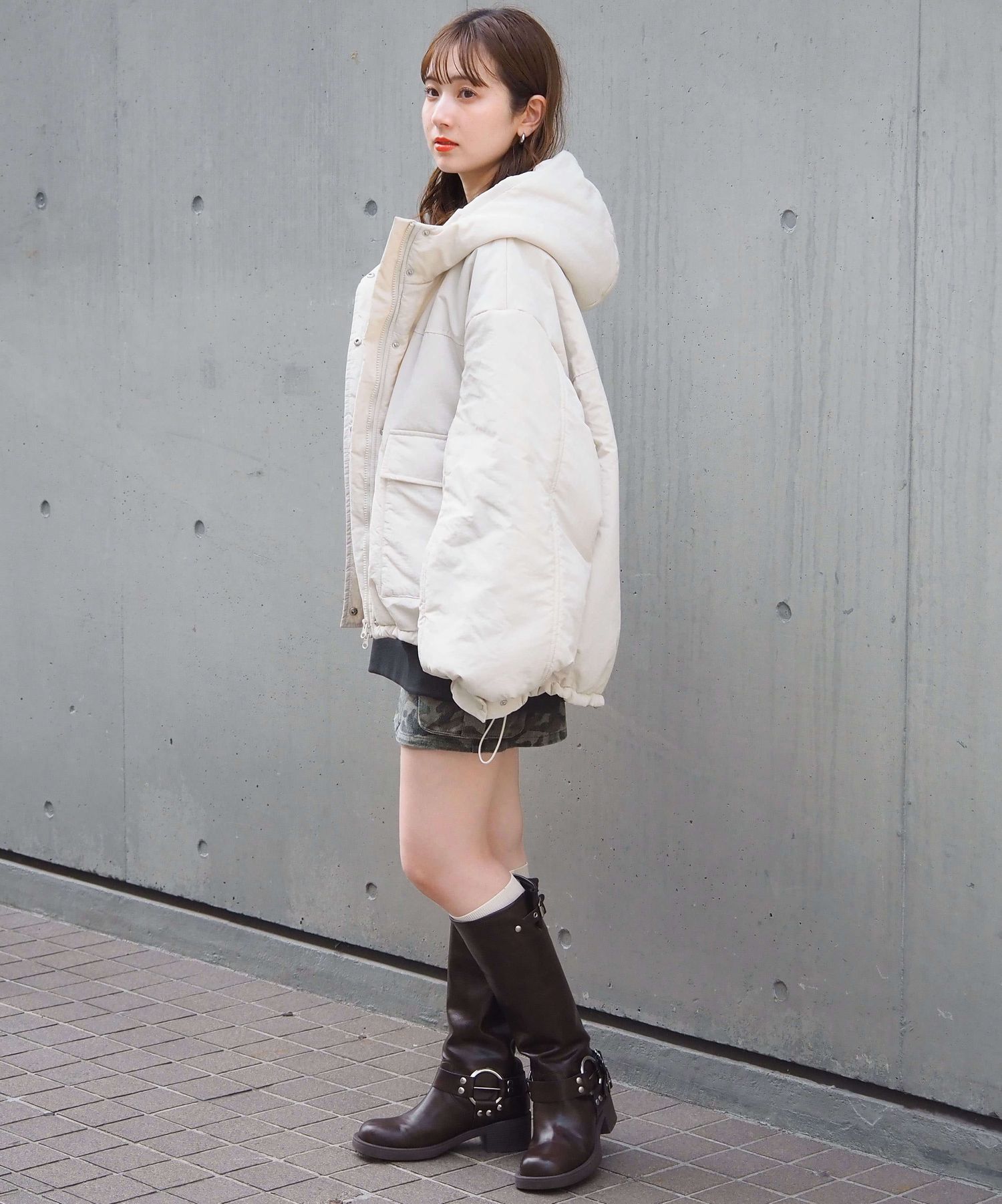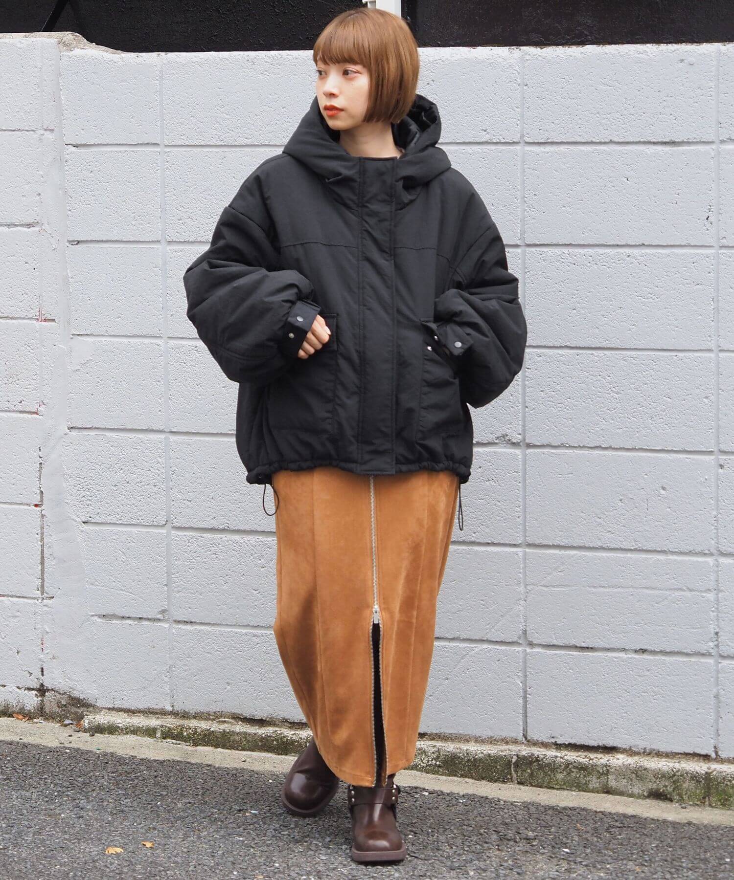 ・ミニボトム×ボリュームブーツでトレンドライクに。ブルゾンのたっぷりボリュームにコンパクトな着こなしが気映えする、おすすめのスタイリングです。足元はボリュームのあるシューズでバランスをとるのが◎