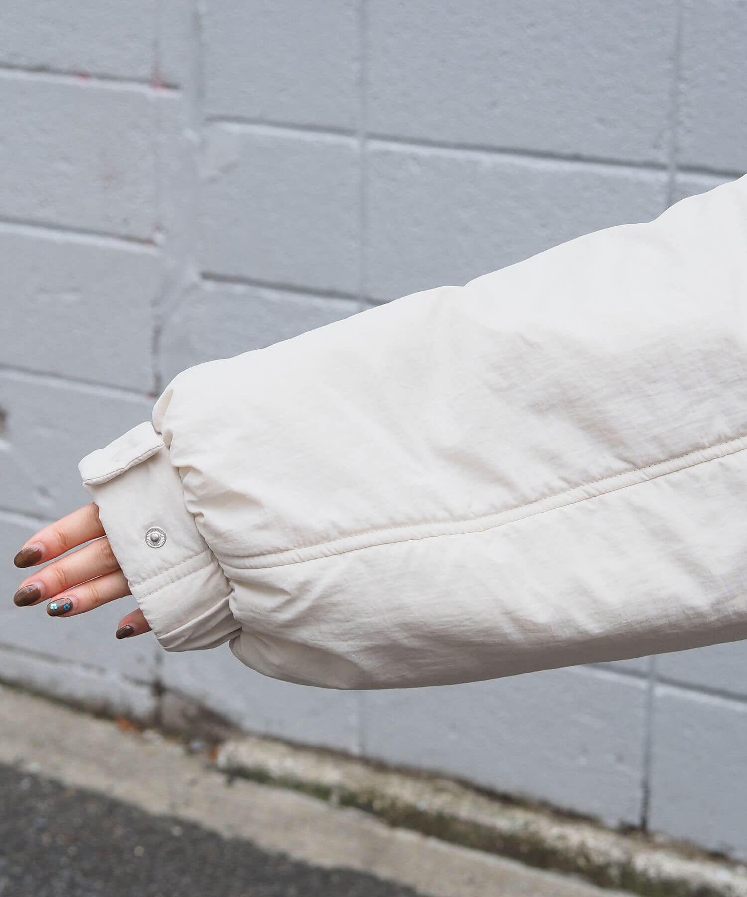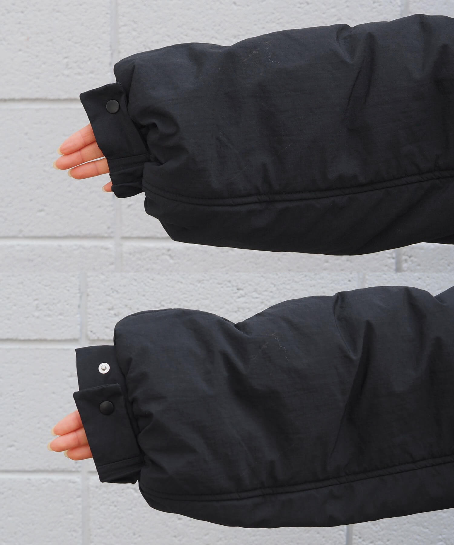 ・ボリュームを楽しめるやや長めの袖も、袖口の広さをボタンで2段階に調整可能です(着用画像はすべて大きい方で着用。ブラックで袖の比較画像あり)。