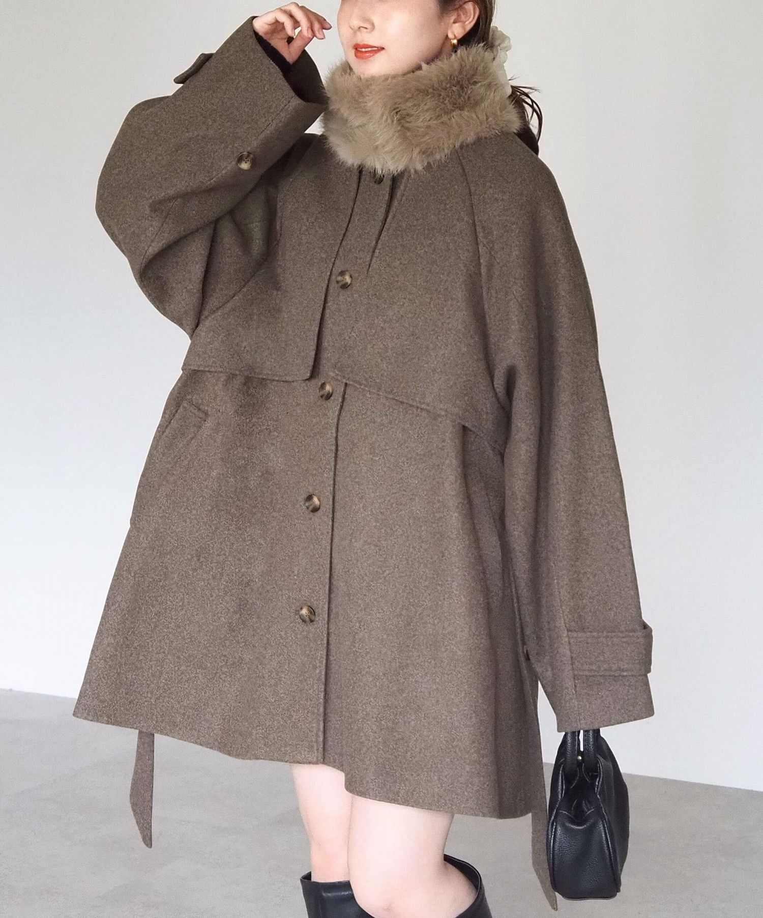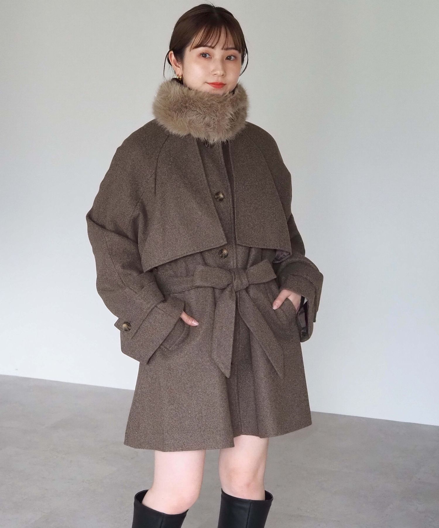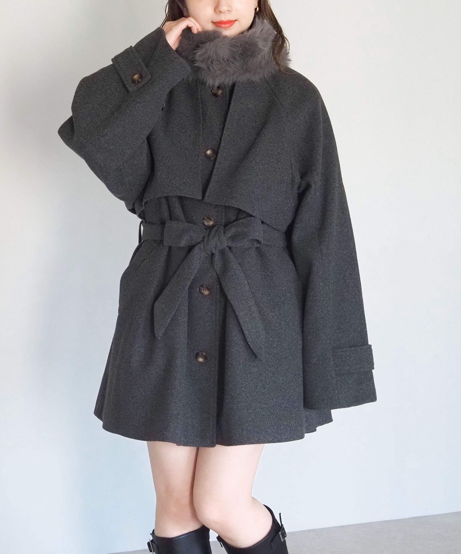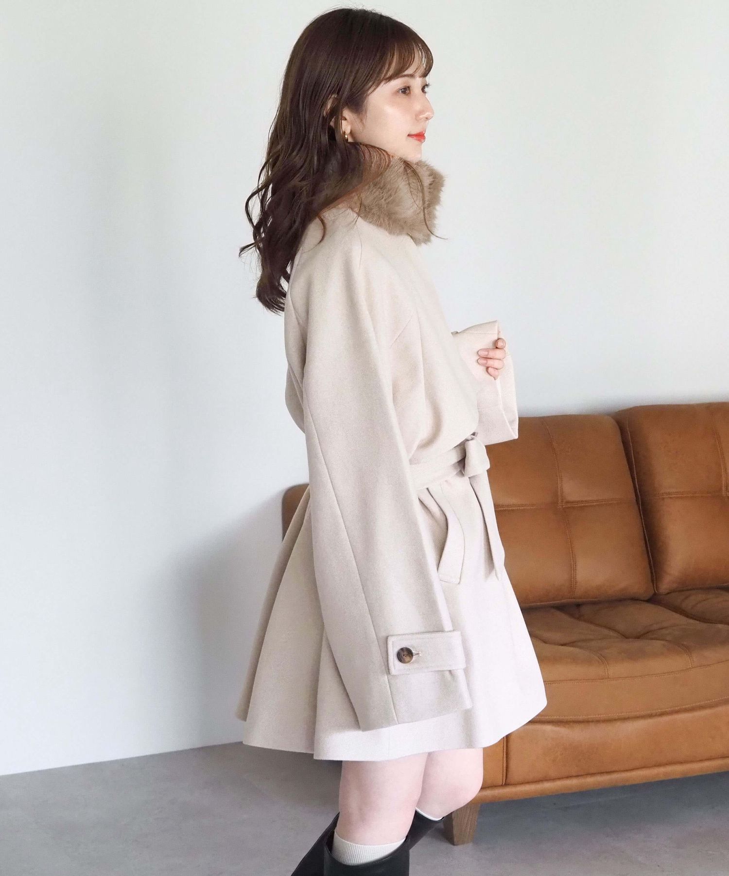 ・人気の「ミドル丈トレンチコート(品番:1360008076)」をベースに、ふわふわのファーティペットでさらに華やかで暖かくなりました♪