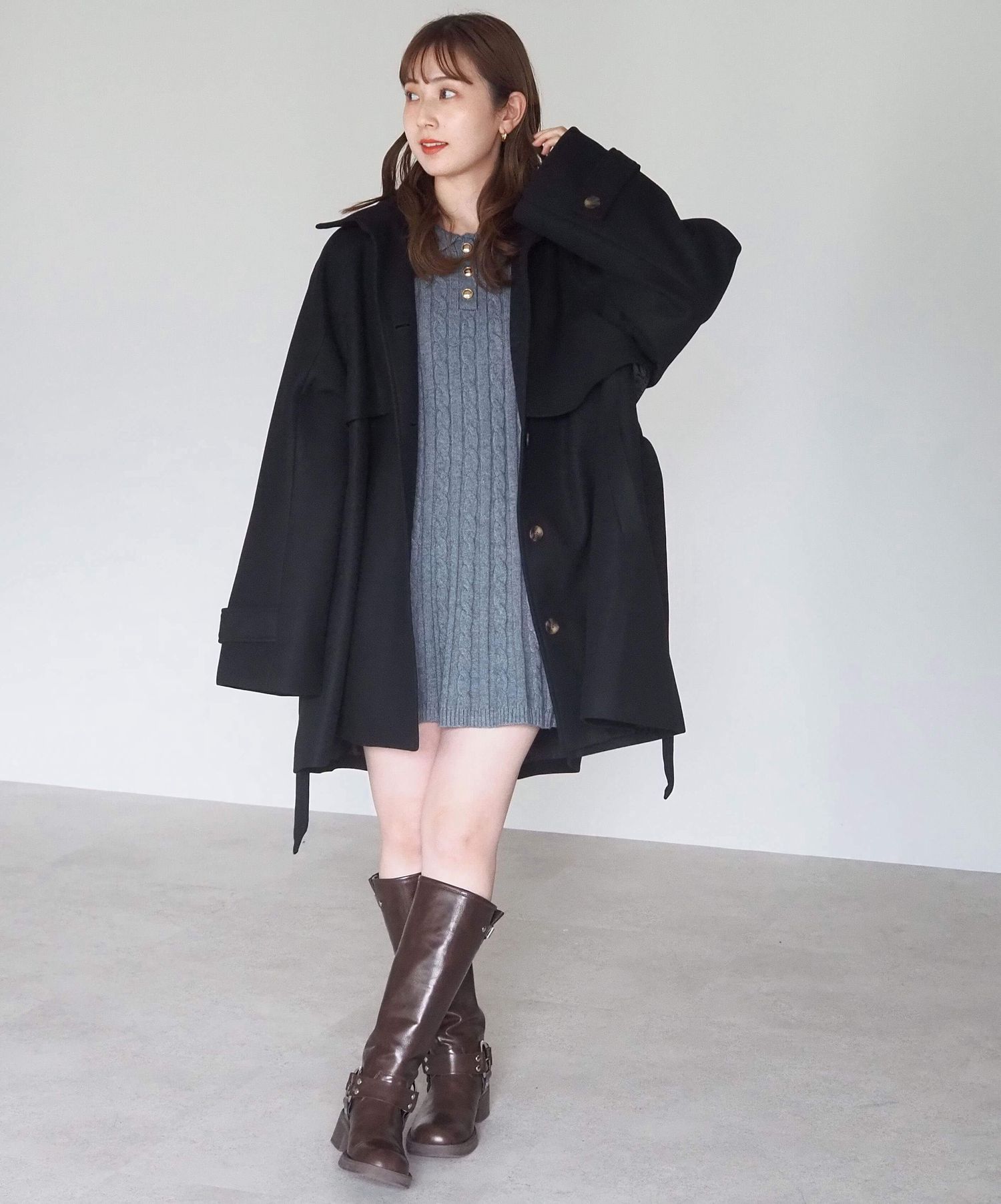 ・付属のベルトでウェストマーク。程よく広がる裾がかわいいミニワンピース風の着こなしです。