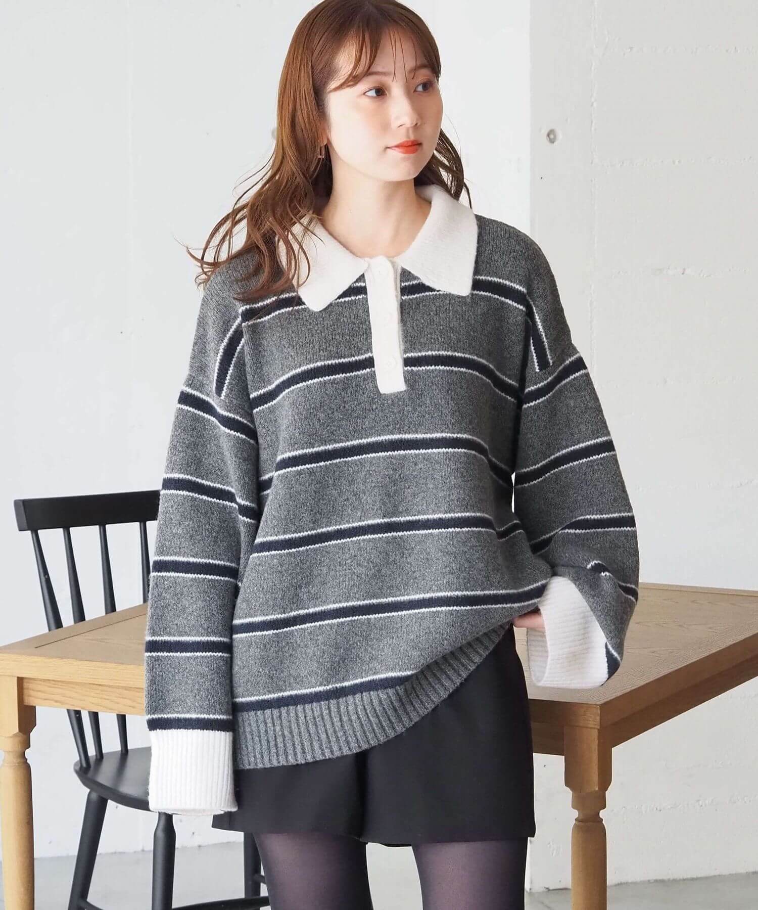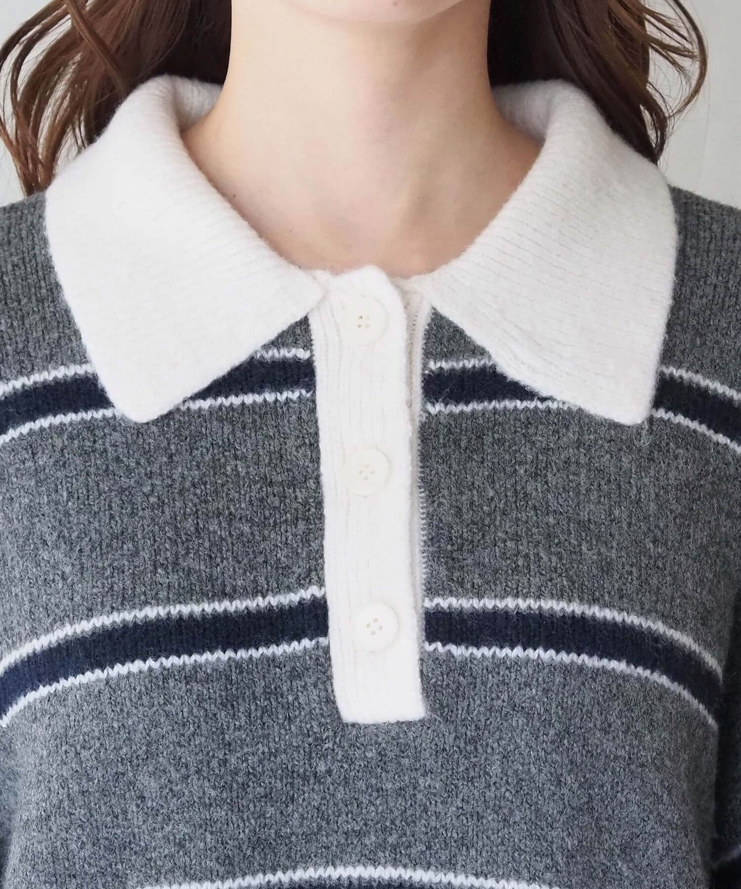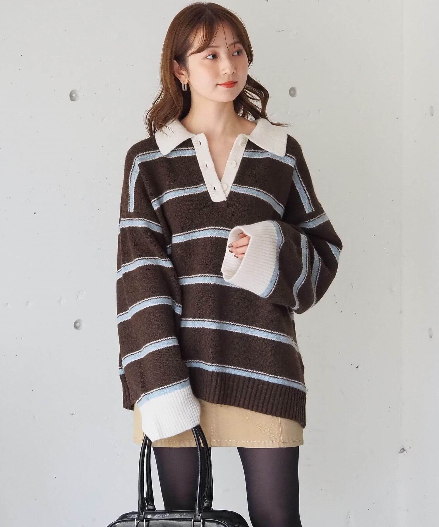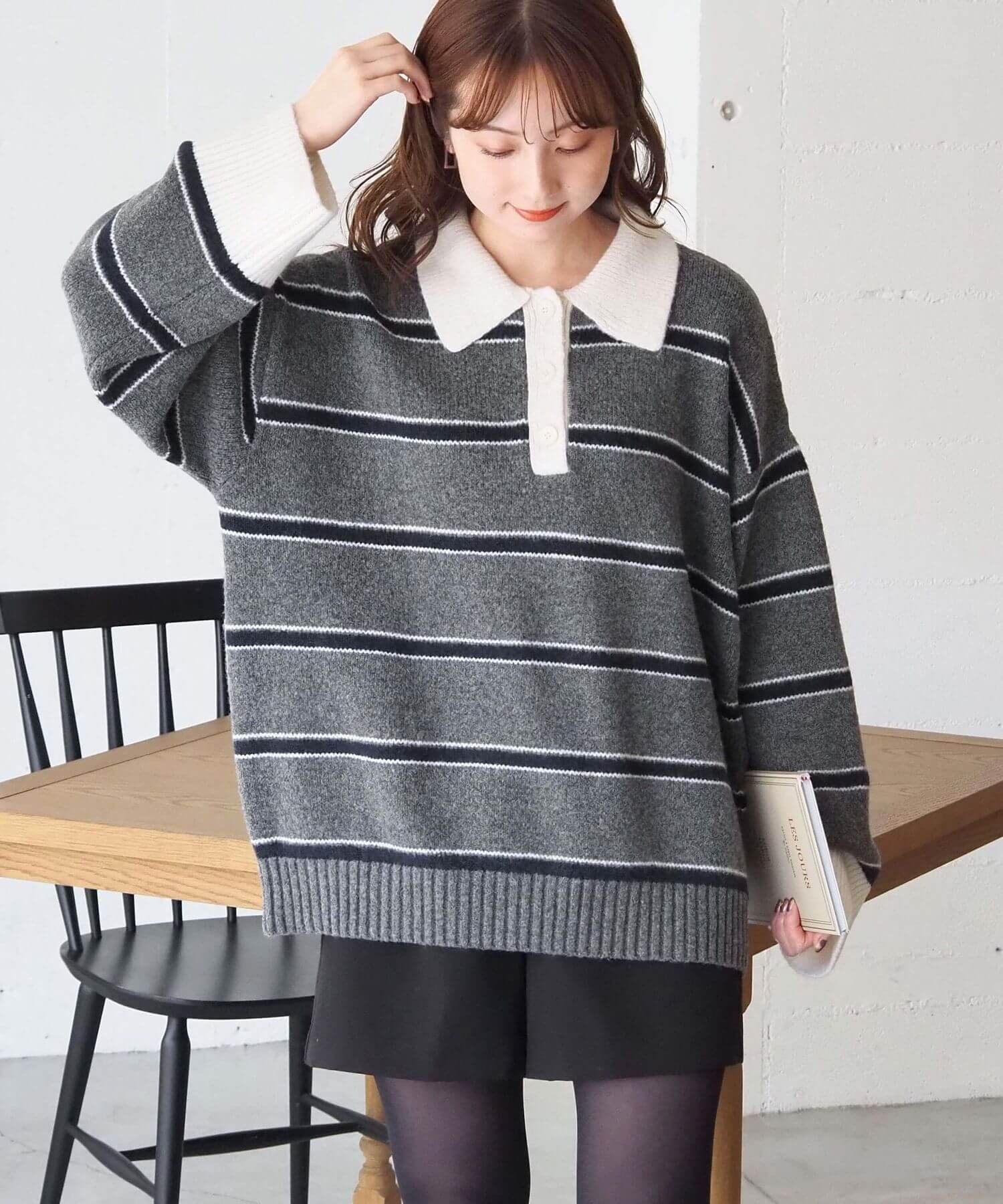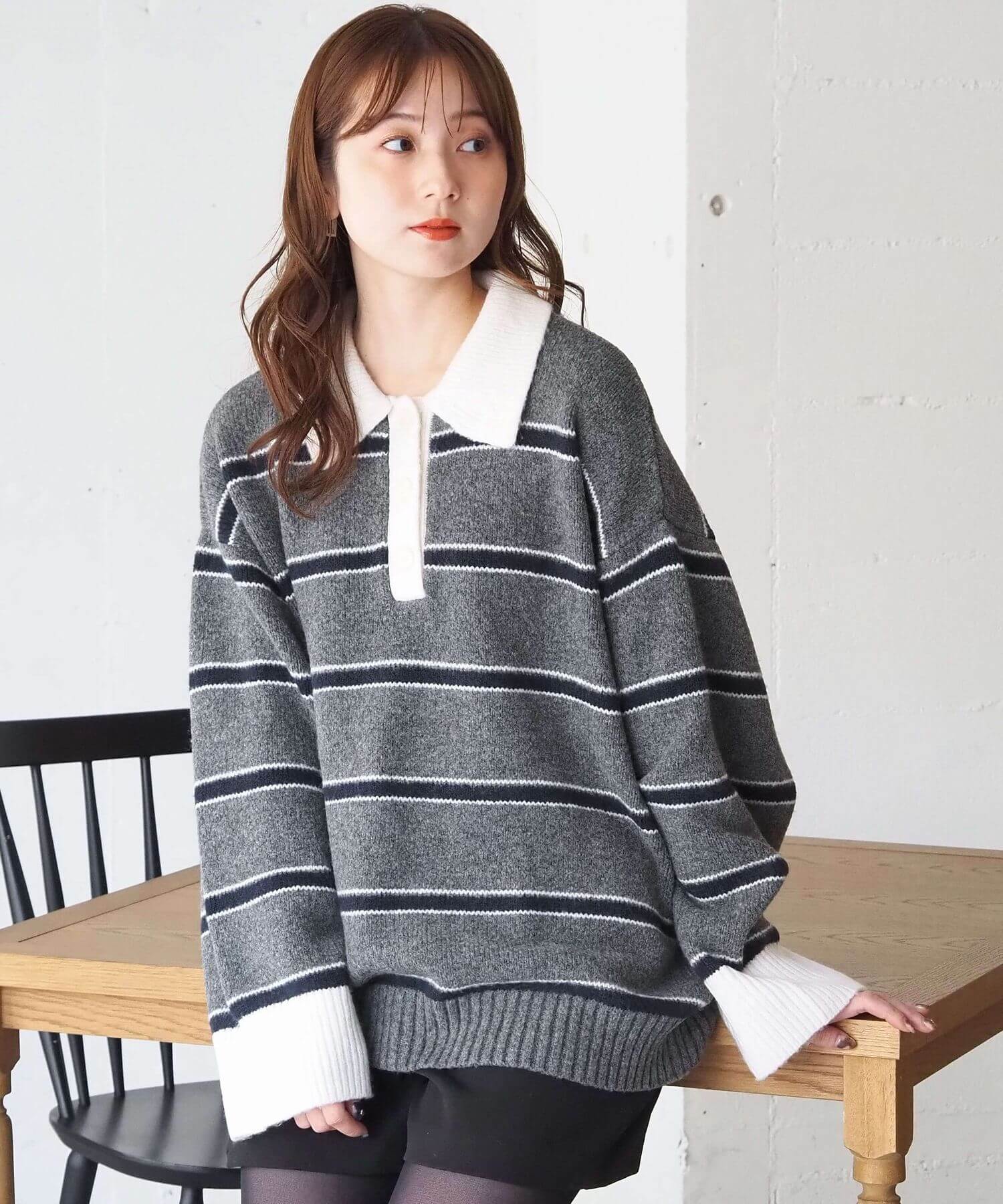 ・スポーティーなラガーシャツデザインに、やや起毛感のあるもちもちニットで女性らしさをプラスし、上品に着られる1着に仕上げました。