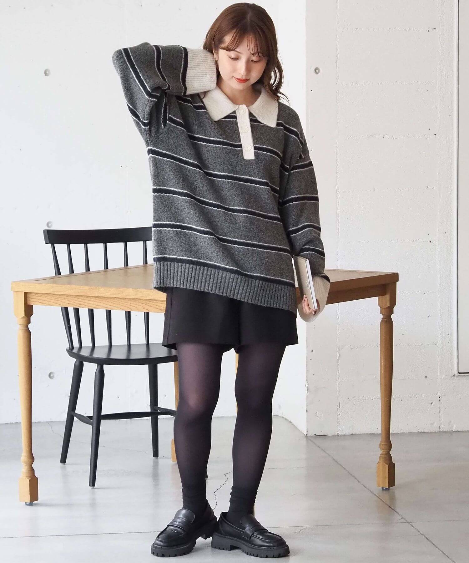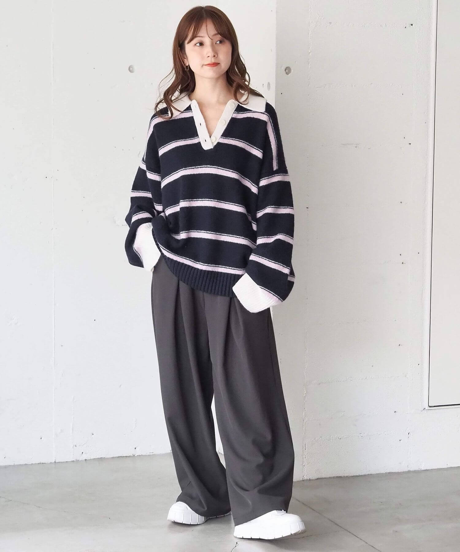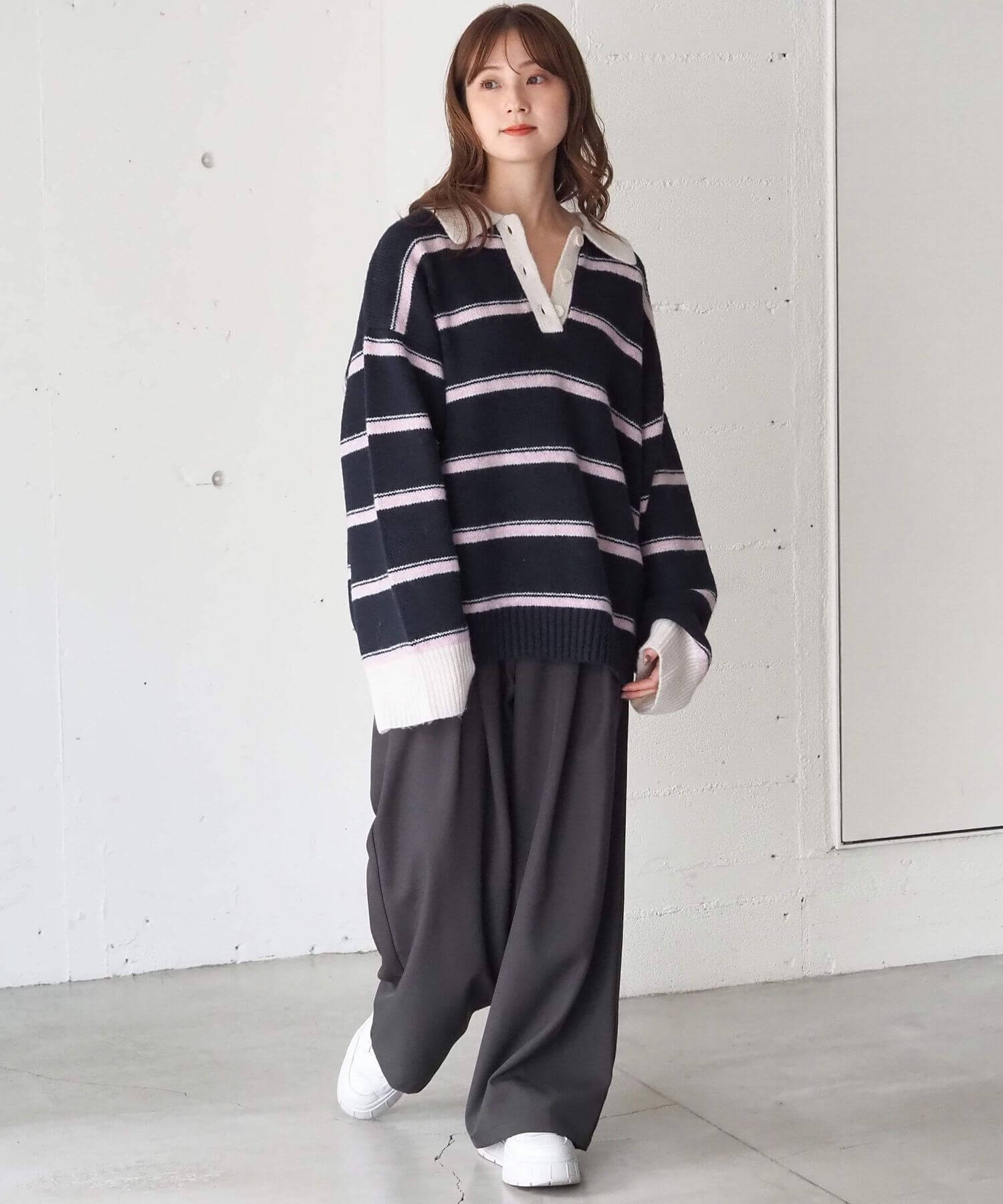 ・ルーズに見えないポロ襟ニットなので、カーブパンツやイージーパンツなど、ワイドシルエットのボトムとも好相性です。