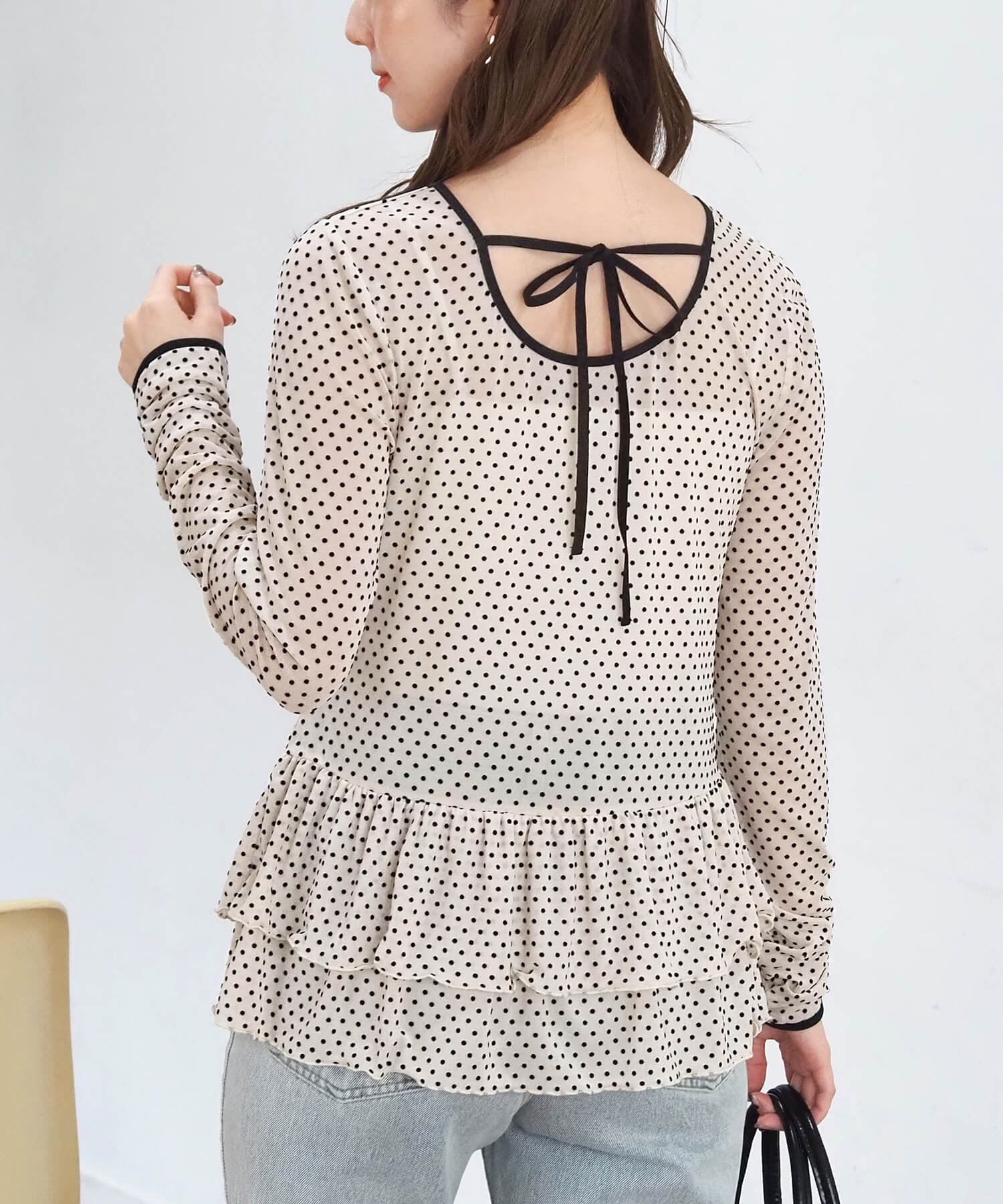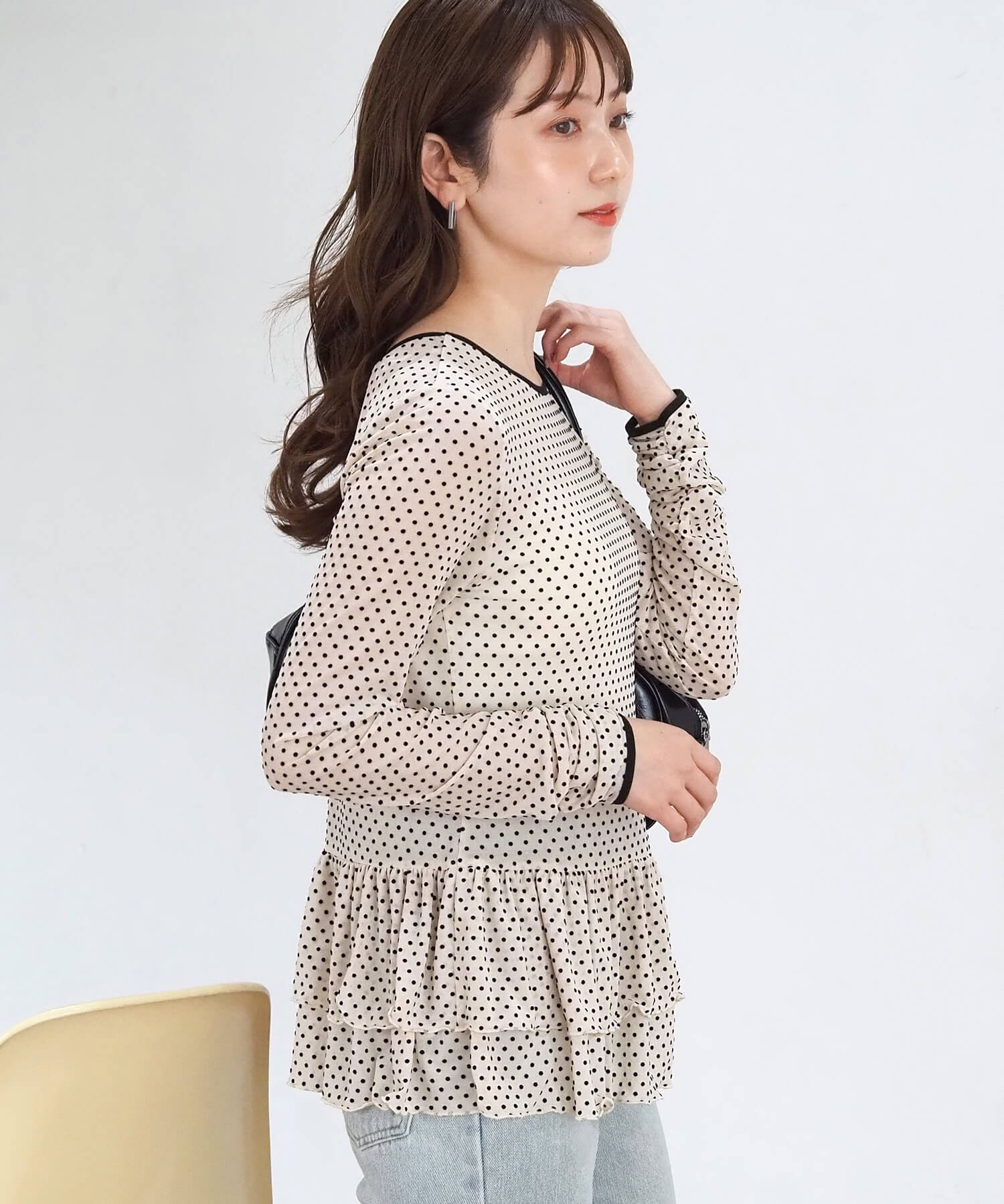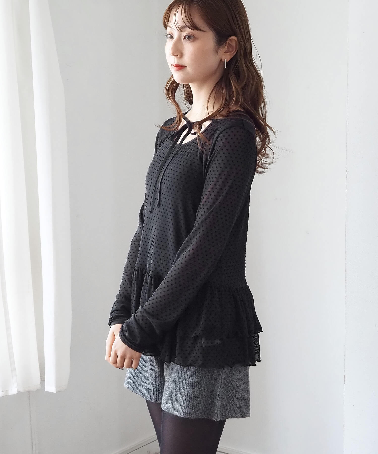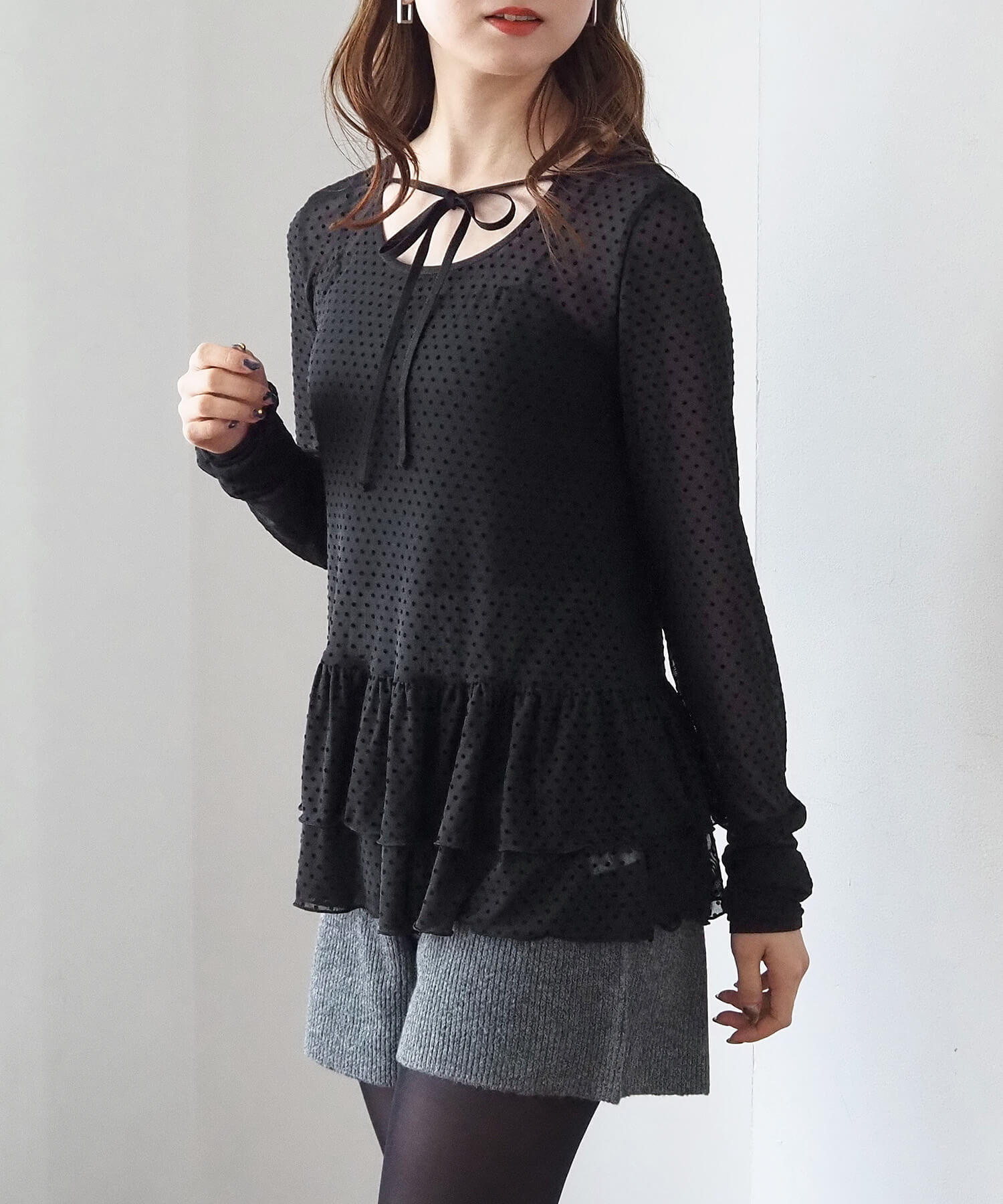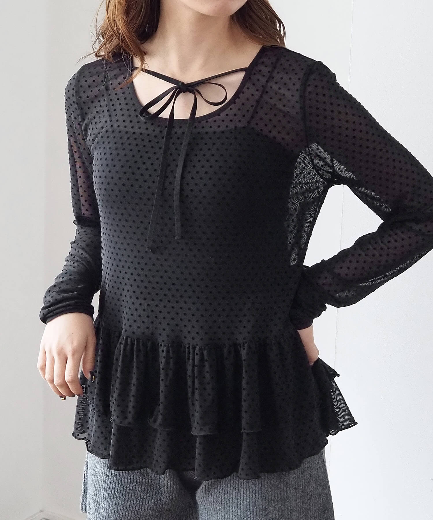 ・大人可愛いドット柄と、上品な無地の2タイプ。どちらも程よいシアー感で軽さのあるアイテムです。