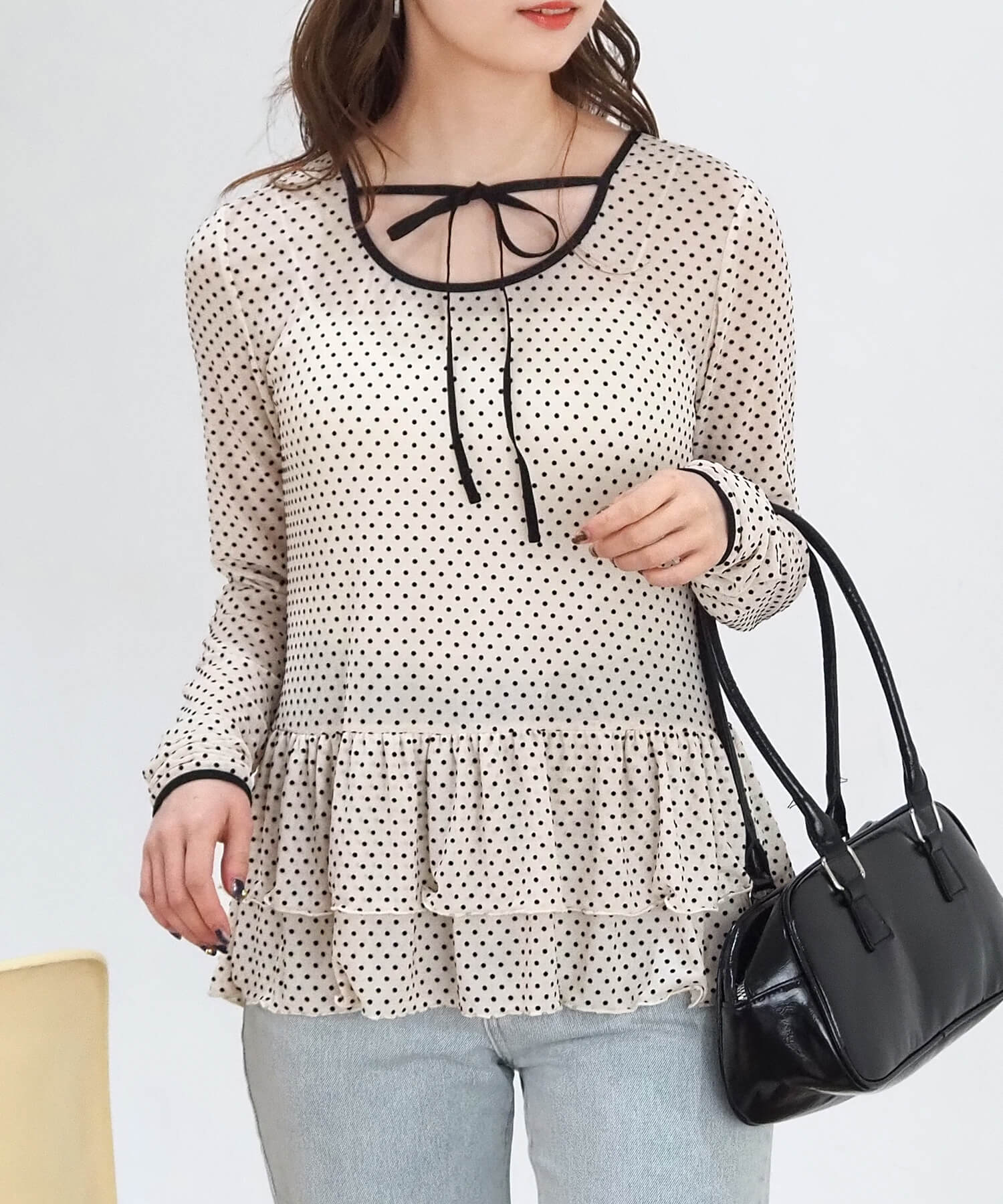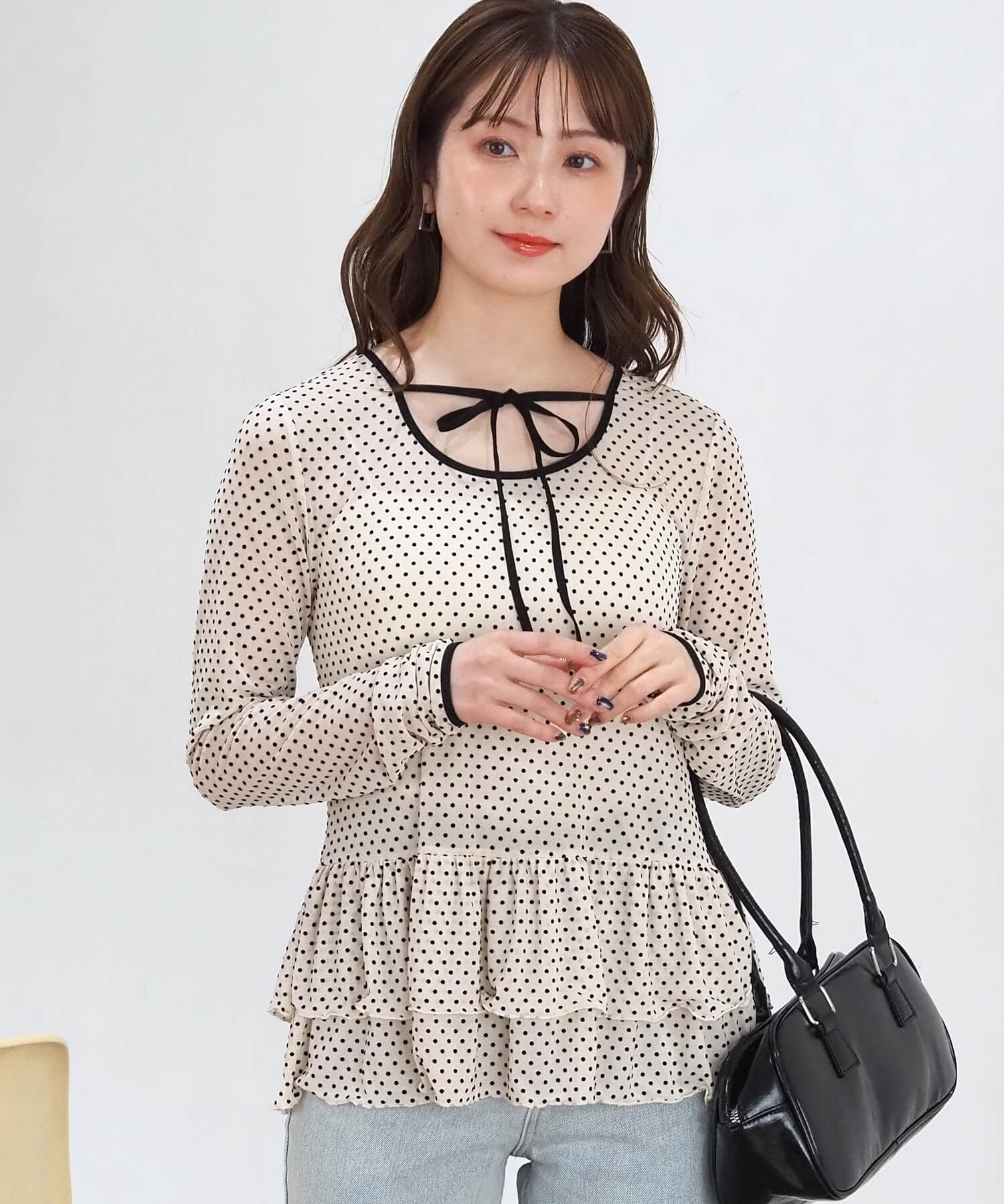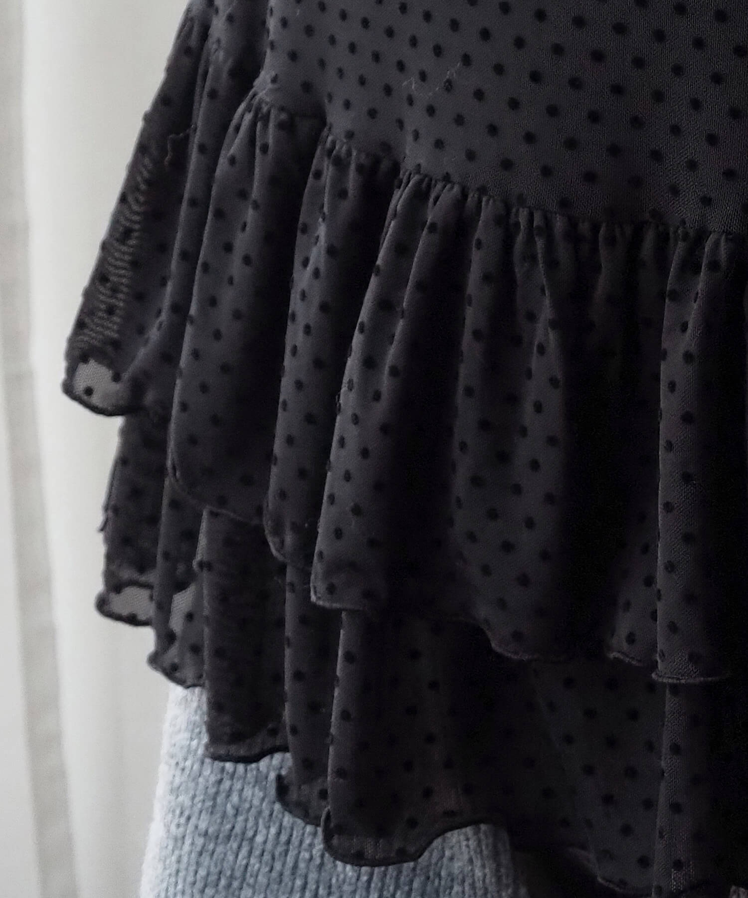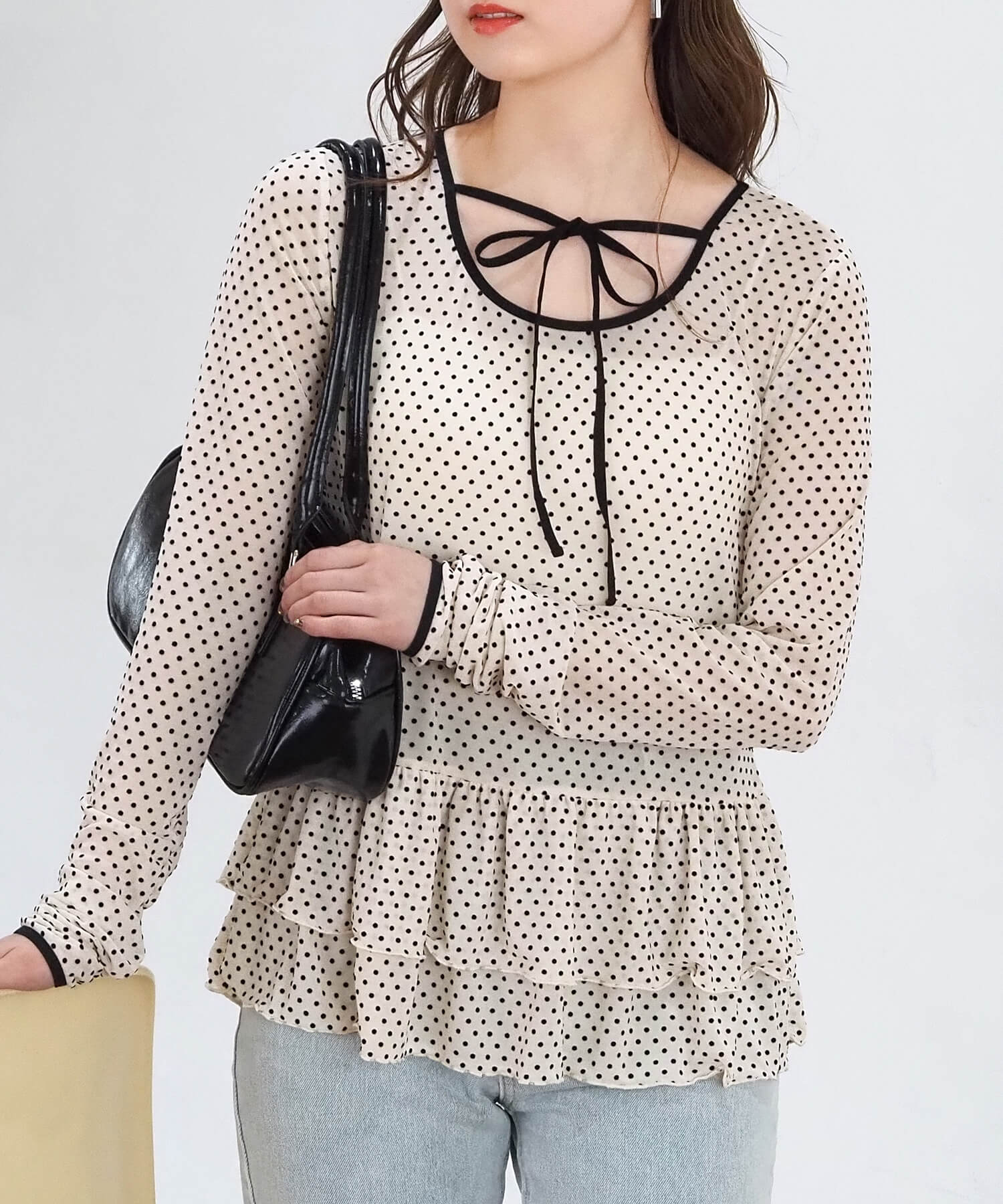 ・大人可愛いドット柄と、上品な無地の2タイプ。どちらも程よいシアー感で軽さのあるアイテムです。