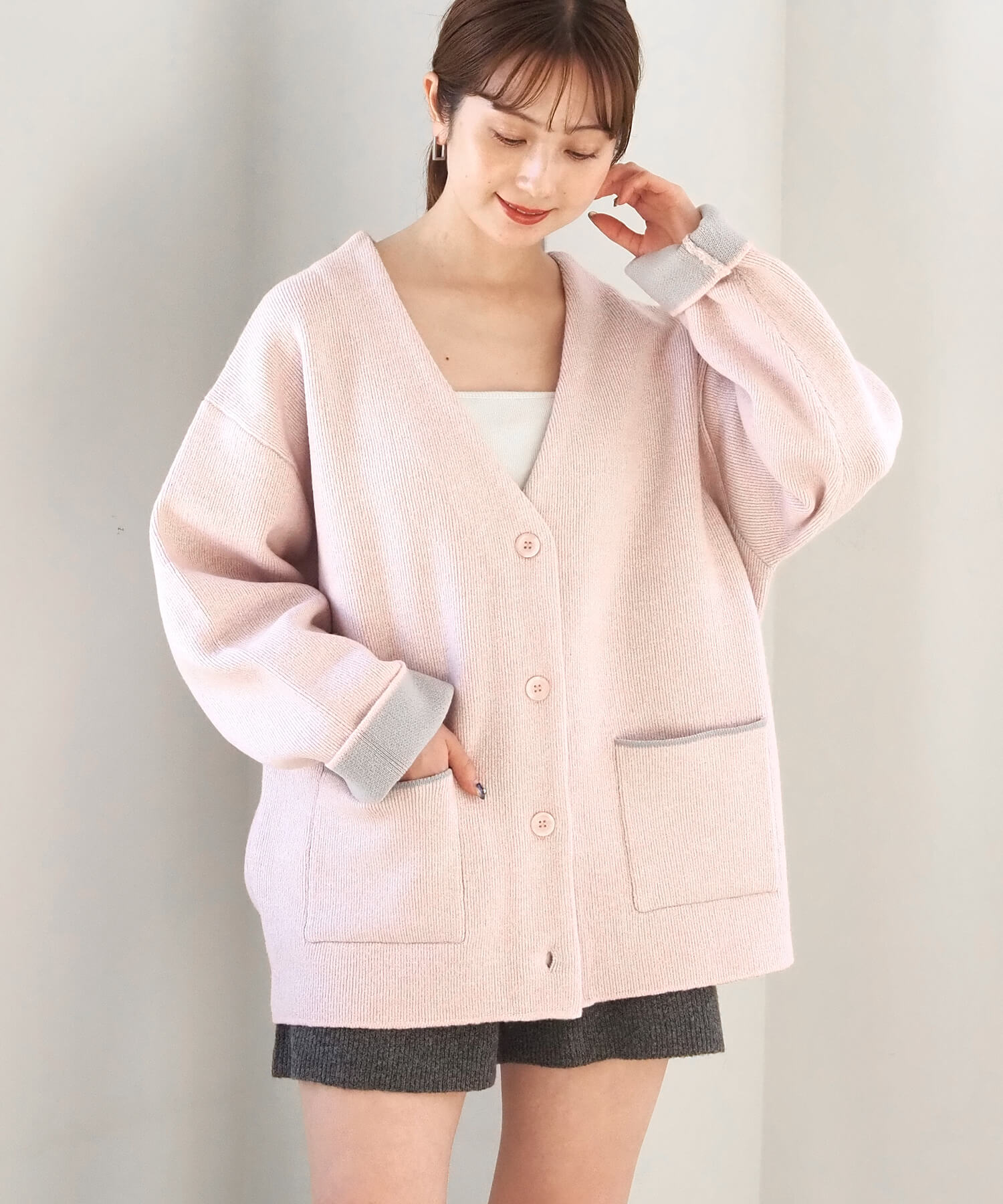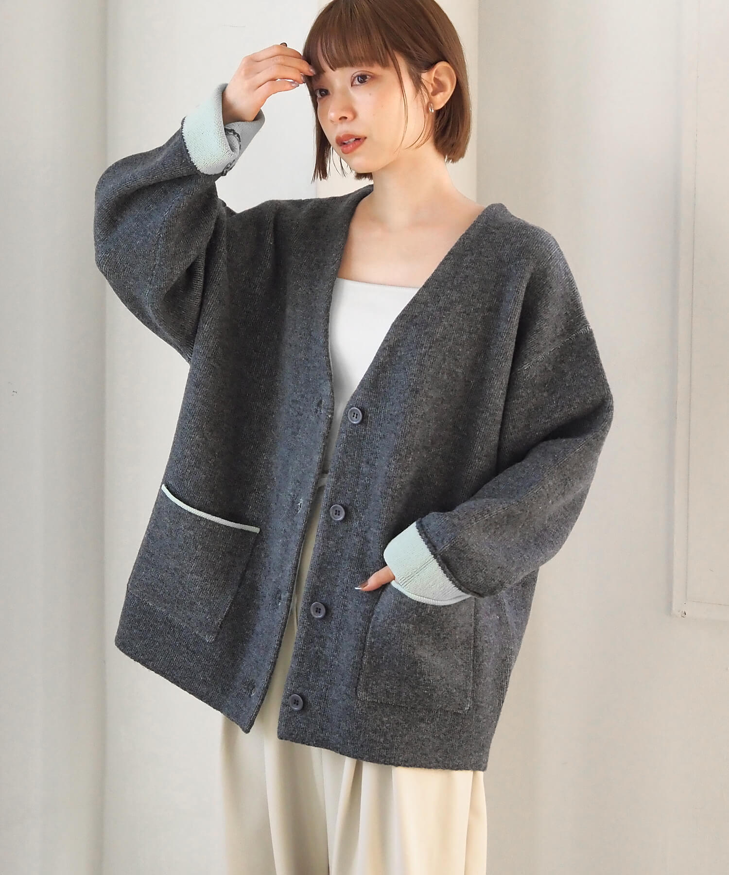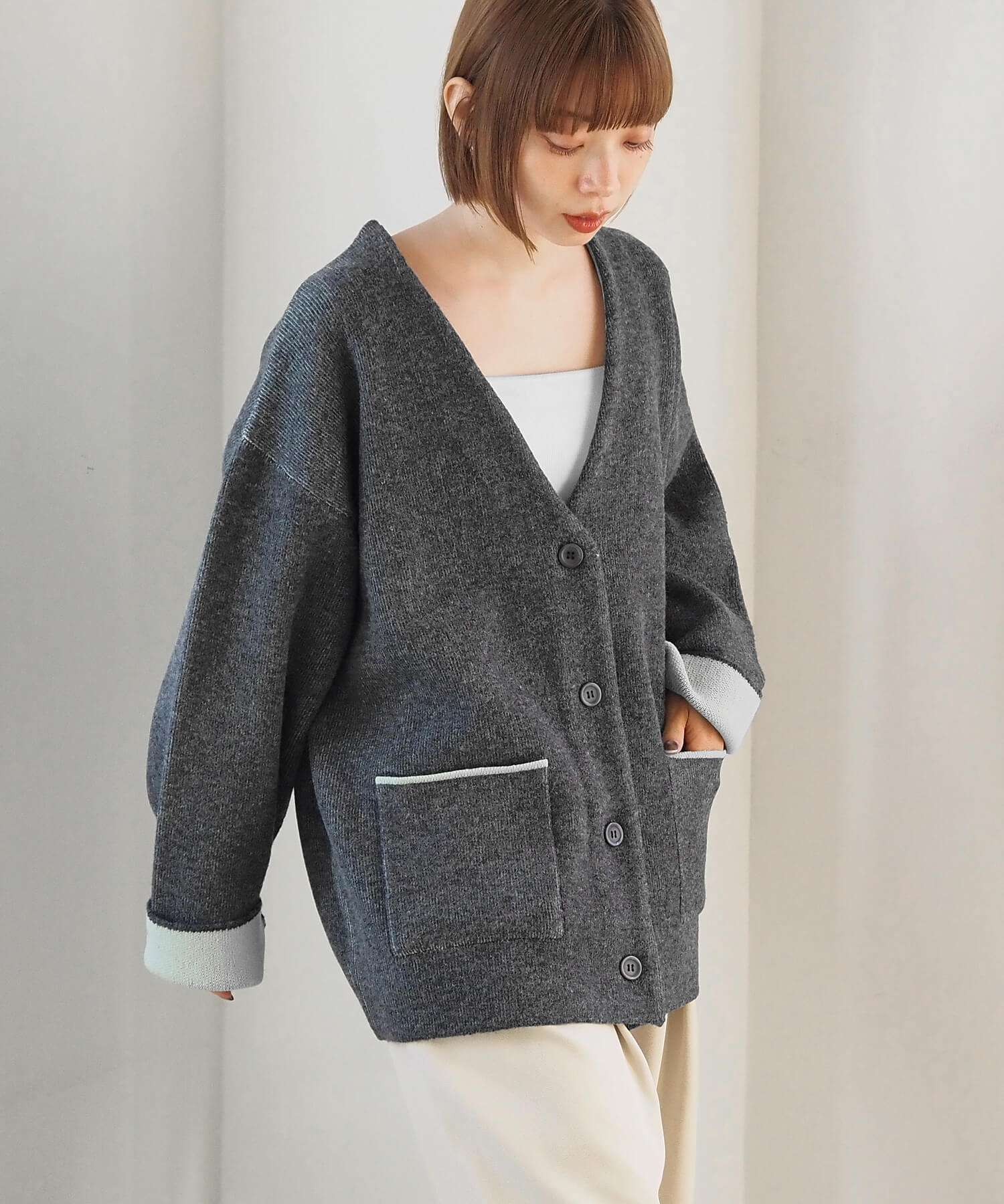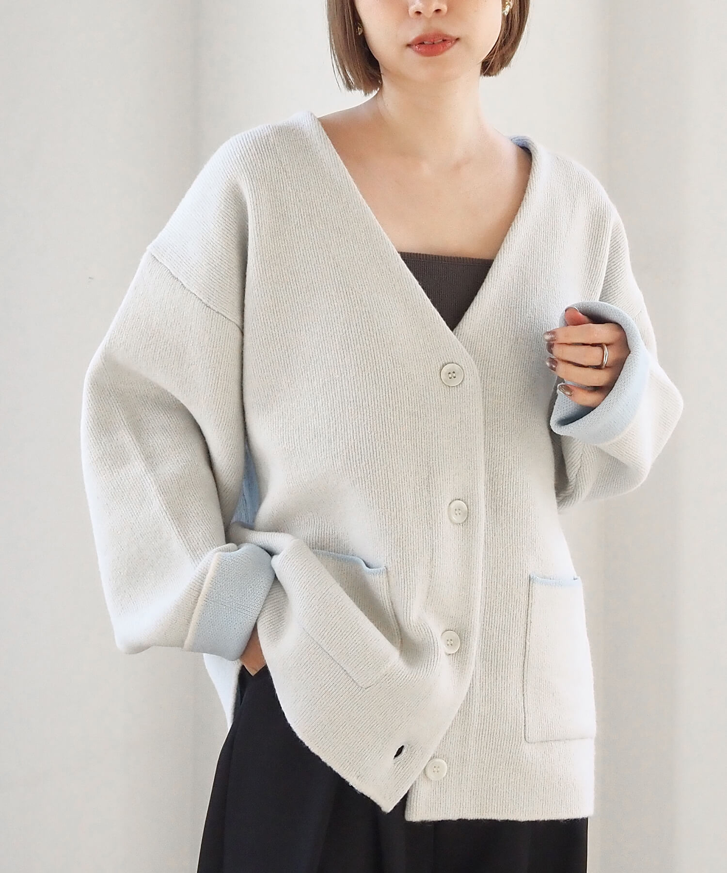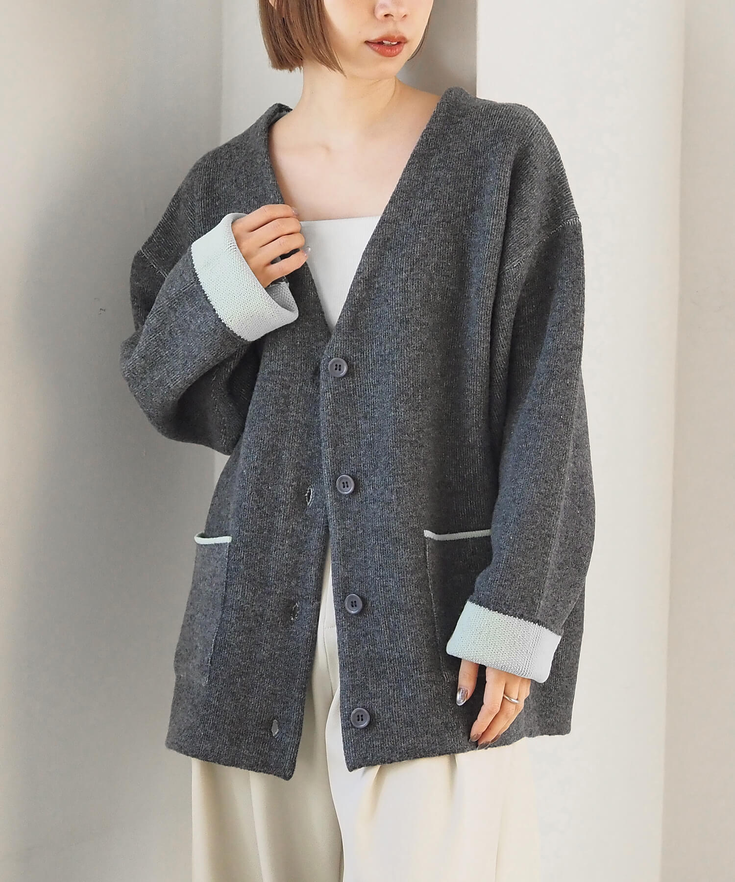 ・バイカラーデザインが着映えする、VネックのBIGカーディガンです。