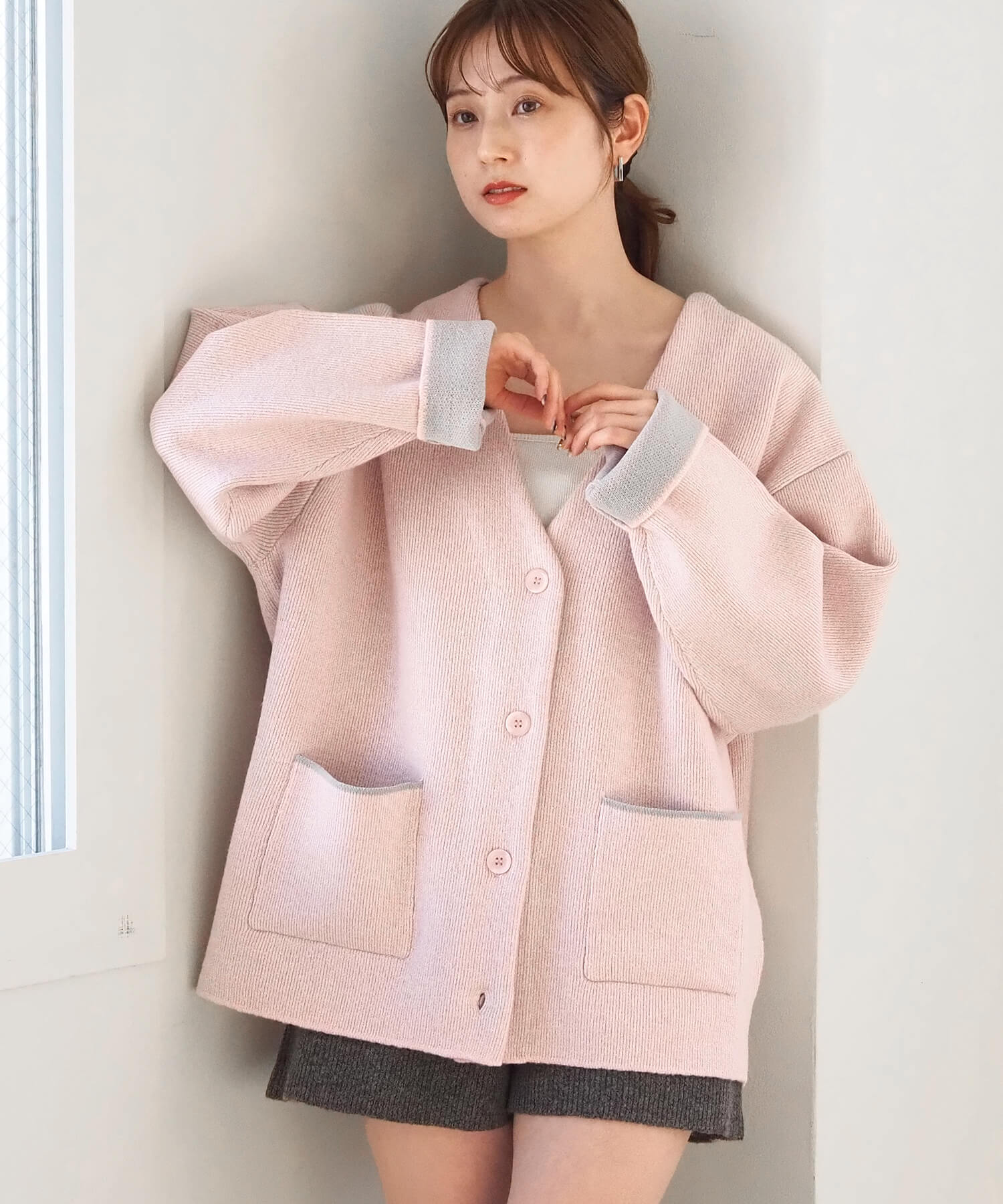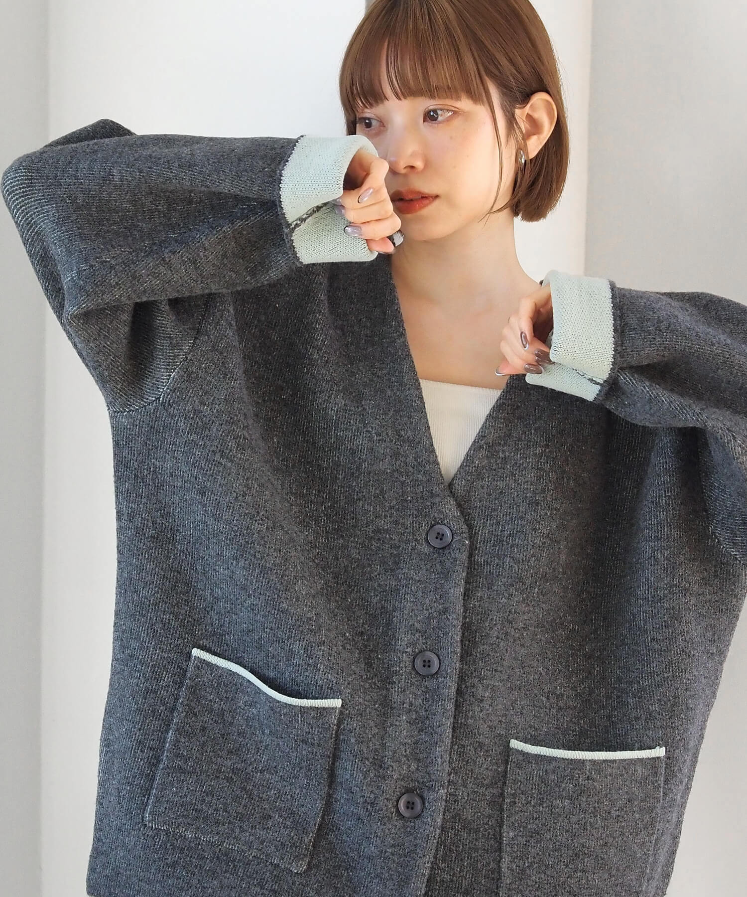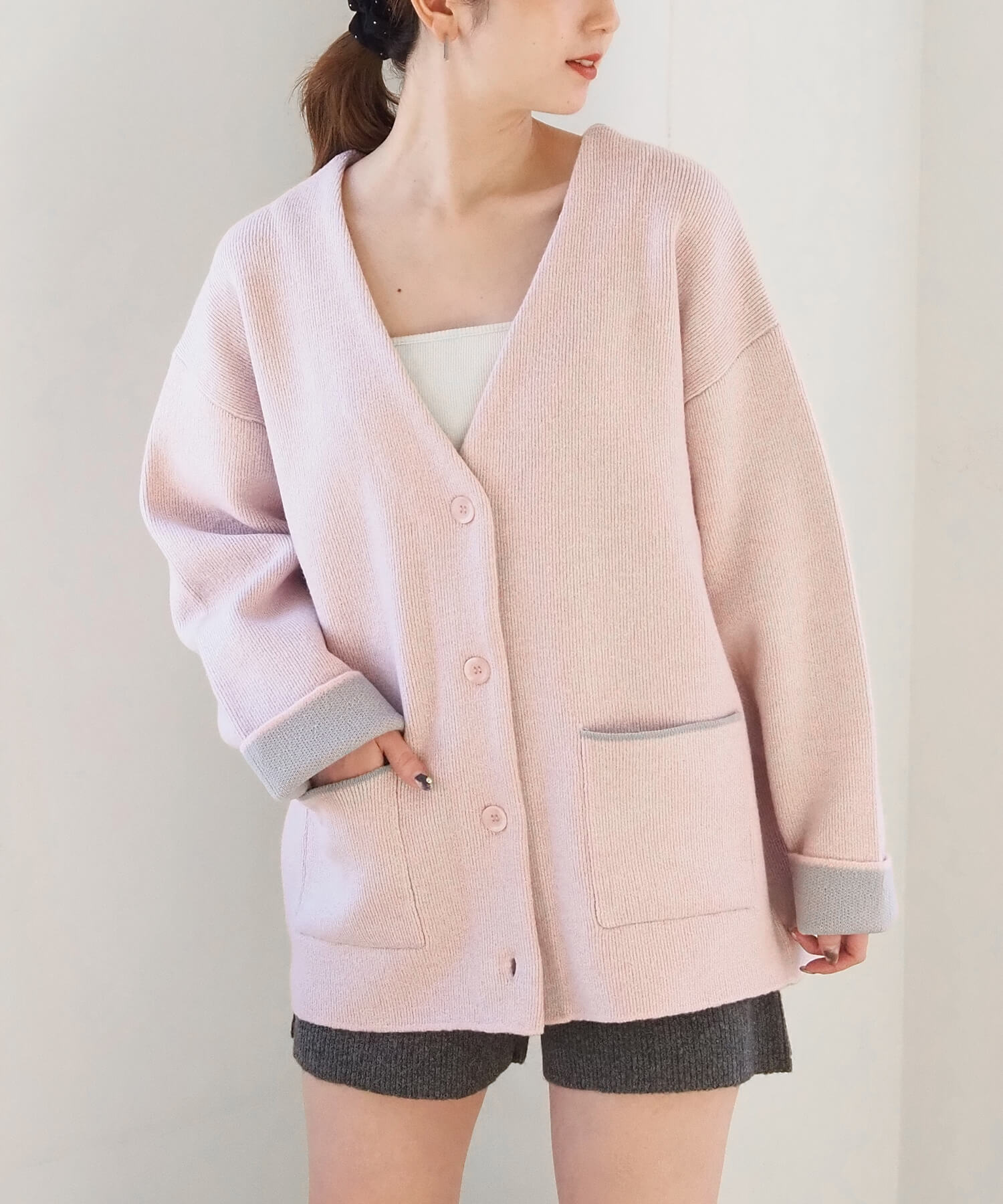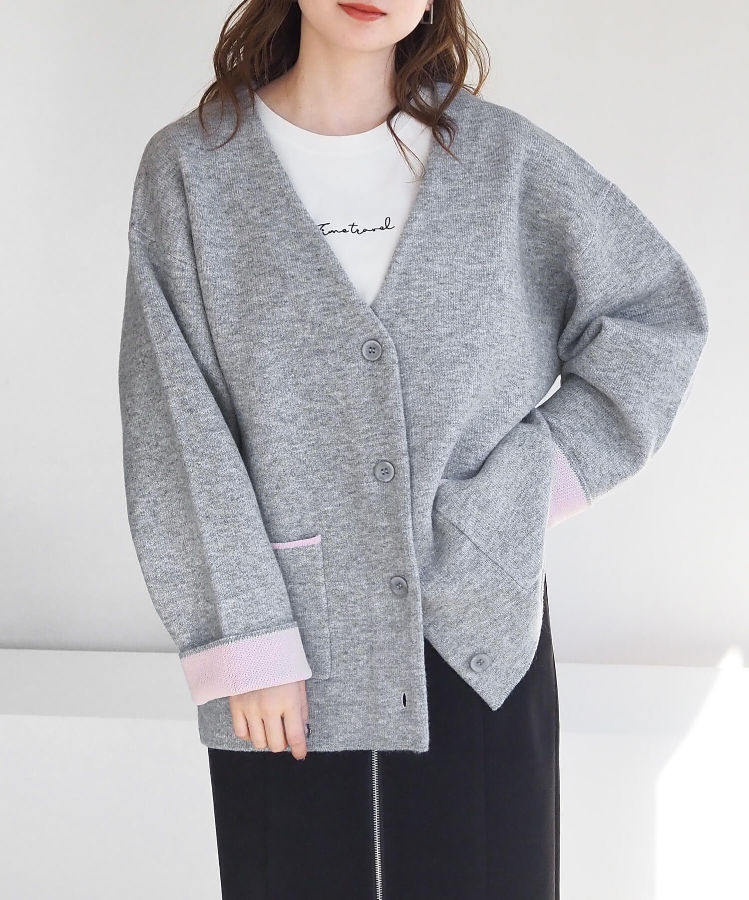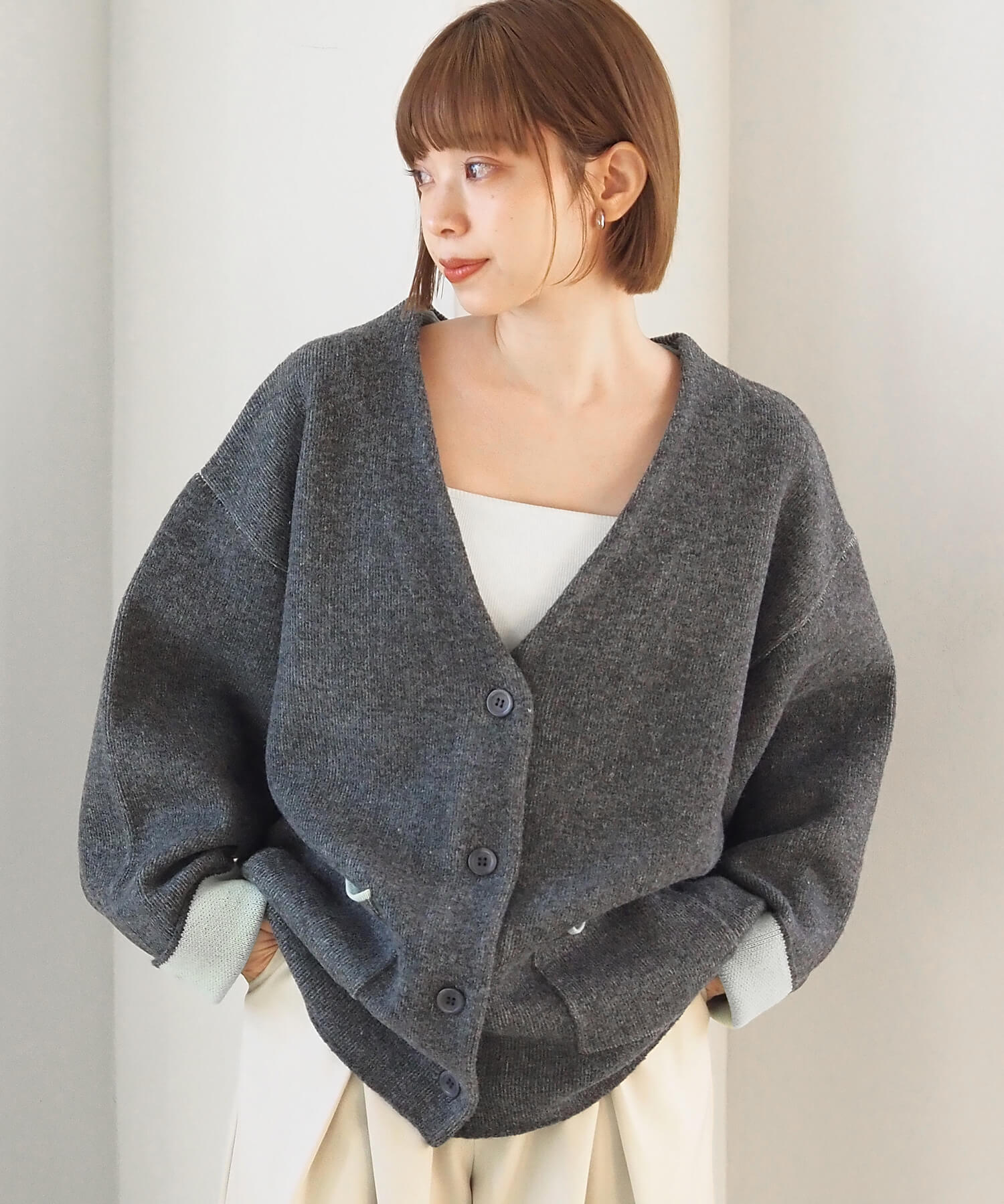 ・バイカラーデザインが着映えする、VネックのBIGカーディガンです。